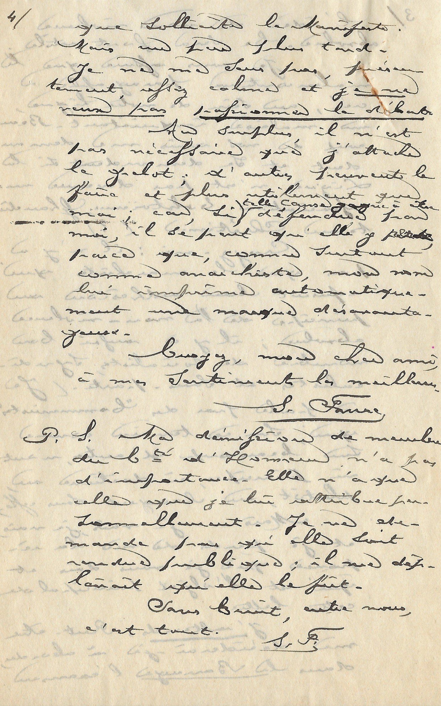 Longue et très importante lettre. Ses pensées sont partagées avec celles de son ami concernant le dernier paragraphe du « Manifeste de Saumur ». Il lui avoue qu’il ne parvient pas à concilier le texte de la motion sur le débat idéologique et le paragraphe en question. « Il y a, il me semble, contradiction, étant donné que, d’une part on réserve et on maintient à l’étude en question que, d’autre part, on tranche par ailleurs. Ce n’est pas moi qui attache une particulière importance au manifeste, c’est : 1° l’ensemble des ligueurs et 2° le grand public. ». Il considère que les décisions qui y sont inscrites font autorité jusqu’au congrès suivant et lui conseille d’écrire et de publier au plus tôt leur travail, « contre l’idée de non-violence absolue […] Ce malencontreux paragraphe a créé, au sein de notre ligue, un malaise inquiétant. Beaucoup de nos amis me demandent et se demandent si la ligue n’est pas devenue une association Tolstoïenne, Gandhiste ou Chrétienne ( ?). Croyez moi : il n’y a pas que les anarchistes qui firent leur adhésion au principe de la non-violence absolue ; il y a aussi bon nombre de socialistes, syndicalistes et sans parti (Je ne parle pas des communistes qui, sur ce terrain comme sur beaucoup d’autres, n’ont ni principes, ni doctrine ou plutôt en changent sans cesse) ». Enfin, il ajoute, concernant sa démission en tant que membre du comité d’honneur, qu’elle n’a pas d’importance. « Elle n’a que celle que je lui attribue personnellement. Je ne vous demande pas qu’elle soit rendue publique ; il me déplairait qu’elle le fût…».