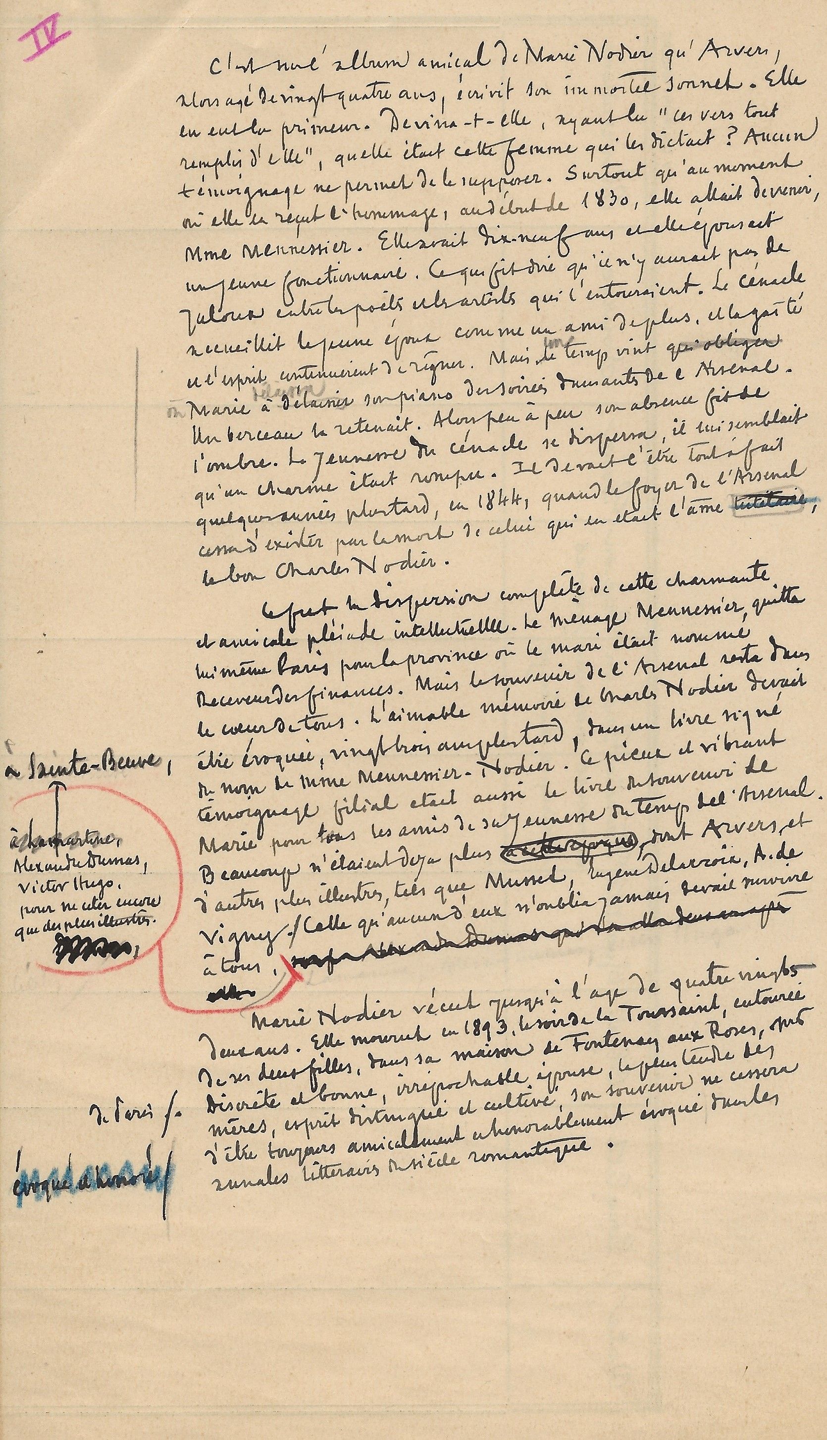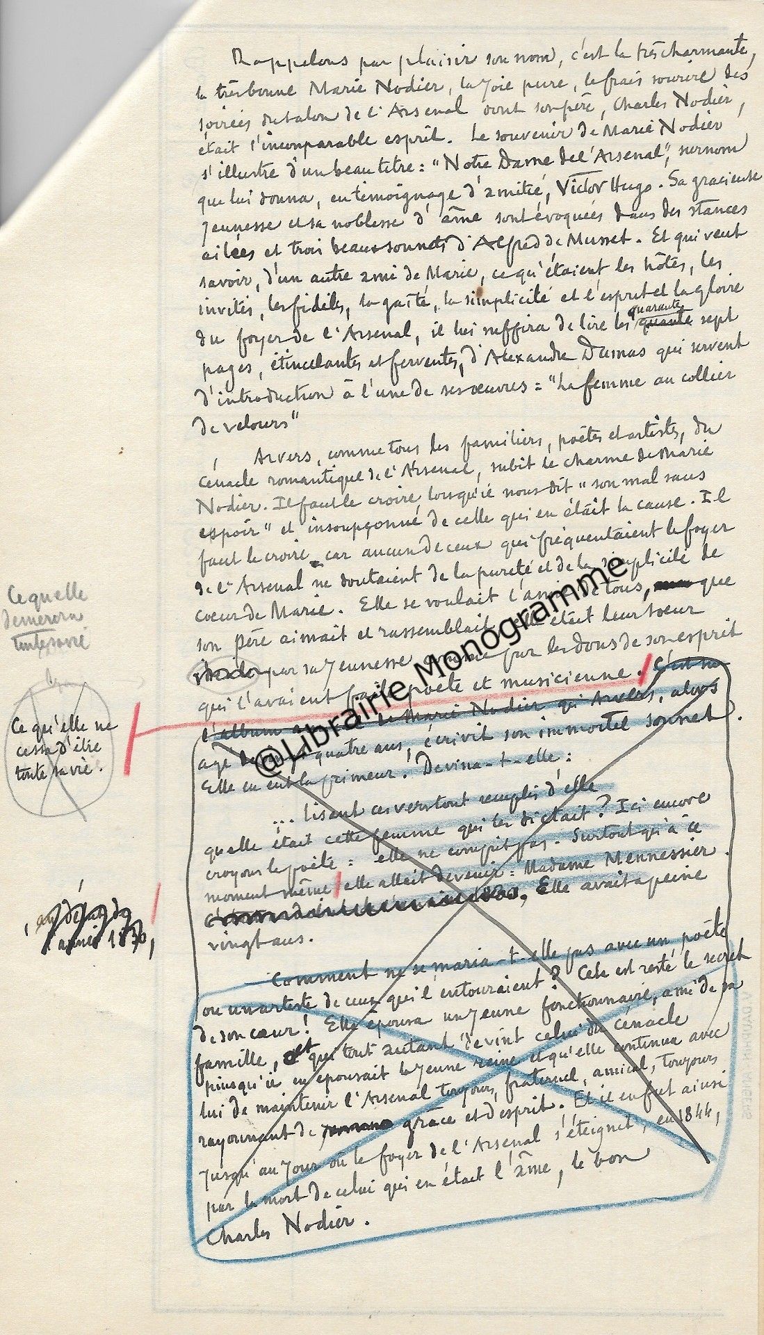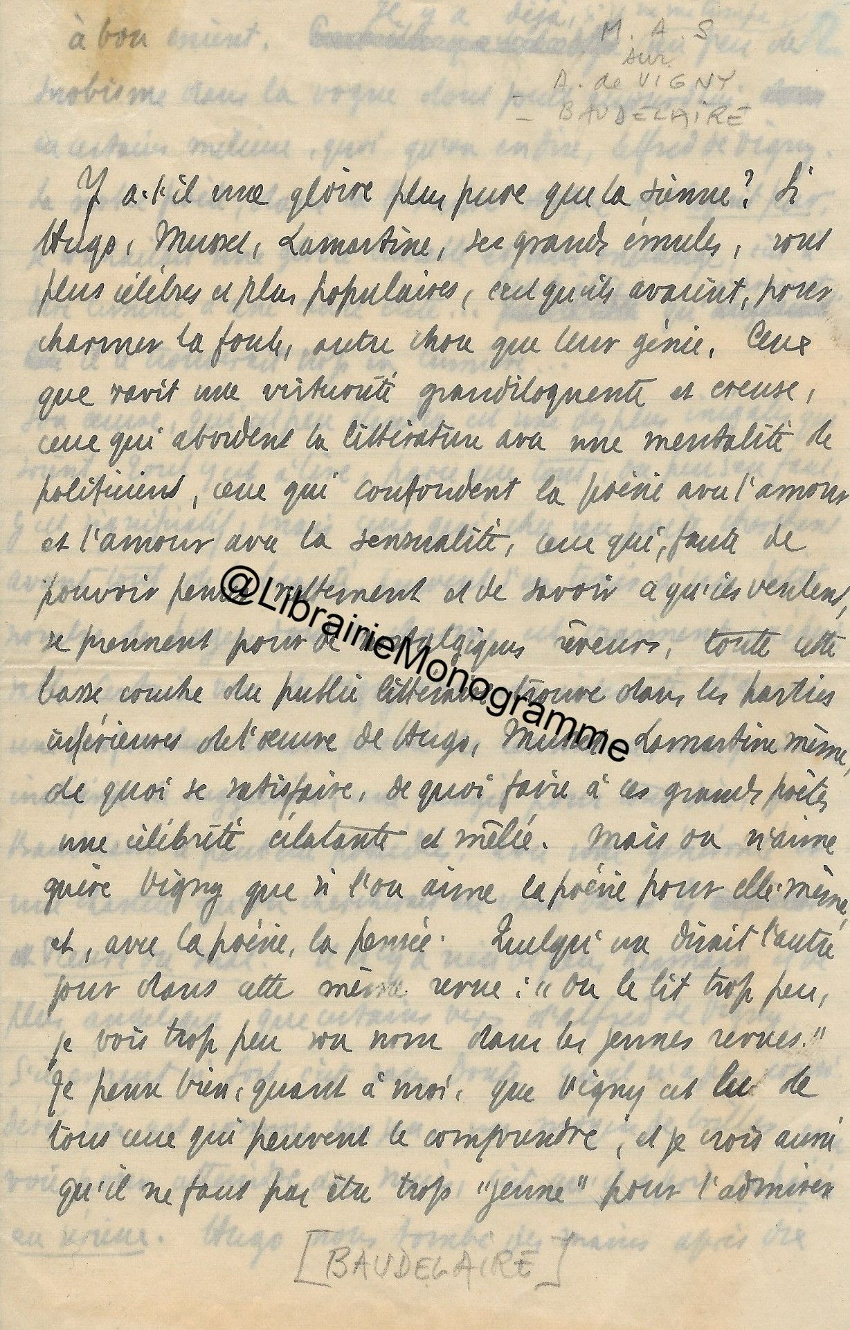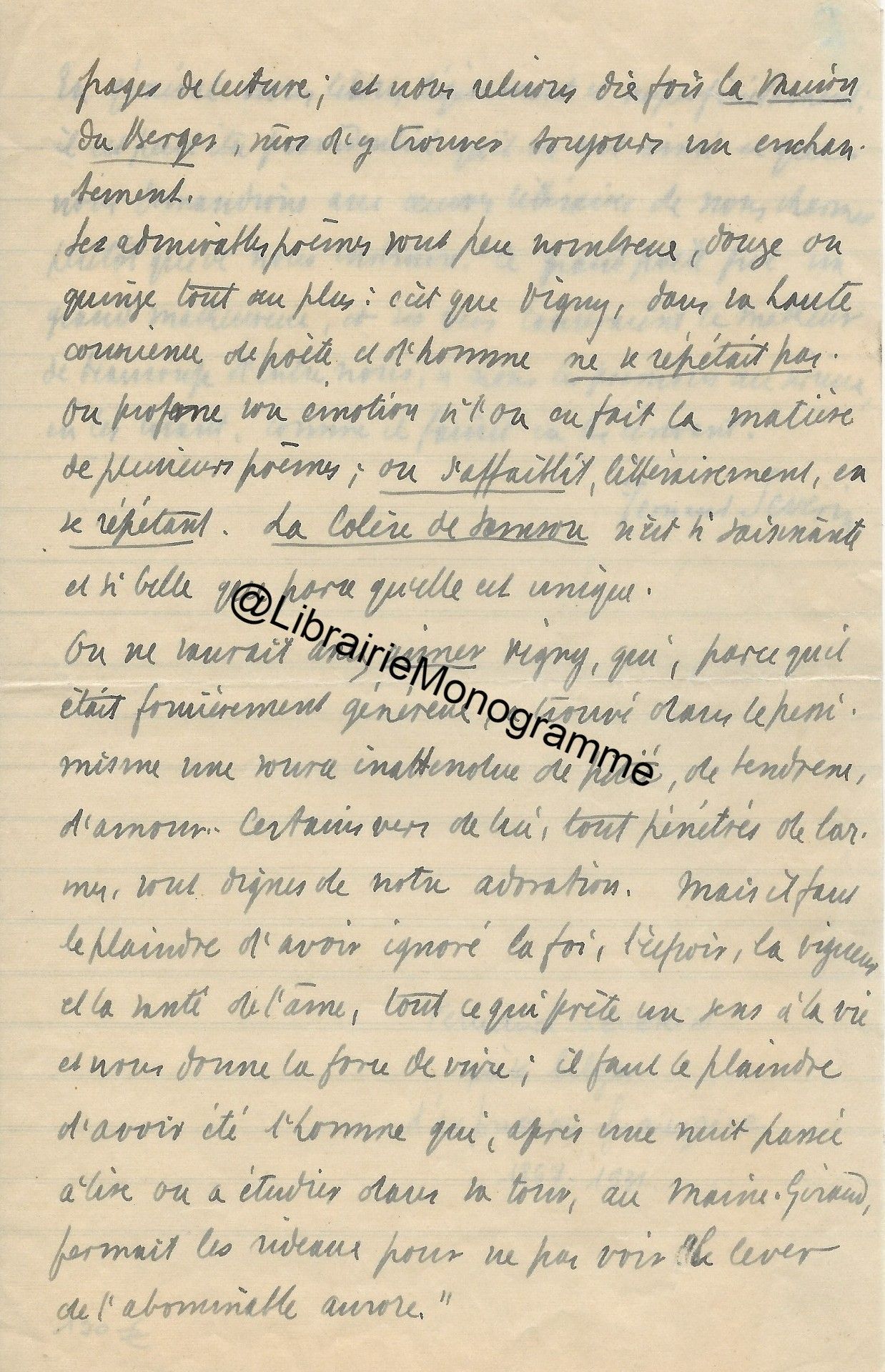 Superbe manuscrit à propos des travaux littéraires du poète et dramaturge français Félix Arvers (1806-1850). Ce précieux document dresse tout d’abord une analyse pertinente sur la plus grande œuvre du poète « Le Sonnet », puis, nous offre ensuite une description de l’Homme intime et son entourage. « Il y a cent ans, le 7 Novembre 1850, mourait à l’hospice Dubois de Paris, où il était en traitement depuis quinze jours, le poète Félix Arvers, qu’une paralysie grave emportait prématurément à l’âge de quarante-quatre ans. Il était l’auteur d’une vingtaine de pièces, pour la plupart des comédies et vaudevilles dont quelques-unes écrites en collaboration. Deux de ses œuvres personnelles avaient été jouées au théâtre français : "La course au clocher", en 1839, et le "second mari" en 1841. Ni l’une ni l’autre, n’eut cependant sauvé son nom de l’oubli s’il n’avait laissé, de son œuvre purement poétique un immortel sonnet. Le fameux sonnet d’Arvers, " le sonnet du siècle" comme l’on s’est plu à le nommer, en son temps. Toute une génération l’a récité de mémoire, et certes, tous les lettrés le connaissent, de même beaucoup d’autres que la poésie trouvent sensibles et qui ont à leur portée quelque anthologie où le sonnet d’Arvers ne peut manquer d’être, le voici, pour tous ceux qui n’en ont plus un souvenir précis ou qui l’auraient oublié… ». Après avoir retranscrit l’intégralité du sonnet, Courville, s’intéresse à la source d’inspiration cachée du poète, Marie Nodier (la femme de lettres fille de l’écrivain Charles Nodier) et à l’Arsenal « Le chef-d’œuvre de poésie devint rapidement célèbre. Fréquemment cité, on en prit copie et on le récita avec ferveur. Il provoqua l’enthousiasme des salons de Paris en attendant de faire le tour de la France puis celui du monde. Des compositeurs tels que Bizet, Widor et d’autres s’en inspirant, ajoutèrent à sa popularité. Cet exemple d’amour sans espoir aux accents si purs toucha tous les cœurs, et l’on cherche pendant très longtemps, bien après la mort du poète, à savoir quelle pouvait être cette inconnue digne de lui avoir inspiré un sentiment aussi délicat et aussi profond. Quelques rares personnes de l’entourage du poète, les amis parfaitement discrets, surent seules à quoi s’en tenir. Pour tous les autres, le mystère demeurait impénétrable. C’est ce que l’auteur avait d’ailleurs sincèrement voulu, et c’est pour mieux dérouter la curiosité qu’il publia le sonnet en lui donnant ce sous-titre : "imité de l’italien". L’aveu engageait le lecteur à supposer une interprétation idéale sinon un plagiat complet […] Le sonnet d’Arvers est bien français d’inspiration et de création et le secret qu’il cachait en a été connu après la mort de celle qui en fut l’inspiratrice. Rappelons par plaisir son nom, c’est la très charmante, la très bonne Marie Nodier, la joie pure, le frais sourire des soirées du salon de l’Arsenal dont son père, Charles Nodier était l’incomparable esprit. Le souvenir de Marie Nodier s’illustre d’un beau titre " Notre Dame de l’Arsenal", surnom que lui donna, en témoignage d’amitié, Victor Hugo. Sa gracieuse jeunesse et sa noblesse d’ame sont évoquées dans les stances ailées et trois beaux sonnets d’Alfred de Musset. Et qui veut savoir, d’un autre ami de Marie, ce qu’étaient les hôtes, les invités, les fidèles, la gaité, la simplicité et l’esprit et la gloire du foyer de l’Arsenal, il lui suffira de lire les quarante-sept pages, étincelantes et ferventes, d’Alexandre Dumas qui servent d’introduction à l’une de ses œuvres "La femme au collier de velours ". Courville dresse ensuite un portrait biographique de Marie Nodier puis évoque la fin de l’Arsenal « Elle se sentait l’amie de tous que son père aimait et rassemblait, elle était leur sœur par sa jeunesse comme par les dons de son esprit qui l’avaient faite poète et musicienne. C’est sur l’album amical de Marie Nodier qu’Arvers, alors âgé de vingt-quatre ans, écrivit son immortel sonnet. Elle en eut la primeur. Devina-t-elle, ayant lu "ces vers tout remplis d’elle", qu’elle était cette femme qui les dictait ? Aucun témoignage ne permet de le supposer. Surtout qu’au moment où elle en reçut l’hommage, au début de 1830, elle allait devenir Madame Menessier. Elle avait dix-neuf ans et elle épousait un jeune fonctionnaire […] Mais un temps vint où Marie délaissa son piano des soirées dansantes de l’Arsenal, un berceau la retenait. Alors, peu à peu son absence fit de l’ombre. La jeunesse du cercle se dispersa, il lui semblait qu’un charme avait été rompu. Il devait l’être tout à fait quelques années plus tard, en 1844, quand le foyer de l’Arsenal cessa d’exister par la mort de celui qui en était l’ame, le bon Charles Nodier. Ce fut la dispersion complète de cette charmante et amicale pléiade intellectuelle…Mais le souvenir de l’Arsenal resta dans le cœur de tous. L’aimable mémoire de Charles Nodier devait être évoquée vingt-trois ans plus tard, dans un livre signé du nom de Madame Menessier-Nodier. Ce pieux et vibrant témoignage filial était aussi le livre du souvenir de Marie pour tous les amis de sa jeunesse du temps de l’Arsenal. Beaucoup n’étaient déjà plus dont Arvers et d’autres plus illustres, tels que, Musset, Eugène Delacroix, Alfred de Vigny .Celle qu’aucun d’eux n’oublie jamais devait survivre à tous. Marie Nodier vécut jusqu’à l’âge de 82 ans… ». Courville dédie la fin de son manuscrit aux derniers jours d’Arvers et confie quelques anecdotes. « Felix Arvers reste célibataire. C’est vers la fin de 1848 qu’il ressentit les premiers symptômes de la maladie qui devait abréger sa vie. Il dut malgré tout continuer d’écrire pour le théâtre. Ma
