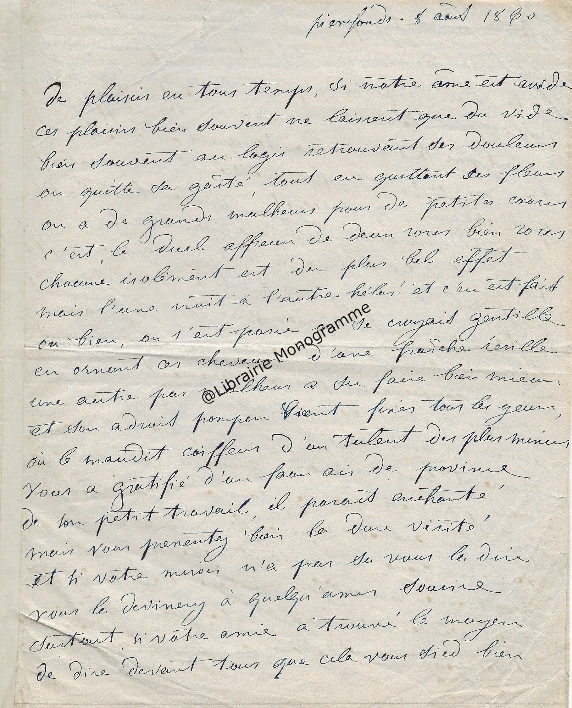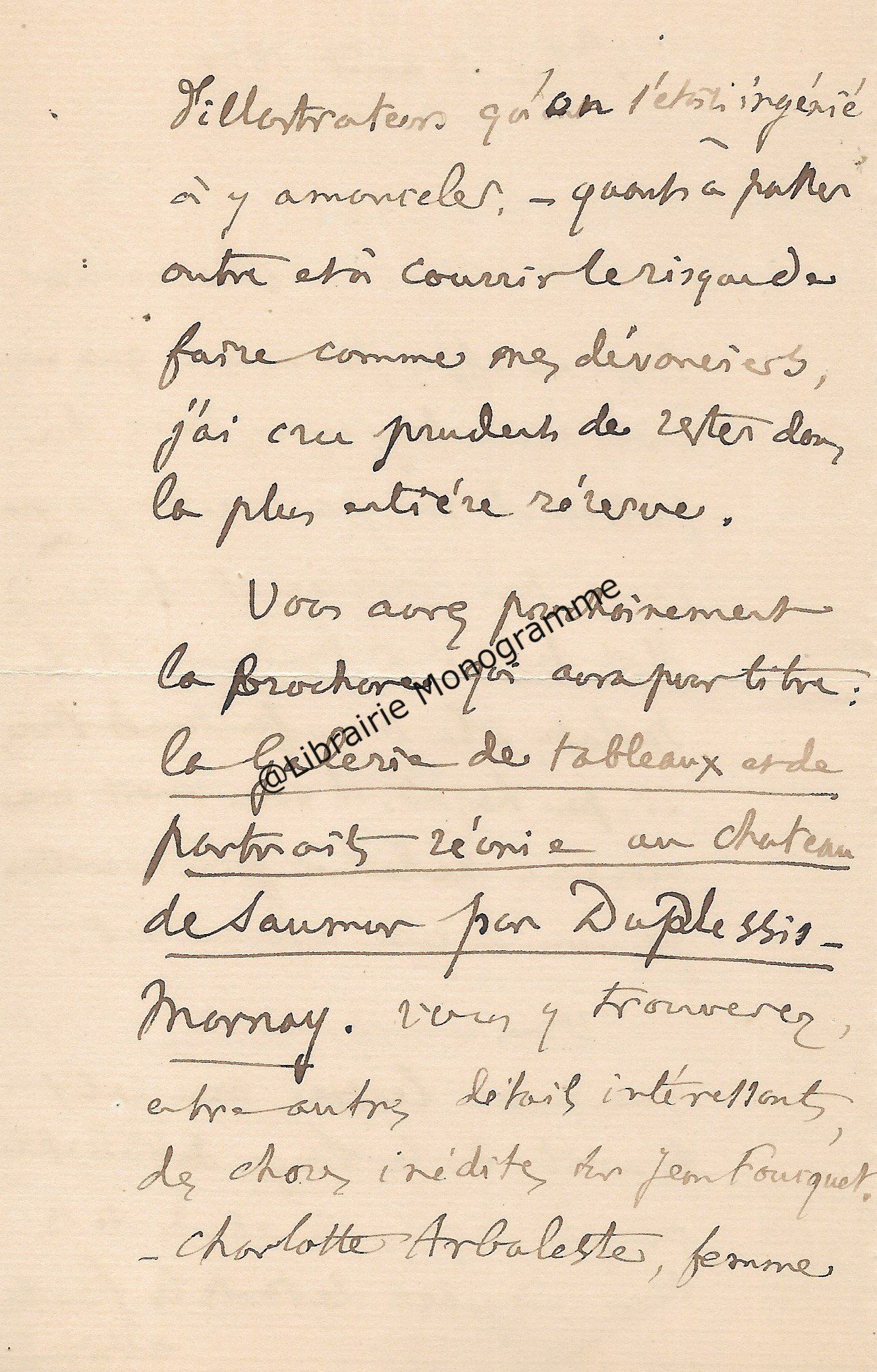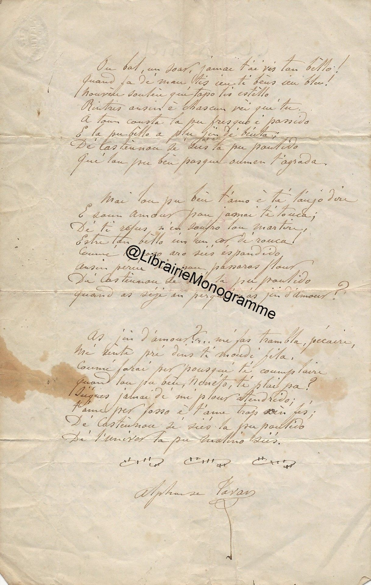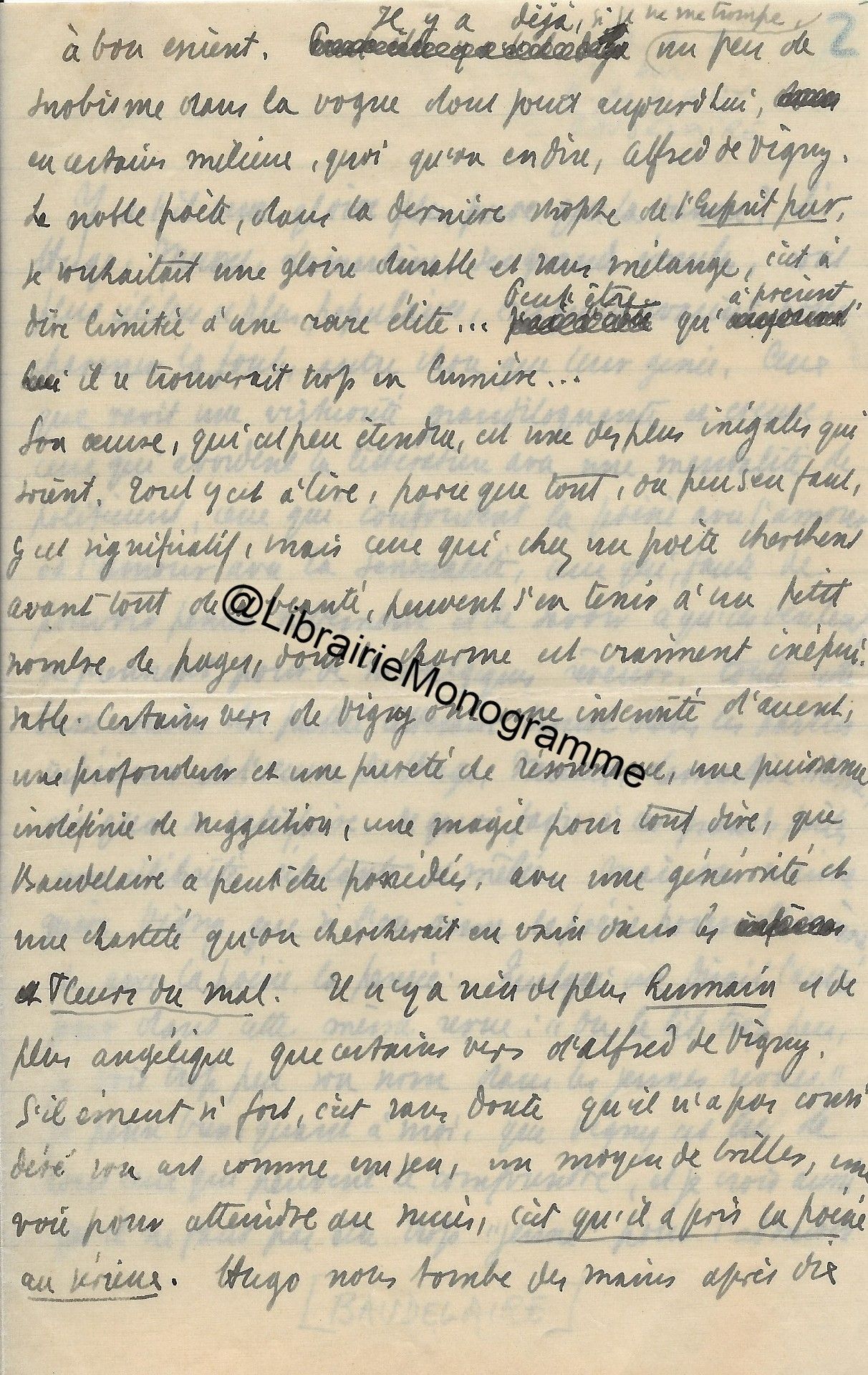 Superbe manuscrit à propos des travaux littéraires du poète et dramaturge français Félix Arvers (1806-1850). Ce précieux document dresse tout d’abord une analyse pertinente sur la plus grande œuvre du poète « Le Sonnet », puis, nous offre ensuite une description de l’Homme intime et son entourage. « Il y a cent ans, le 7 Novembre 1850, mourait à l’hospice Dubois de Paris, où il était en traitement depuis quinze jours, le poète Félix Arvers, qu’une paralysie grave emportait prématurément à l’âge de quarante-quatre ans. Il était l’auteur d’une vingtaine de pièces, pour la plupart des comédies et vaudevilles dont quelques-unes écrites en collaboration. Deux de ses œuvres personnelles avaient été jouées au théâtre français : "La course au clocher", en 1839, et le "second mari" en 1841. Ni l’une ni l’autre, n’eut cependant sauvé son nom de l’oubli s’il n’avait laissé, de son œuvre purement poétique un immortel sonnet. Le fameux sonnet d’Arvers, " le sonnet du siècle" comme l’on s’est plu à le nommer, en son temps. Toute une génération l’a récité de mémoire, et certes, tous les lettrés le connaissent, de même beaucoup d’autres que la poésie trouvent sensibles et qui ont à leur portée quelque anthologie où le sonnet d’Arvers ne peut manquer d’être, le voici, pour tous ceux qui n’en ont plus un souvenir précis ou qui l’auraient oublié… ». Après avoir retranscrit l’intégralité du sonnet, Courville, s’intéresse à la source d’inspiration cachée du poète, Marie Nodier (la femme de lettres fille de l’écrivain Charles Nodier) et à l’Arsenal « Le chef-d’œuvre de poésie devint rapidement célèbre. Fréquemment cité, on en prit copie et on le récita avec ferveur. Il provoqua l’enthousiasme des salons de Paris en attendant de faire le tour de la France puis celui du monde. Des compositeurs tels que Bizet, Widor et d’autres s’en inspirant, ajoutèrent à sa popularité. Cet exemple d’amour sans espoir aux accents si purs toucha tous les cœurs, et l’on cherche pendant très longtemps, bien après la mort du poète, à savoir quelle pouvait être cette inconnue digne de lui avoir inspiré un sentiment aussi délicat et aussi profond. Quelques rares personnes de l’entourage du poète, les amis parfaitement discrets, surent seules à quoi s’en tenir. Pour tous les autres, le mystère demeurait impénétrable. C’est ce que l’auteur avait d’ailleurs sincèrement voulu, et c’est pour mieux dérouter la curiosité qu’il publia le sonnet en lui donnant ce sous-titre : "imité de l’italien". L’aveu engageait le lecteur à supposer une interprétation idéale sinon un plagiat complet […] Le sonnet d’Arvers est bien français d’inspiration et de création et le secret qu’il cachait en a été connu après la mort de celle qui en fut l’inspiratrice. Rappelons par plaisir son nom, c’est la très charmante, la très bonne Marie Nodier, la joie pure, le frais sourire des soirées du salon de l’Arsenal dont son père, Charles Nodier était l’incomparable esprit. Le souvenir de Marie Nodier s’illustre d’un beau titre " Notre Dame de l’Arsenal", surnom que lui donna, en témoignage d’amitié, Victor Hugo. Sa gracieuse jeunesse et sa noblesse d’ame sont évoquées dans les stances ailées et trois beaux sonnets d’Alfred de Musset. Et qui veut savoir, d’un autre ami de Marie, ce qu’étaient les hôtes, les invités, les fidèles, la gaité, la simplicité et l’esprit et la gloire du foyer de l’Arsenal, il lui suffira de lire les quarante-sept pages, étincelantes et ferventes, d’Alexandre Dumas qui servent d’introduction à l’une de ses œuvres "La femme au collier de velours ". Courville dresse ensuite un portrait biographique de Marie Nodier puis évoque la fin de l’Arsenal « Elle se sentait l’amie de tous que son père aimait et rassemblait, elle était leur sœur par sa jeunesse comme par les dons de son esprit qui l’avaient faite poète et musicienne. C’est sur l’album amical de Marie Nodier qu’Arvers, alors âgé de vingt-quatre ans, écrivit son immortel sonnet. Elle en eut la primeur. Devina-t-elle, ayant lu "ces vers tout remplis d’elle", qu’elle était cette femme qui les dictait ? Aucun témoignage ne permet de le supposer. Surtout qu’au moment où elle en reçut l’hommage, au début de 1830, elle allait devenir Madame Menessier. Elle avait dix-neuf ans et elle épousait un jeune fonctionnaire […] Mais un temps vint où Marie délaissa son piano des soirées dansantes de l’Arsenal, un berceau la retenait. Alors, peu à peu son absence fit de l’ombre. La jeunesse du cercle se dispersa, il lui semblait qu’un charme avait été rompu. Il devait l’être tout à fait quelques années plus tard, en 1844, quand le foyer de l’Arsenal cessa d’exister par la mort de celui qui en était l’ame, le bon Charles Nodier. Ce fut la dispersion complète de cette charmante et amicale pléiade intellectuelle…Mais le souvenir de l’Arsenal resta dans le cœur de tous. L’aimable mémoire de Charles Nodier devait être évoquée vingt-trois ans plus tard, dans un livre signé du nom de Madame Menessier-Nodier. Ce pieux et vibrant témoignage filial était aussi le livre du souvenir de Marie pour tous les amis de sa jeunesse du temps de l’Arsenal. Beaucoup n’étaient déjà plus dont Arvers et d’autres plus illustres, tels que, Musset, Eugène Delacroix, Alfred de Vigny .Celle qu’aucun d’eux n’oublie jamais devait survivre à tous. Marie Nodier vécut jusqu’à l’âge de 82 ans… ». Courville dédie la fin de son manuscrit aux derniers jours d’Arvers et confie quelques anecdotes. « Felix Arvers reste célibataire. C’est vers la fin de 1848 qu’il ressentit les premiers symptômes de la maladie qui devait abréger sa vie. Il dut malgré tout continuer d’écrire pour le théâtre. Ma
