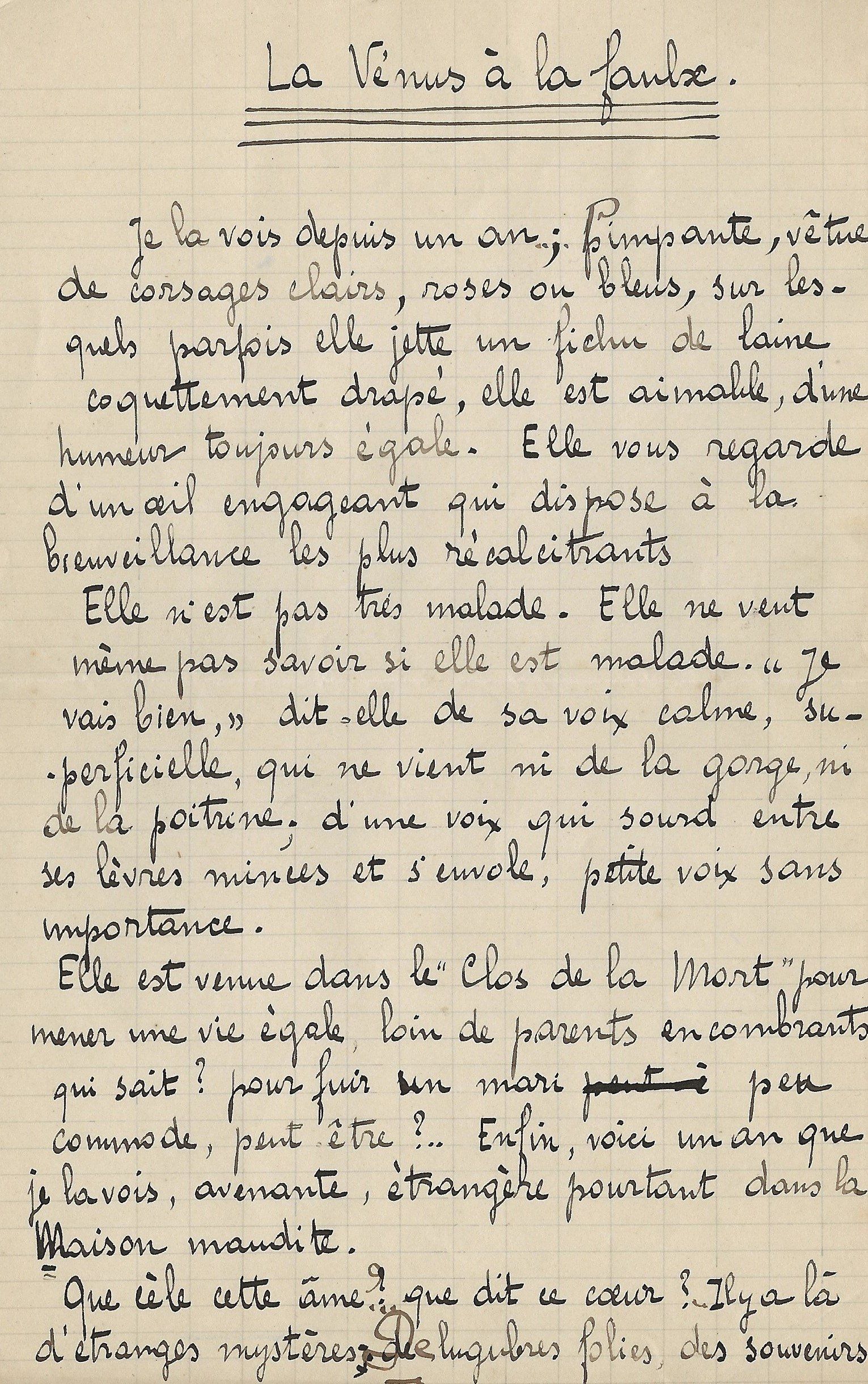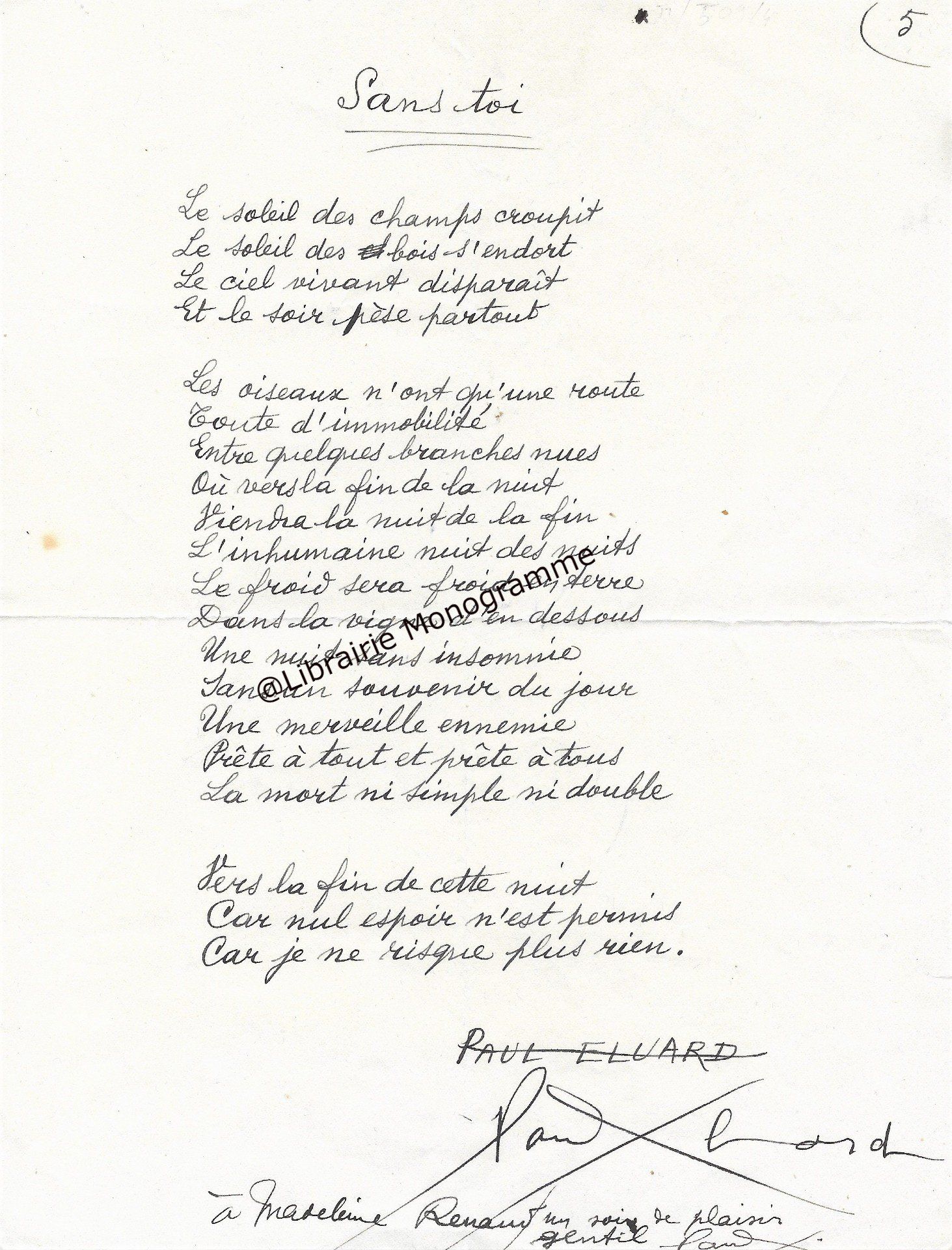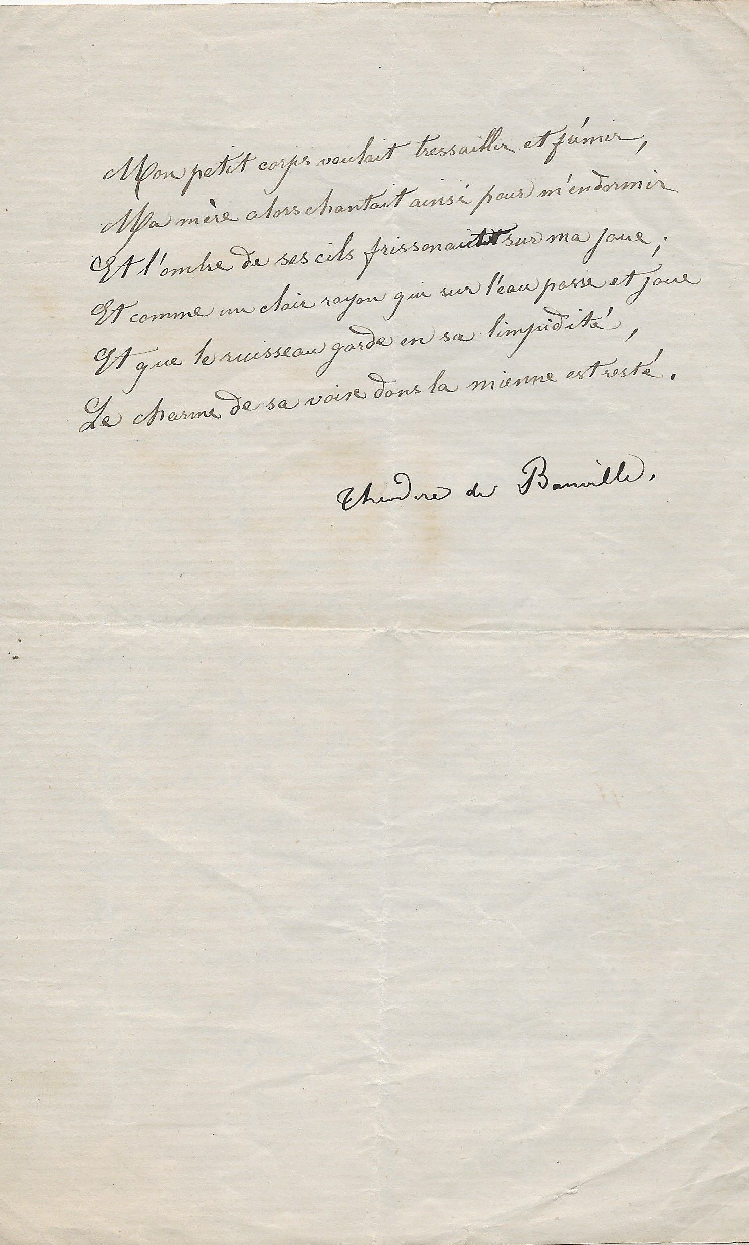 Précieux manuscrit du poète présentant quelques variantes entre cette version et celle qui fut éditée. On relève des corrections et différences sur la ponctuation, ainsi que plusieurs mots biffés et remplacés : « mots » par « sons », « mais » par « puis », le mot « jamais » devenu « pouvoir », « qu’alors » remplacé par « que douce ».