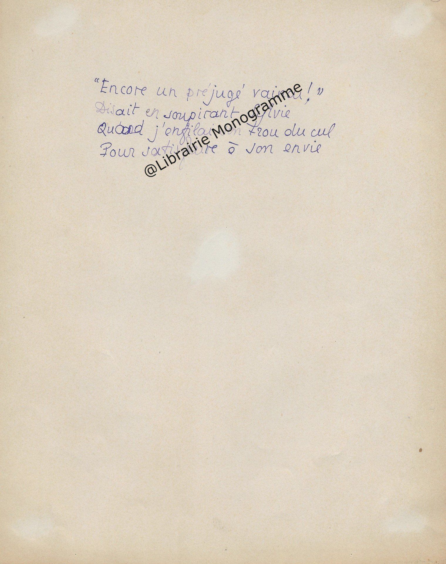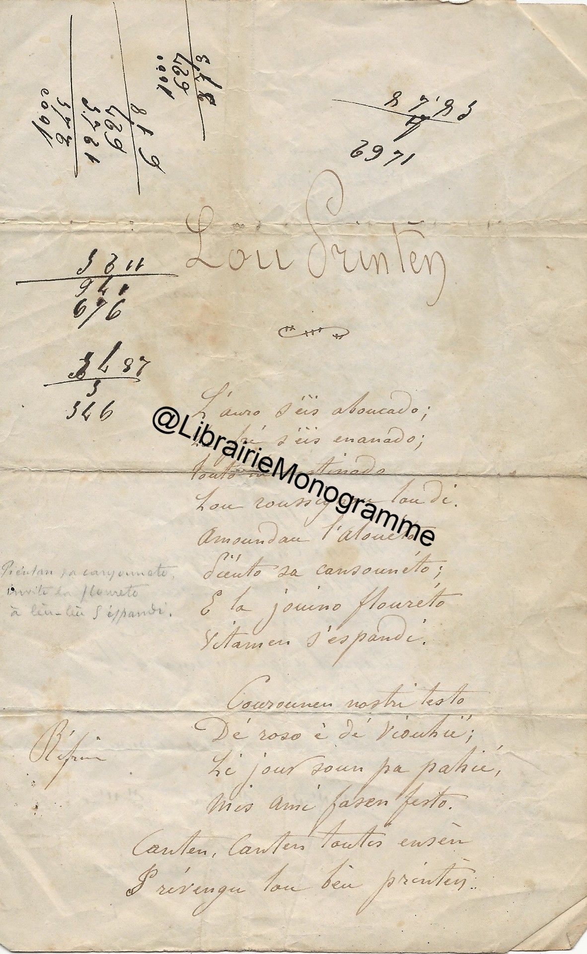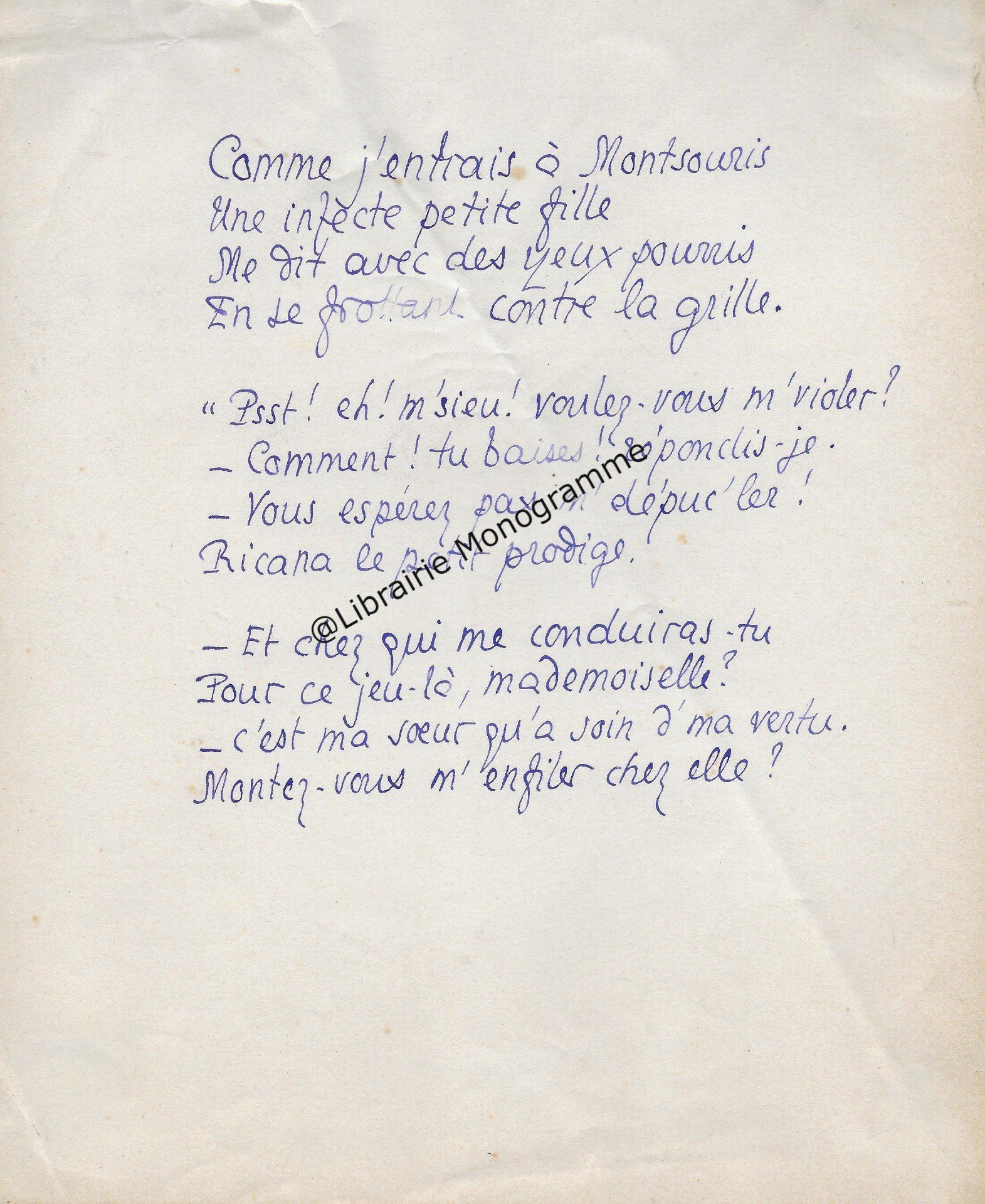 Précieux manuscrit du poète présentant quelques variantes entre cette version et celle qui fut éditée. On relève des corrections et différences sur la ponctuation, ainsi que plusieurs mots biffés et remplacés : « mots » par « sons », « mais » par « puis », le mot « jamais » devenu « pouvoir », « qu’alors » remplacé par « que douce ».