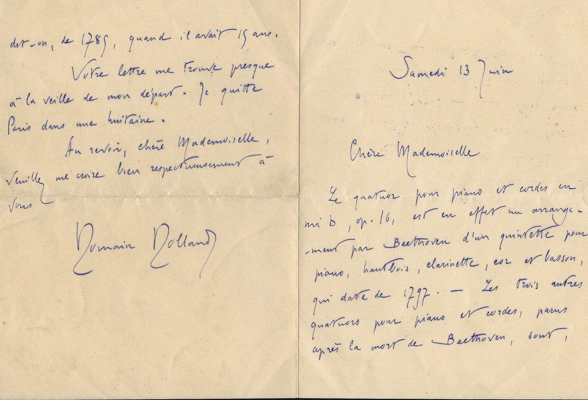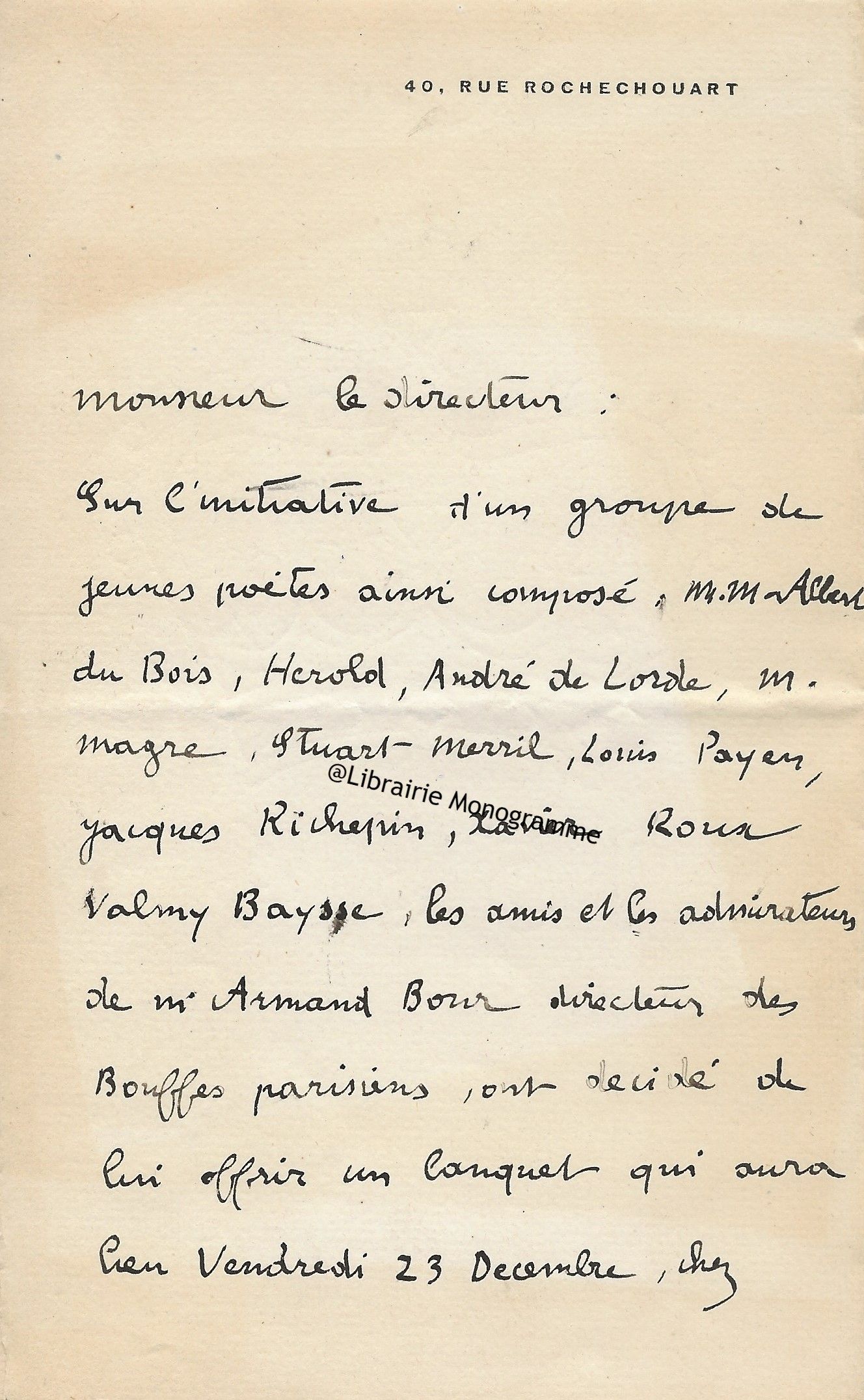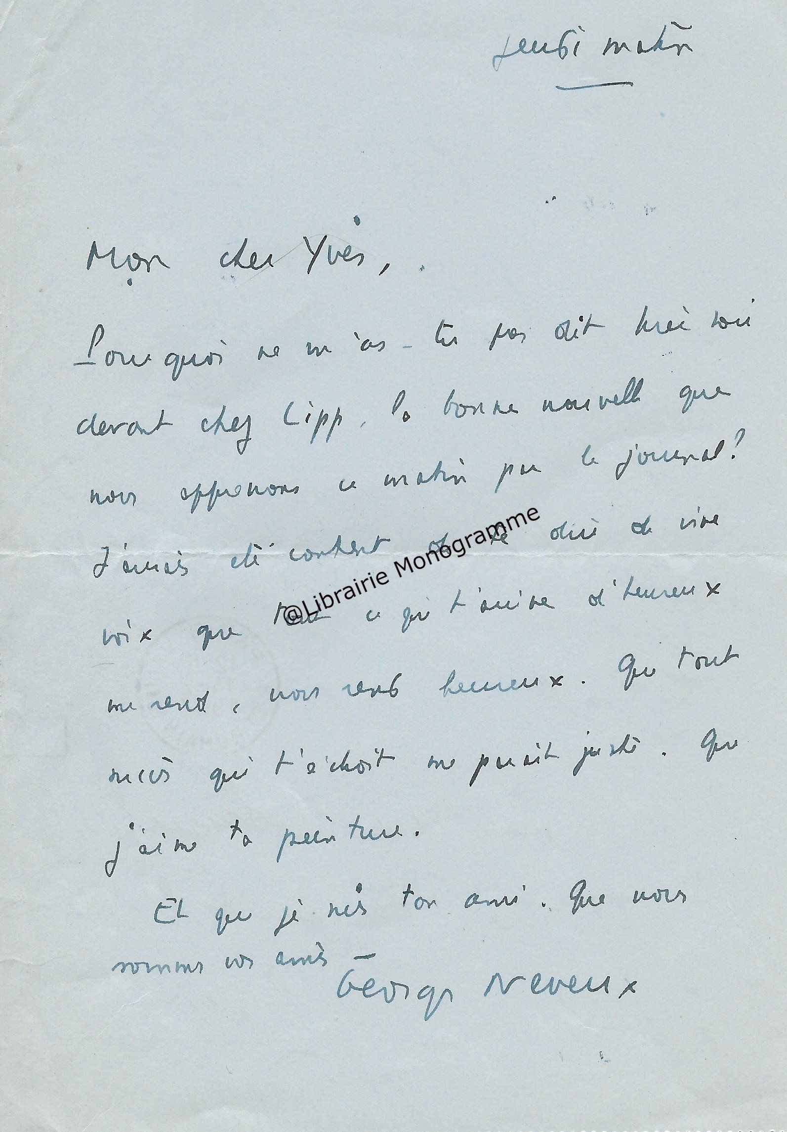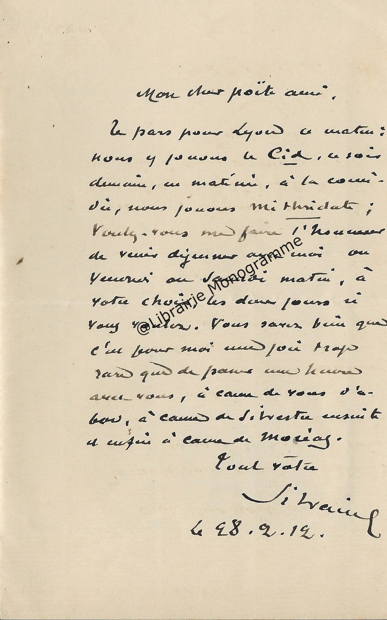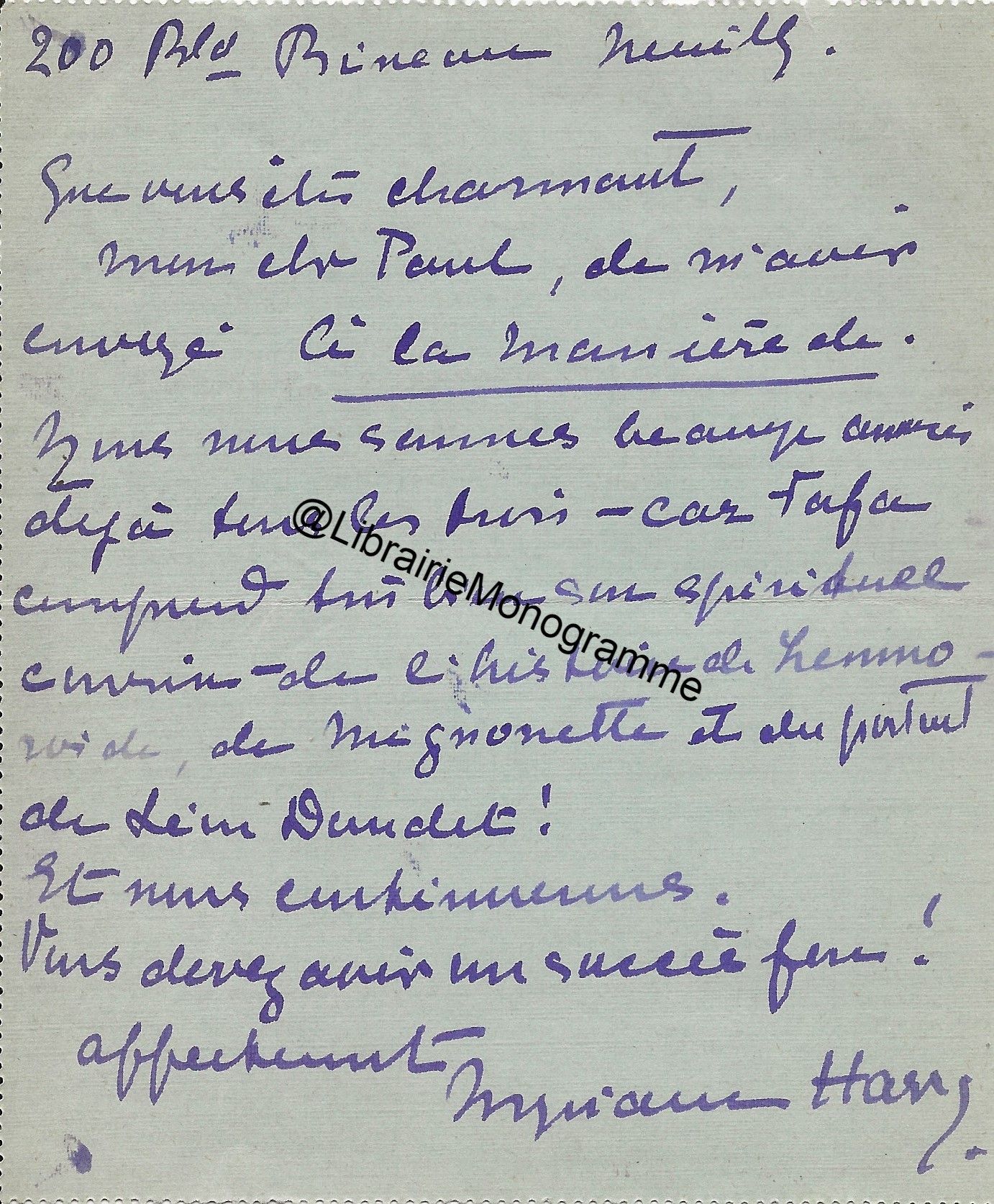 « Je n’ai pas pensé hier à te remercier de ta gentille lettre. C’est fait » lui assure le poète, en l’interrogeant : « J’ai égaré l’adresse et le programme de Duard. Quand aura lieu la première séance ? », séance qui devait avoir lieu au théâtre des arts.