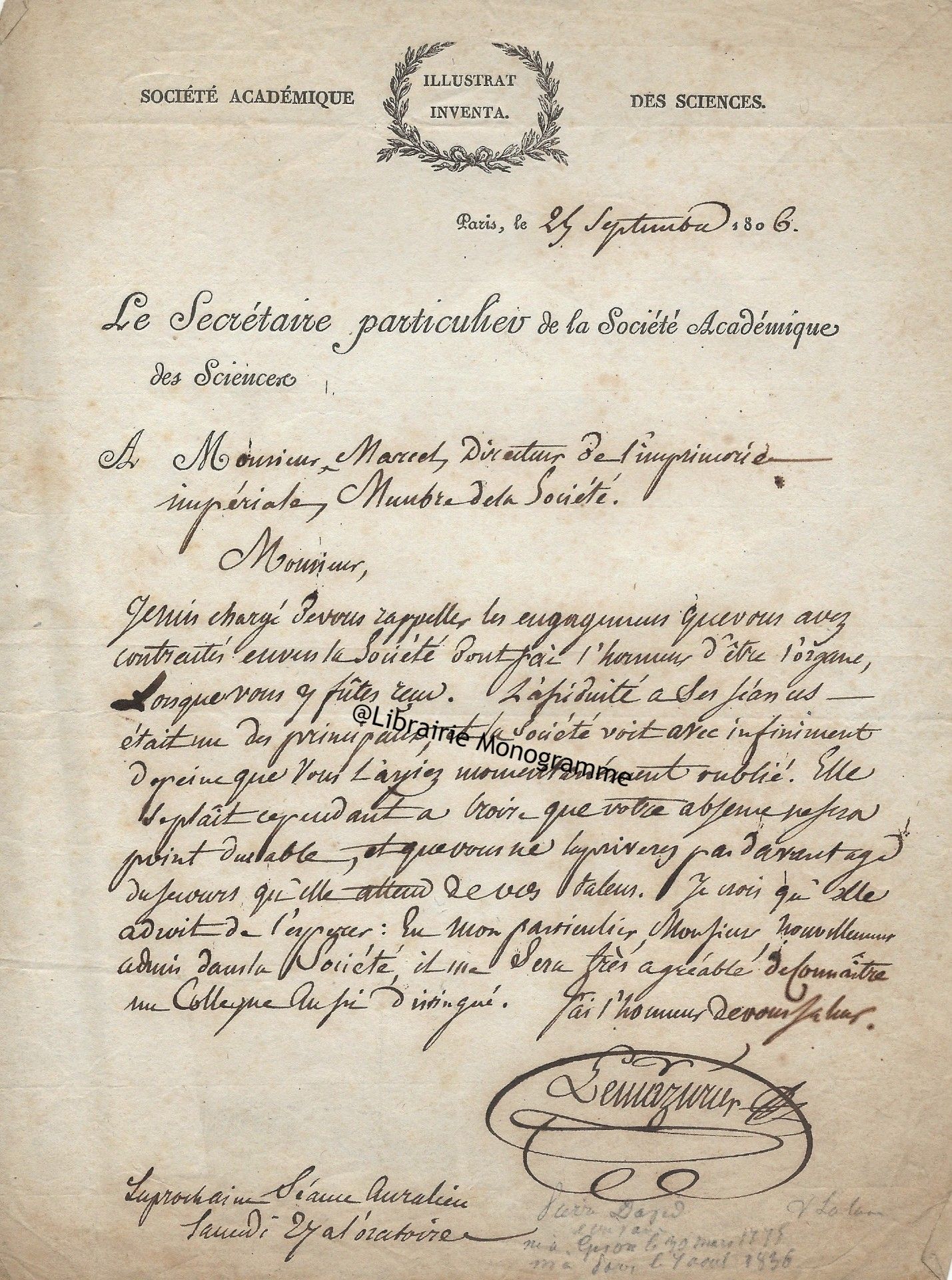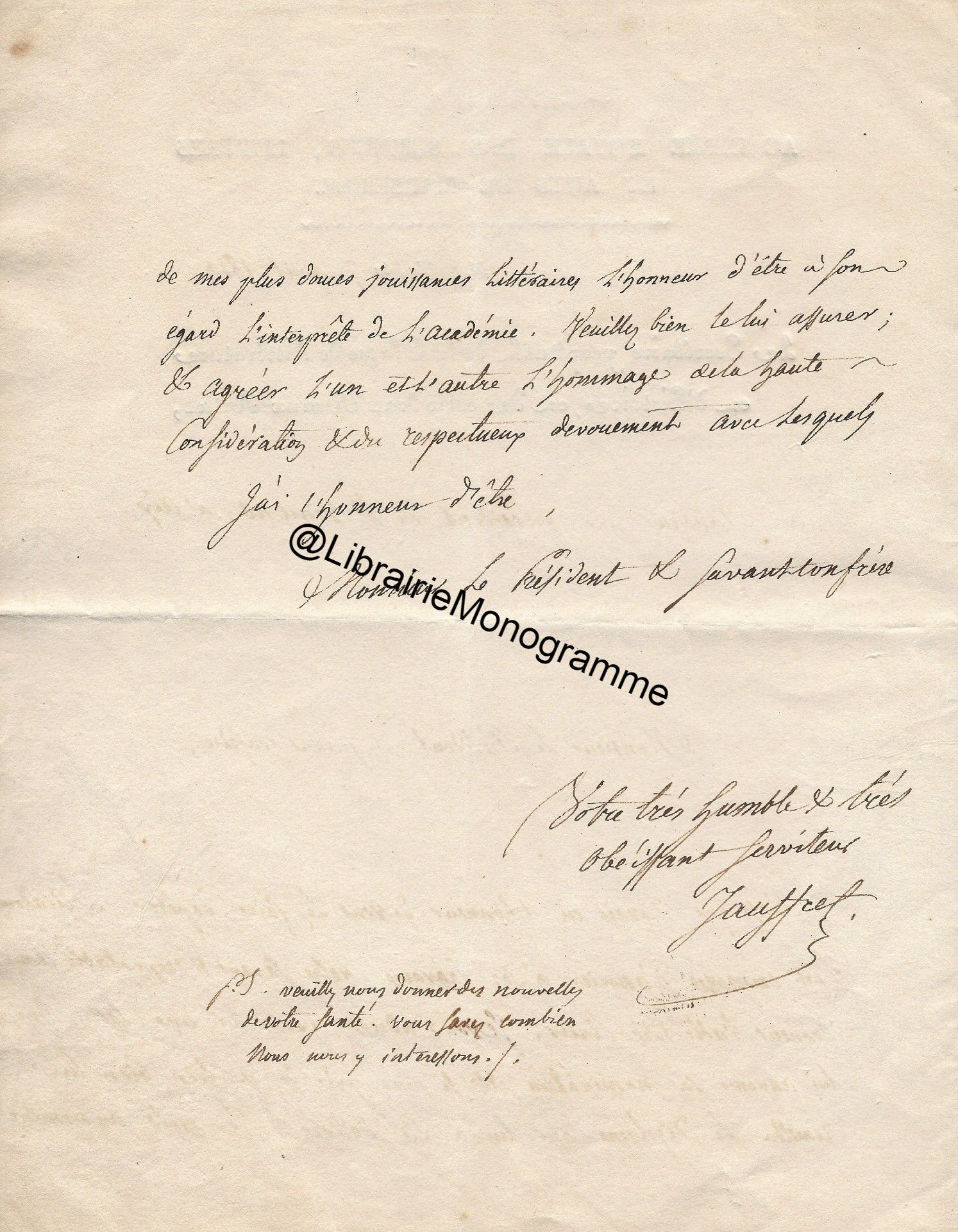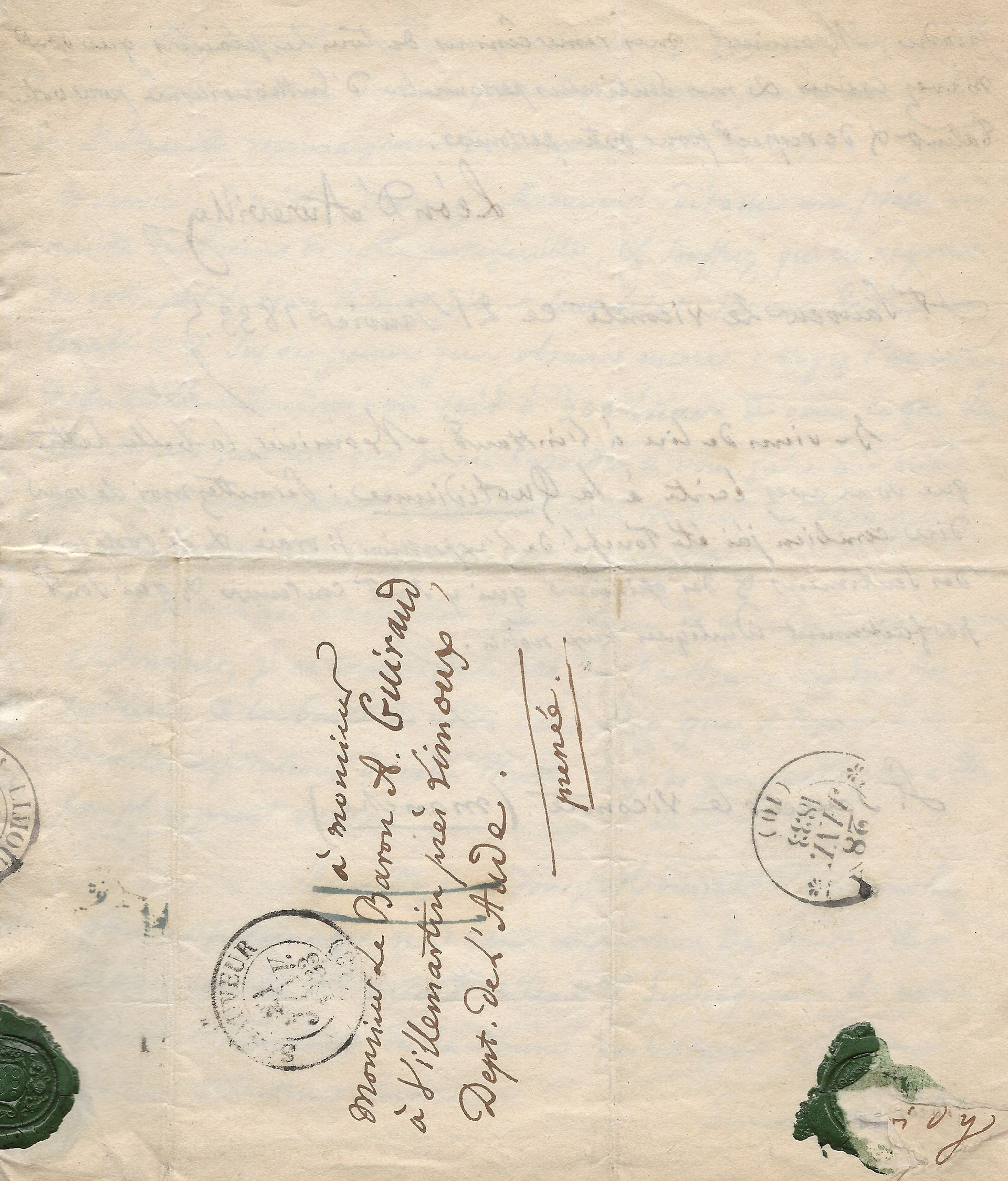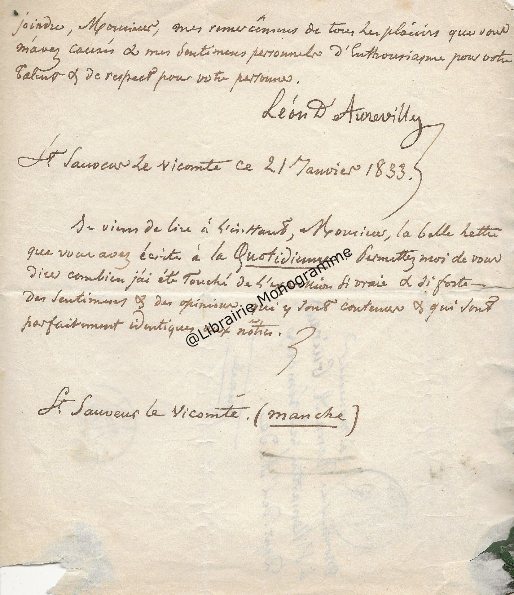 Lettre autographe signée au baron Antoine Guiraud (1780-1857) St-Sauveur-le-Vicomte (Manche),