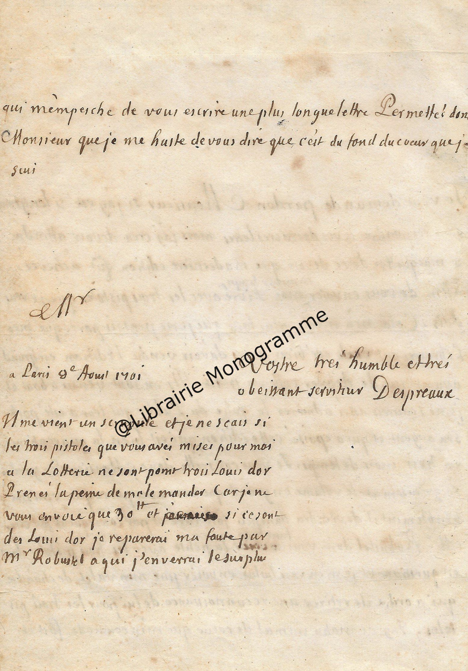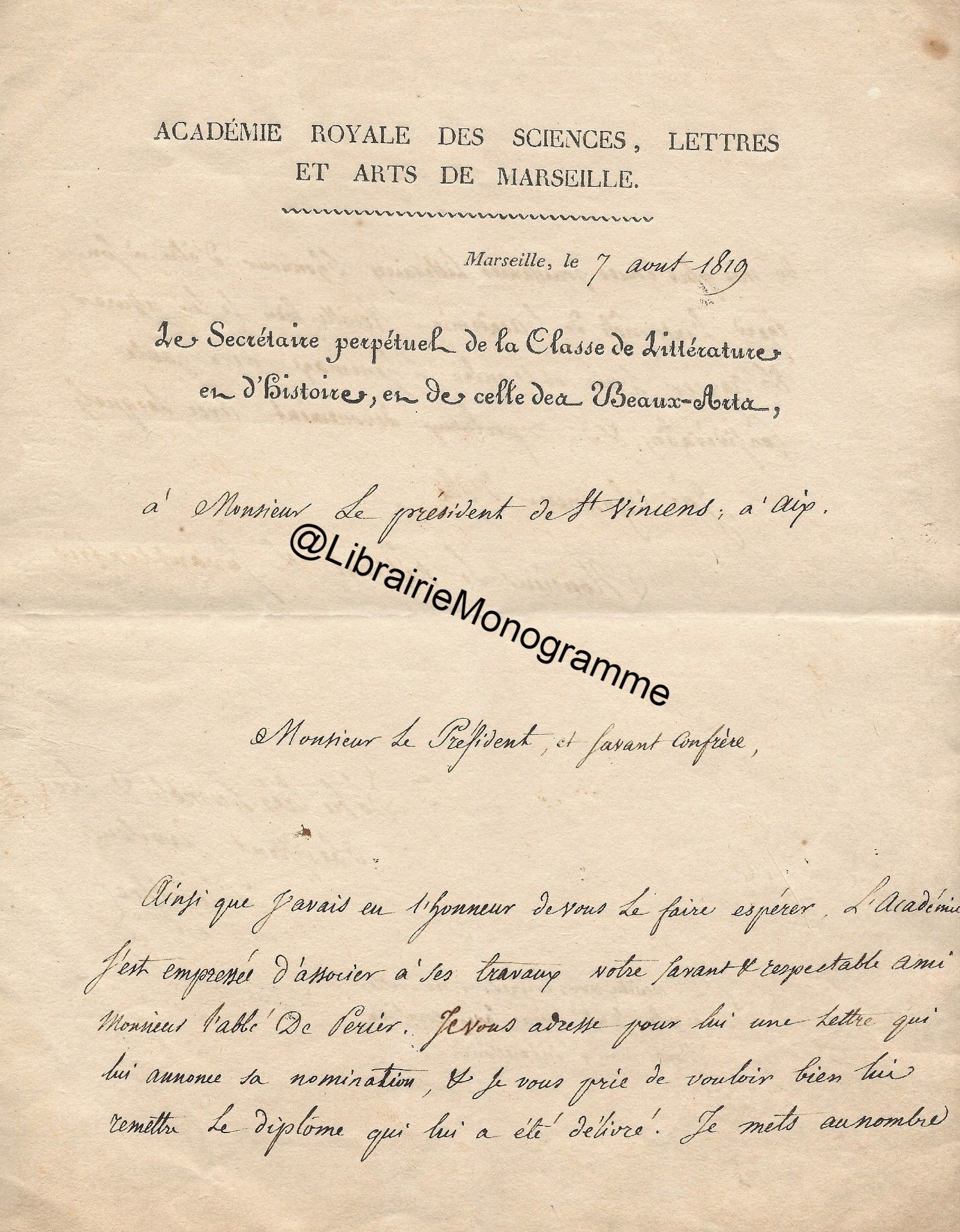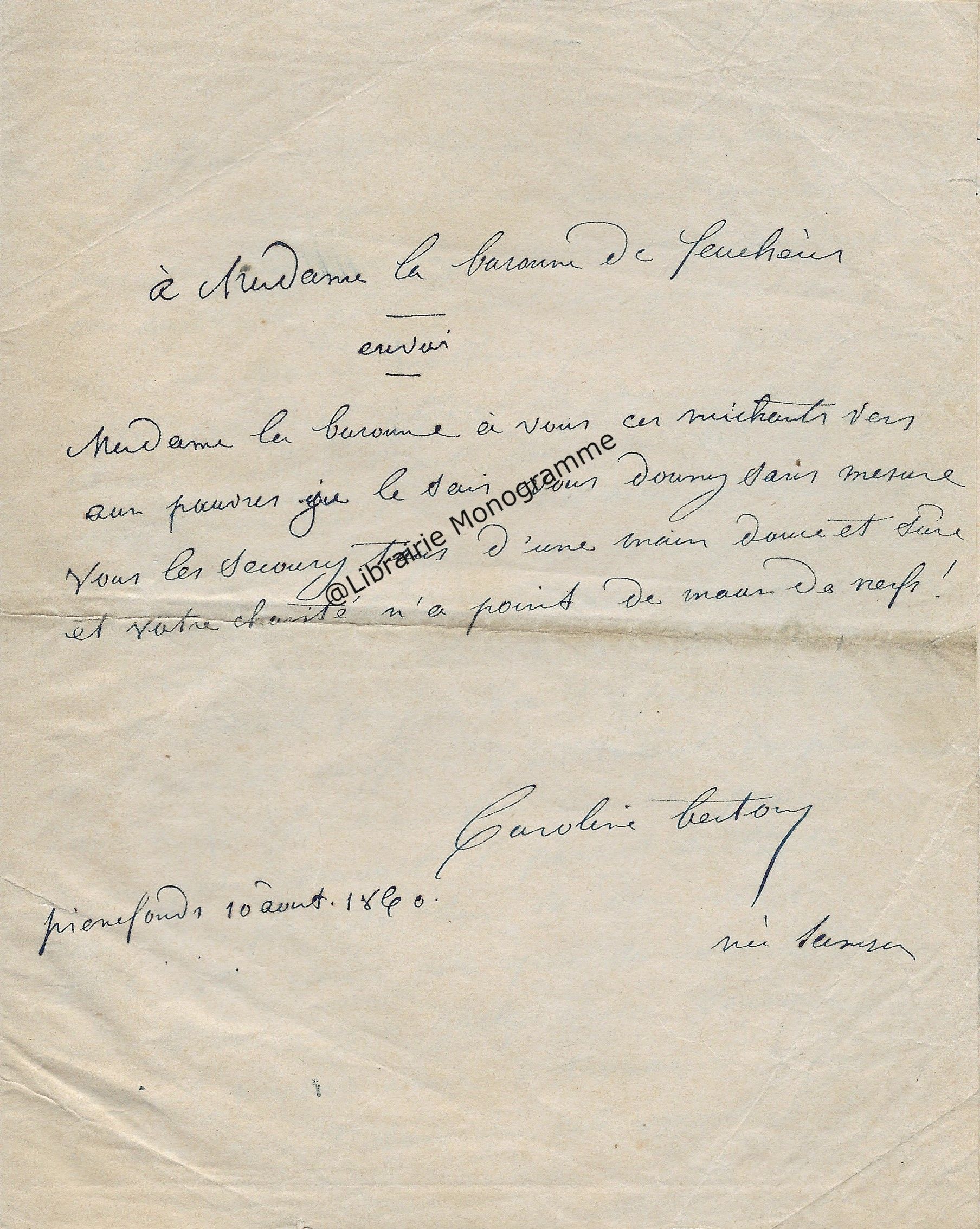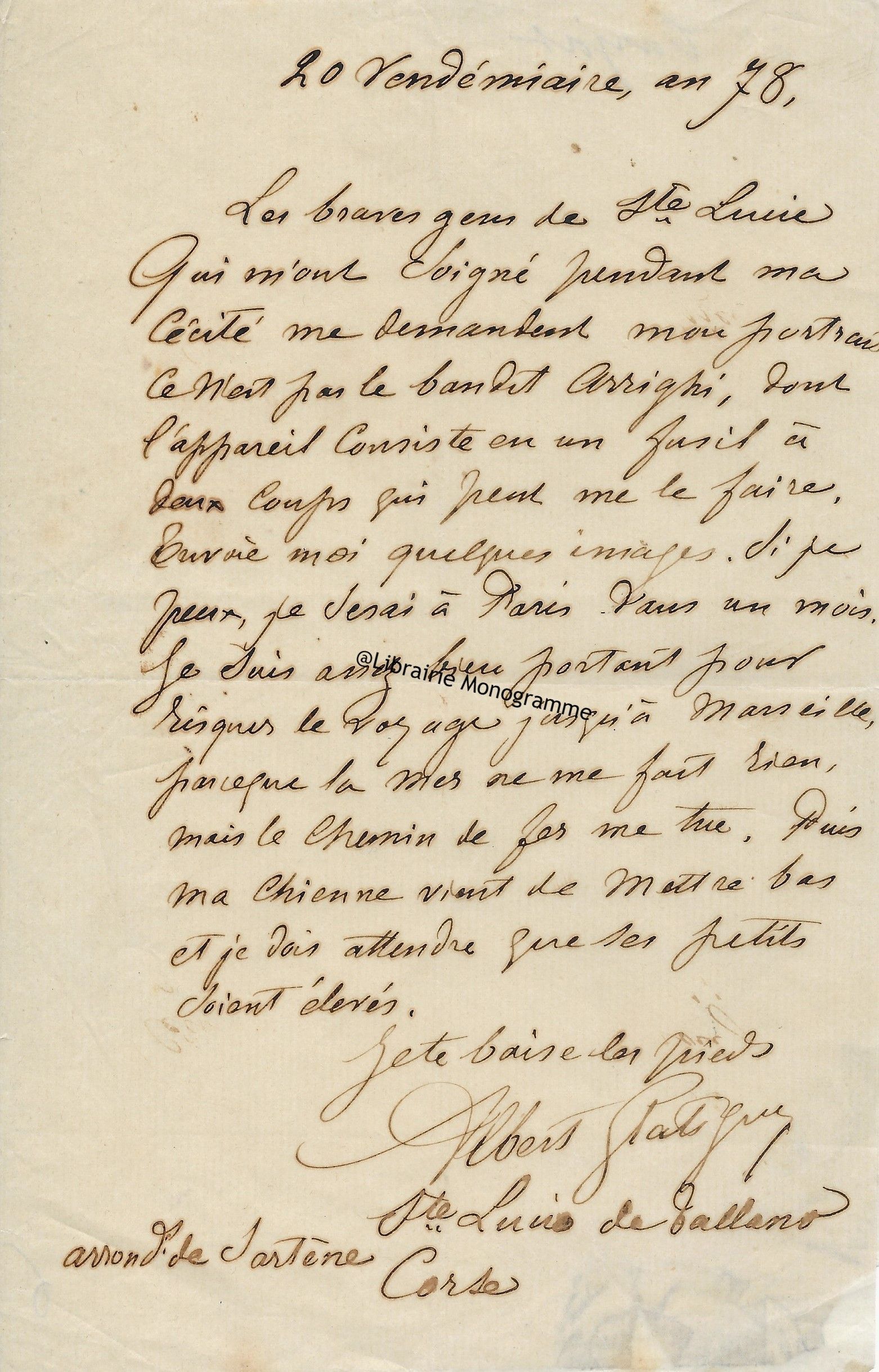 Lettre autographe signée au baron Antoine Guiraud (1780-1857) St-Sauveur-le-Vicomte (Manche),