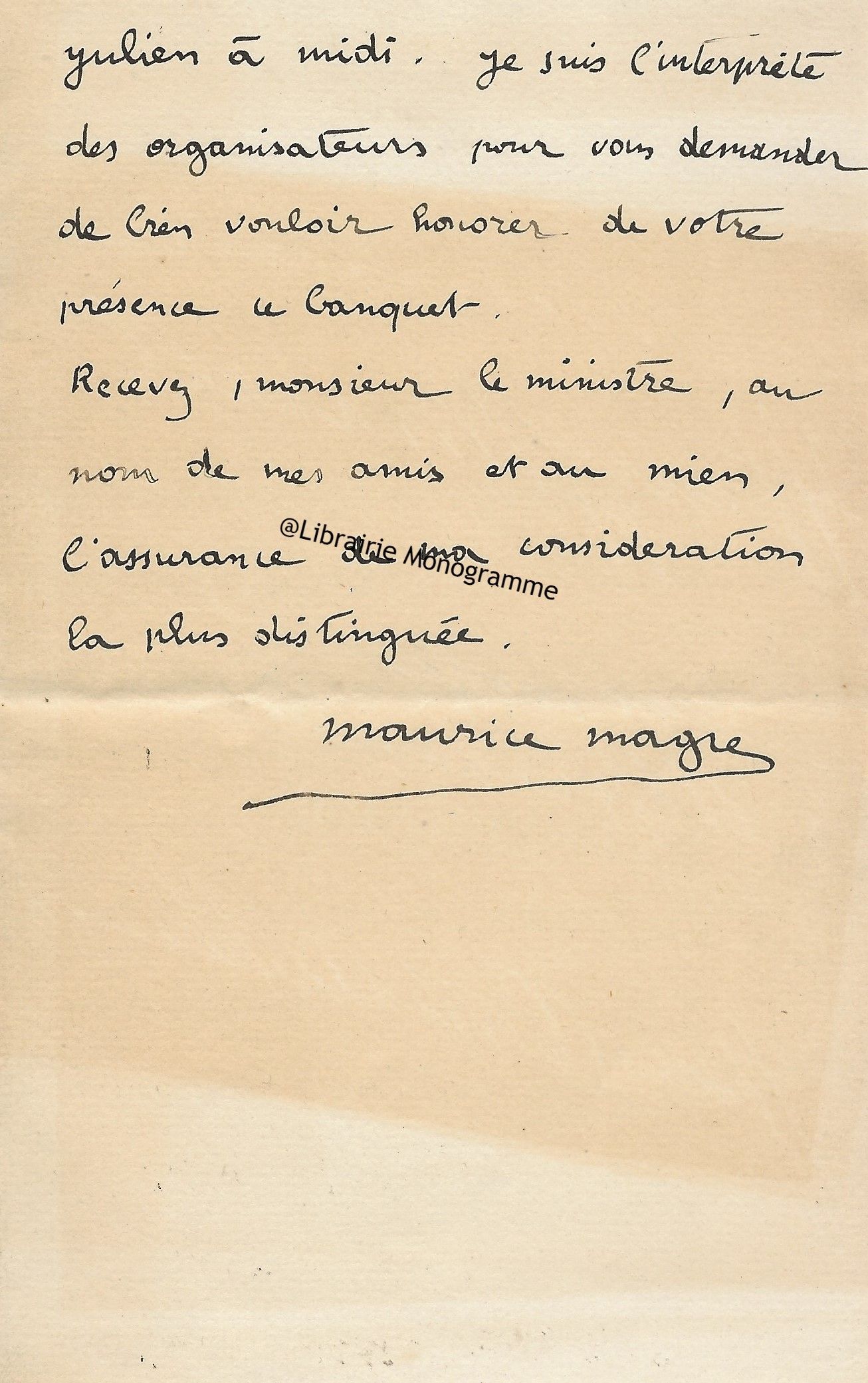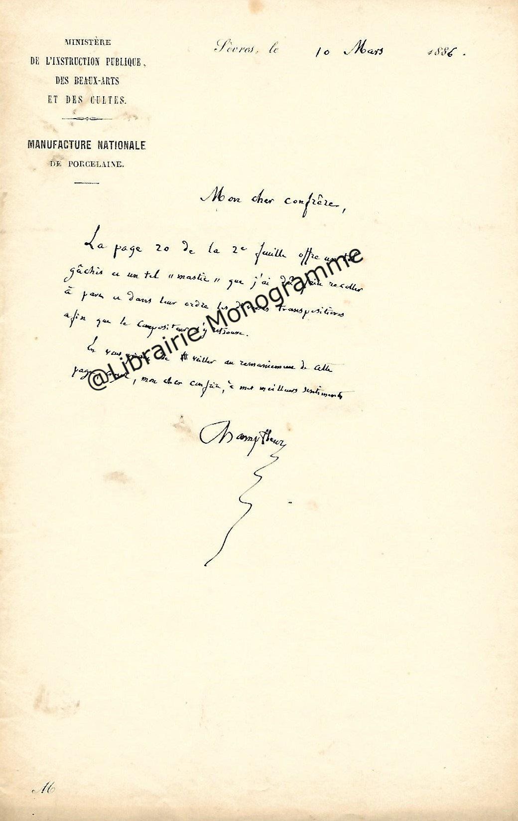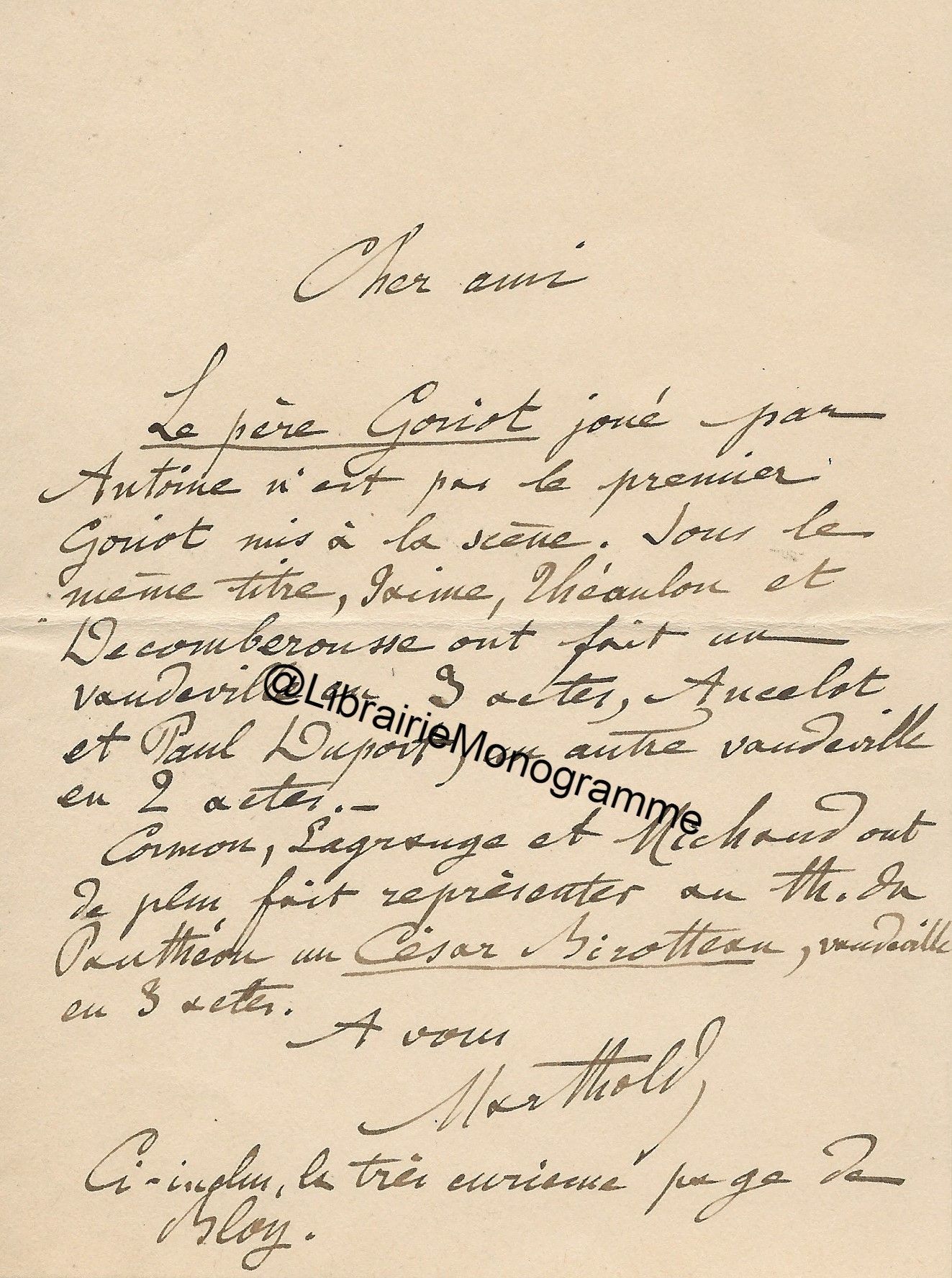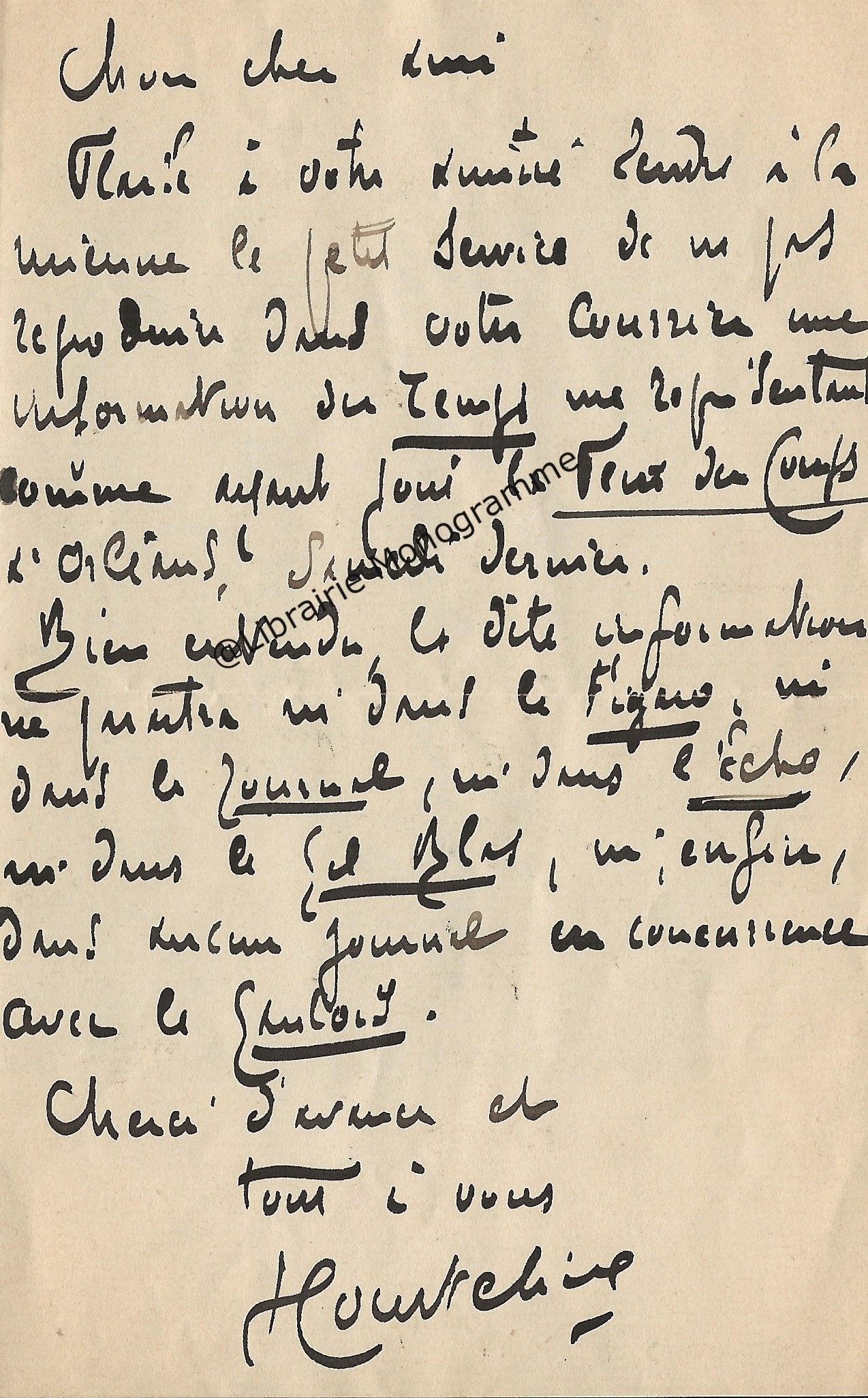 Lettre autographe signée à son cher directeur et ami. S.l.n.d. 1 p.in-8.