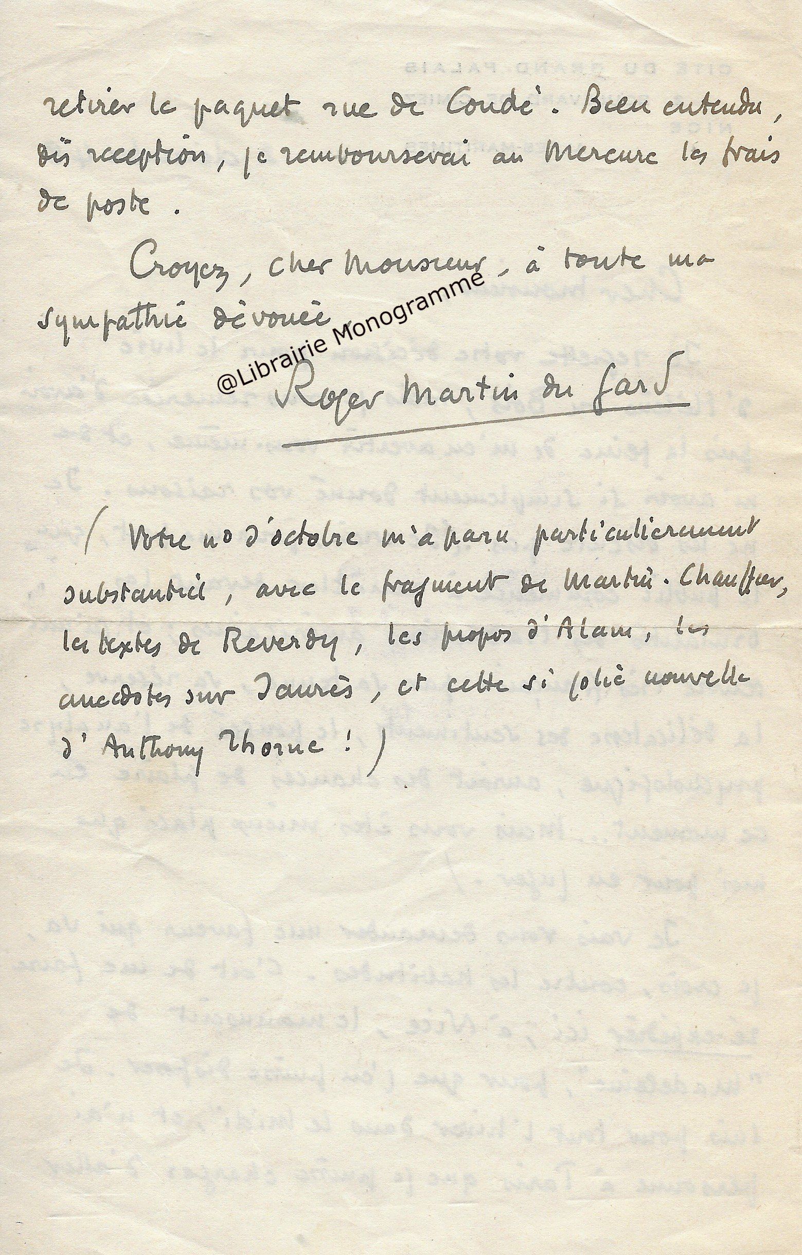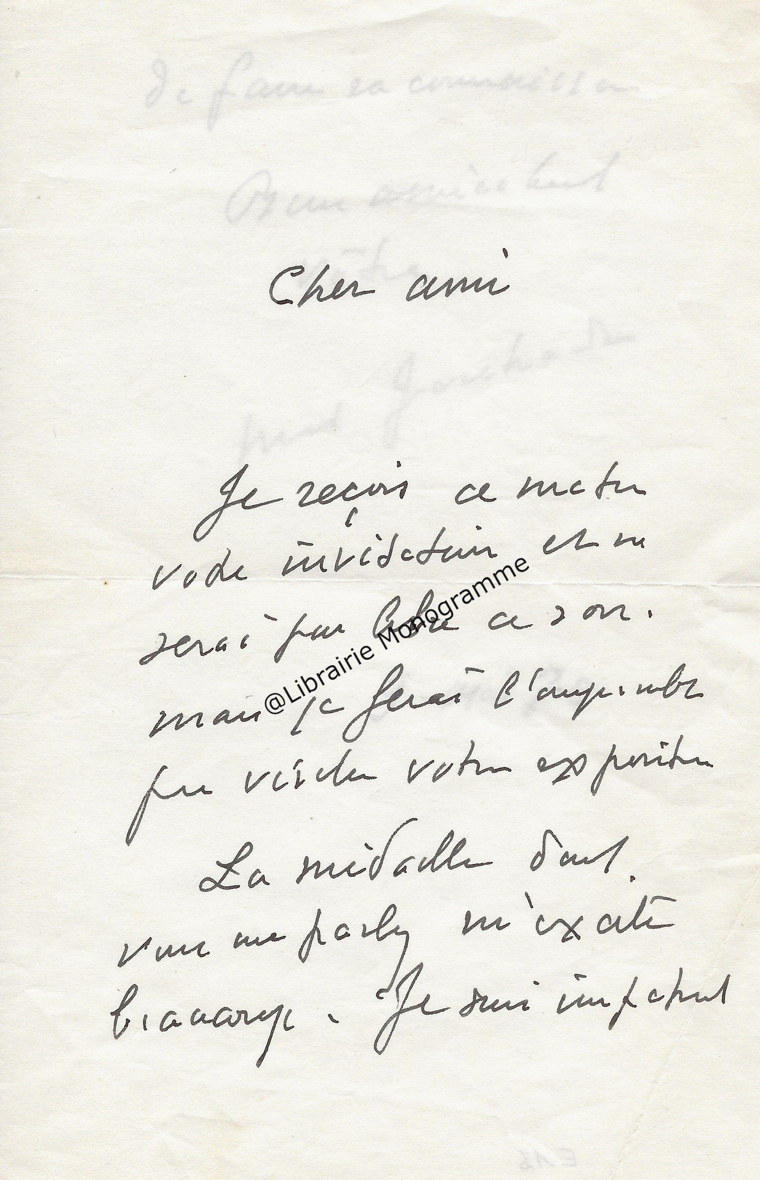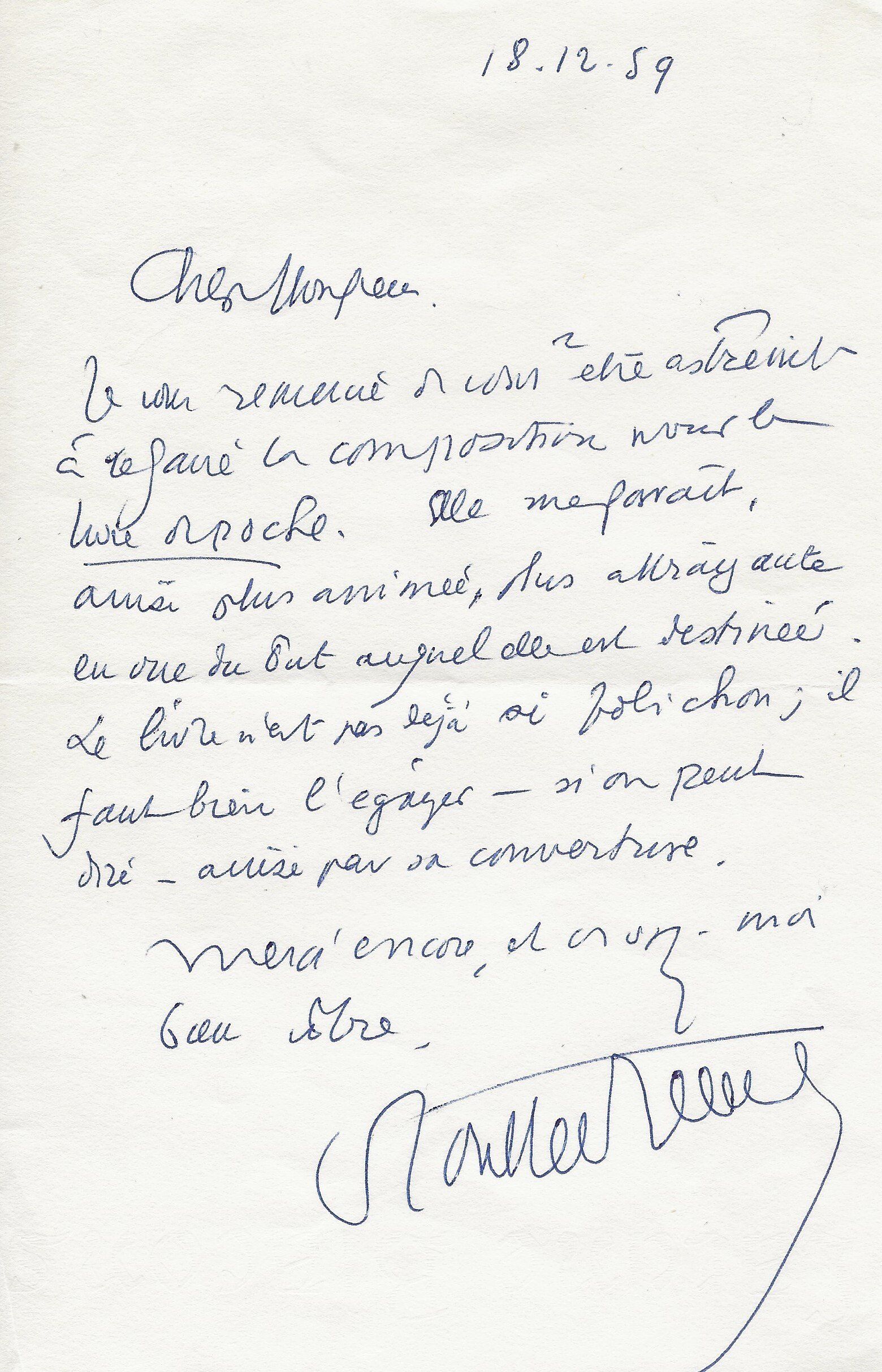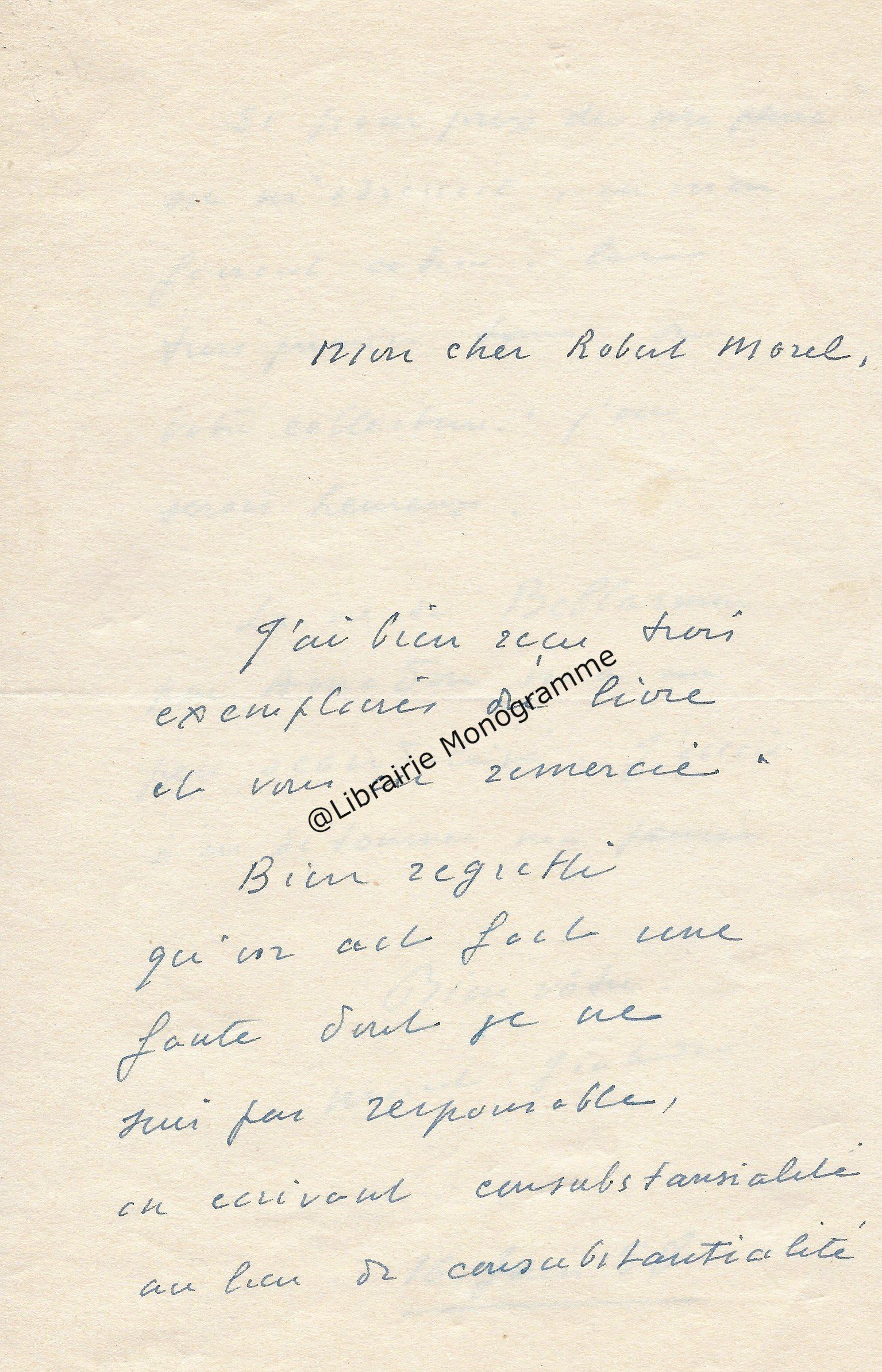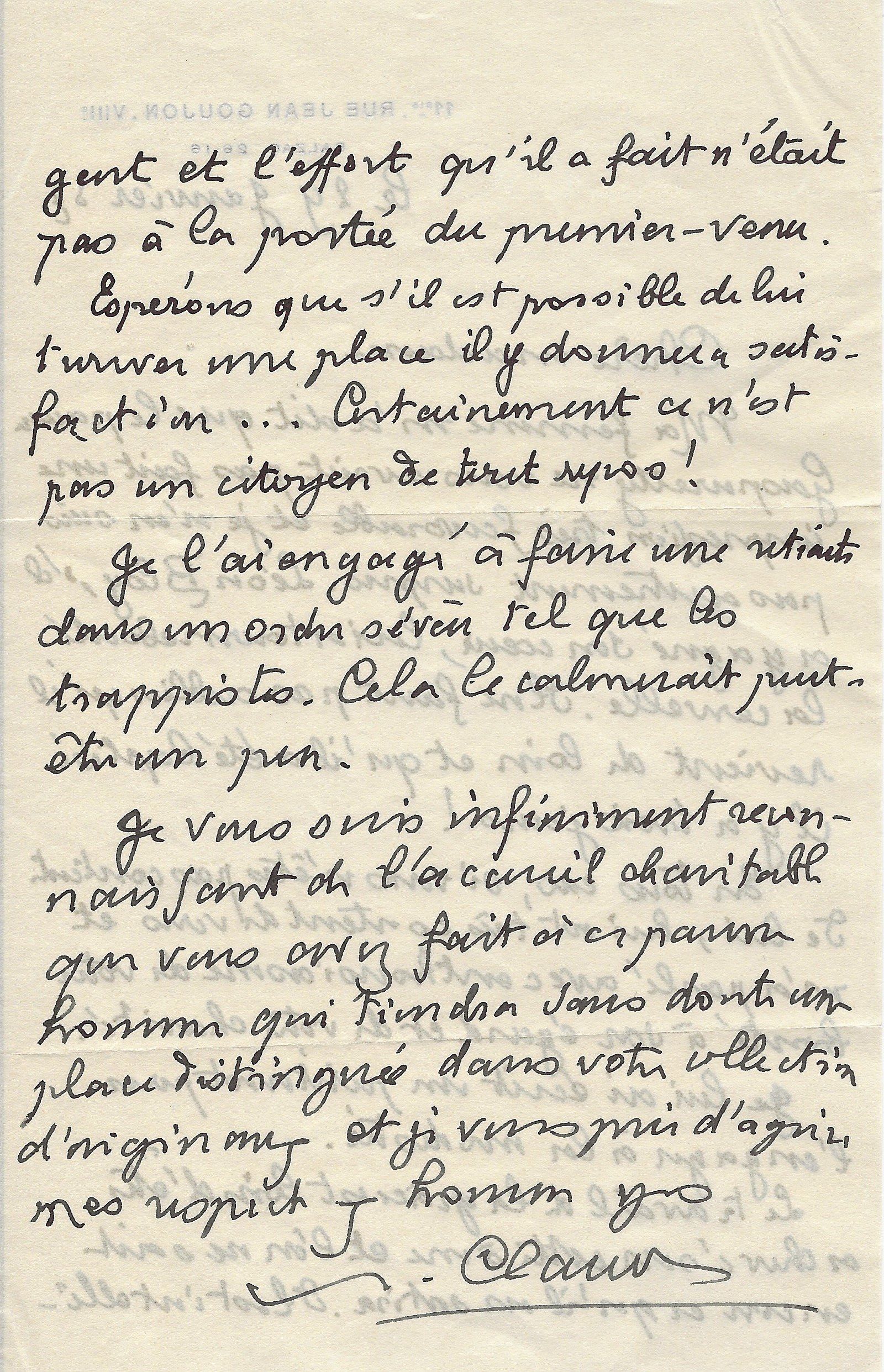 Il lui demande de bien vouloir l’excuser pour avoir tardé à lui répondre. « Sachez du moins que vous étiez un de mes remords, car je vous suis très reconnaissant de vous interesser ainsi à mes livres … Ci-joint, vous trouverez la dédicace. ».