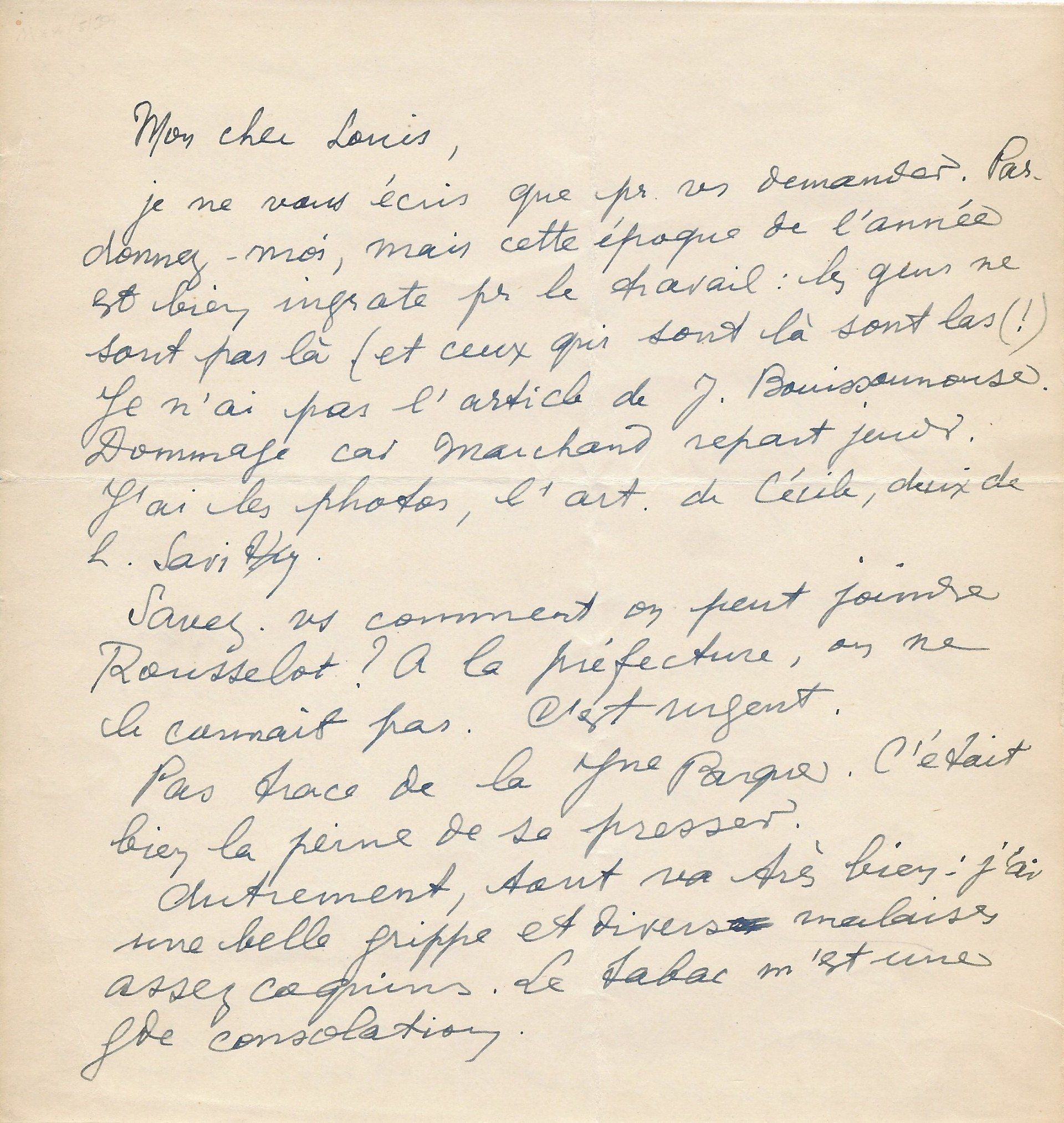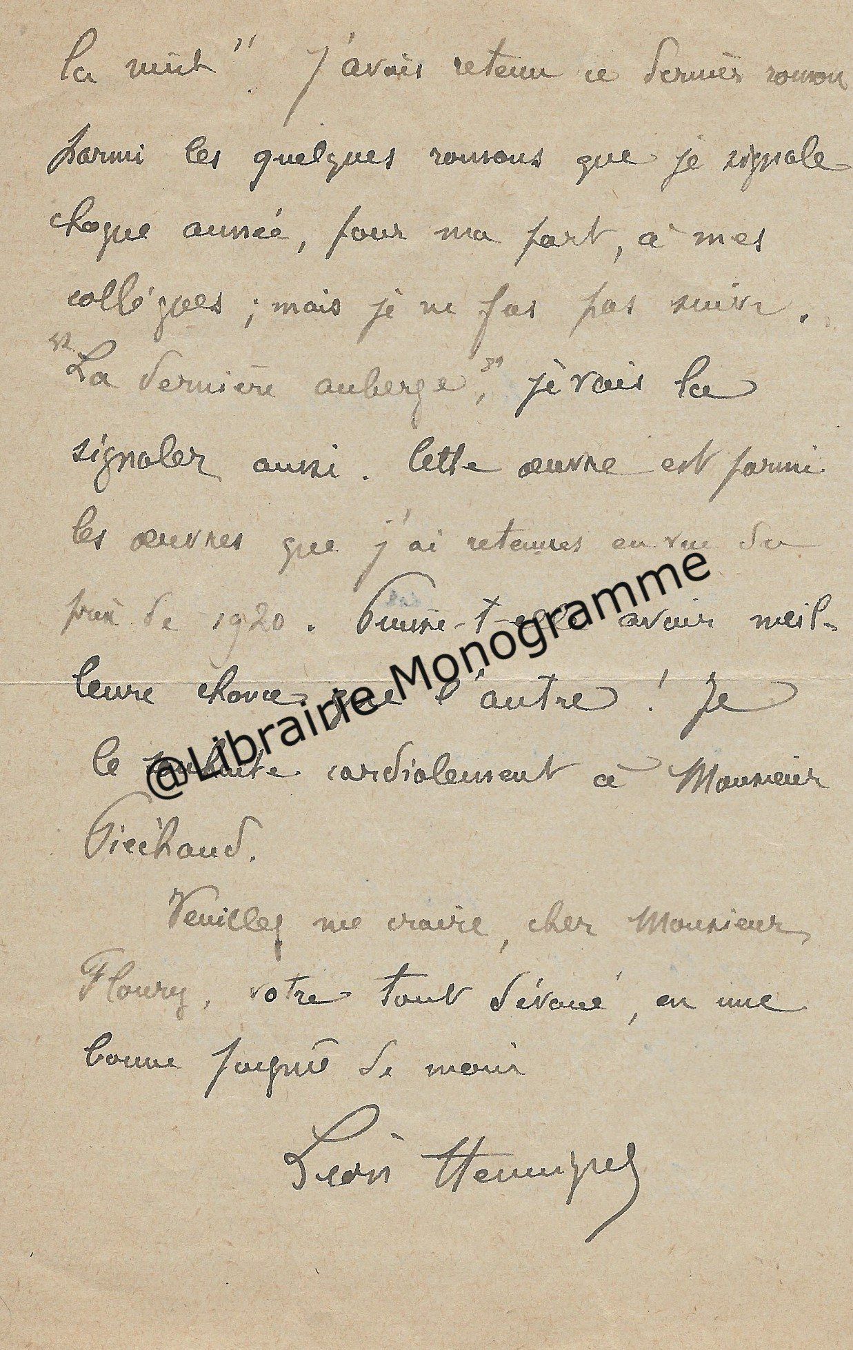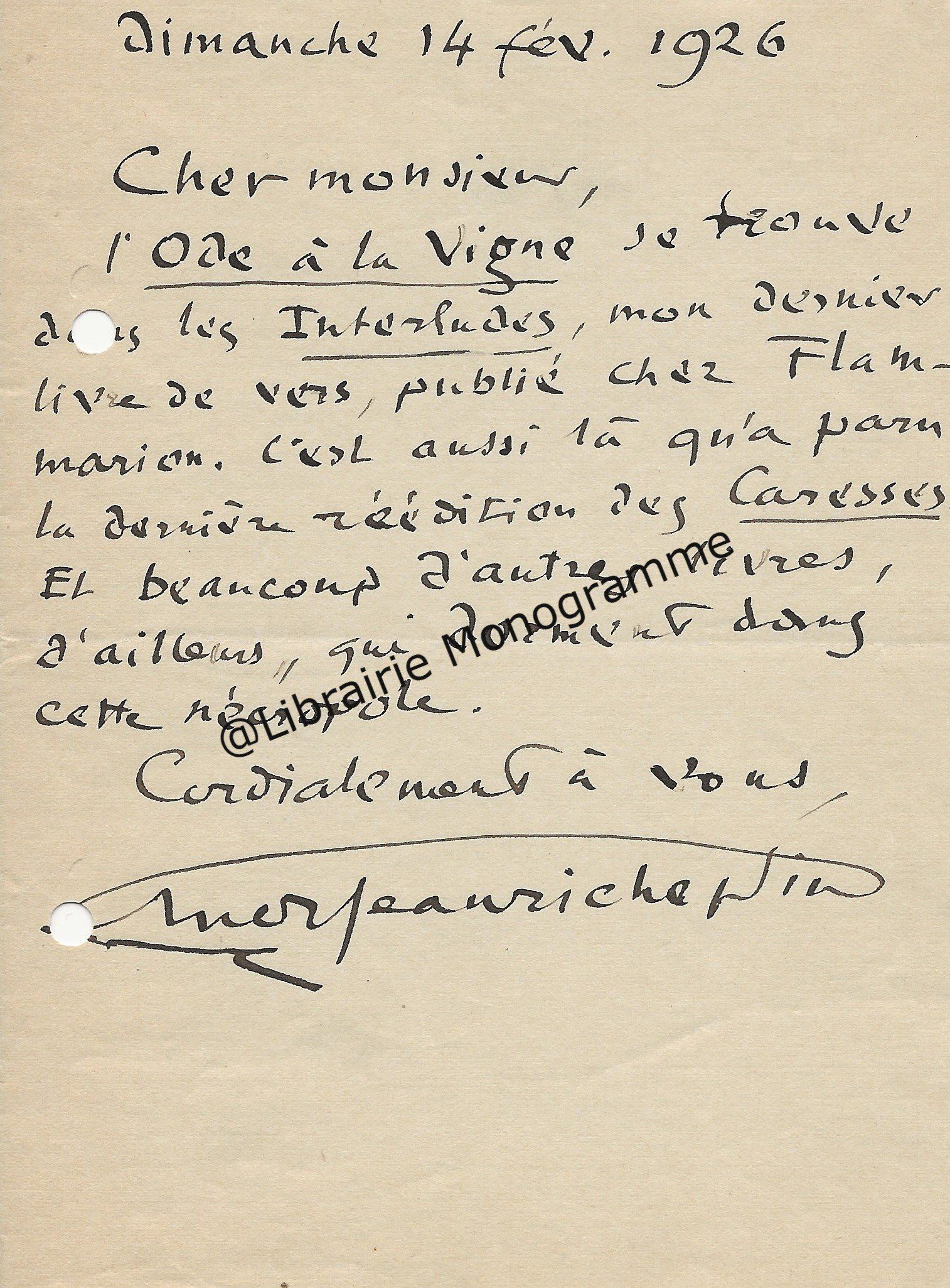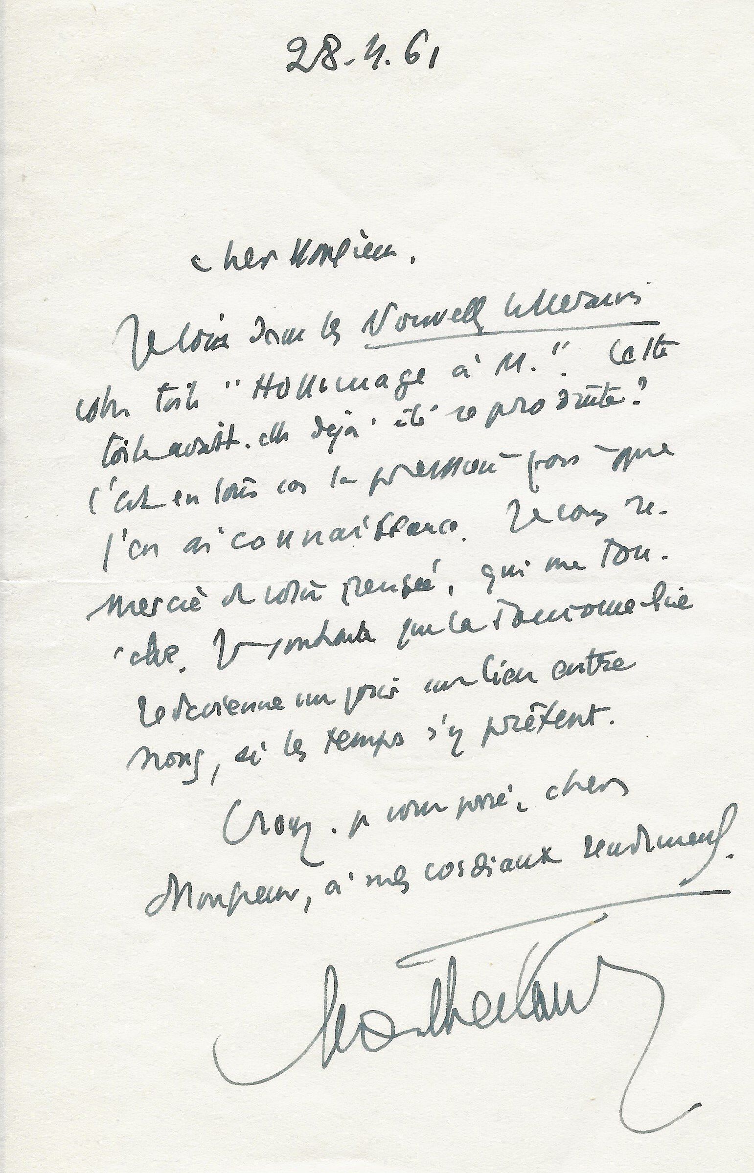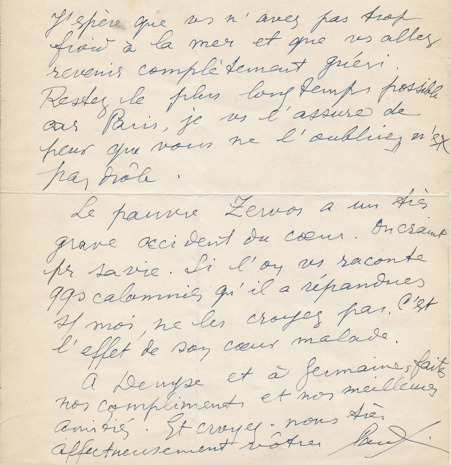 Il lui demande de bien vouloir l’excuser pour avoir tardé à lui répondre. « Sachez du moins que vous étiez un de mes remords, car je vous suis très reconnaissant de vous interesser ainsi à mes livres … Ci-joint, vous trouverez la dédicace. ».
