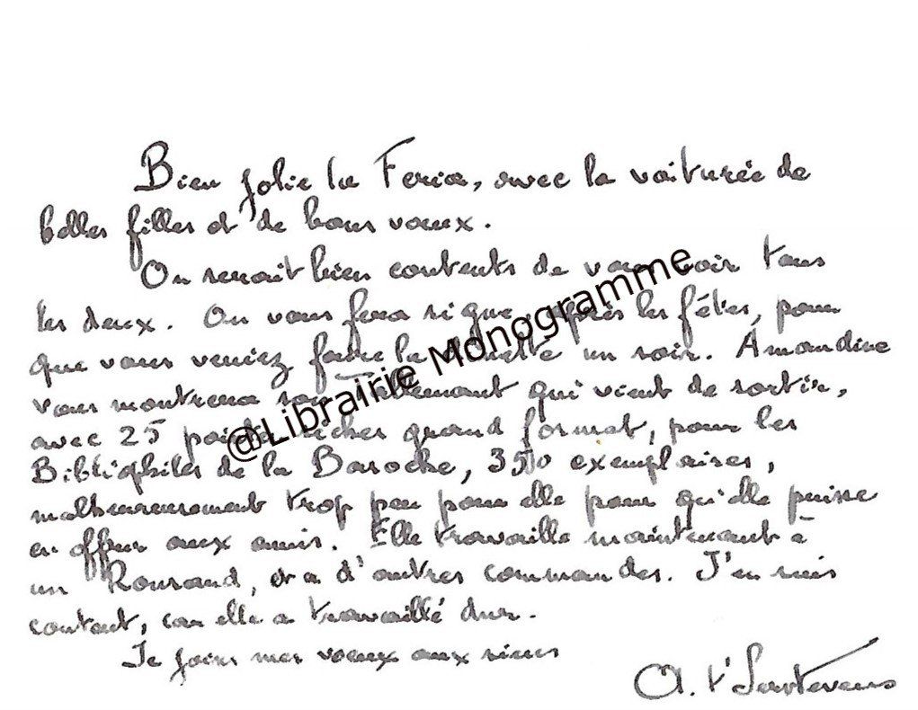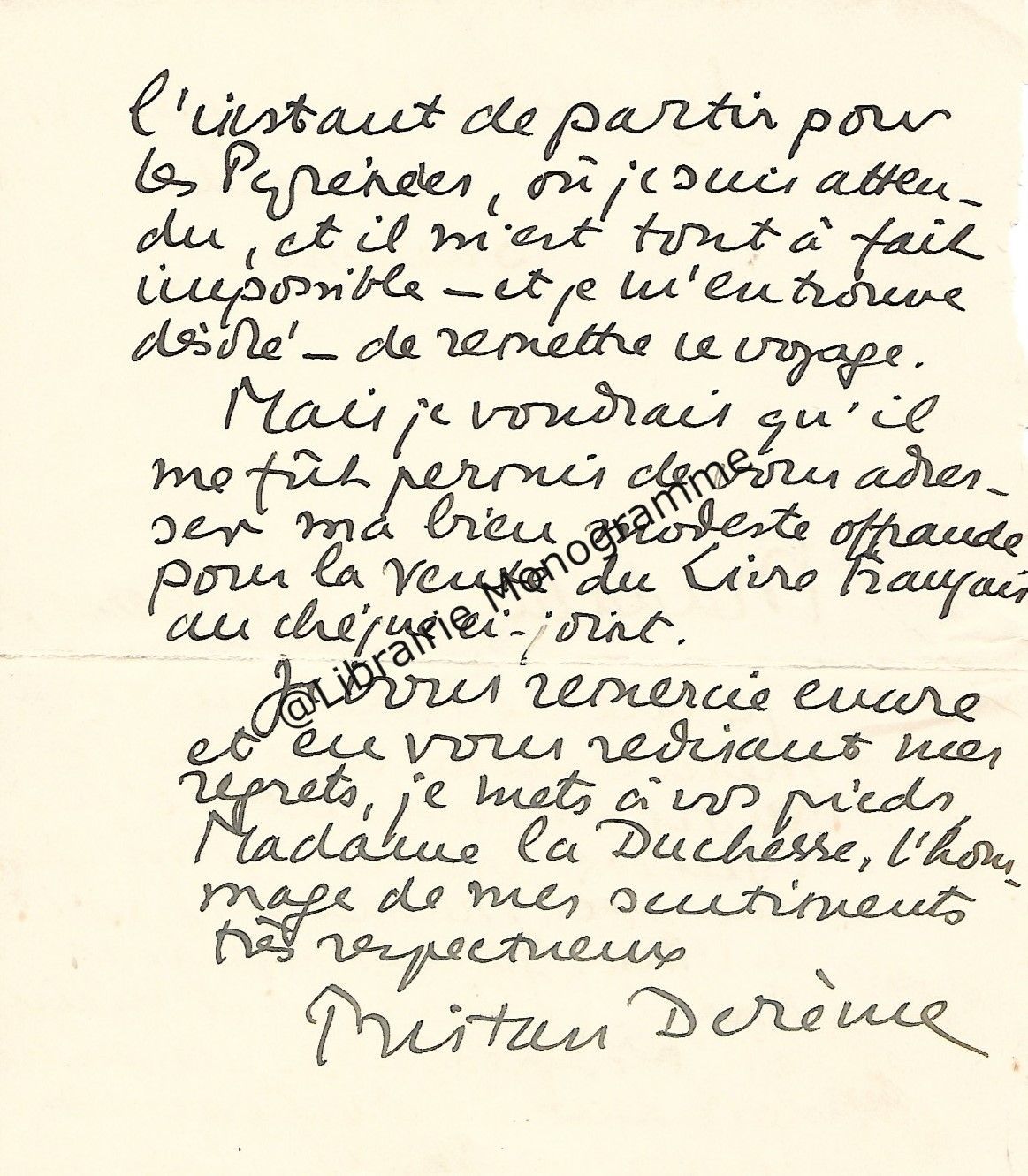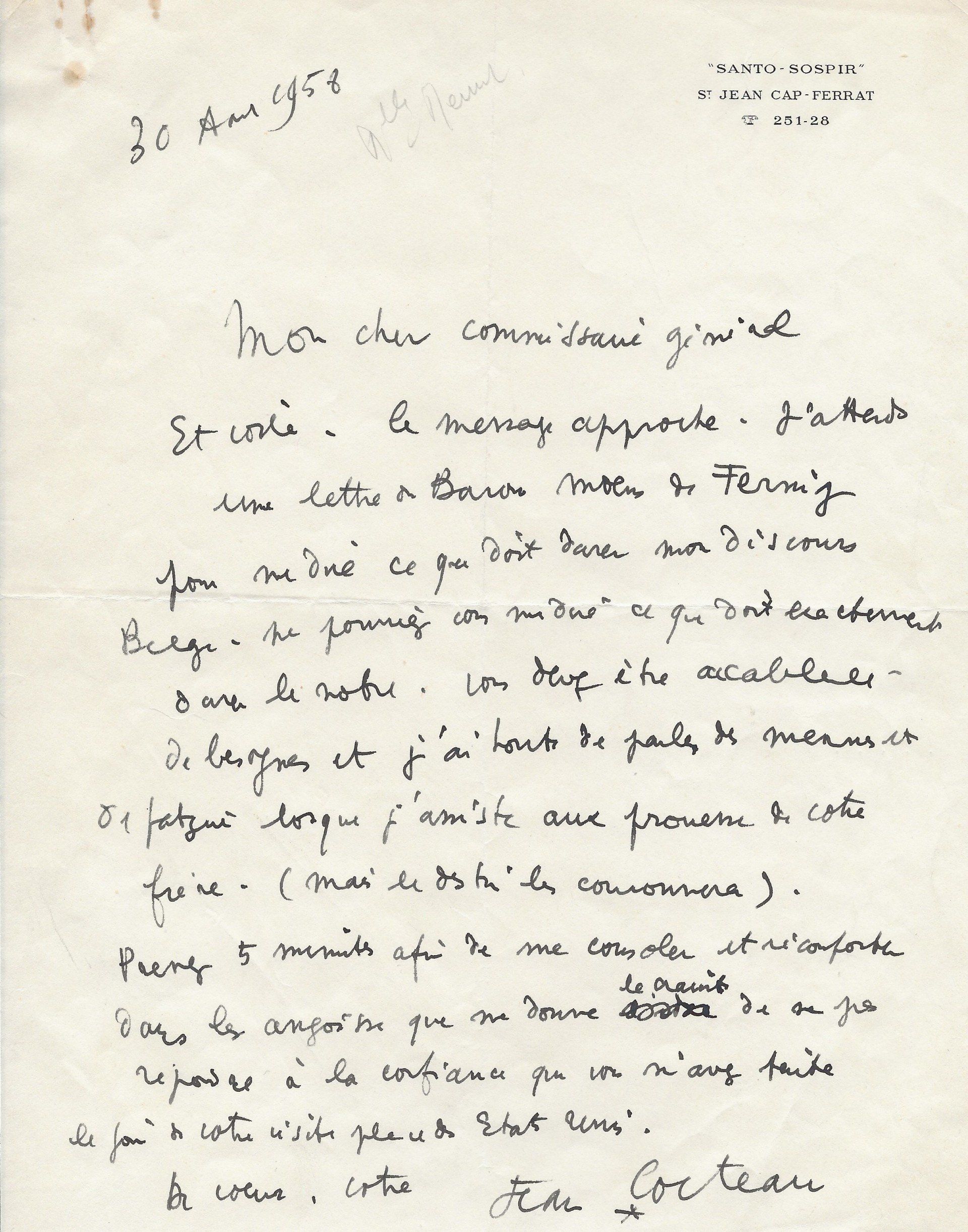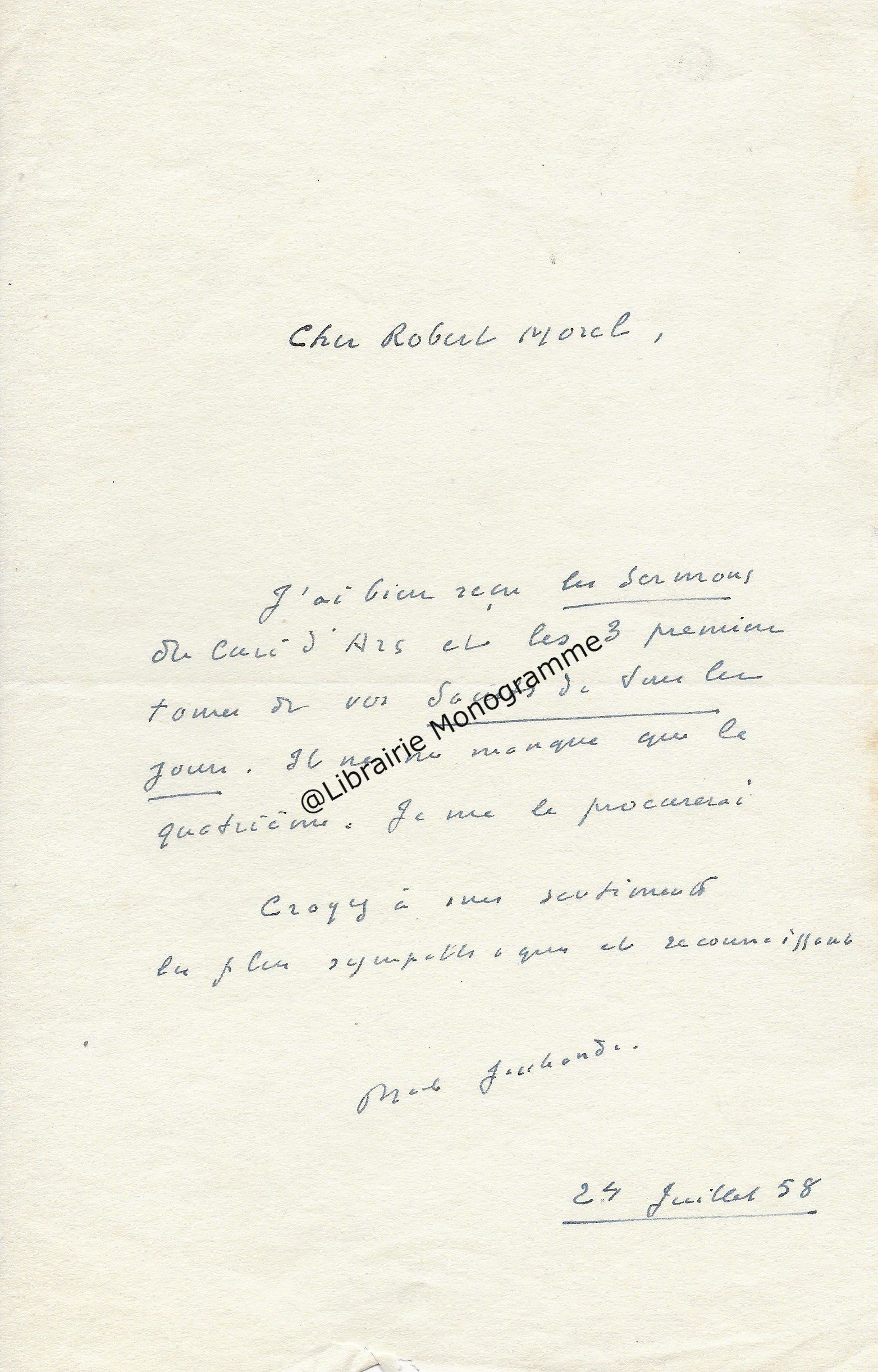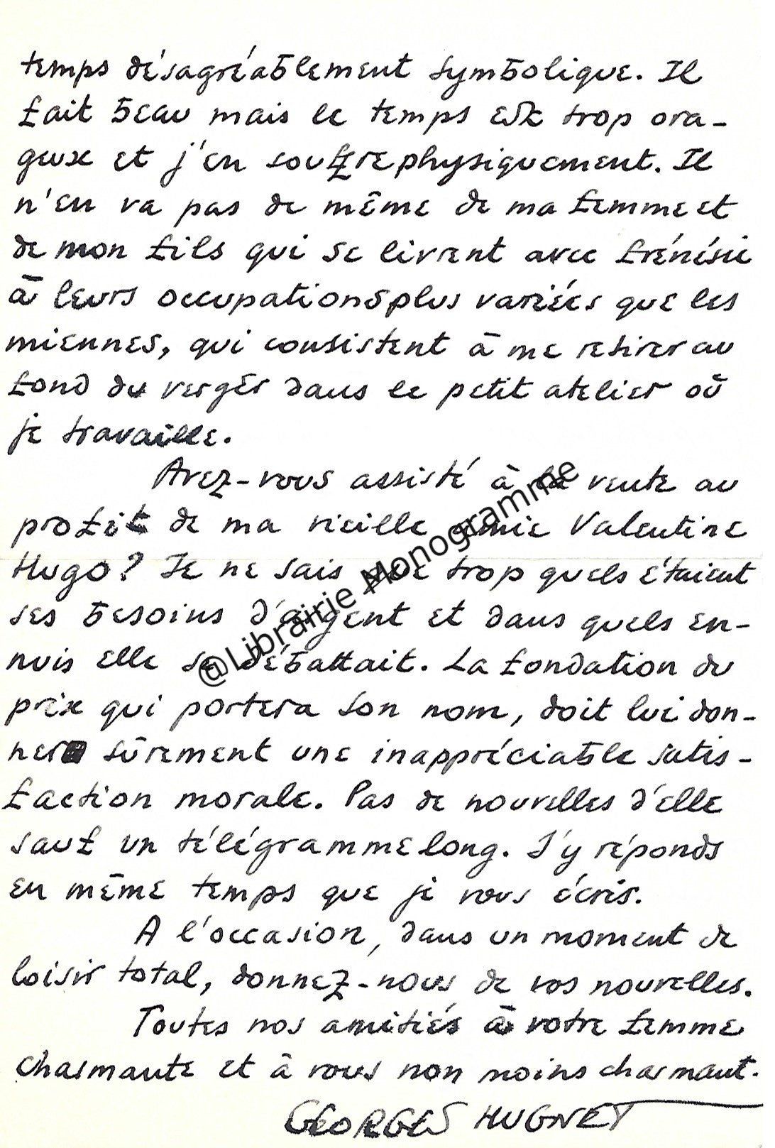 Il lui demande de bien vouloir l’excuser pour avoir tardé à lui répondre. « Sachez du moins que vous étiez un de mes remords, car je vous suis très reconnaissant de vous interesser ainsi à mes livres … Ci-joint, vous trouverez la dédicace. ».