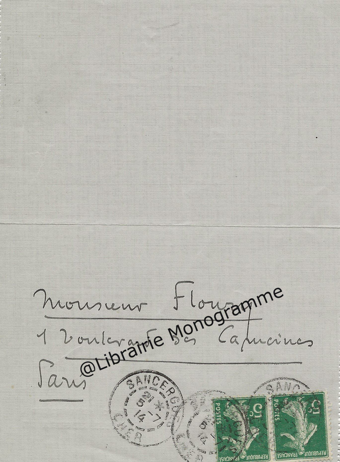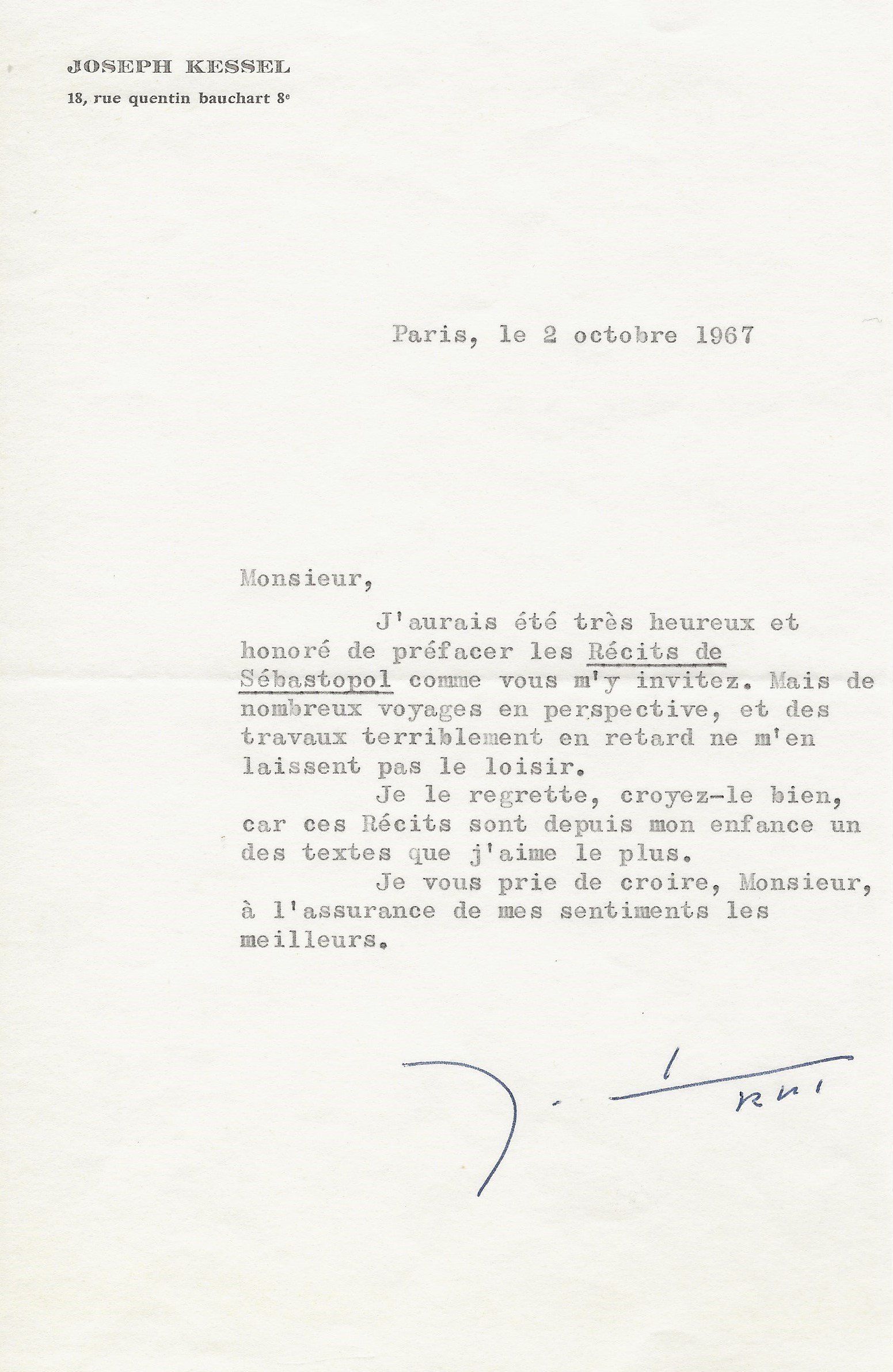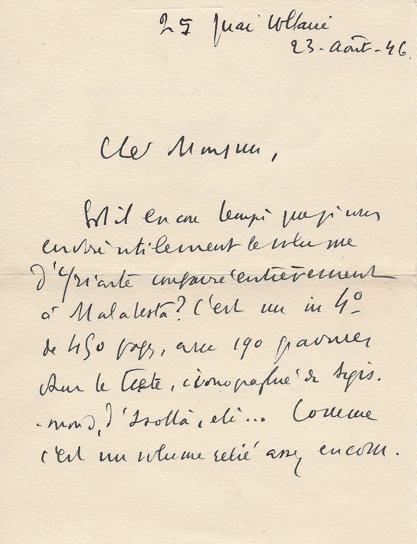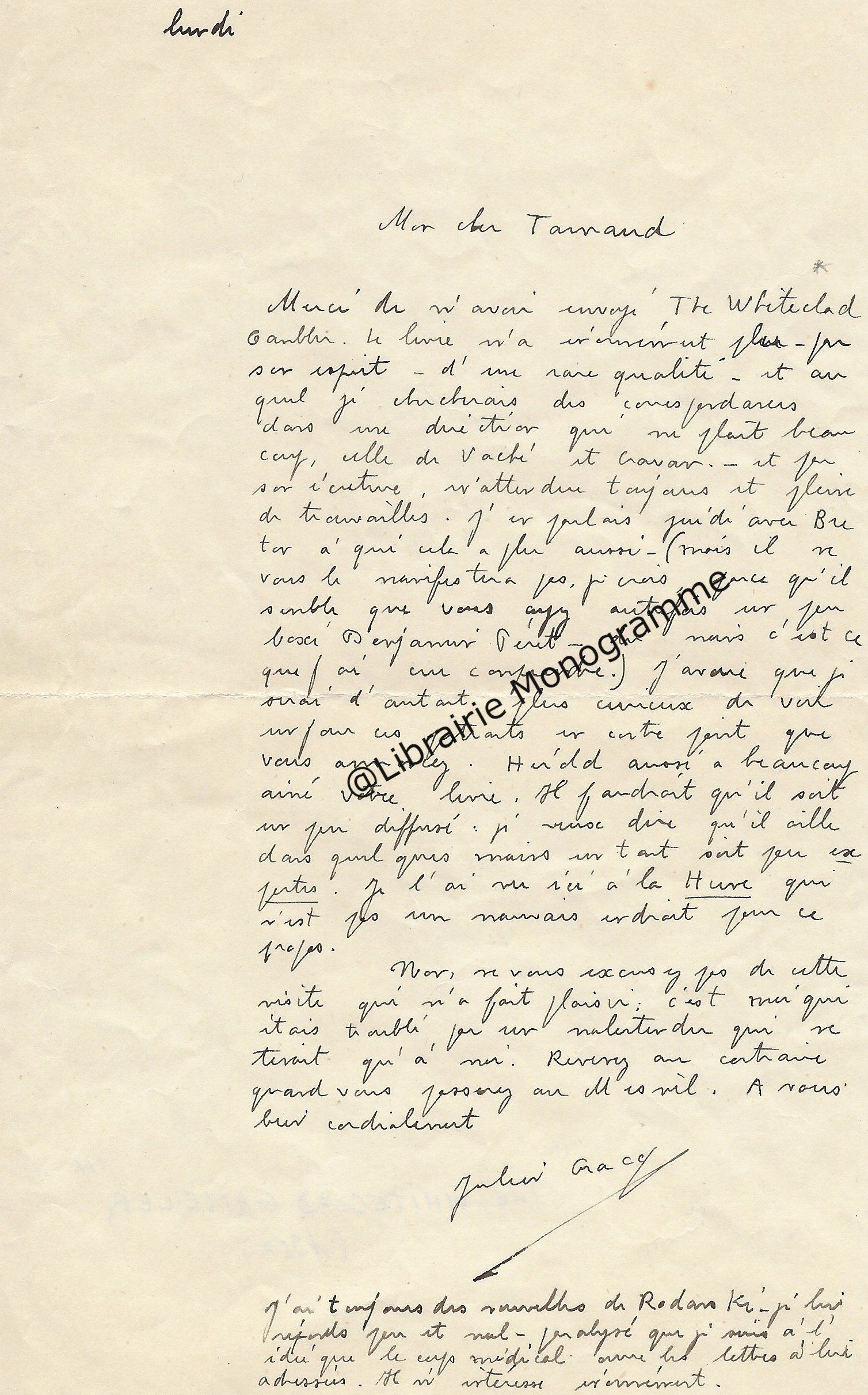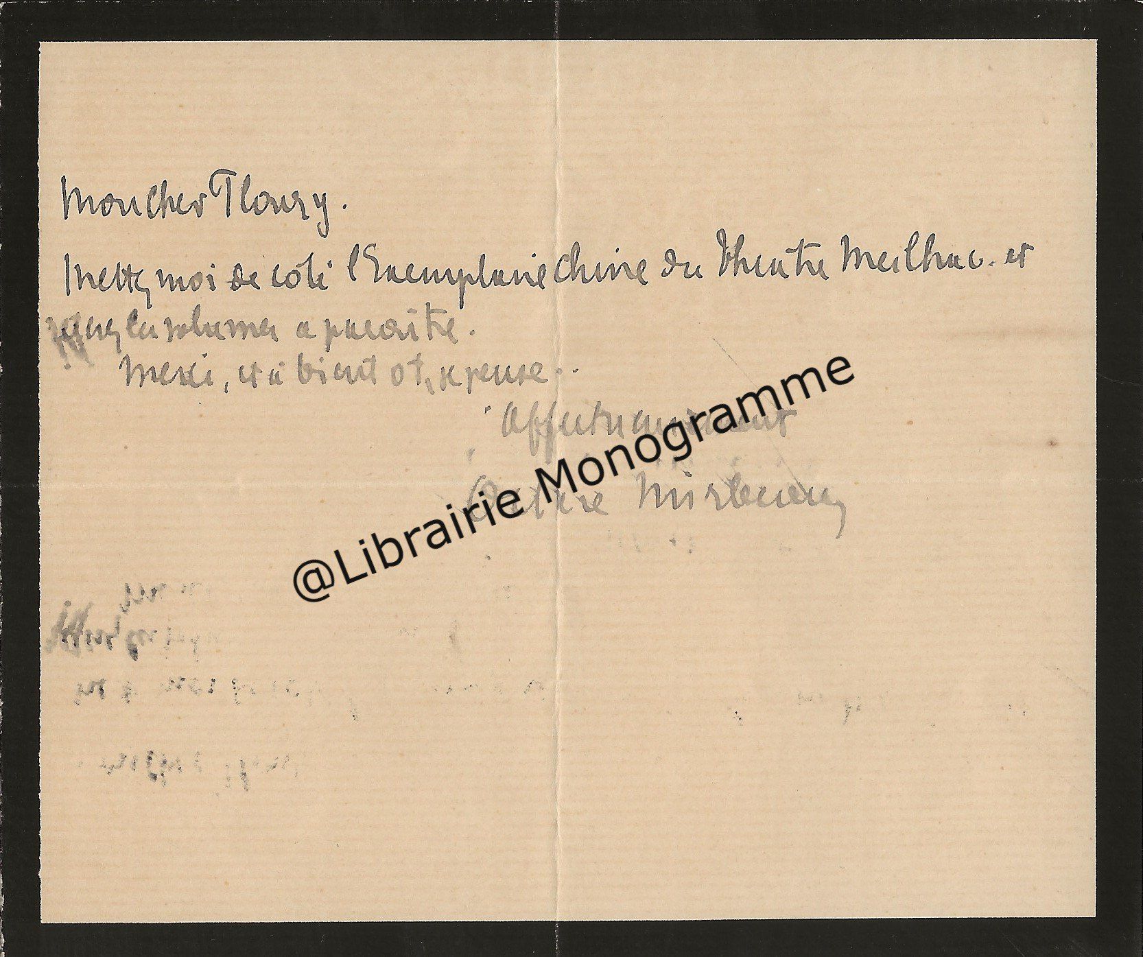 Il lui demande de bien vouloir l’excuser pour avoir tardé à lui répondre. « Sachez du moins que vous étiez un de mes remords, car je vous suis très reconnaissant de vous interesser ainsi à mes livres … Ci-joint, vous trouverez la dédicace. ».