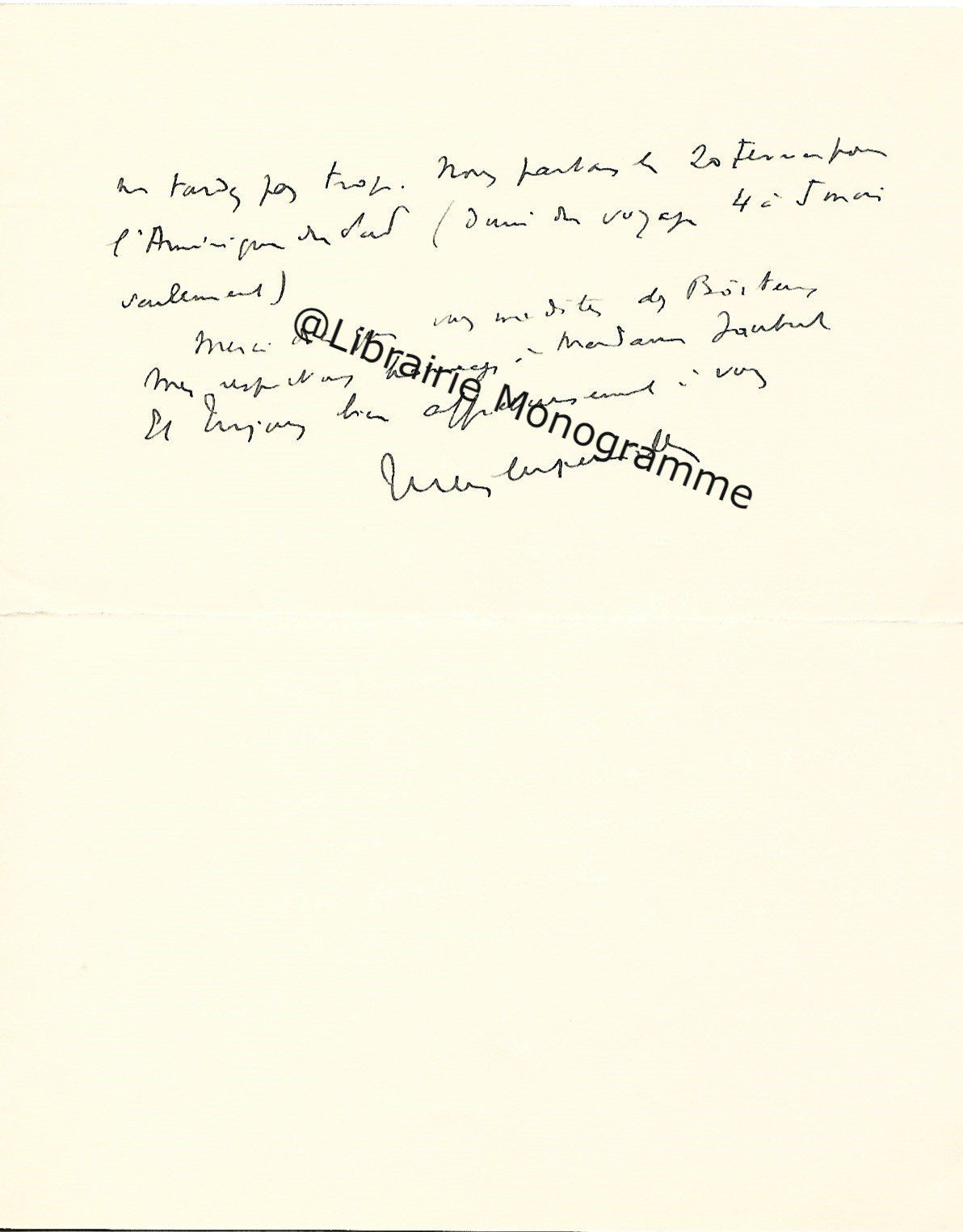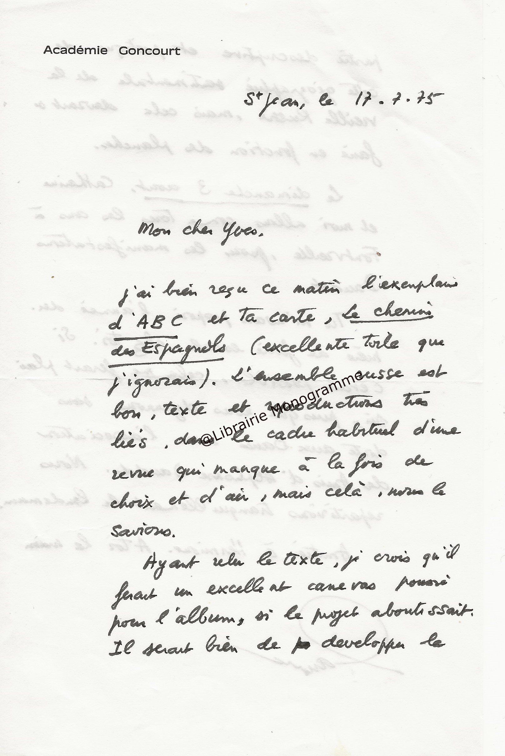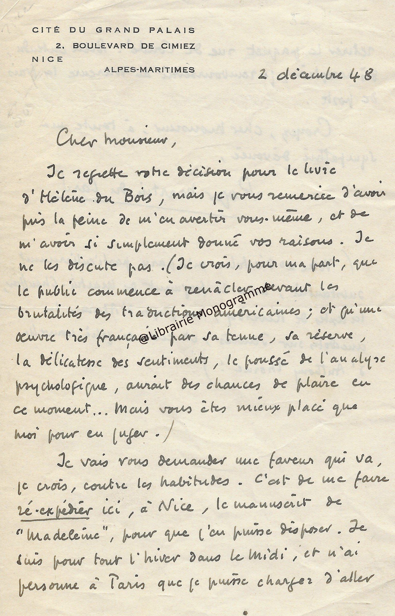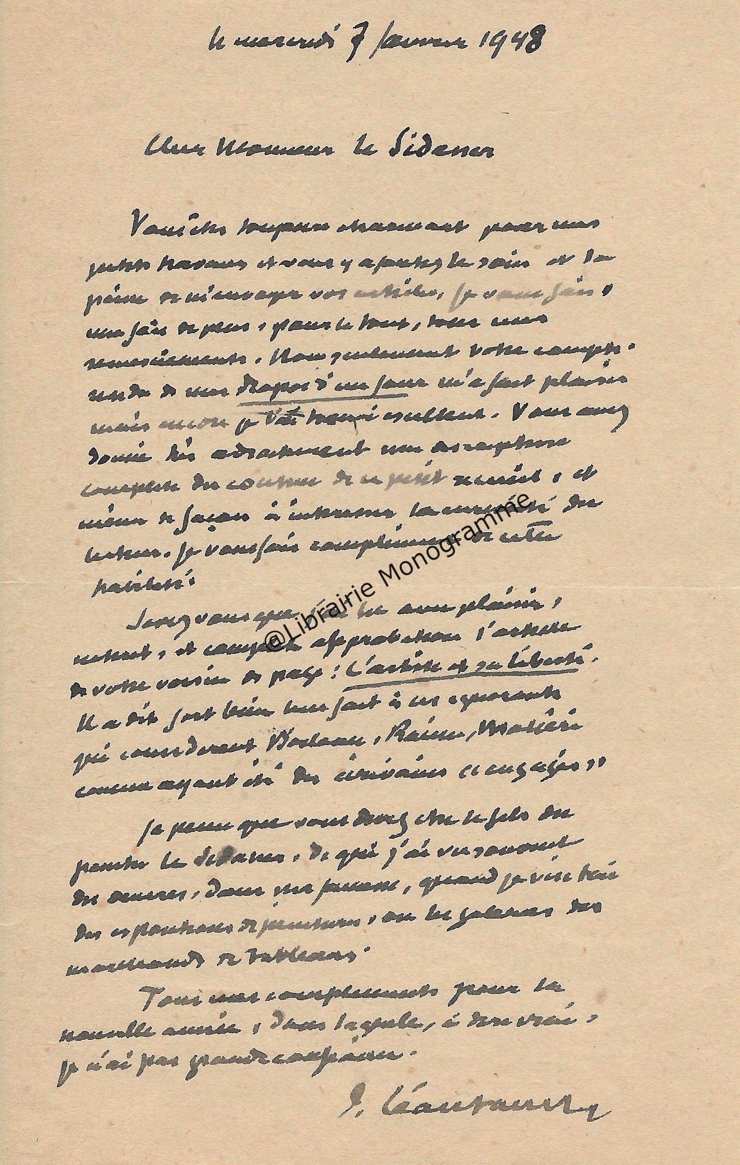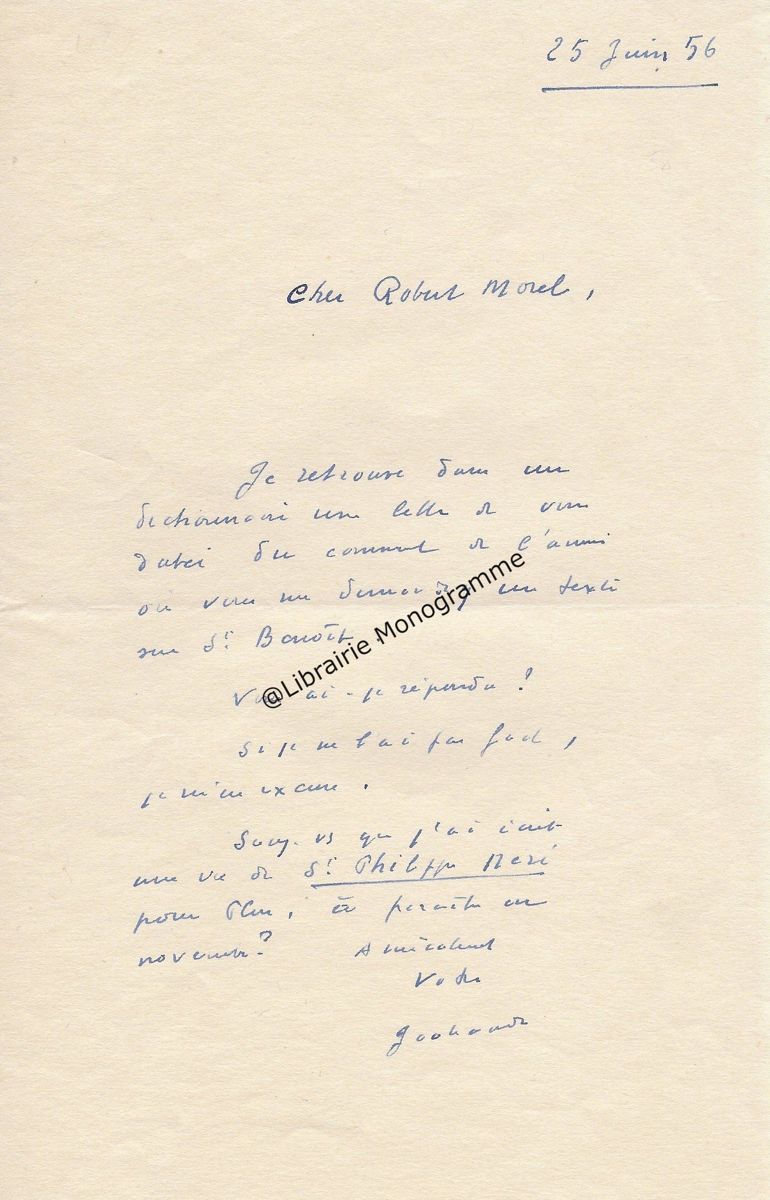 Il lui demande de bien vouloir l’excuser pour avoir tardé à lui répondre. « Sachez du moins que vous étiez un de mes remords, car je vous suis très reconnaissant de vous interesser ainsi à mes livres … Ci-joint, vous trouverez la dédicace. ».