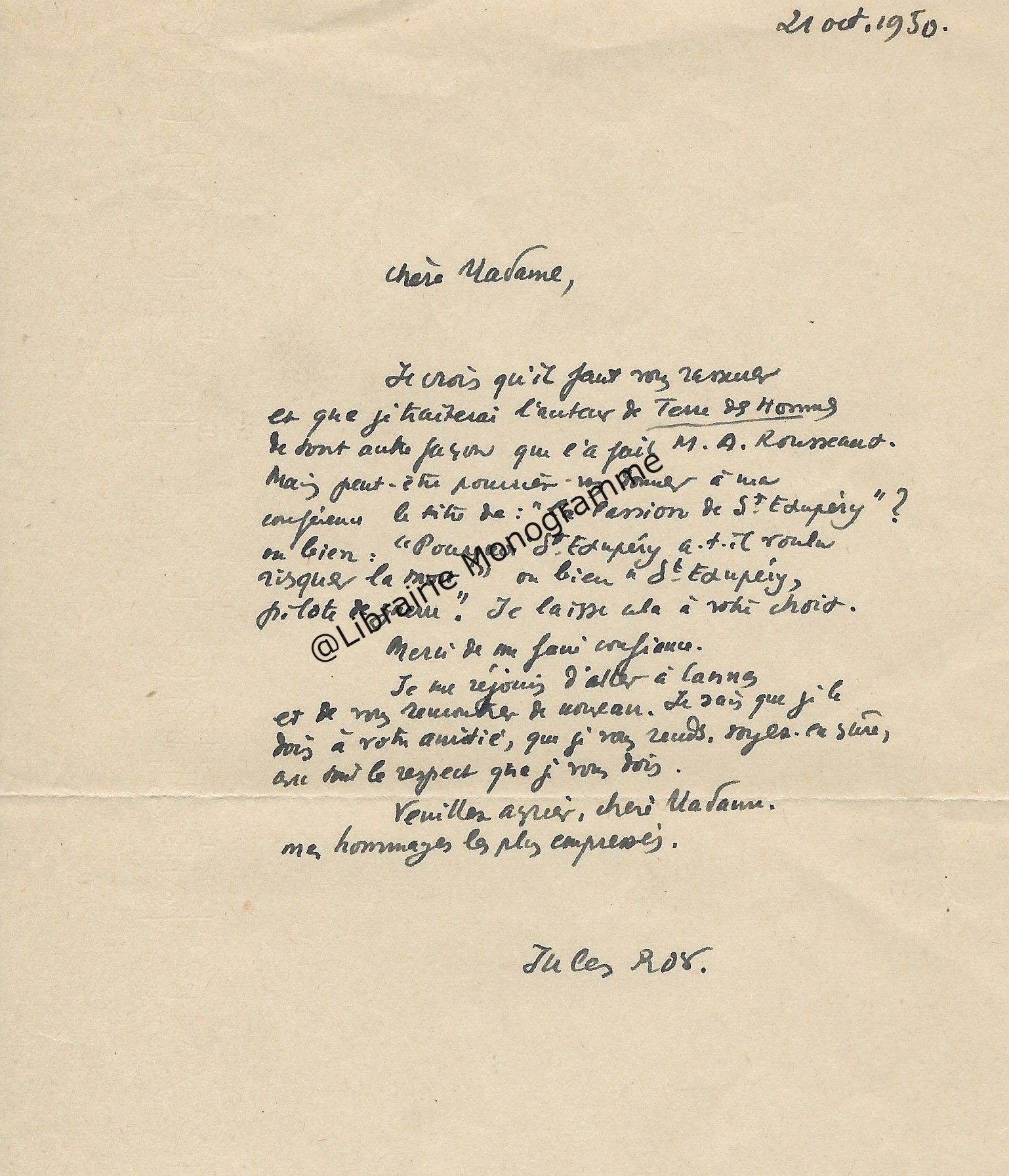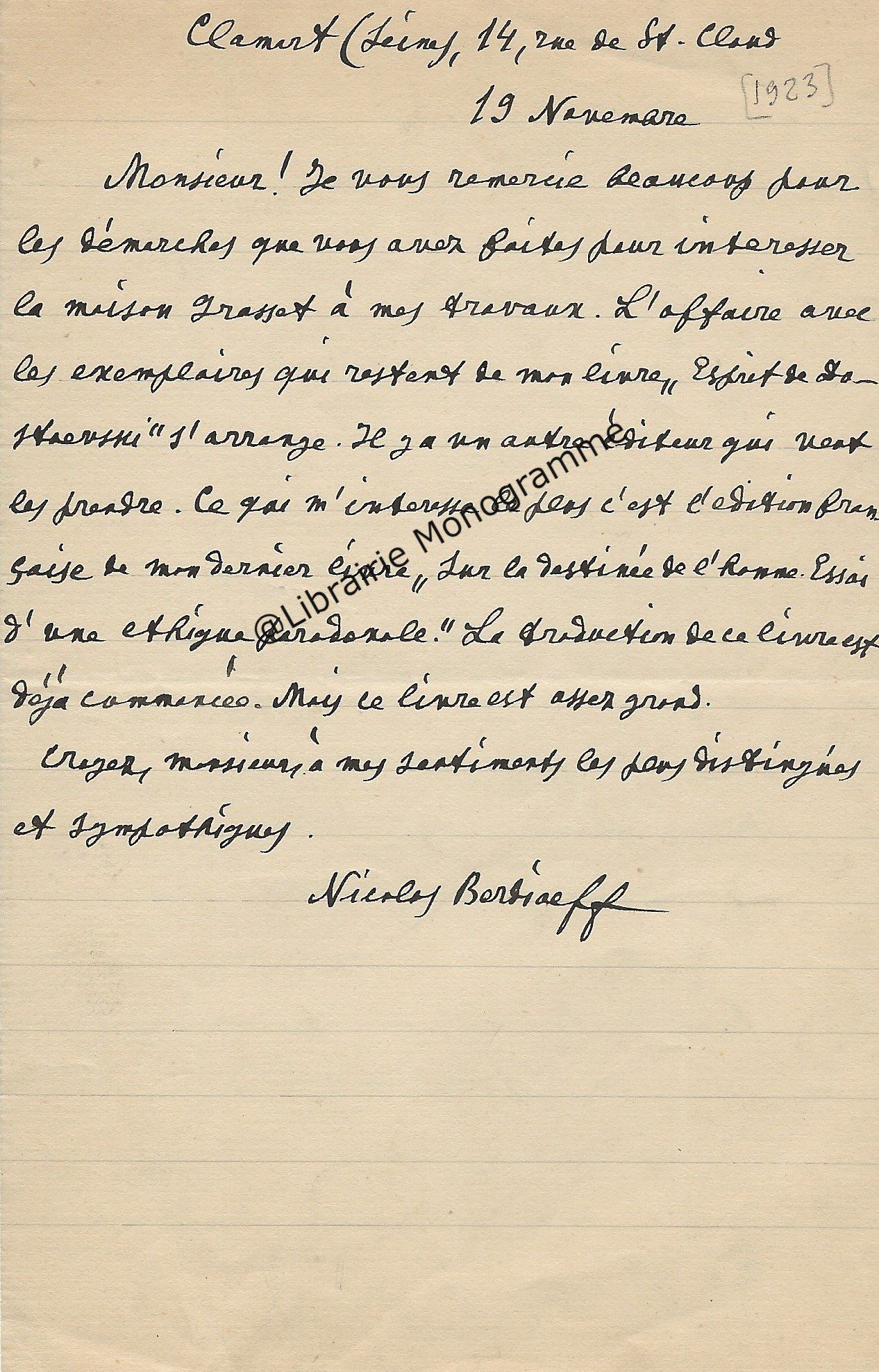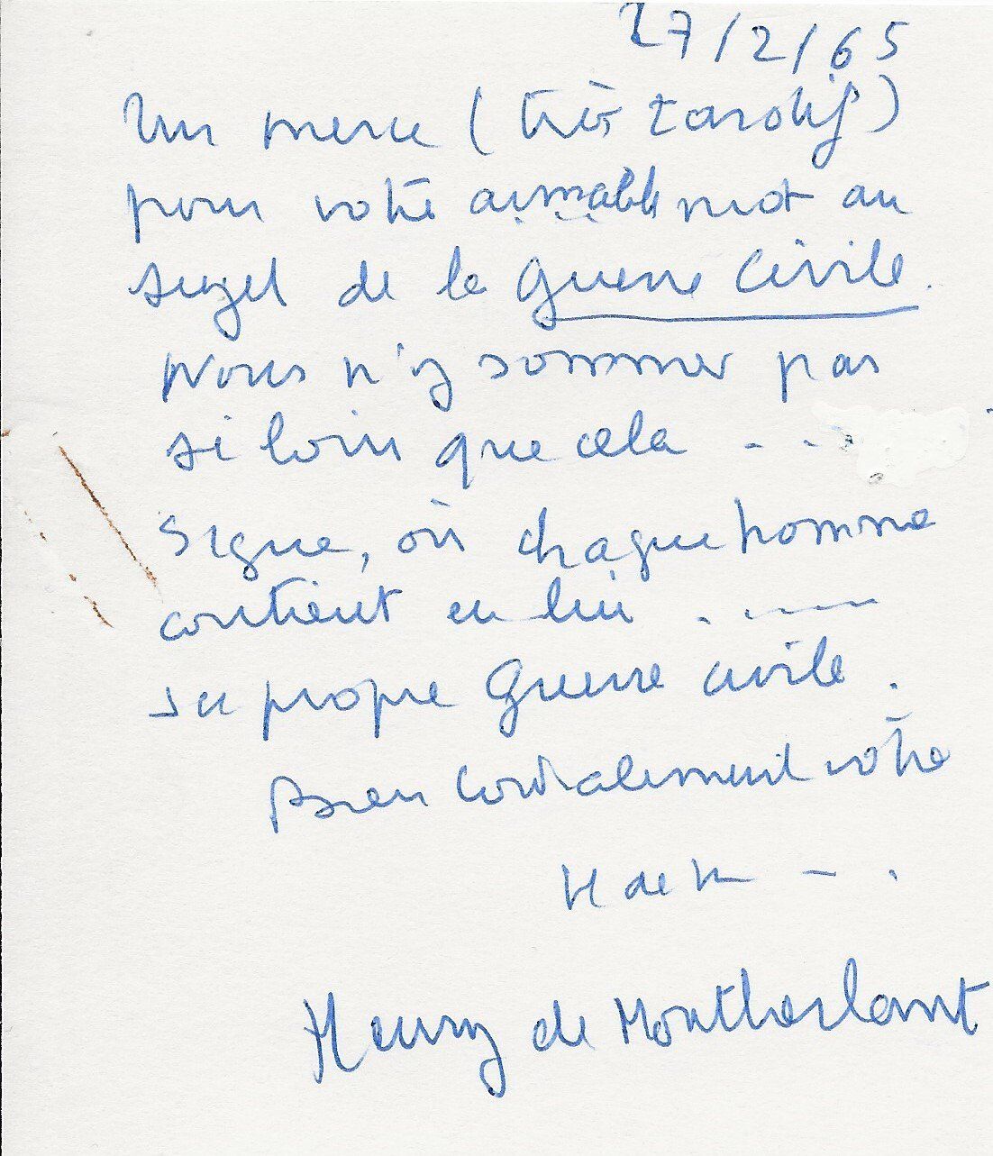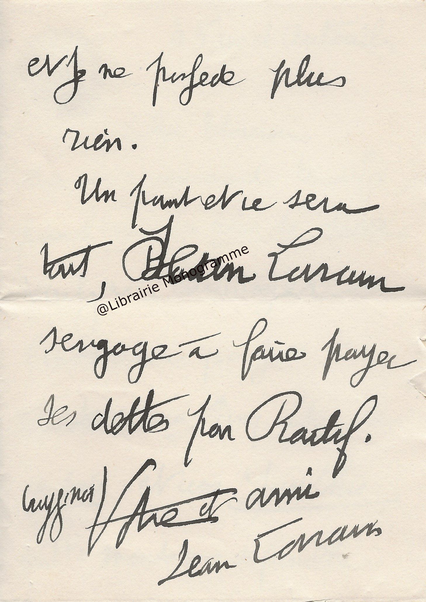 Il lui demande de bien vouloir l’excuser pour avoir tardé à lui répondre. « Sachez du moins que vous étiez un de mes remords, car je vous suis très reconnaissant de vous interesser ainsi à mes livres … Ci-joint, vous trouverez la dédicace. ».