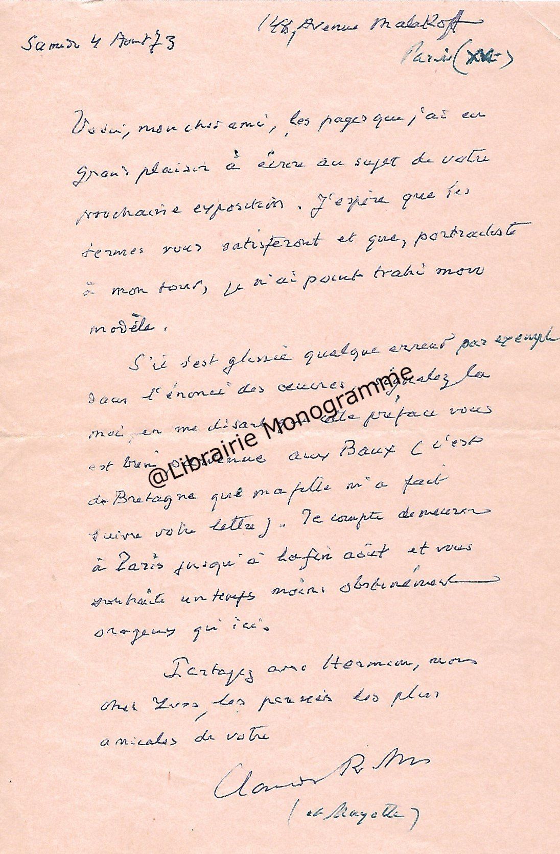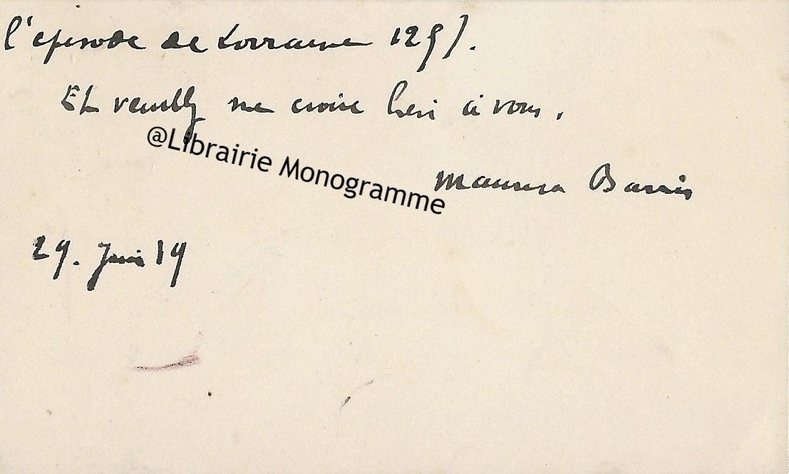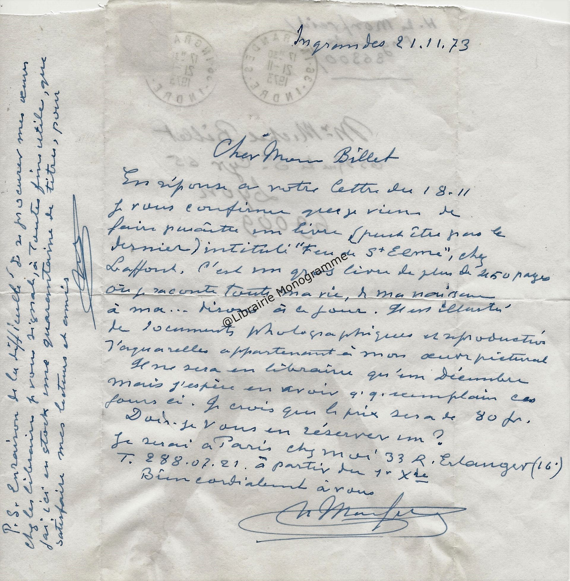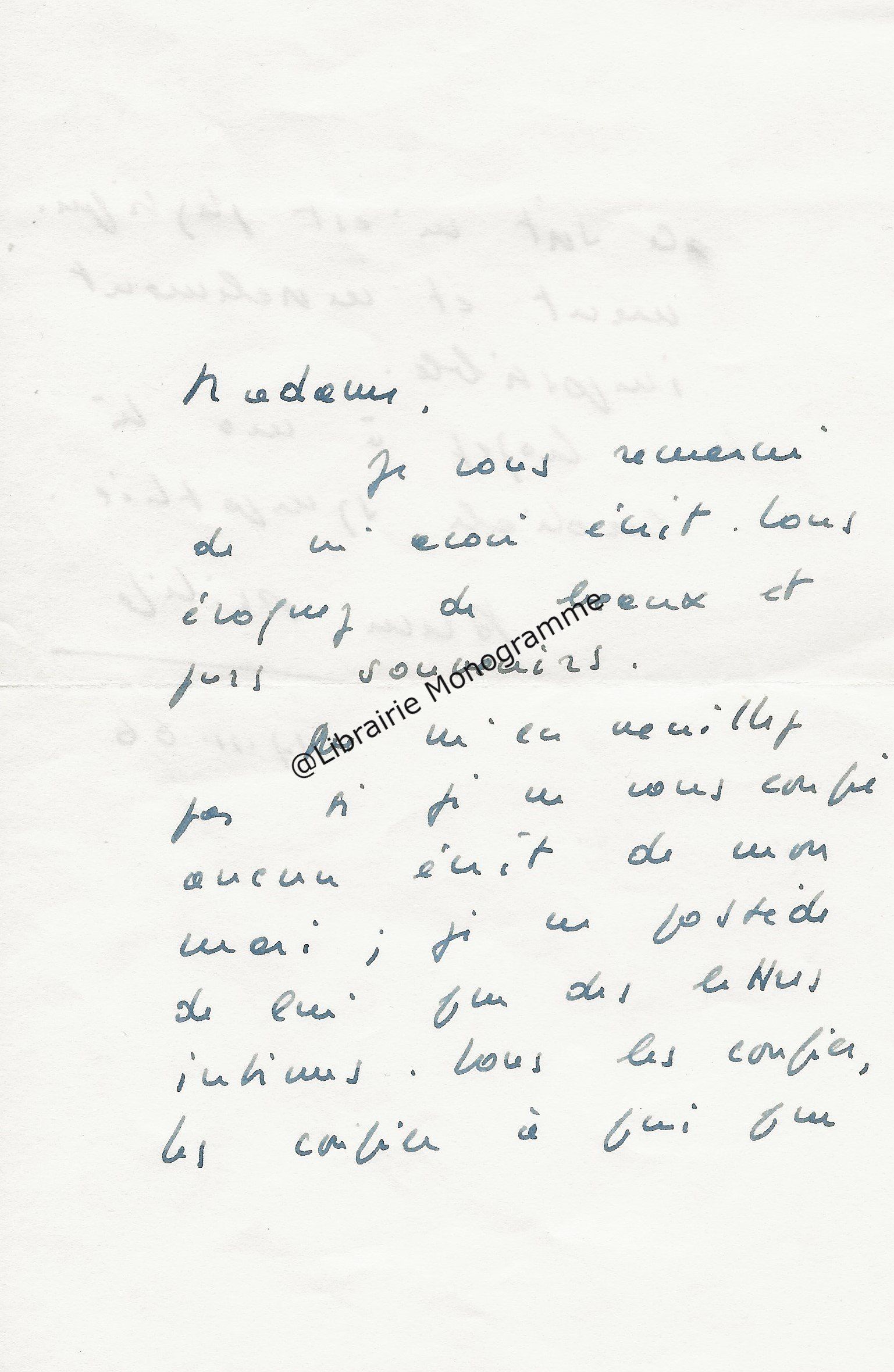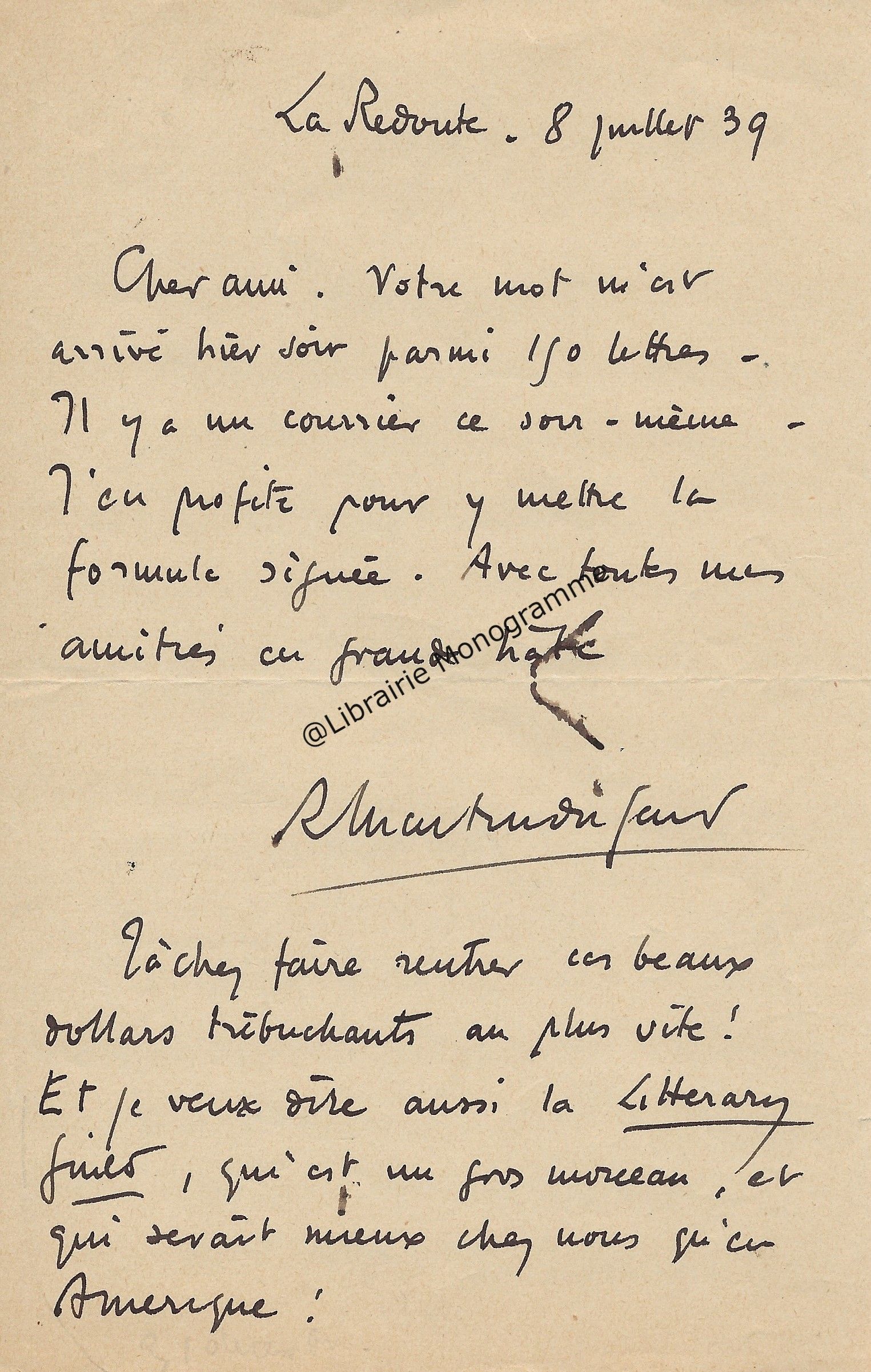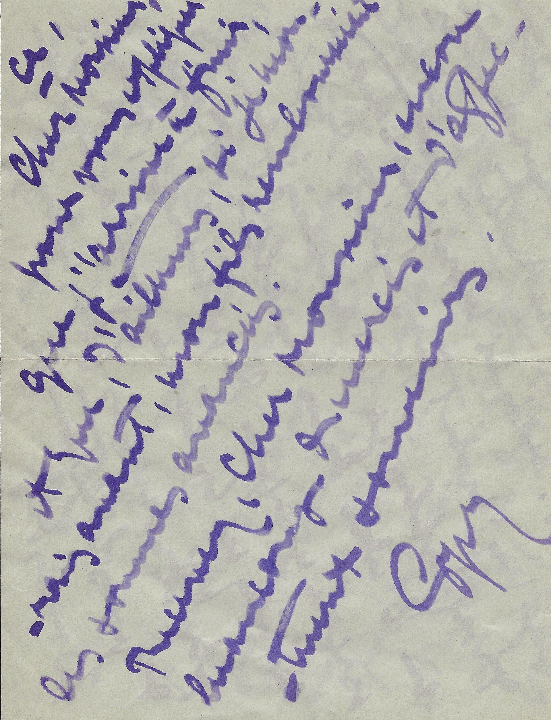 Il lui demande de bien vouloir l’excuser pour avoir tardé à lui répondre. « Sachez du moins que vous étiez un de mes remords, car je vous suis très reconnaissant de vous interesser ainsi à mes livres … Ci-joint, vous trouverez la dédicace. ».