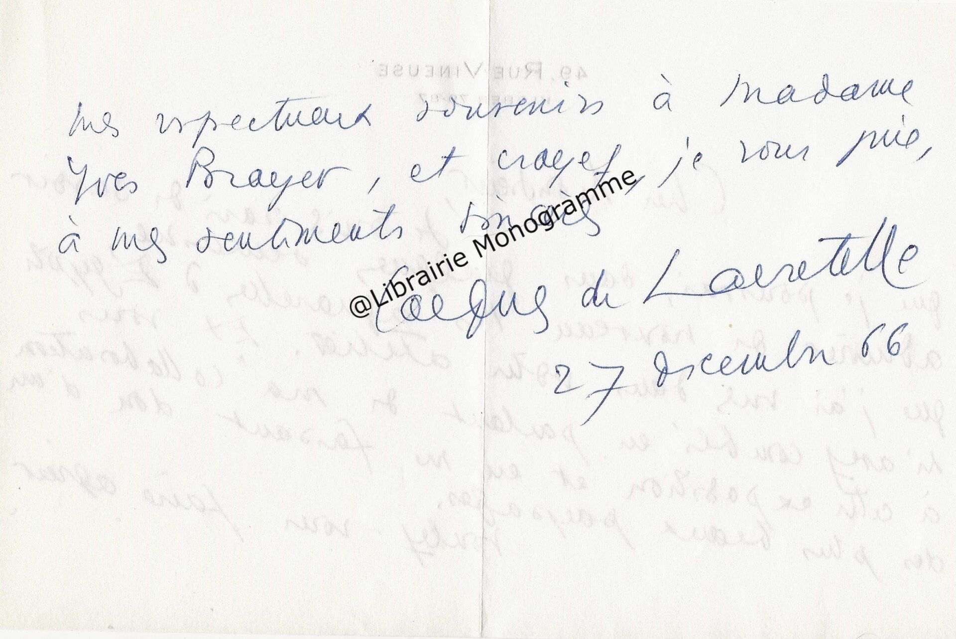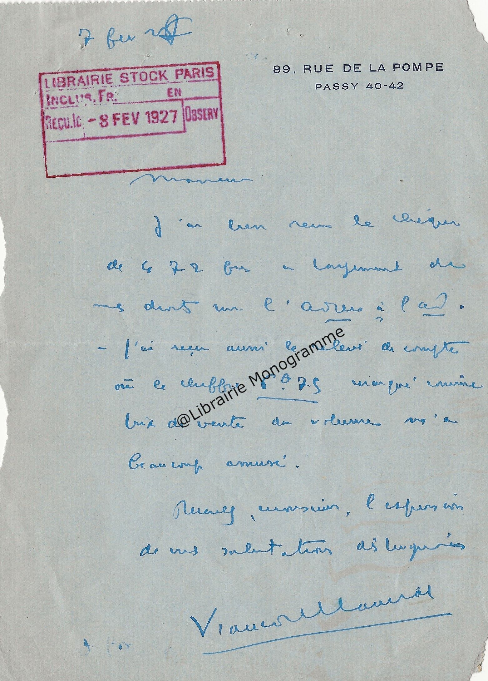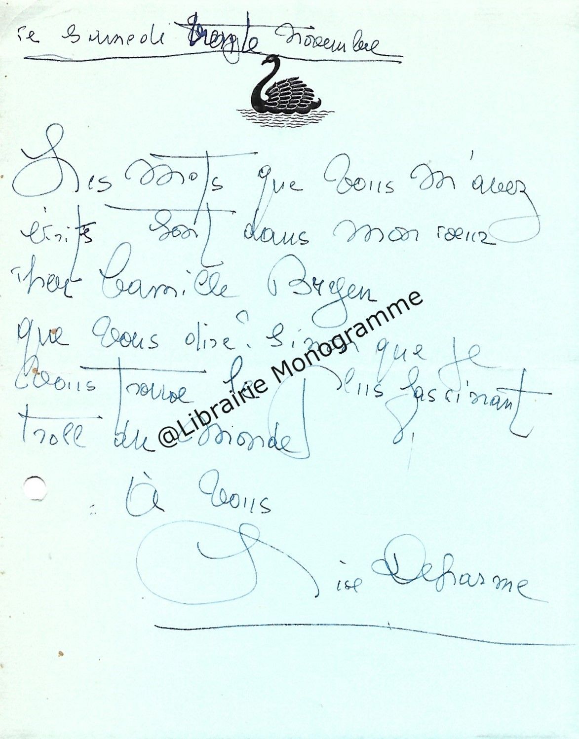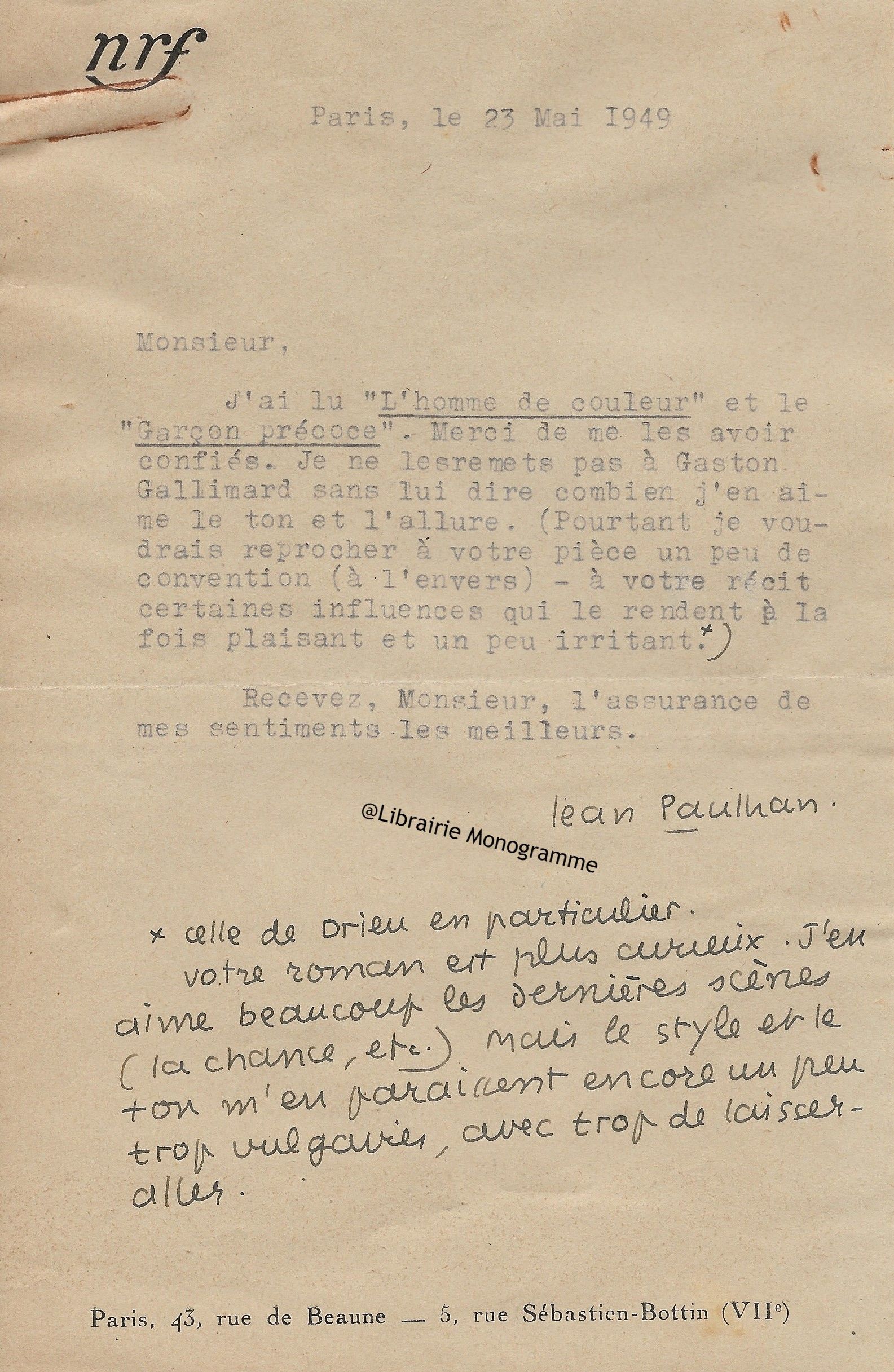 Il lui demande de bien vouloir l’excuser pour avoir tardé à lui répondre. « Sachez du moins que vous étiez un de mes remords, car je vous suis très reconnaissant de vous interesser ainsi à mes livres … Ci-joint, vous trouverez la dédicace. ».