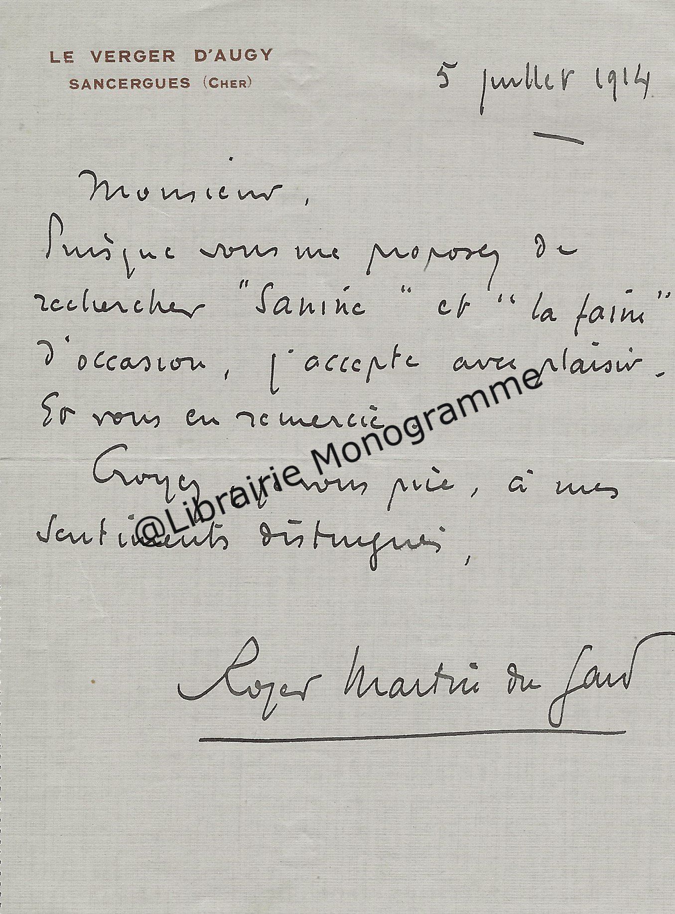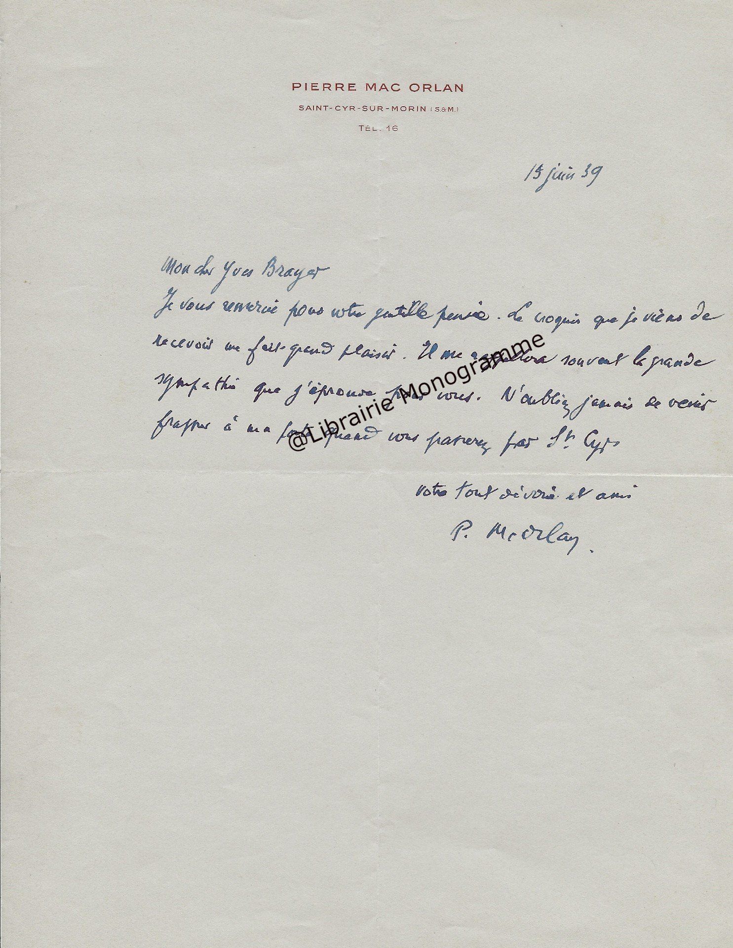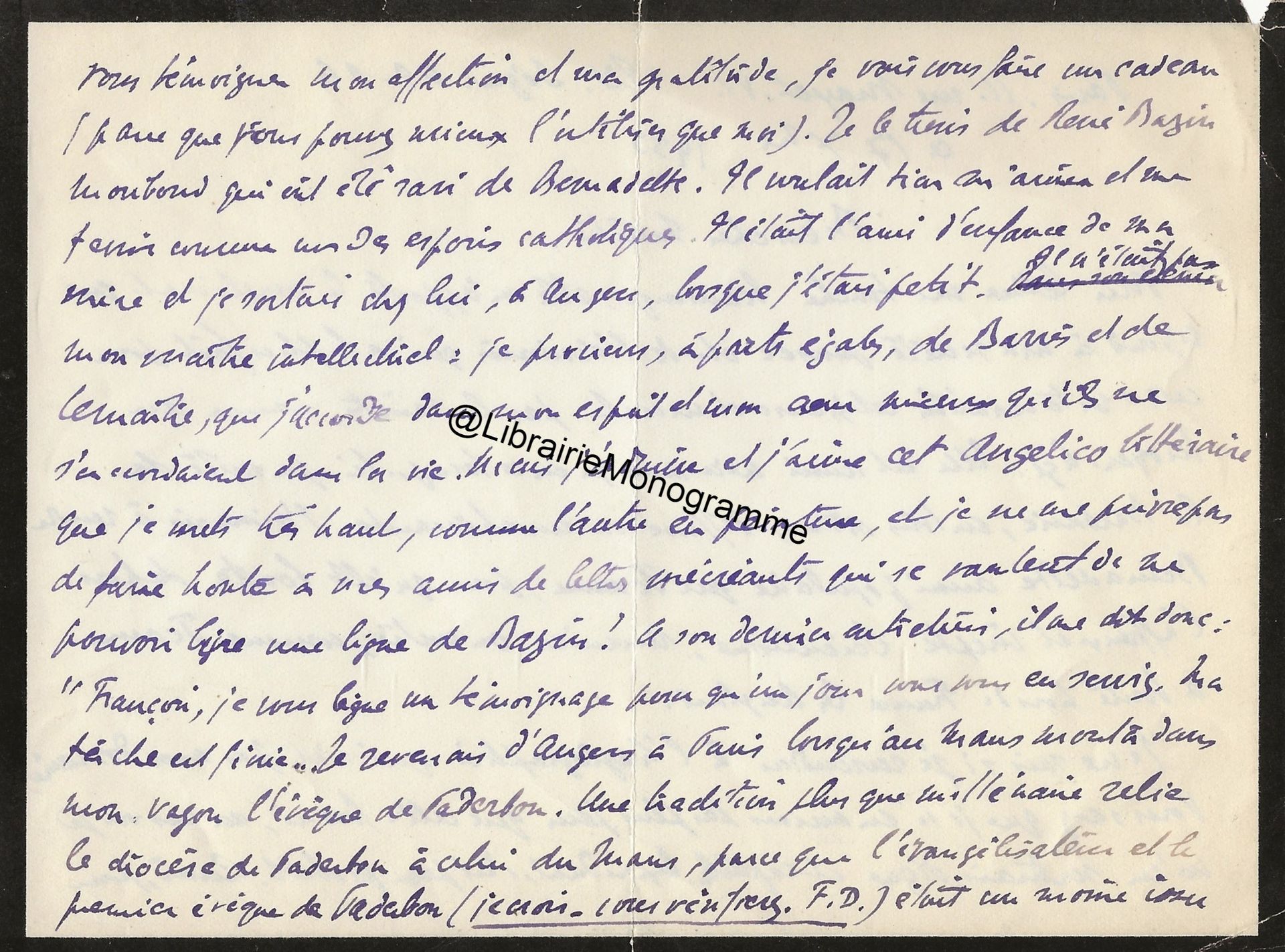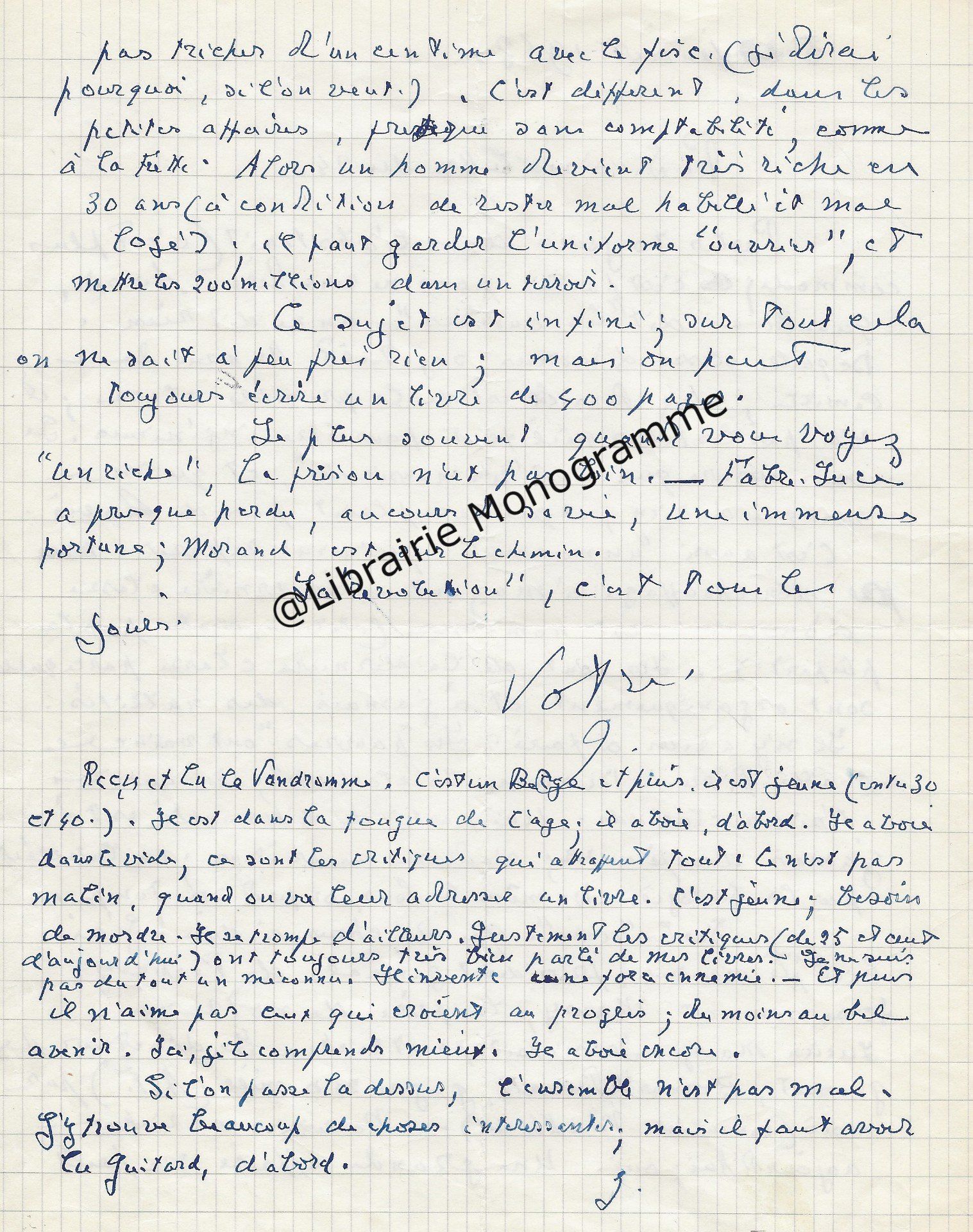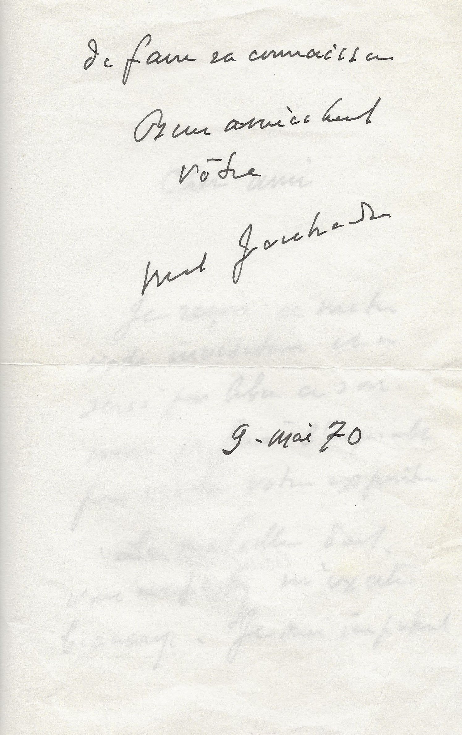 Il lui demande de bien vouloir l’excuser pour avoir tardé à lui répondre. « Sachez du moins que vous étiez un de mes remords, car je vous suis très reconnaissant de vous interesser ainsi à mes livres … Ci-joint, vous trouverez la dédicace. ».