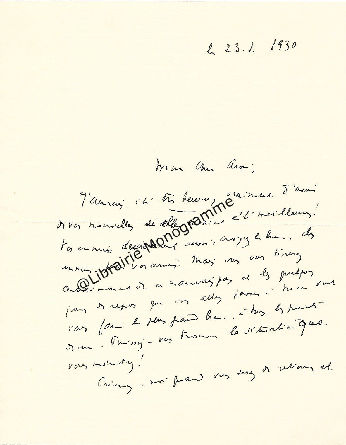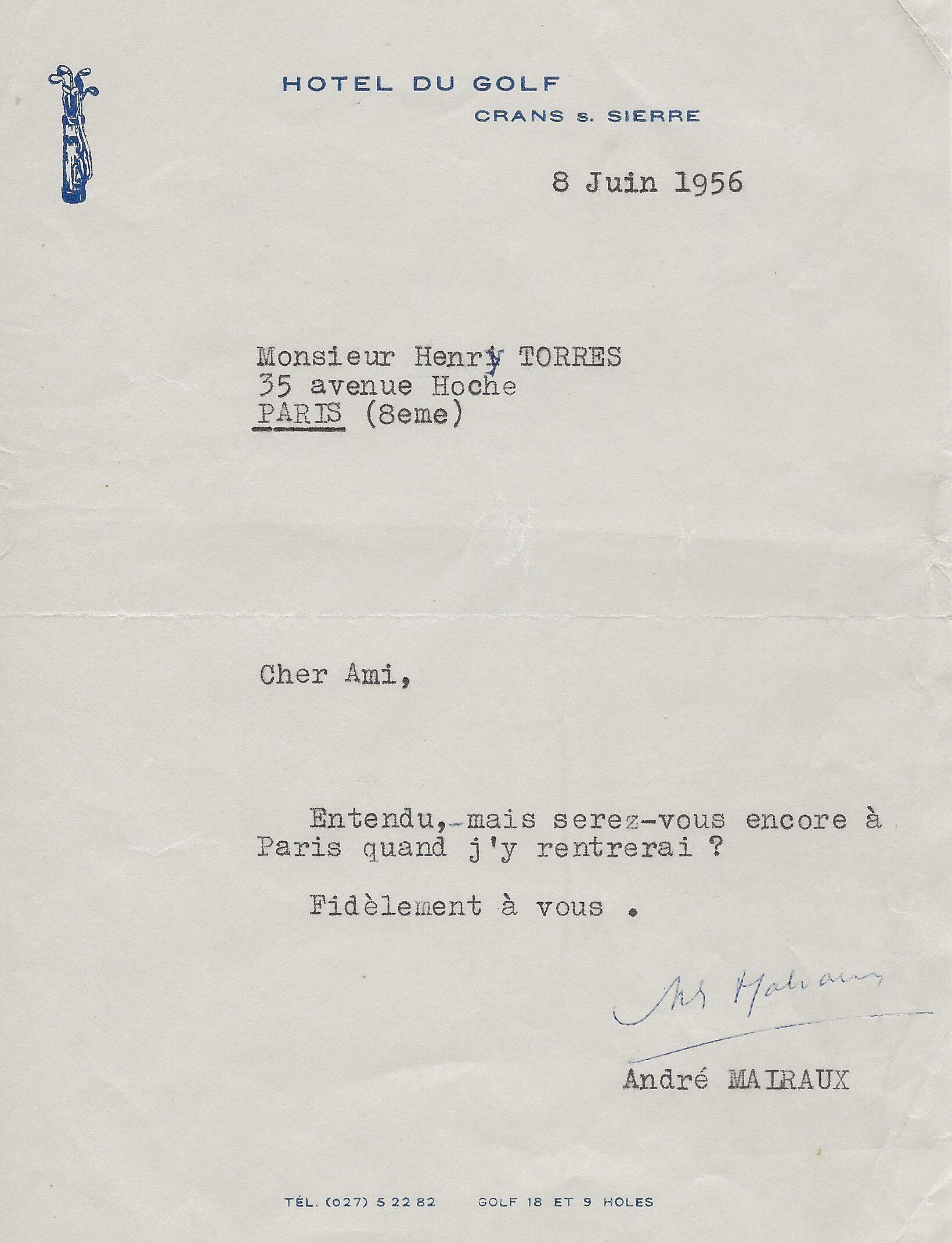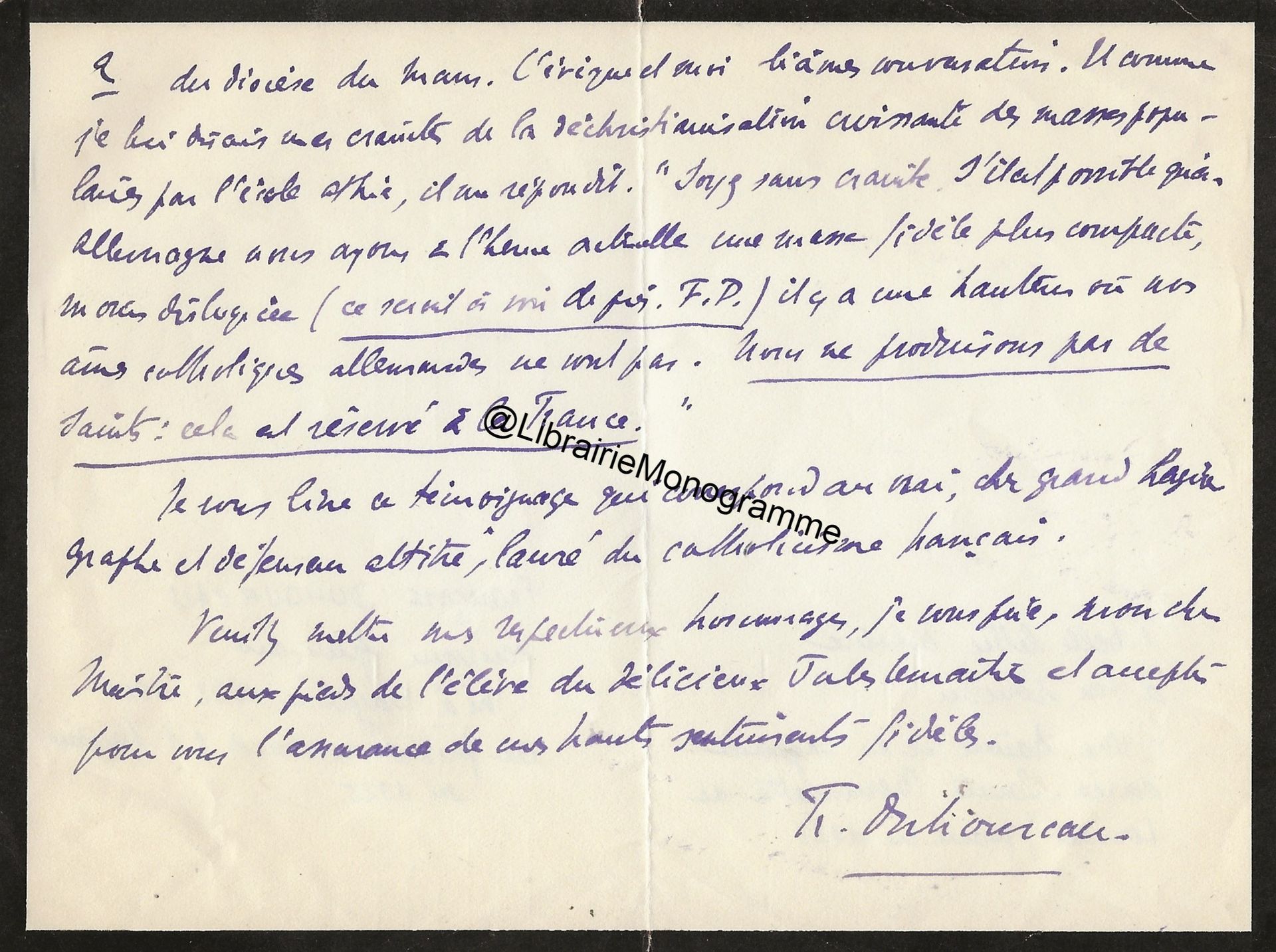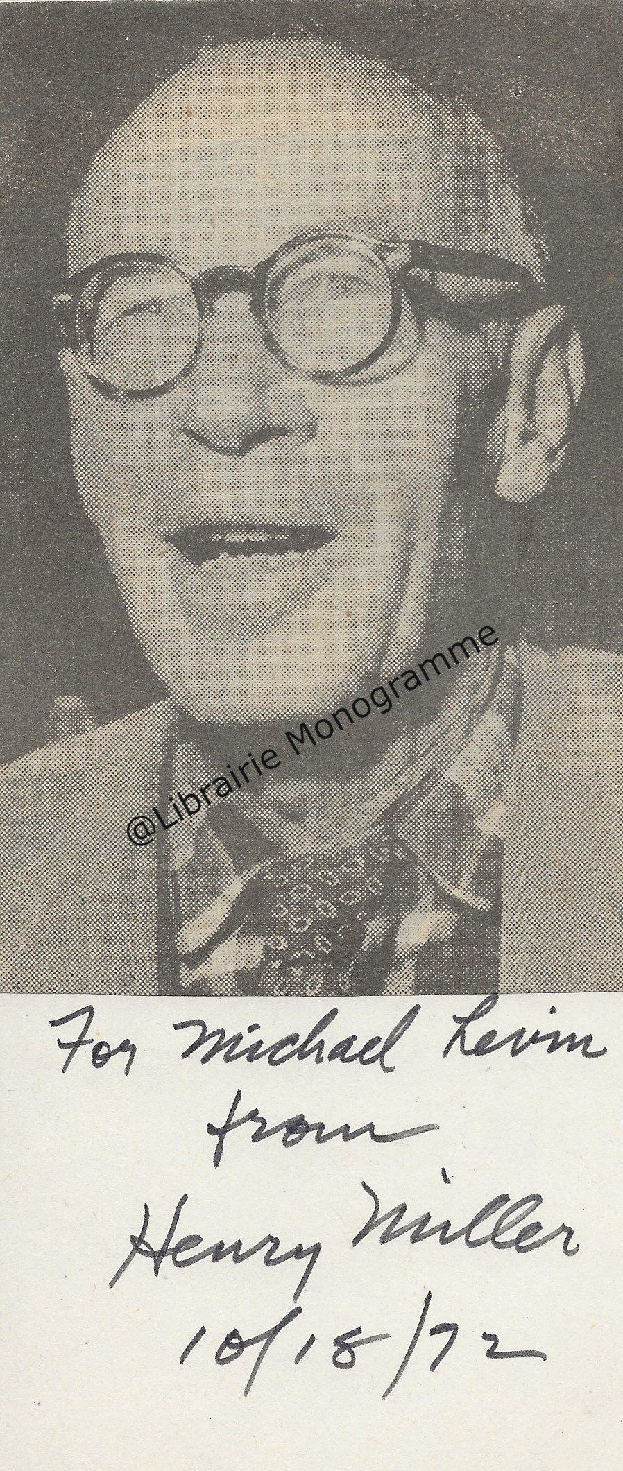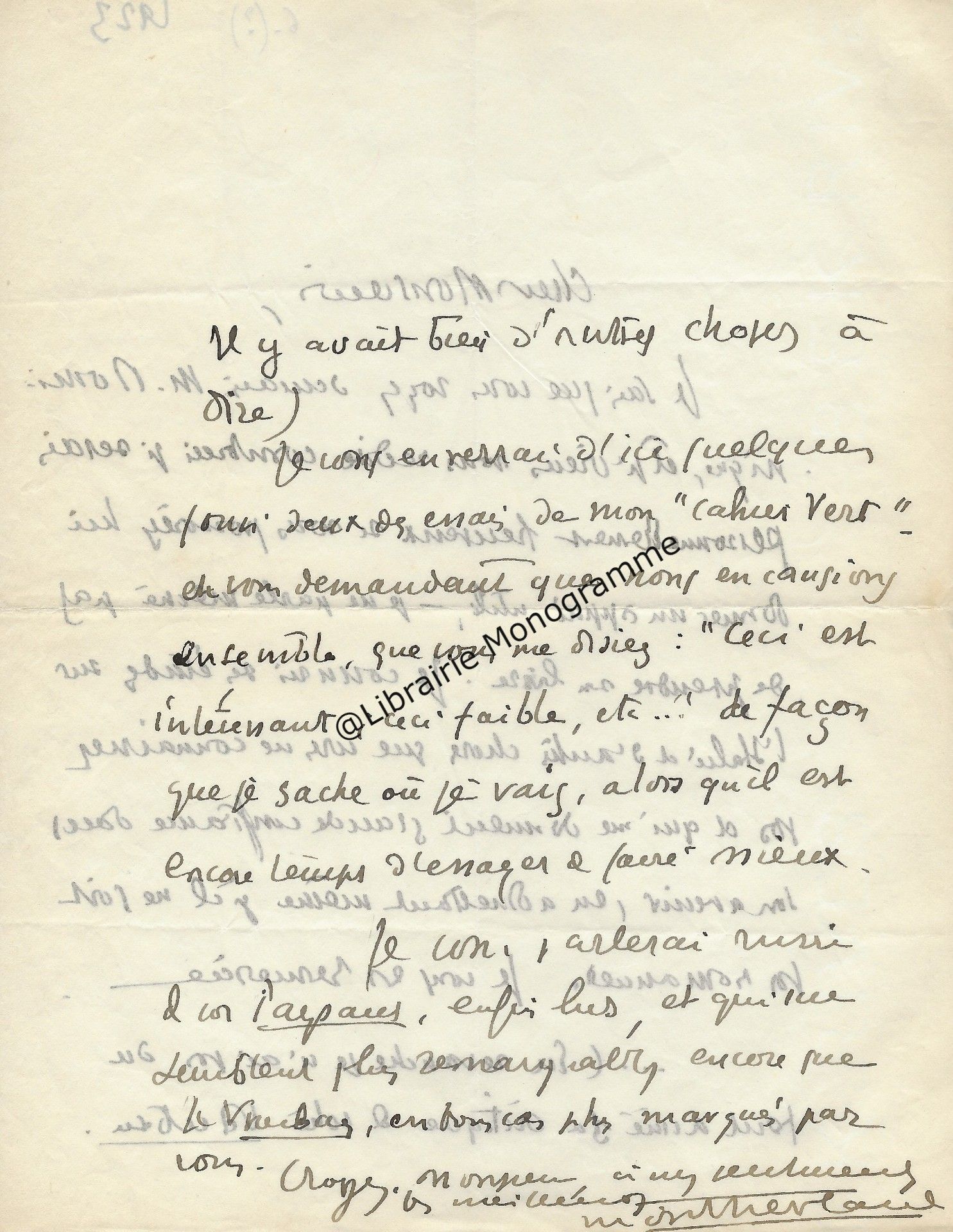 Il lui demande de bien vouloir l’excuser pour avoir tardé à lui répondre. « Sachez du moins que vous étiez un de mes remords, car je vous suis très reconnaissant de vous interesser ainsi à mes livres … Ci-joint, vous trouverez la dédicace. ».