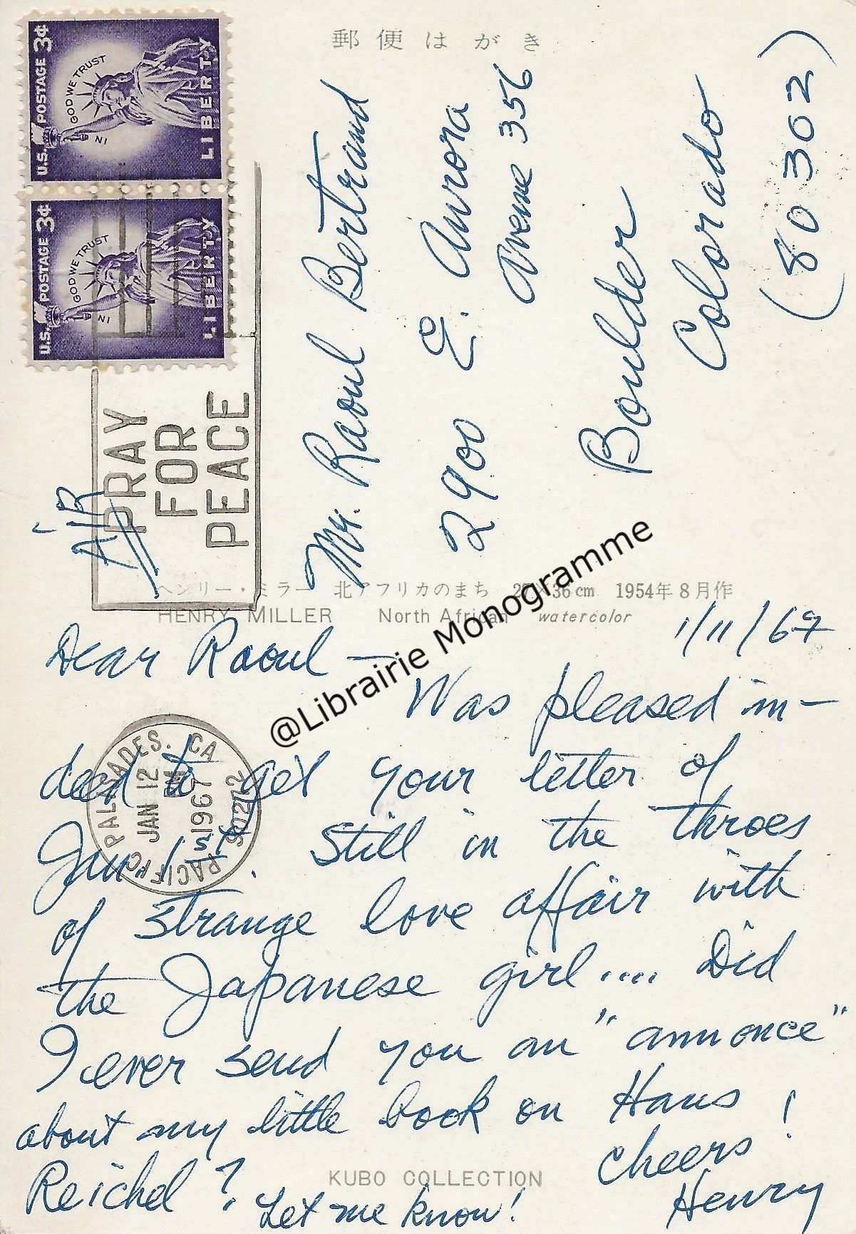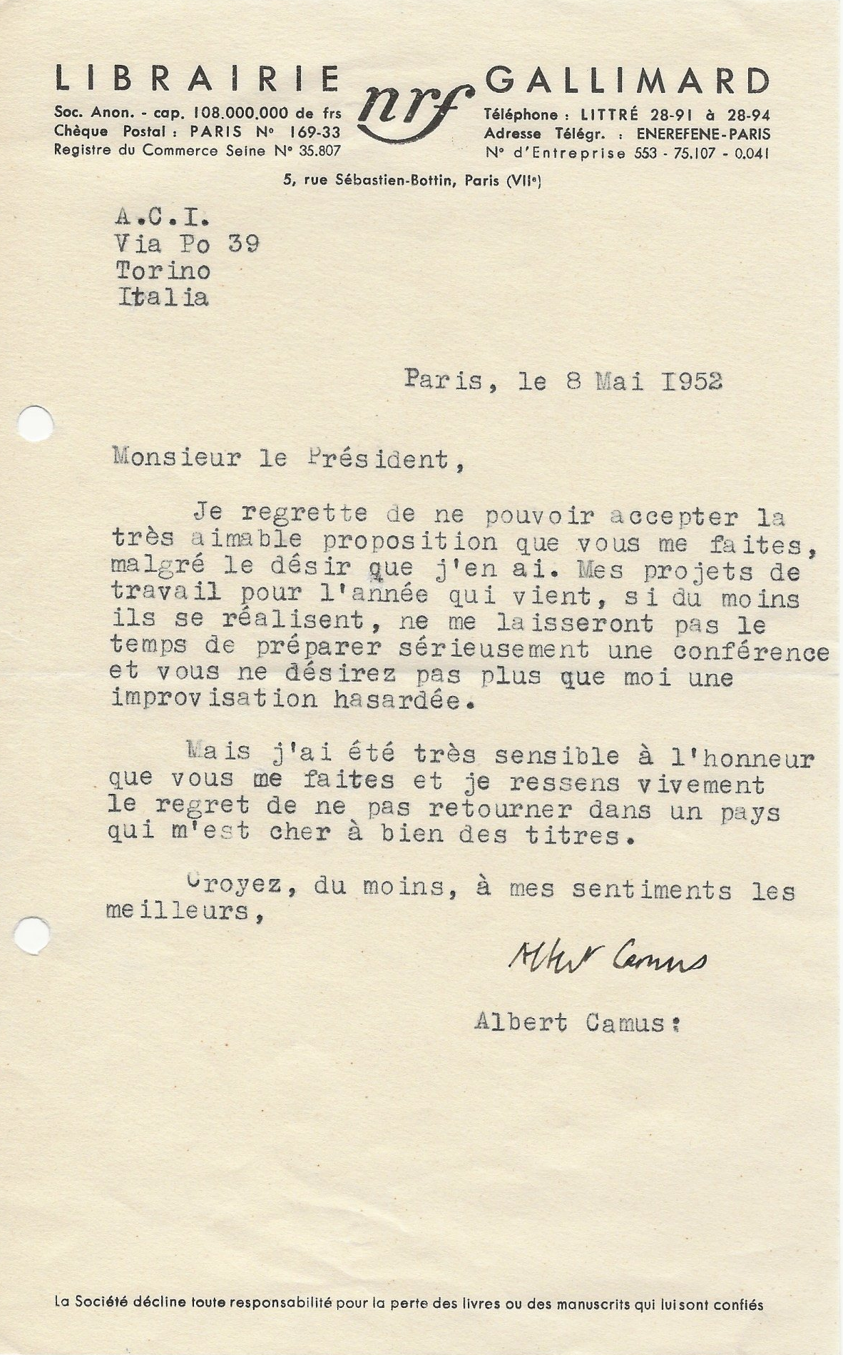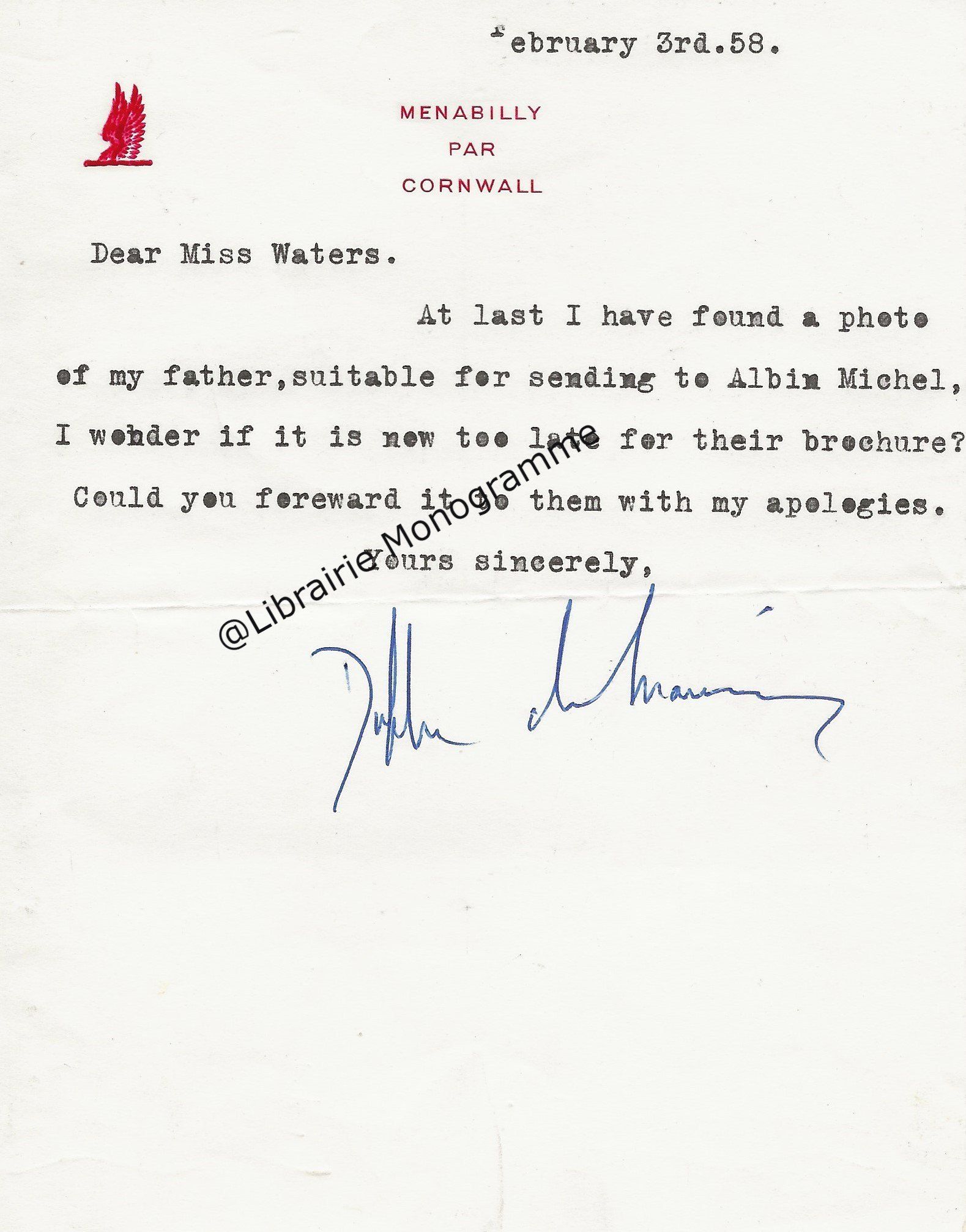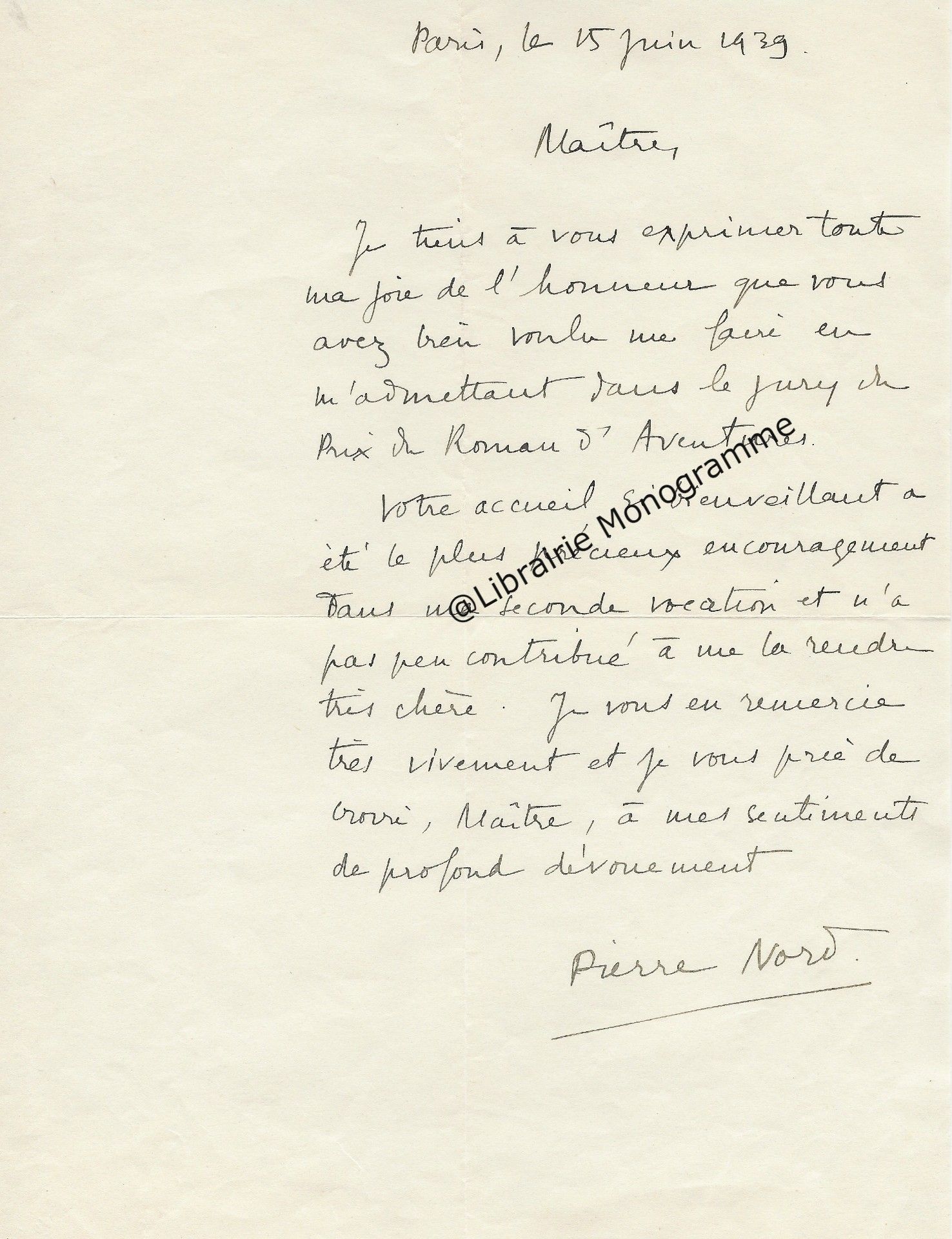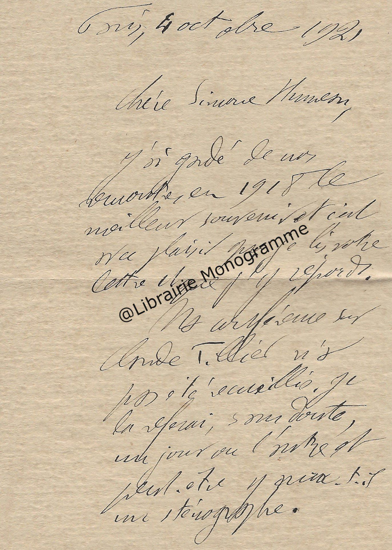 Il lui demande de bien vouloir l’excuser pour avoir tardé à lui répondre. « Sachez du moins que vous étiez un de mes remords, car je vous suis très reconnaissant de vous interesser ainsi à mes livres … Ci-joint, vous trouverez la dédicace. ».