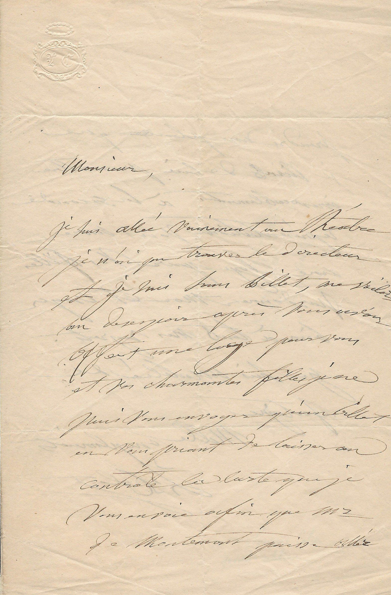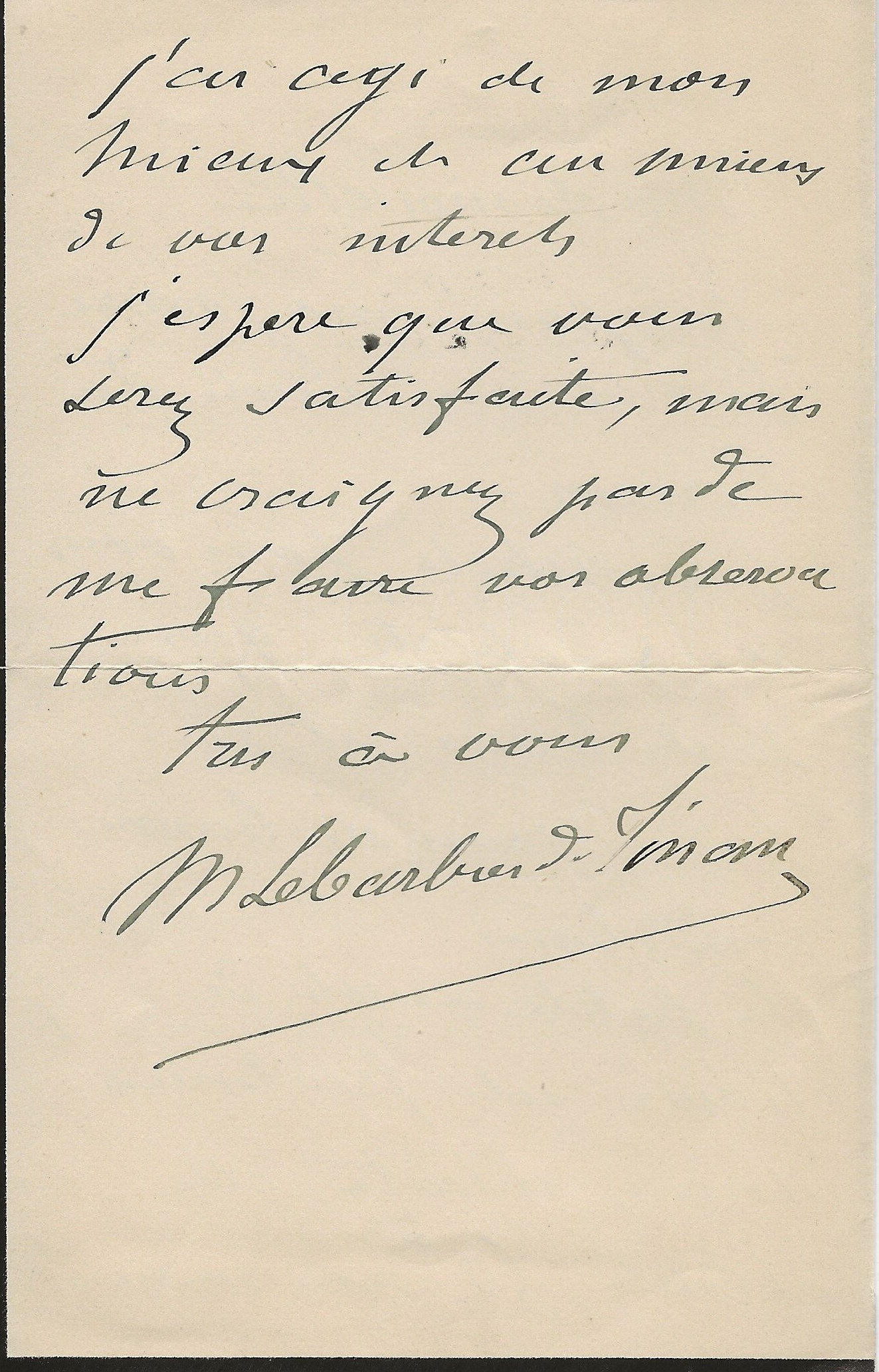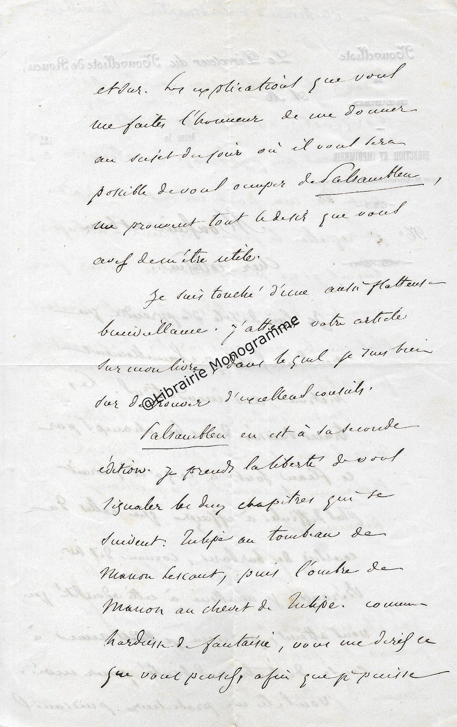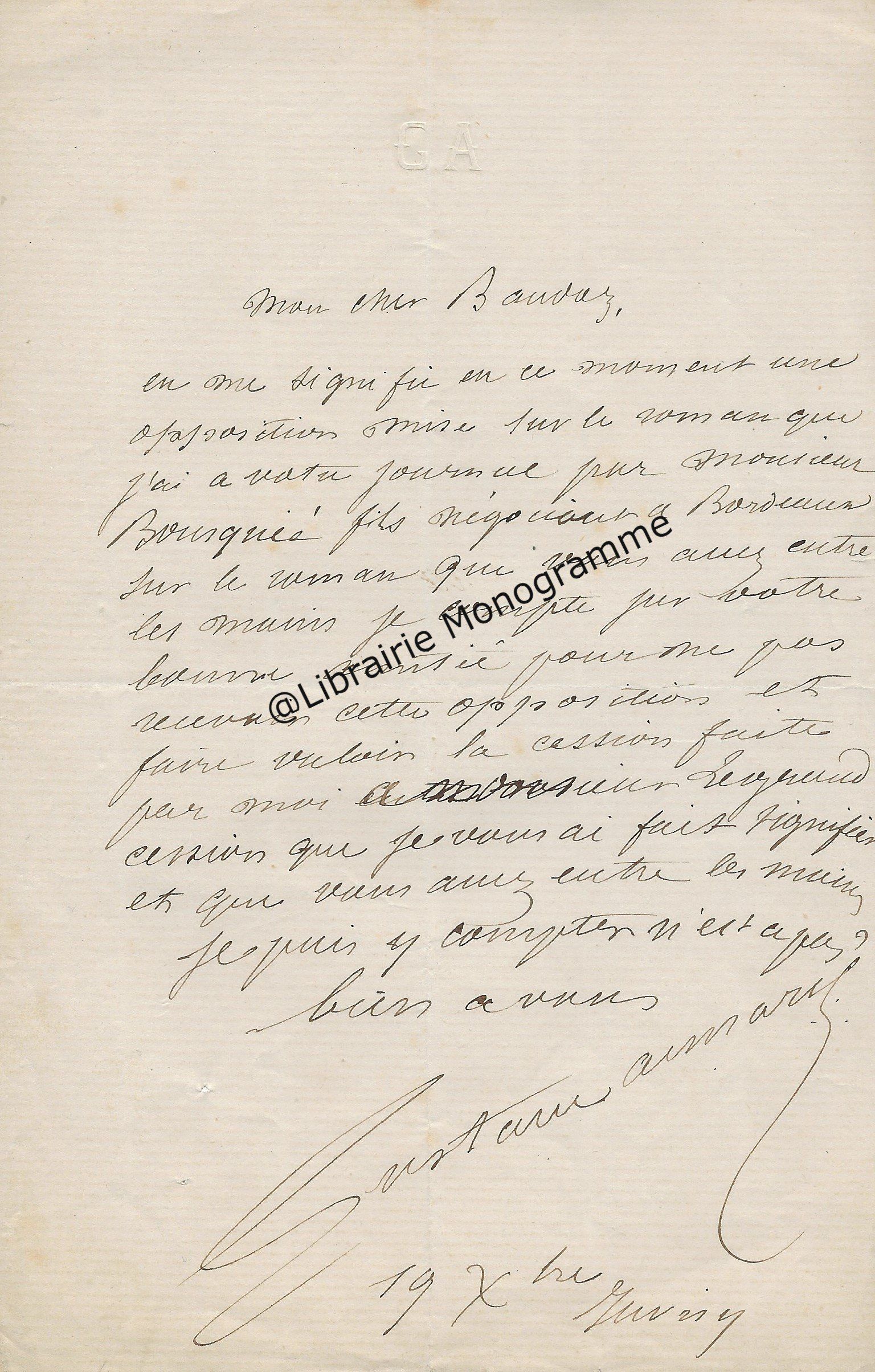 Il lui demande de ne pas accepter l’opposition faite par Mr Bousquié fils négociant à Bordeaux, opposition faite sur le roman « que j’ai à votre journal. Je compte sur votre bonne amitié pour ne pas recevoir cette opposition et faire valoir la cession faite par moi à Monsieur Legrand, cession que je vous ai fait signifier et que vous avez entre les mains. Je puis y compter n’est ce pas ?... ».