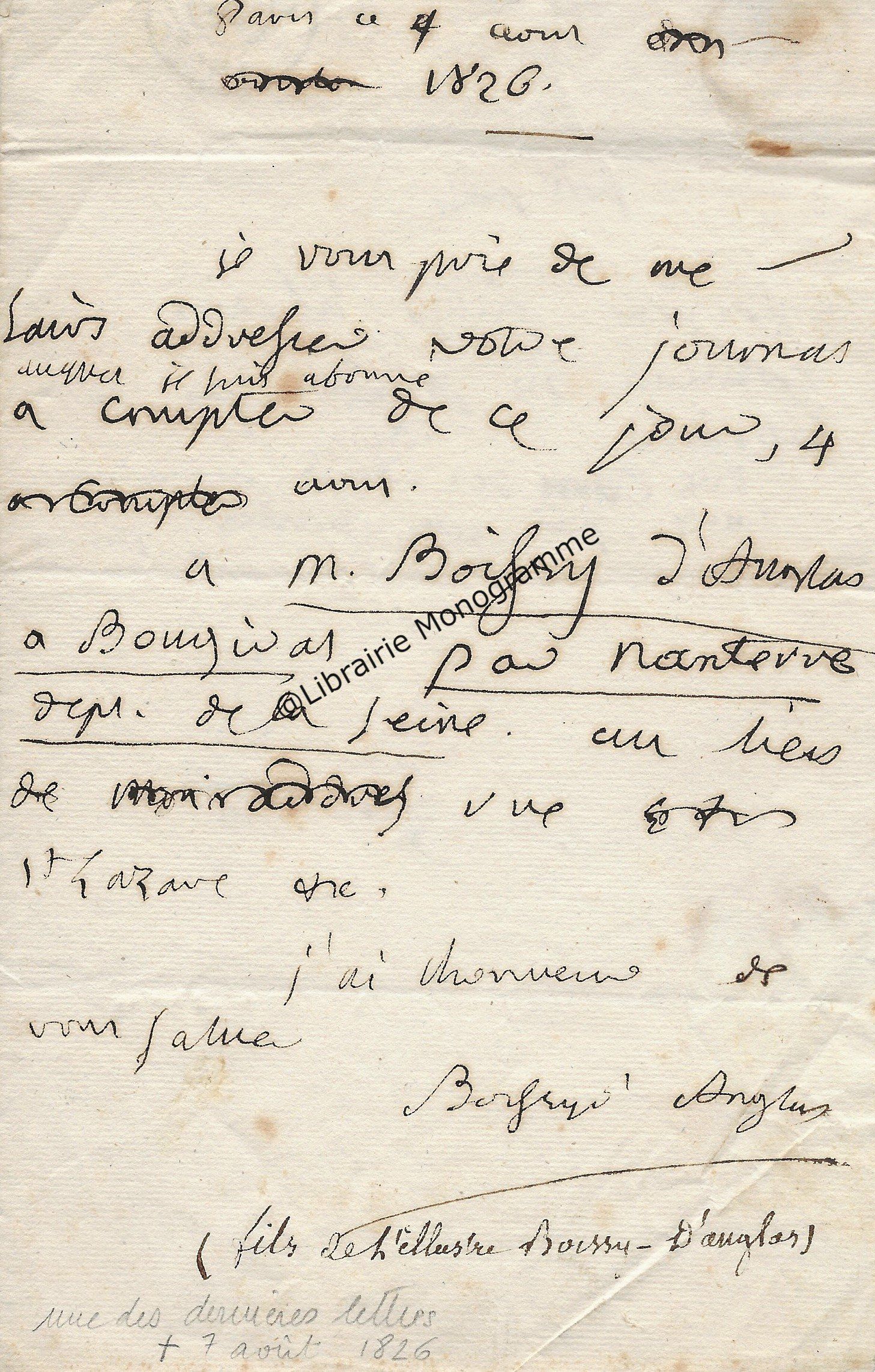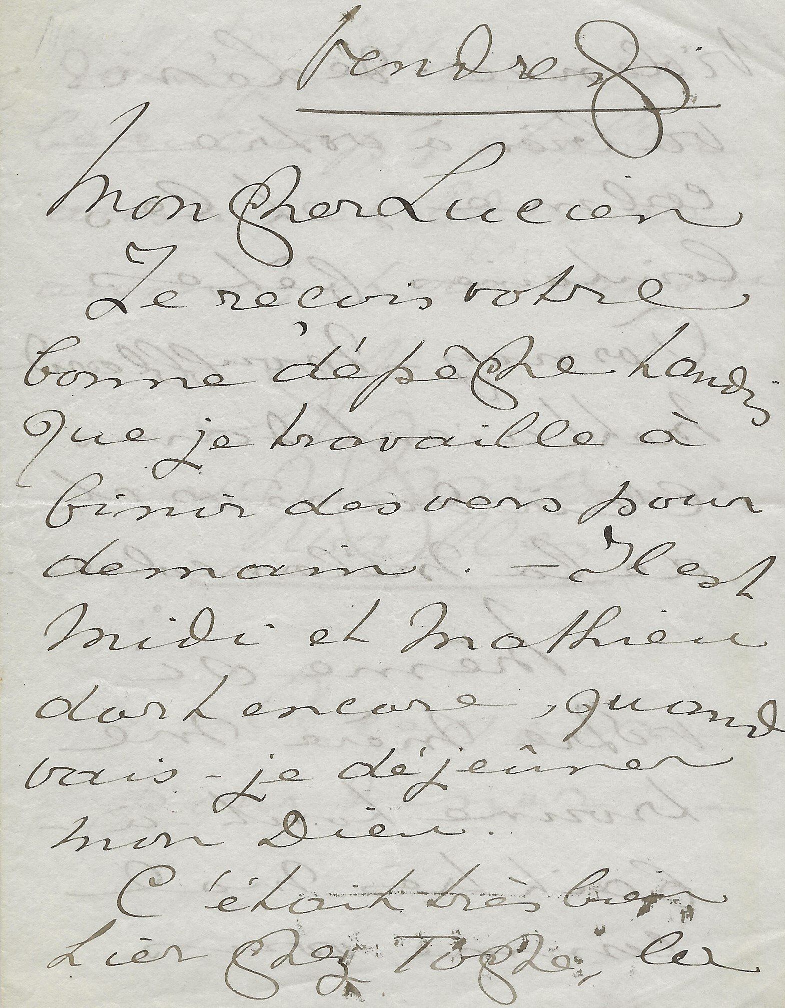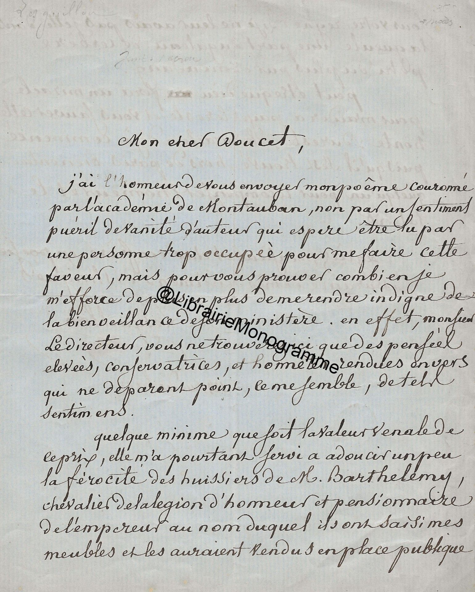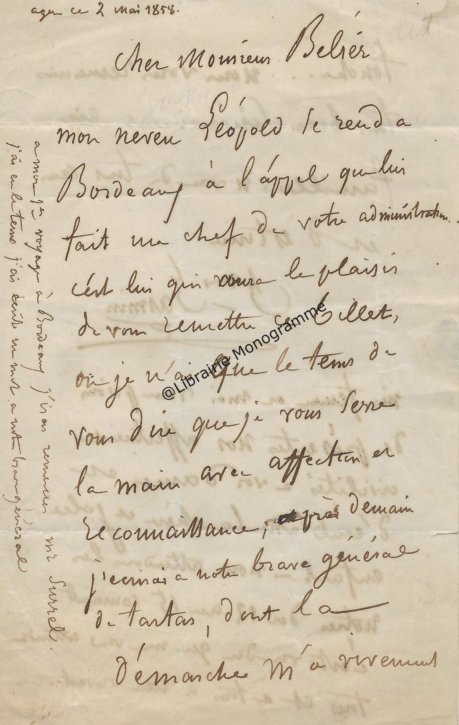 Il lui demande de ne pas accepter l’opposition faite par Mr Bousquié fils négociant à Bordeaux, opposition faite sur le roman « que j’ai à votre journal. Je compte sur votre bonne amitié pour ne pas recevoir cette opposition et faire valoir la cession faite par moi à Monsieur Legrand, cession que je vous ai fait signifier et que vous avez entre les mains. Je puis y compter n’est ce pas ?... ».