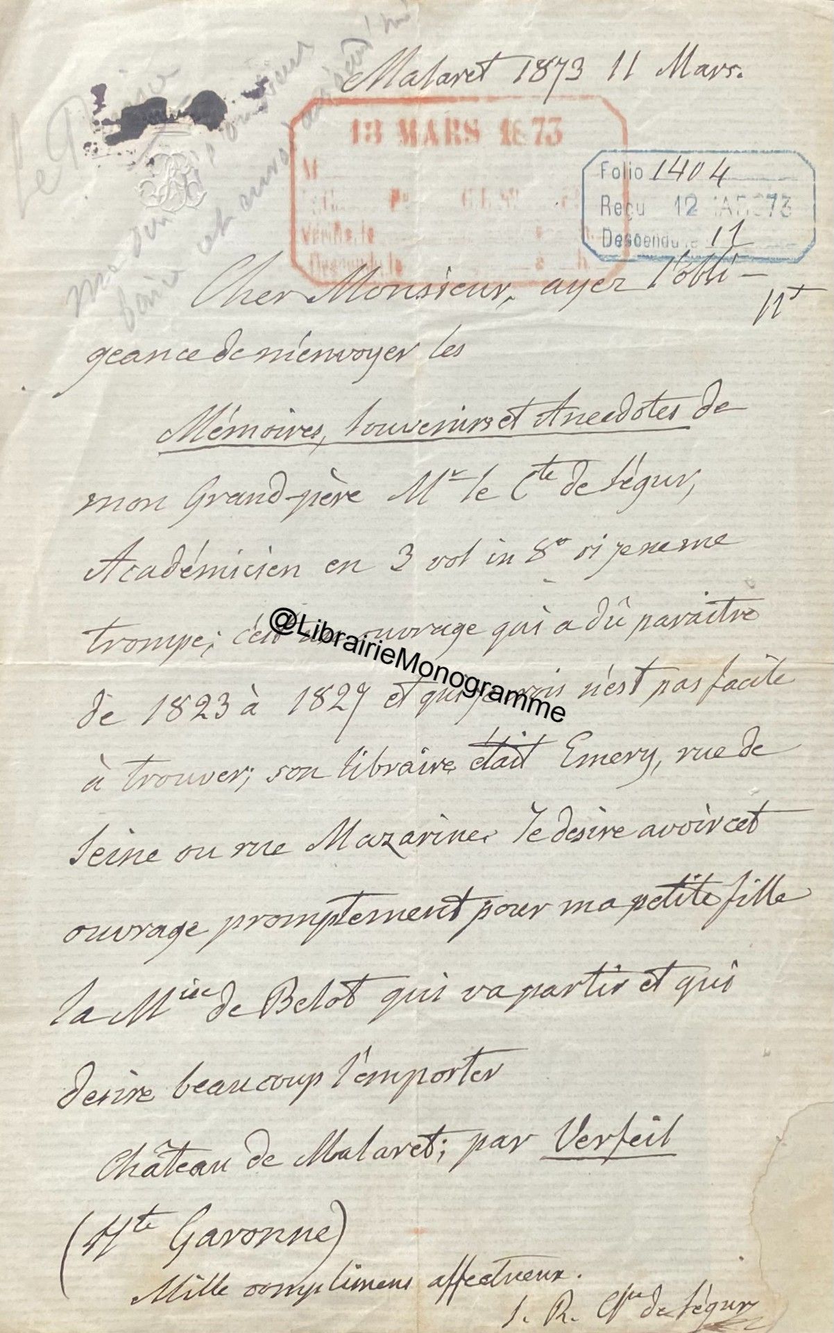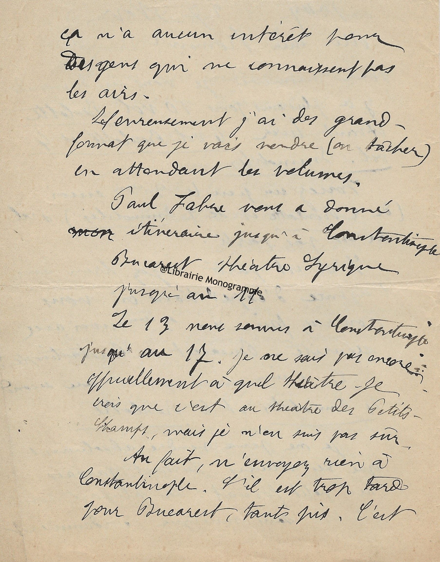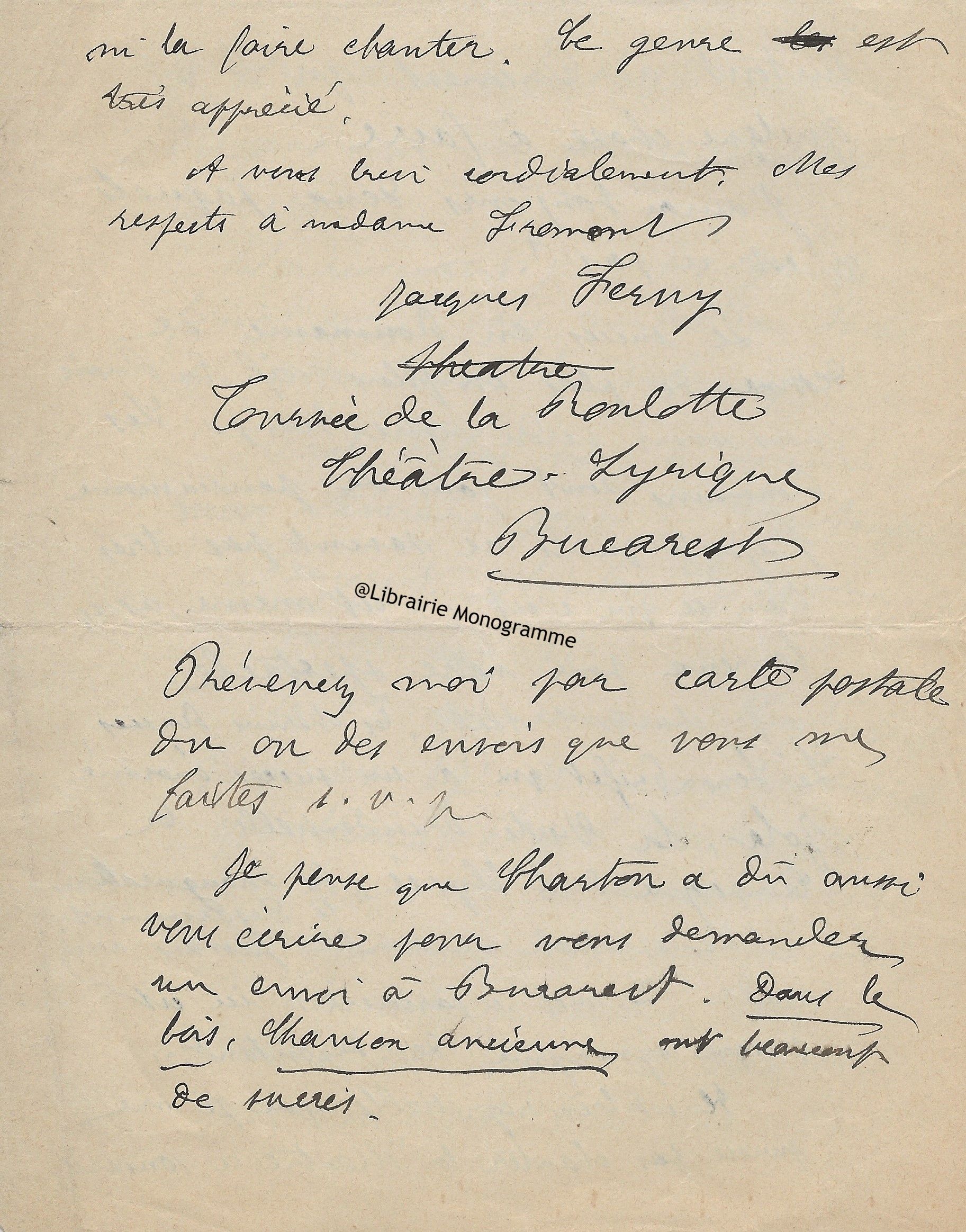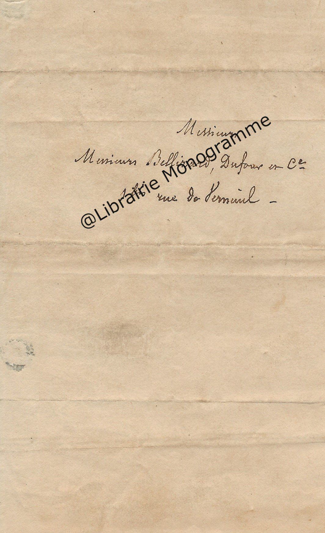 Il lui demande de ne pas accepter l’opposition faite par Mr Bousquié fils négociant à Bordeaux, opposition faite sur le roman « que j’ai à votre journal. Je compte sur votre bonne amitié pour ne pas recevoir cette opposition et faire valoir la cession faite par moi à Monsieur Legrand, cession que je vous ai fait signifier et que vous avez entre les mains. Je puis y compter n’est ce pas ?... ».
