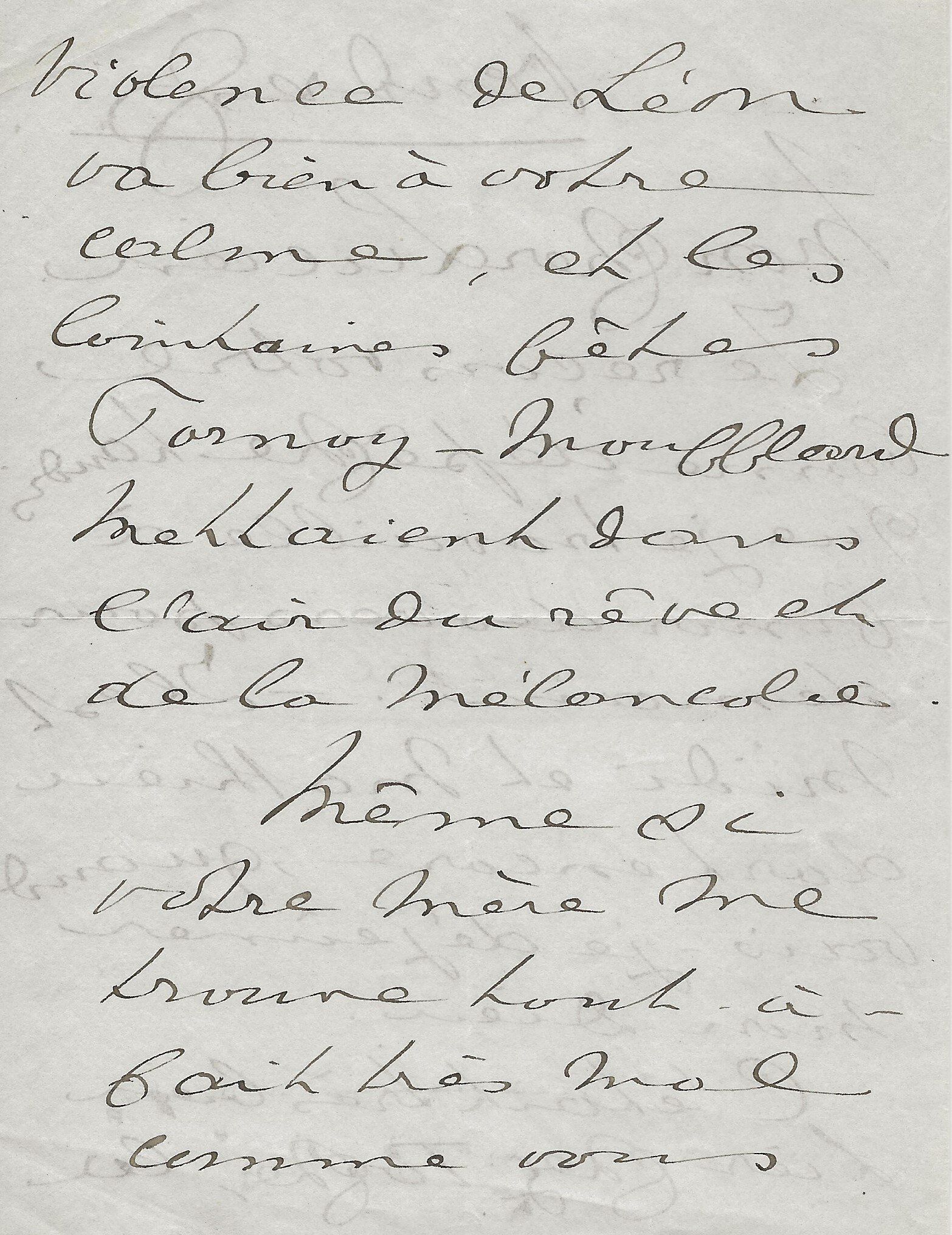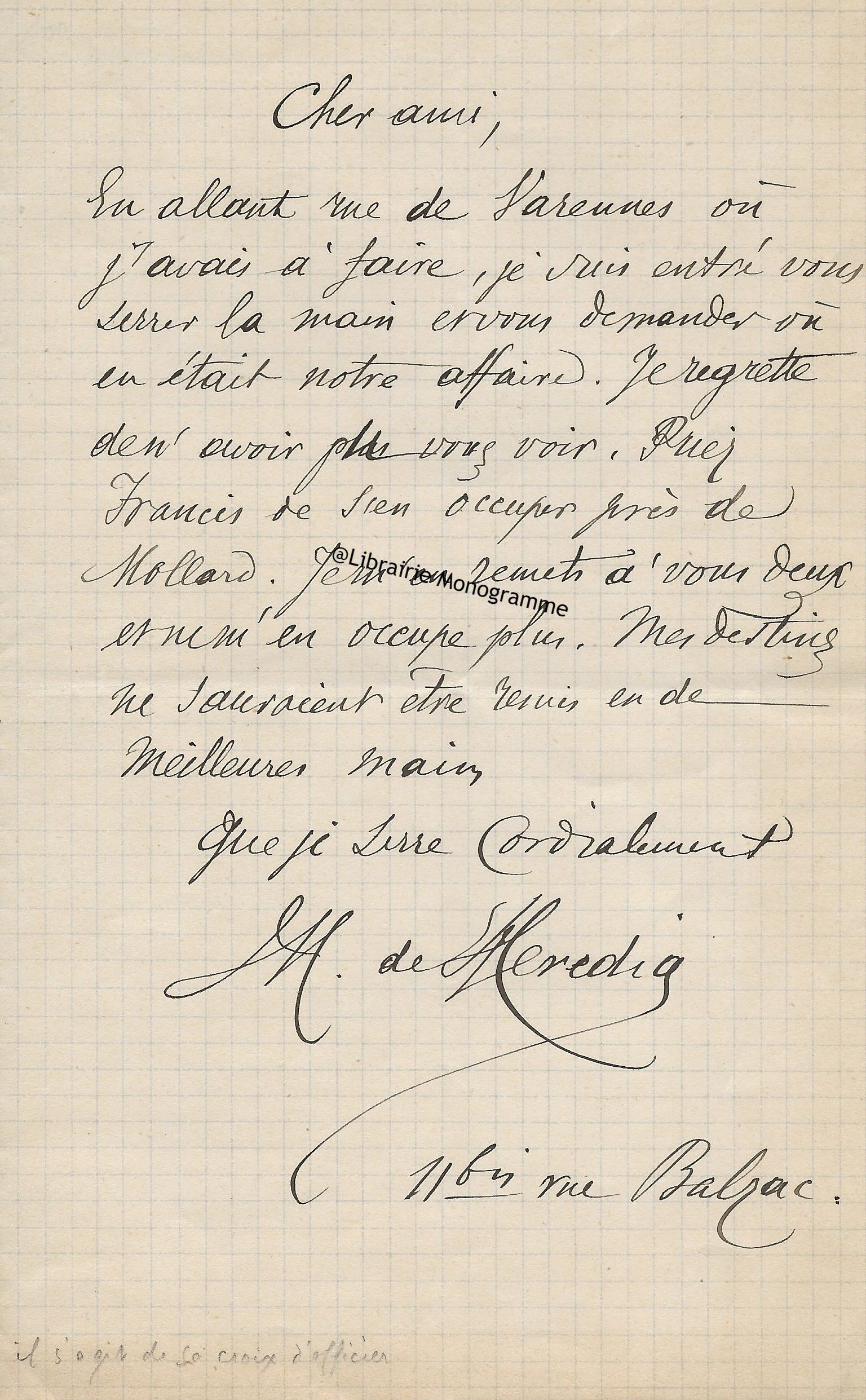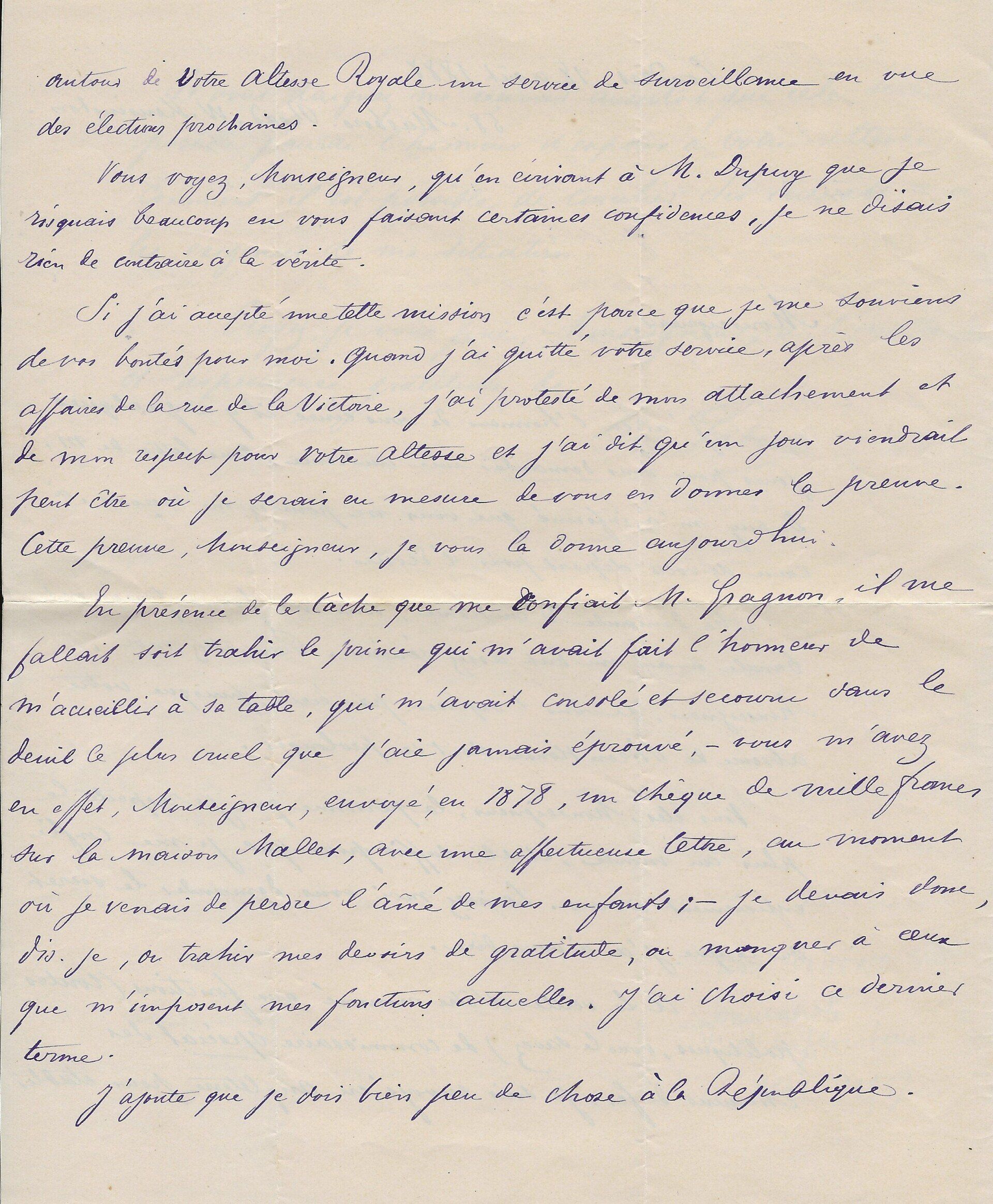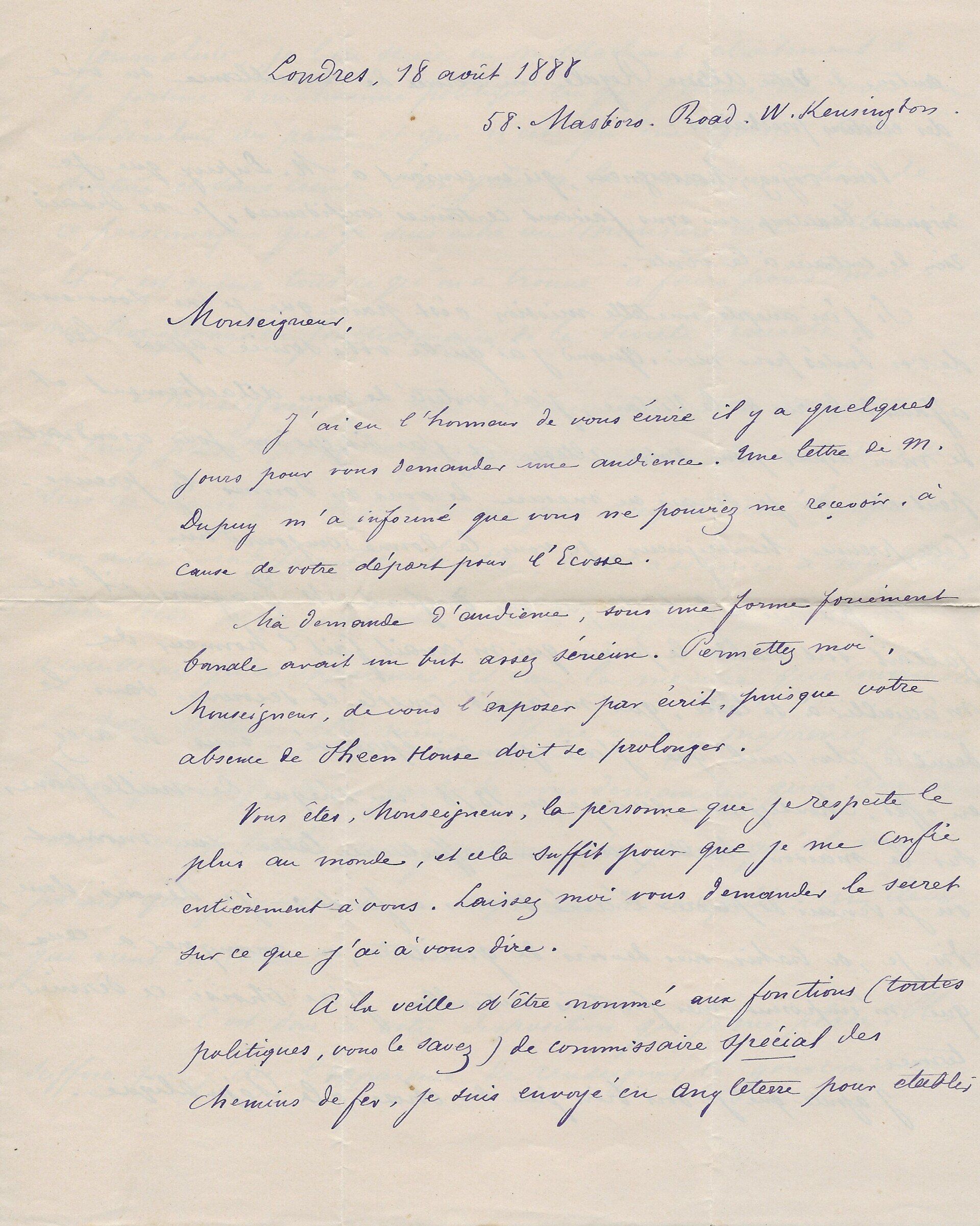 Son ami « Mr de la Grange » l’a averti que le comte avait « quelque communication » à lui faire. « Ecrivez moi quel sera quel quart d’heure du matin ou du soir que vous pourrez me donner chez vous rue Cassette et je le saisirai au passage pour vous aller trouver. J’ai voulu attendre que vous fussiez un peu dégagé de tous ce qu’entraine un mariage qui a dû vous apporter une consolation après une grande douleur… ».