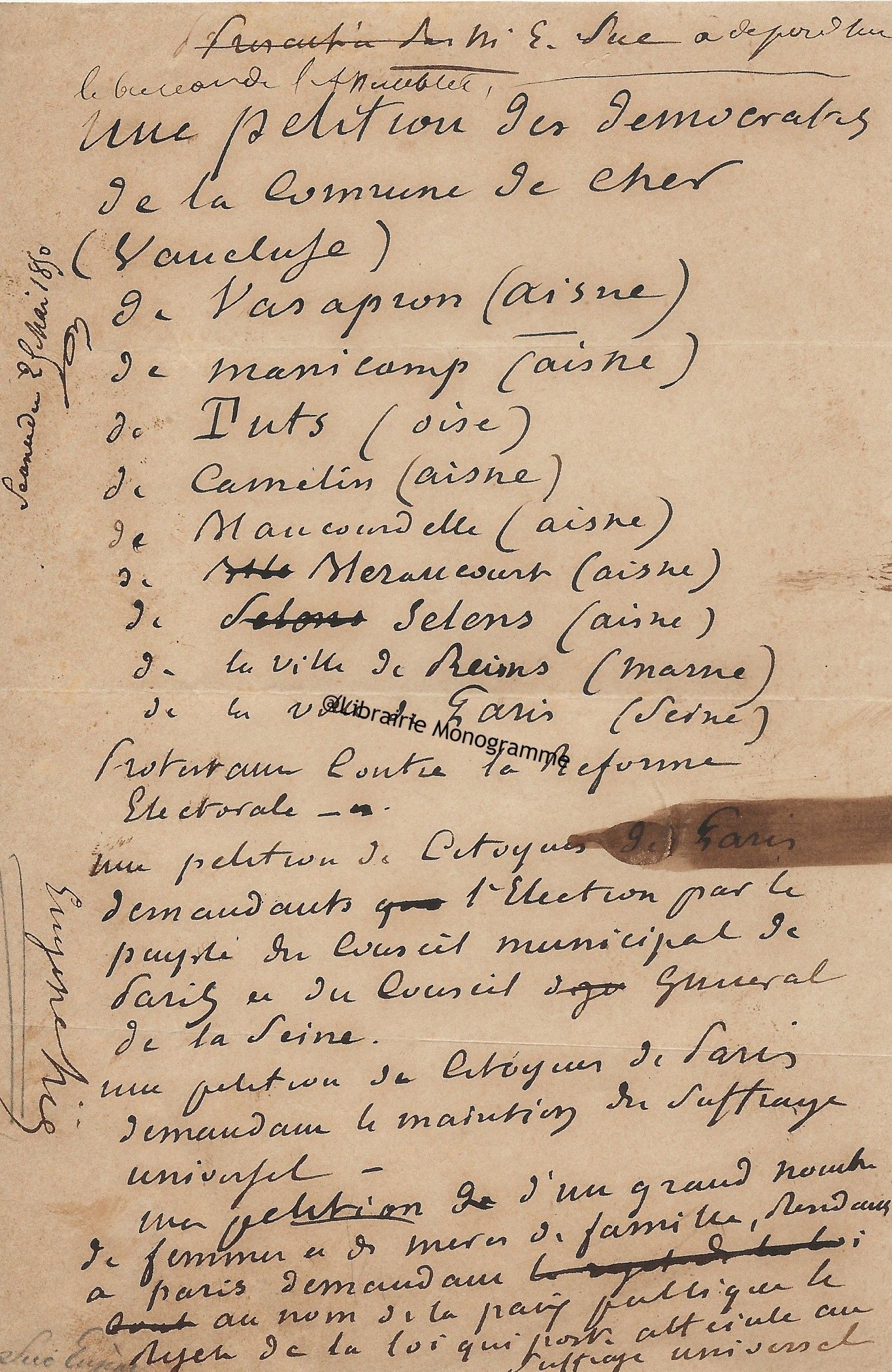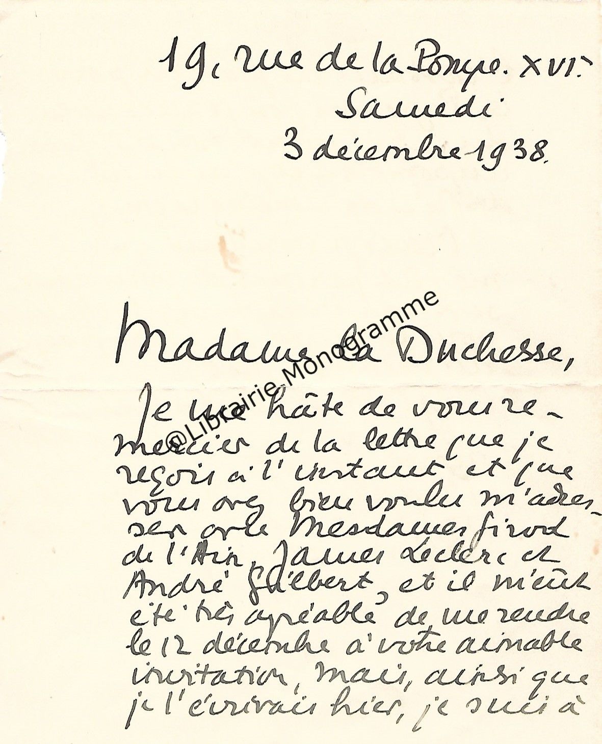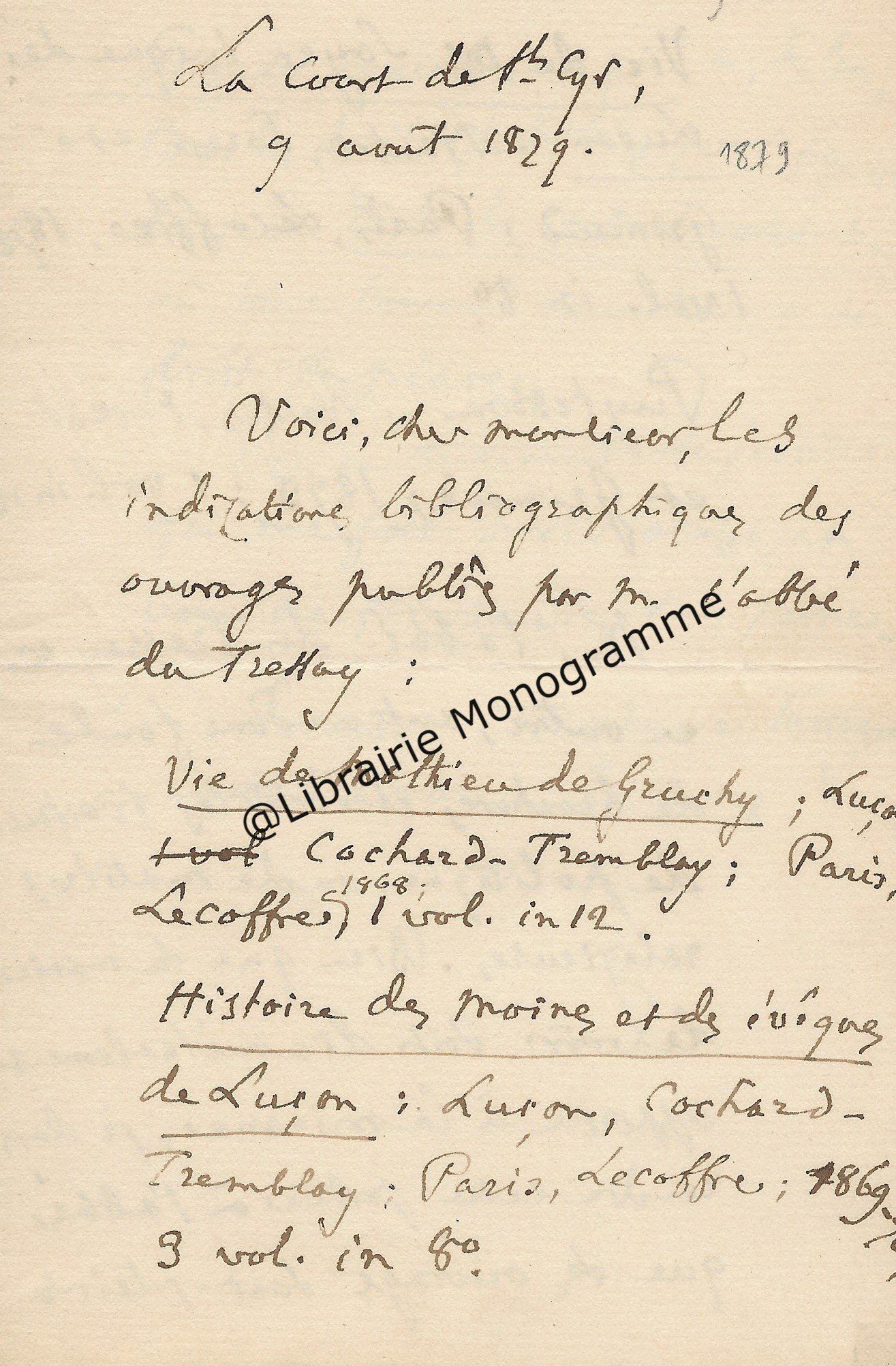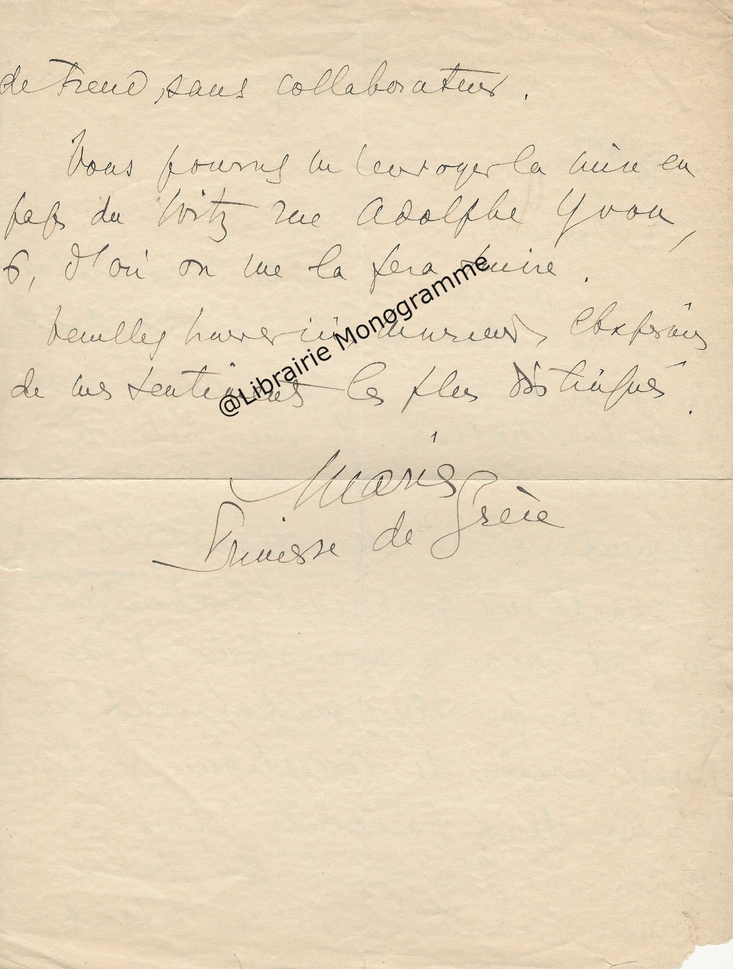 Son ami « Mr de la Grange » l’a averti que le comte avait « quelque communication » à lui faire. « Ecrivez moi quel sera quel quart d’heure du matin ou du soir que vous pourrez me donner chez vous rue Cassette et je le saisirai au passage pour vous aller trouver. J’ai voulu attendre que vous fussiez un peu dégagé de tous ce qu’entraine un mariage qui a dû vous apporter une consolation après une grande douleur… ».