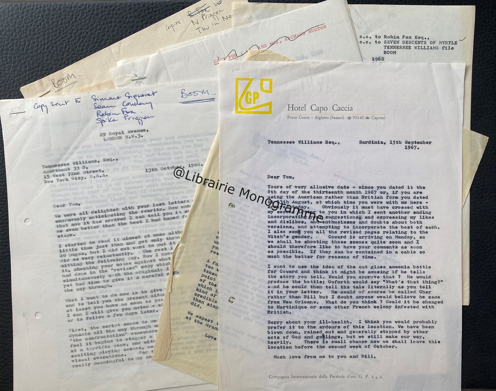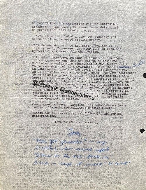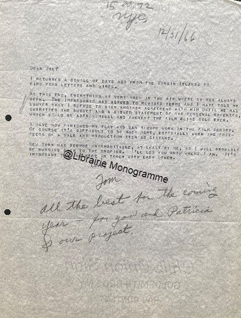19 octobre 1966, avec cinq lignes autographes au crayon. « I met the impresario for dinner, he bringing me a script and I bringing the notes […] There remains a problem of building - upward gradation of climatic bits between Chris and Goforth », (les personnages principaux de "Boom"). Il termine avec un mot d'encouragement en français : « En avant ! ».