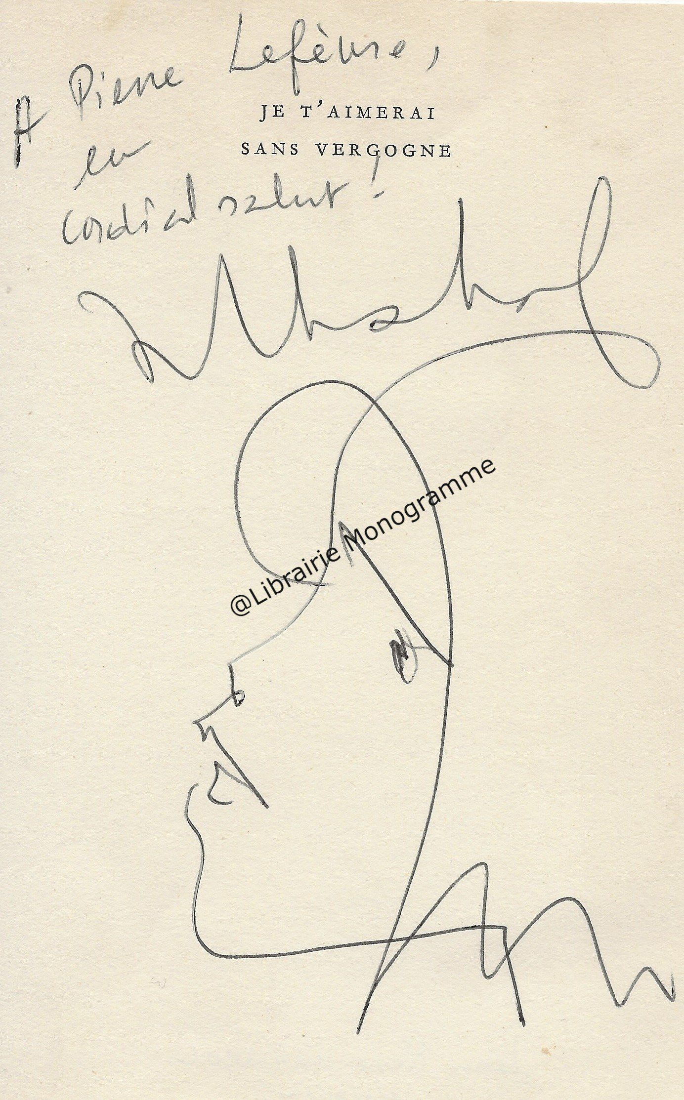 Dessin autographe signé de ses initiales, représentant le portrait de l’écrivain devant ses « Œuvres complètes »