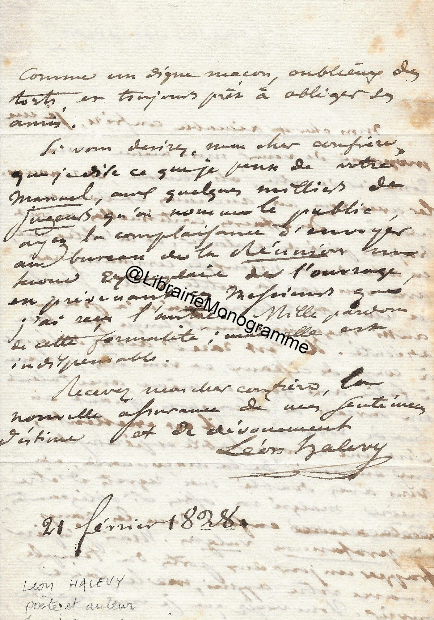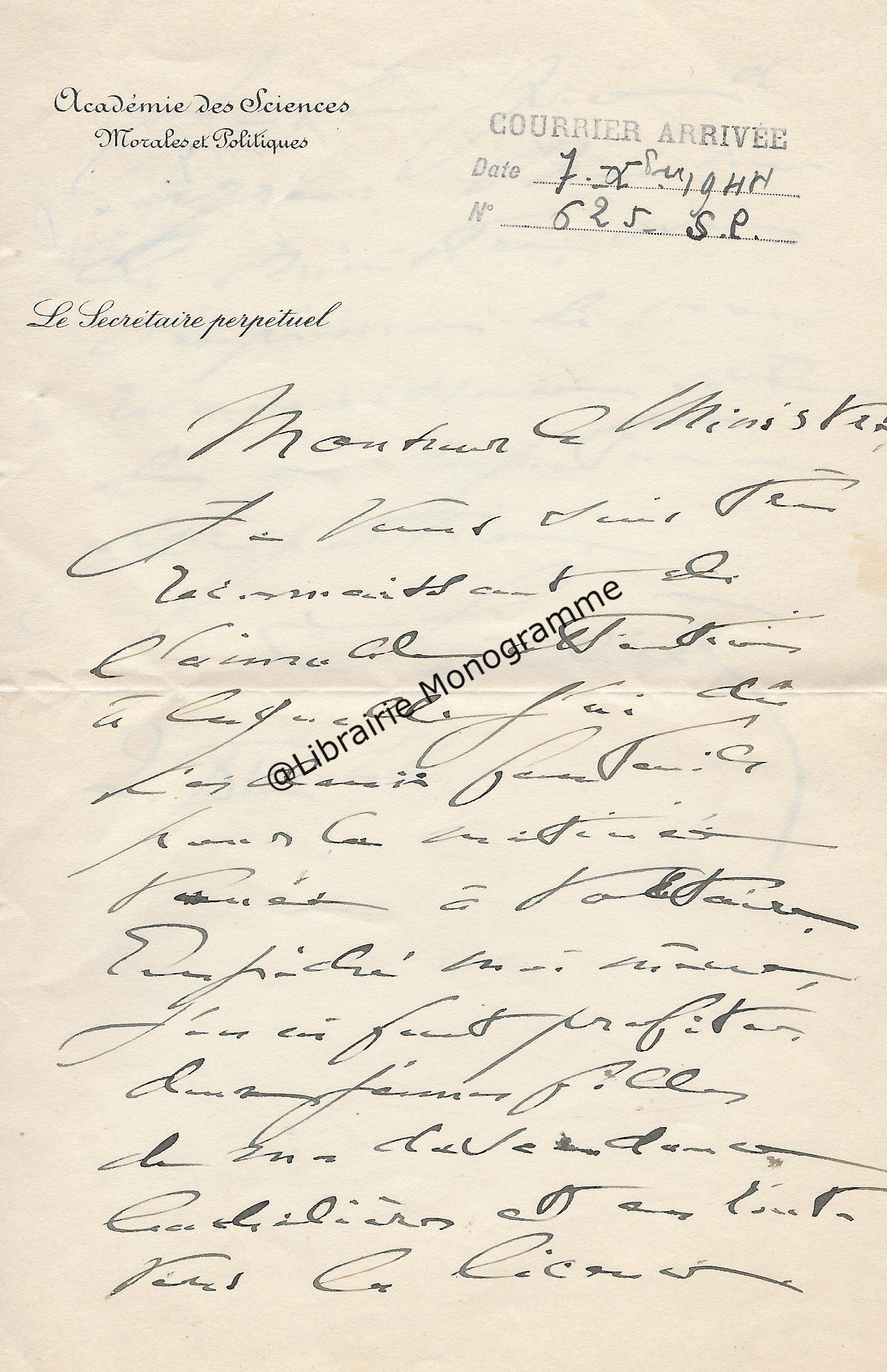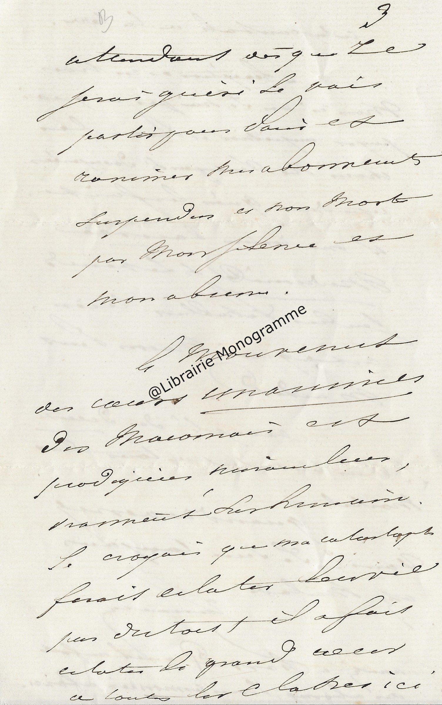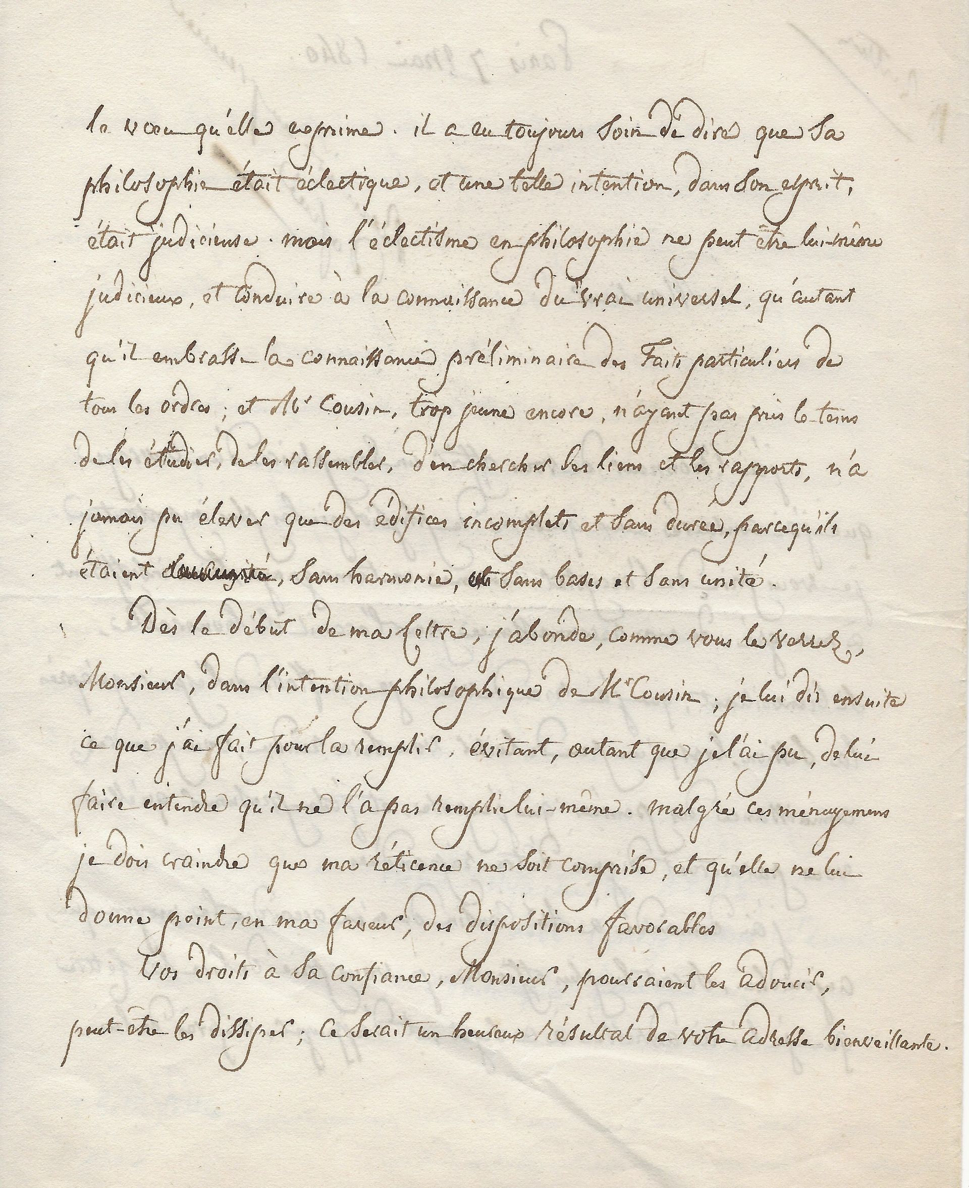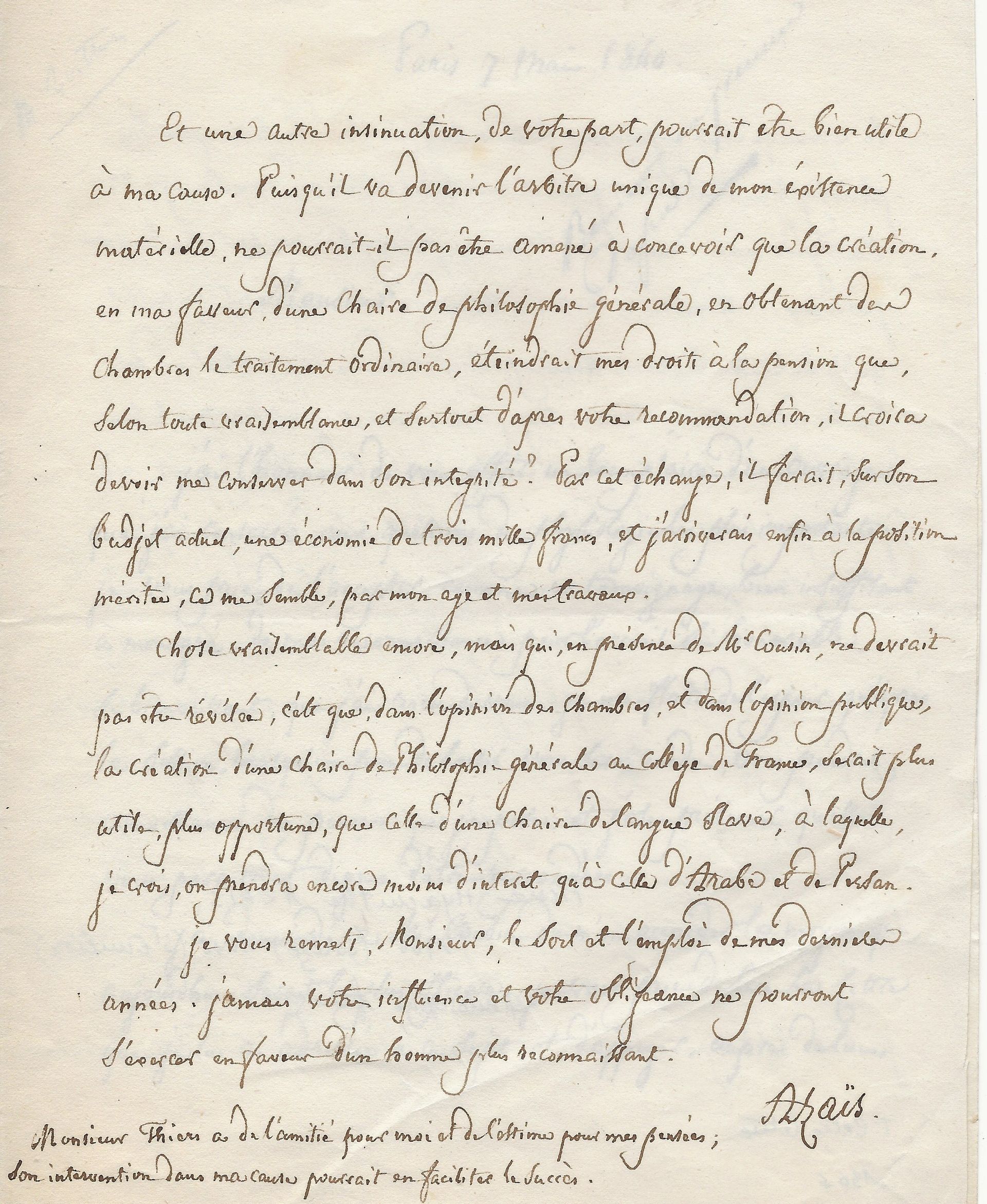 Très belle lettre dans laquelle il demande à son correspondant de le recommander auprès du philosophe, chef de l'école éclectique français, Victor Cousin (1792-1867). « J’ai l’honneur de vous offrir un exemplaire d’un ouvrage que j’ai consacré aux questions de physiologie les plus importantes […] Je me flatte de l’espoir qu’après la session, lorsqu’un peu de loisir vous sera rendu, vous prendrez connaissance des pensées que j’expose et j’ose présumer qu’elles vous paraitront dignes d’être répandues. J’ai demandé à Mr Cousin de m’en accorder le moyen qui, aujourd’hui serait le plus efficace. Je vous prie de lire la lettre que je lui ai adressée à ce sujet et d’appuyer auprès de lui le vœu qu’elle exprime. ». Il poursuit avec une critique de la pensée philosophique de Cousin « Il a eu toujours soin de dire que sa philosophie était éclectique, et une telle intention, dans son esprit, était judicieuse ; mais l’éclectisme en philosophie ne peut être lui-même judicieux, et conduire à la connaissance du vrai universel, qu’autant qu’il embrasse la connaissance préliminaire des faits particuliers de tous les ordres ; et Mr Cousin trop jeune encore, n’ayant pas pris le temps de les étudier, de les rassembler, d’en chercher les liens et les rapports, n’a jamais pu élever que des édifices incomplets et sans durée parce qu’ils étaient incomplets, sans harmonie, sans bases et sans unité. Dès le début de ma lettre, j’abonde, comme vous le verrez Monsieur, dans l’intention philosophique de Mr Cousin, je lui dis ensuite ce que j’ai fait pour la remplir, évitant autant que je l’ai pu, de lui faire entendre qu’il ne l’a pas remplie lui-même ; malgré ces ménagemens (pour ménagements), je dois craindre que ma réticence ne soit comprise, et qu’elle ne lui donne point, en ma faveur, des dispositions favorables. Vos droits à sa confiance, Monsieur, pourraient les adoucir, peut-être les dissiper ; ce serait un heureux résultat de votre adresse bienveillante. ». Ce constat dressé, il détaille à son correspondant sa demande, afin d’obtenir la création d’une chaise de philosophie générale, « Et une autre insinuation, de votre part pourrait être bien utile à ma cause. Puisqu’il va devenir l’arbitre unique de mon existence matérielle, ne pourrait-il pas être amené à concevoir, que la création en ma faveur, d’une chaise de philosophie générale, en obtenant des chambres le traitement ordinaire, éteindrait mes droits à la pension que, selon toute vraisemblance, et surtout d’après votre recommandation, il croira devoir me conserver dans son intégralité ? Par cet échange, il ferait, sur son budget actuel, une économie de 3000 francs et j’arriverais enfin à la position méritée, cela me semble, par mon âge et mes travaux. ». Il ajoute sous forme de confidence « Chose vraisemblable encore, mais qui, en présence de Mr Cousin, ne devrait pas être révélée, c’est que dans l’opinion des chambres, et dans l’opinion publique, la création d’une chaise de philosophie générale au Collège de France, serait plus utile, plus opportune, que celle d’une chaise de longue élève, à laquelle, je crois on prendra encore moins d’intérêt qu’à celle d’Arabe et de Persan… ». Il termine avec cette précision « Monsieur Thiers a de l’amitié pour moi et de l’estime pour mes pensées. Son intervention dans ma cause pourrait en faciliter le succès. ».