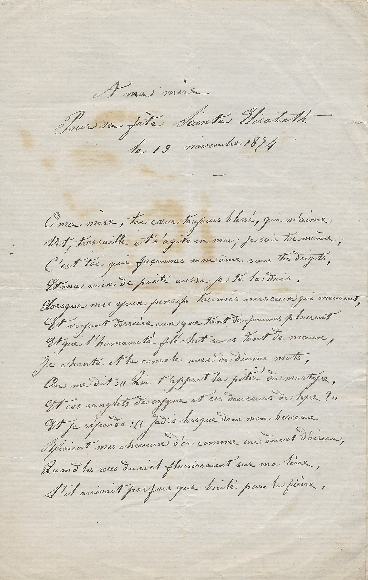 Poème autographe signé « À ma mère pour sa fête Sainte Elisabeth ».