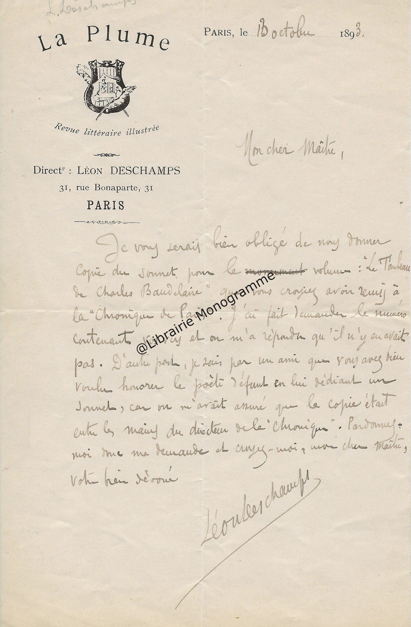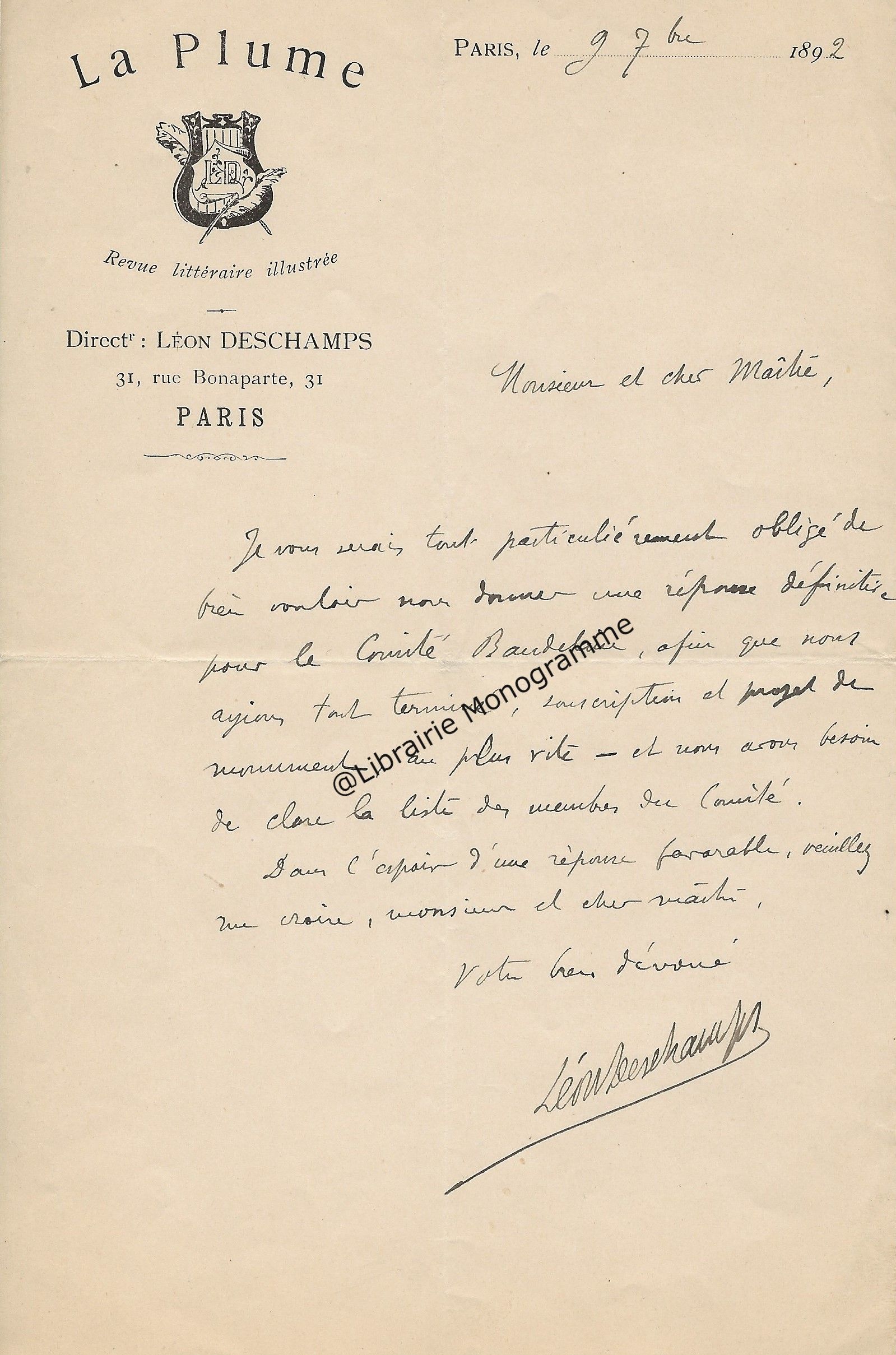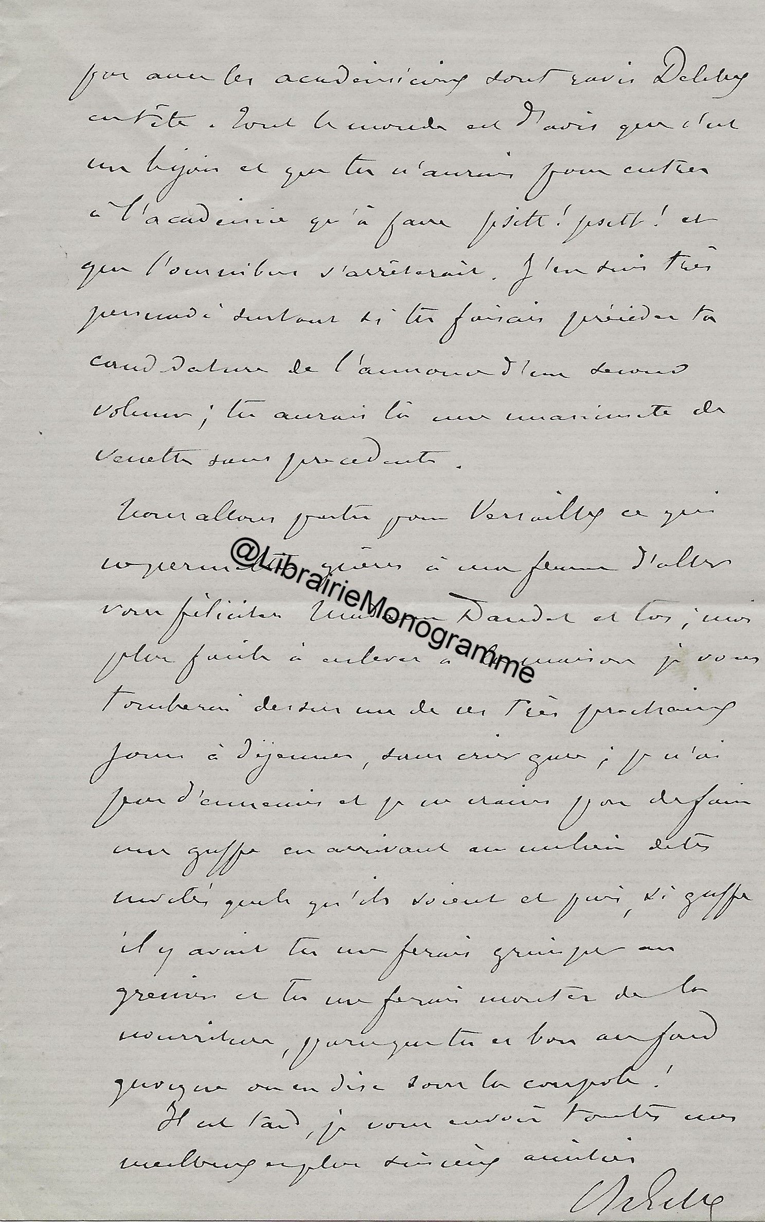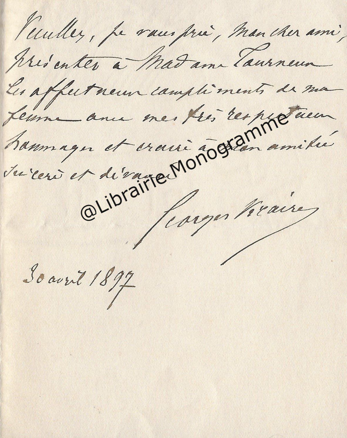 Lettre autographe signée à l’archiviste et l’historien de l’art, Maurice Tourneux. Paris, 30 avril 1897. 2 pp. ½ in-12.