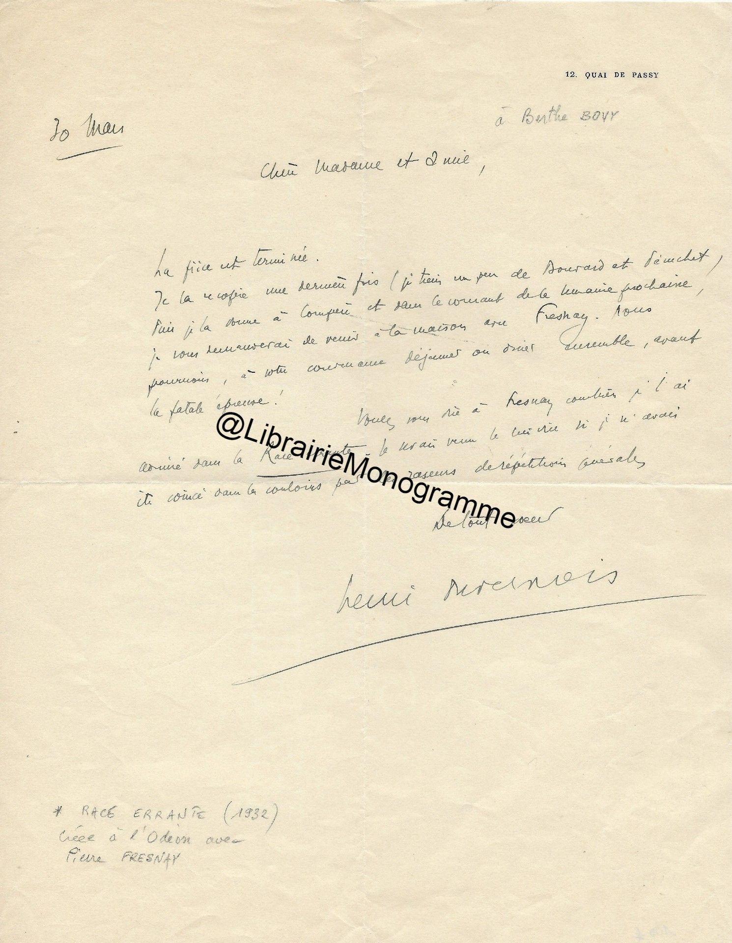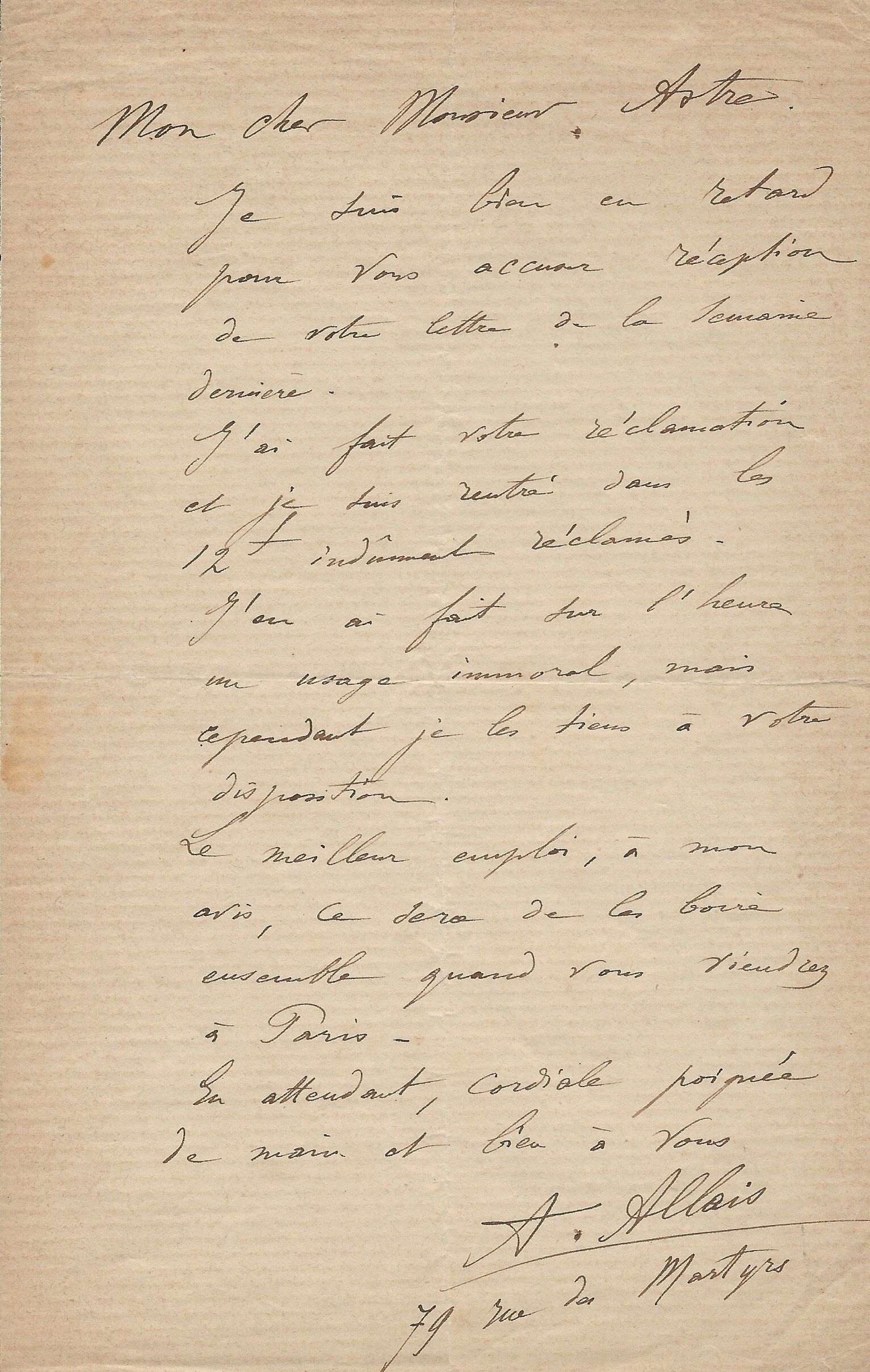 Lettre autographe signée à Mr Astre. Paris, 79 rue des Martyrs. 1 p. in-8.