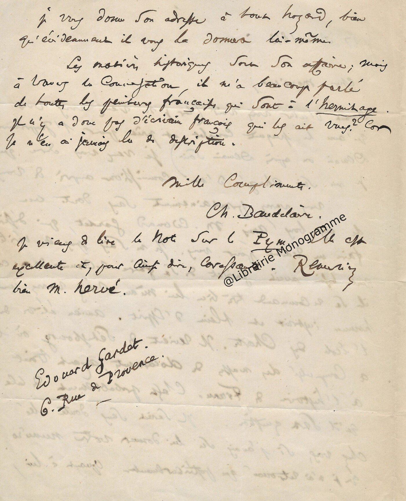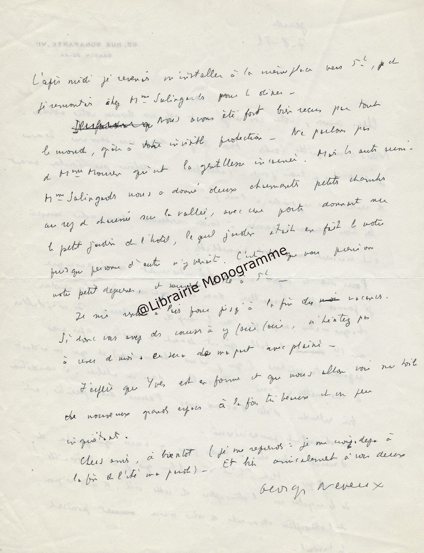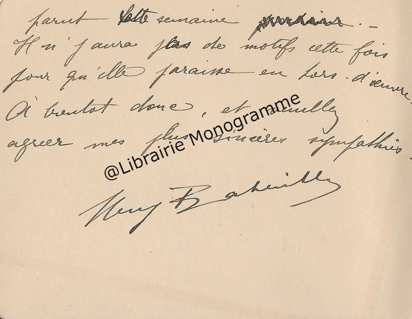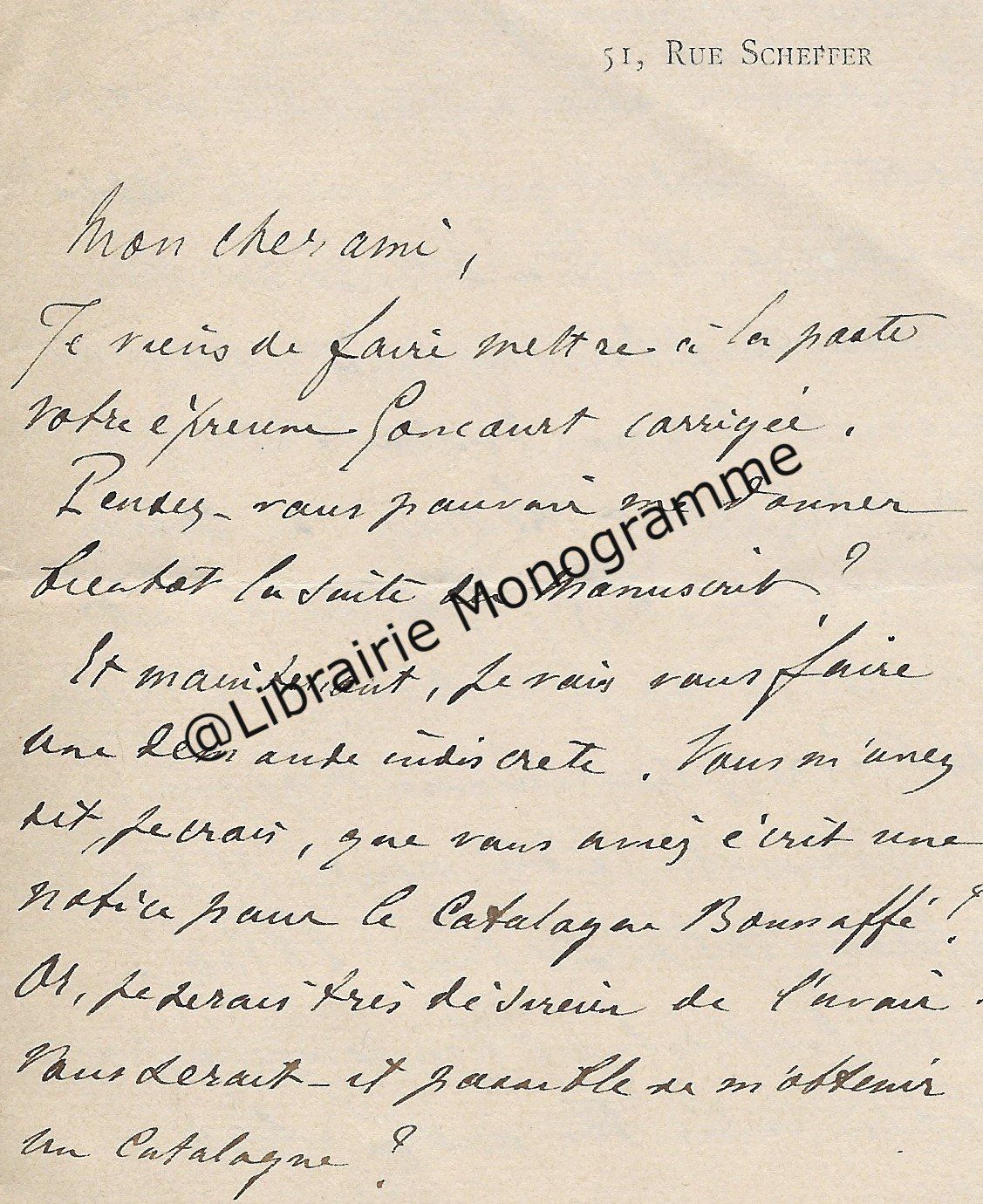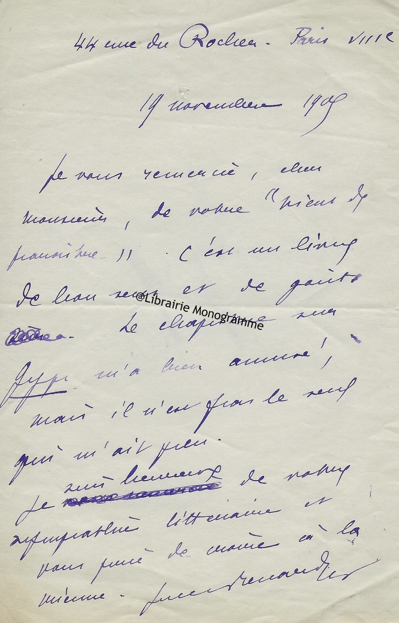 « Je vous retourne, corrigées les épreuves et vous remercie de la promptitude avec laquelle elles me sont parvenues ». Il lui rappelle son adresse qui est toujours : « 4, rue de Vaugirard ».