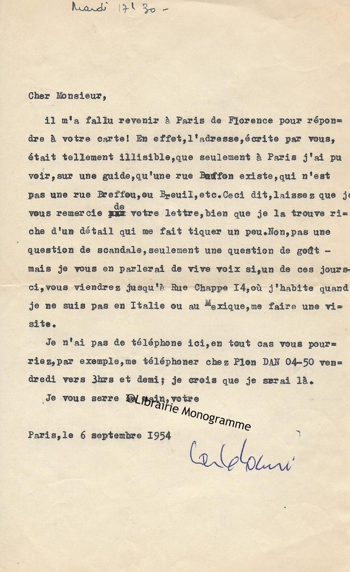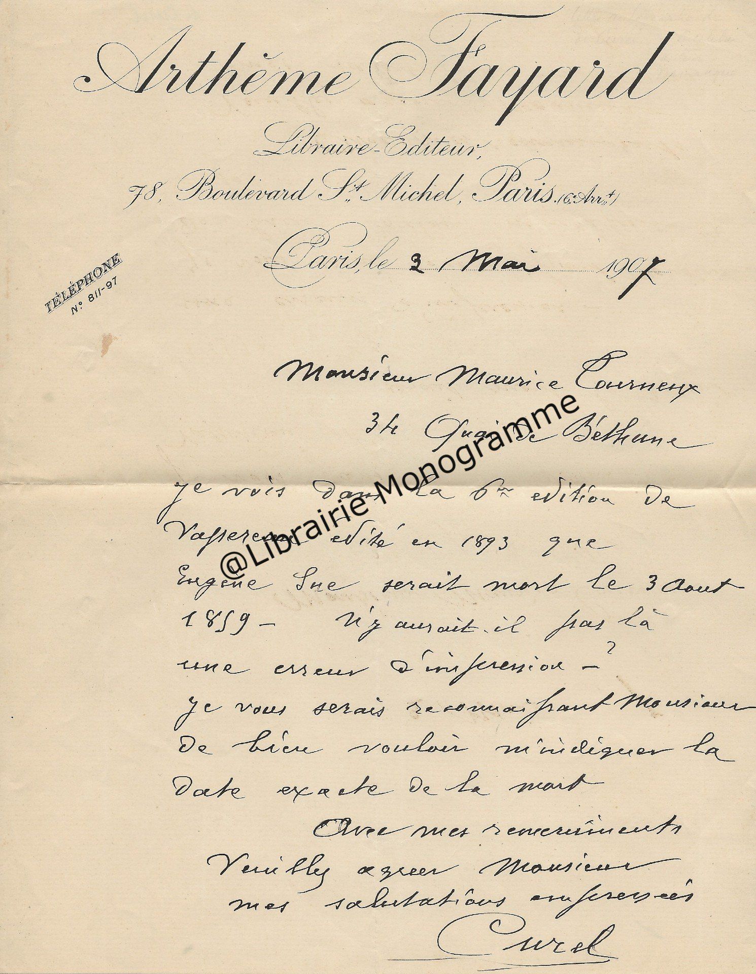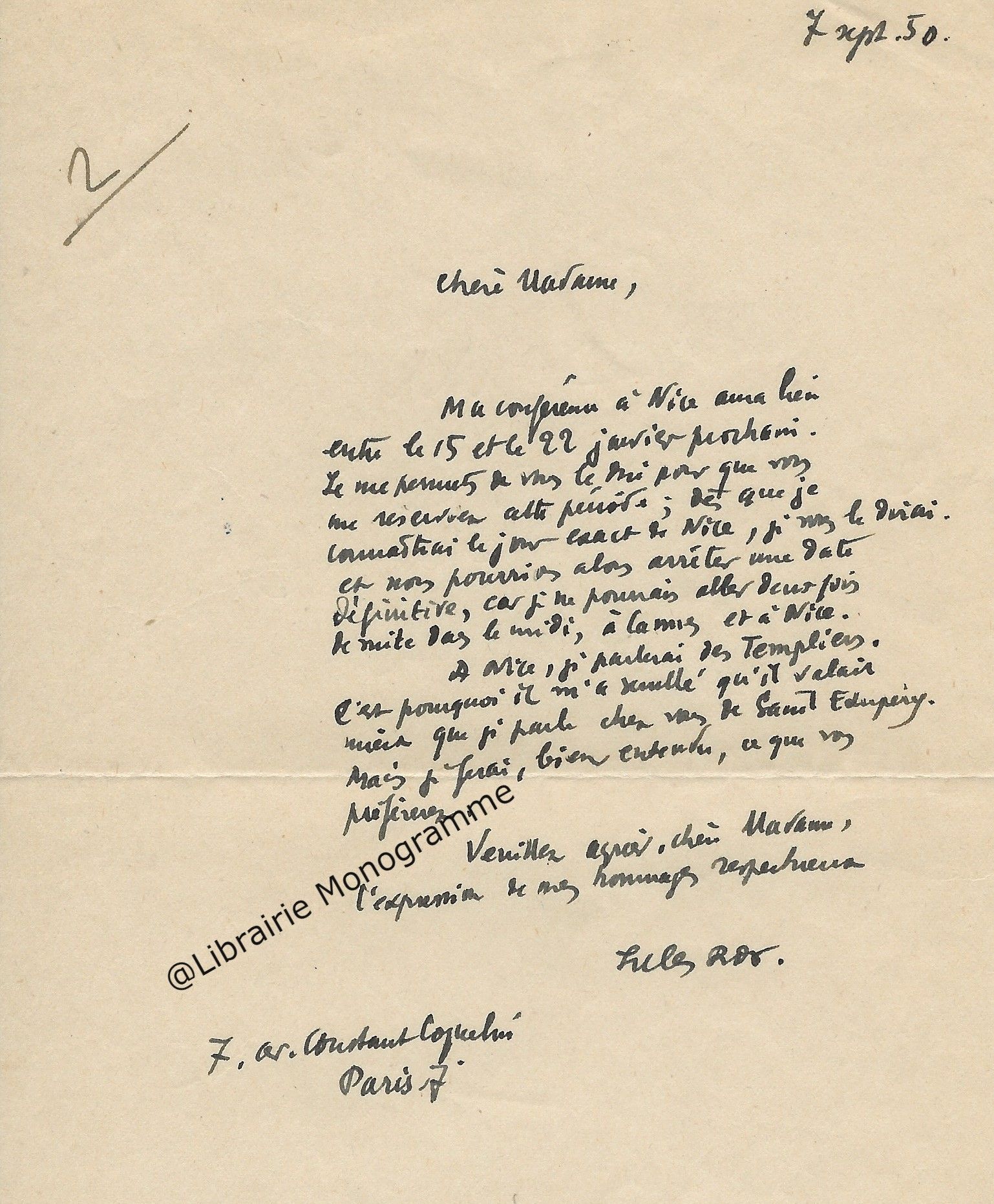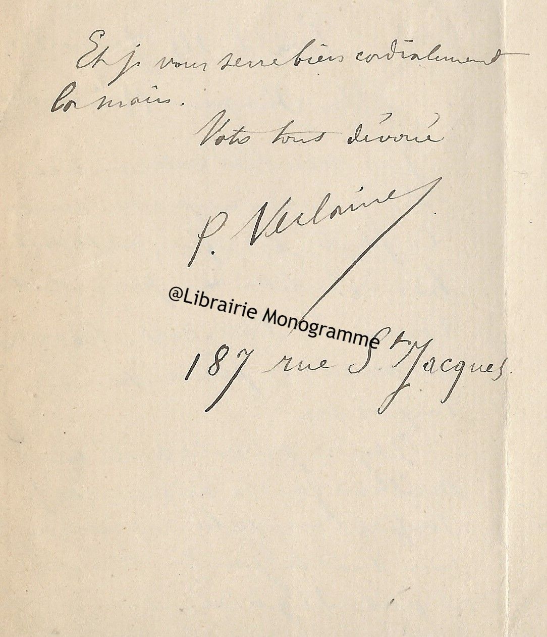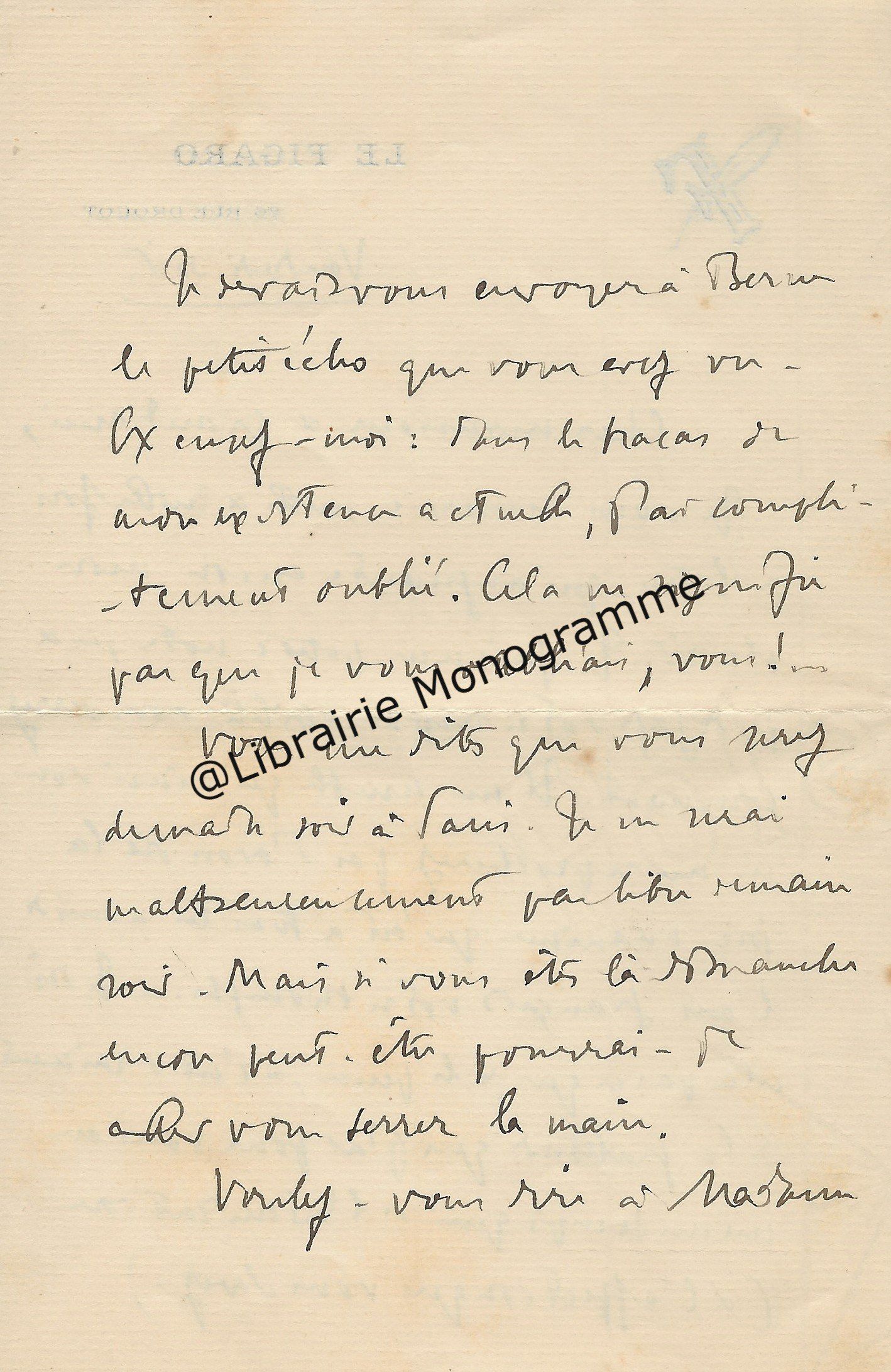 « Je vous retourne, corrigées les épreuves et vous remercie de la promptitude avec laquelle elles me sont parvenues ». Il lui rappelle son adresse qui est toujours : « 4, rue de Vaugirard ».