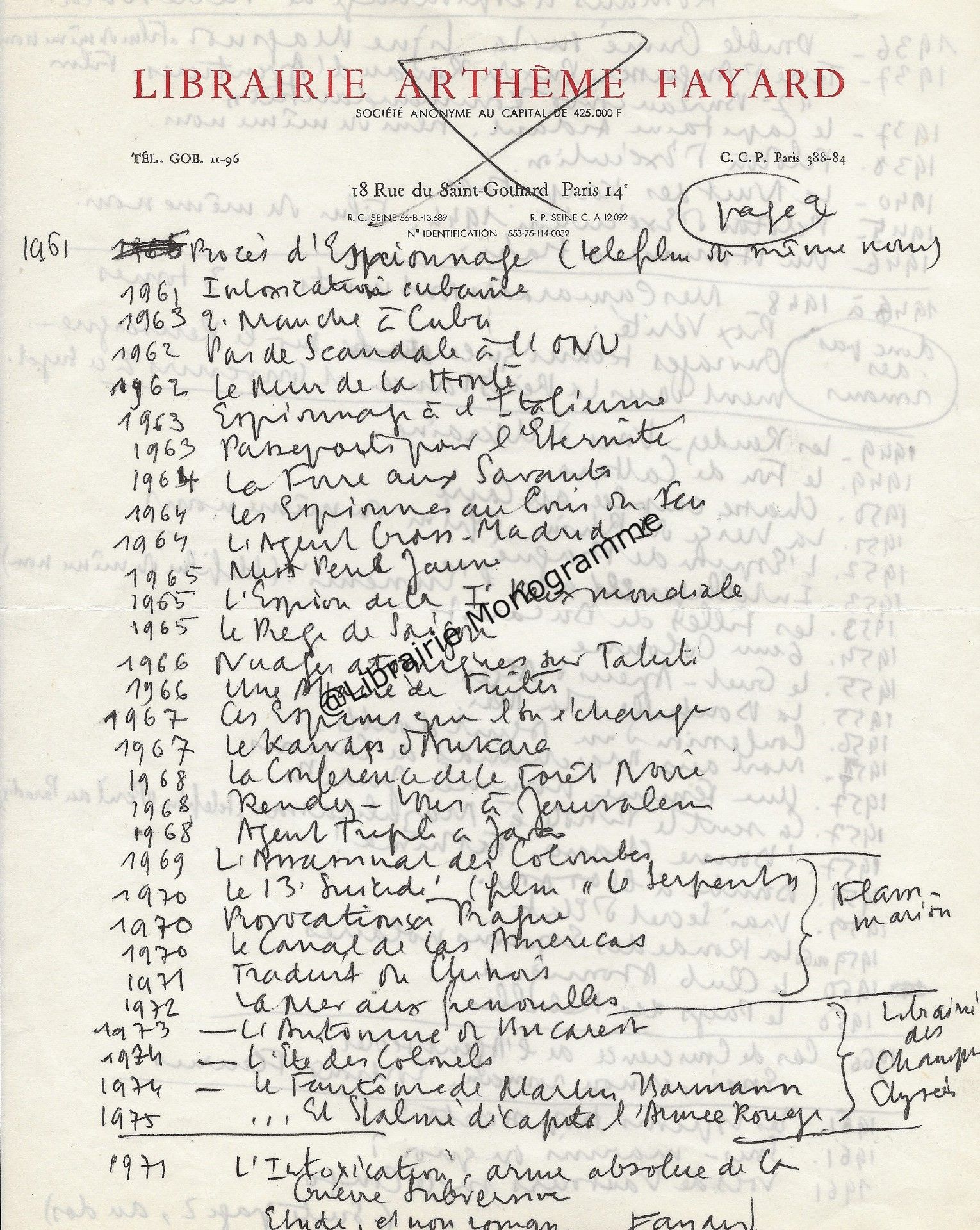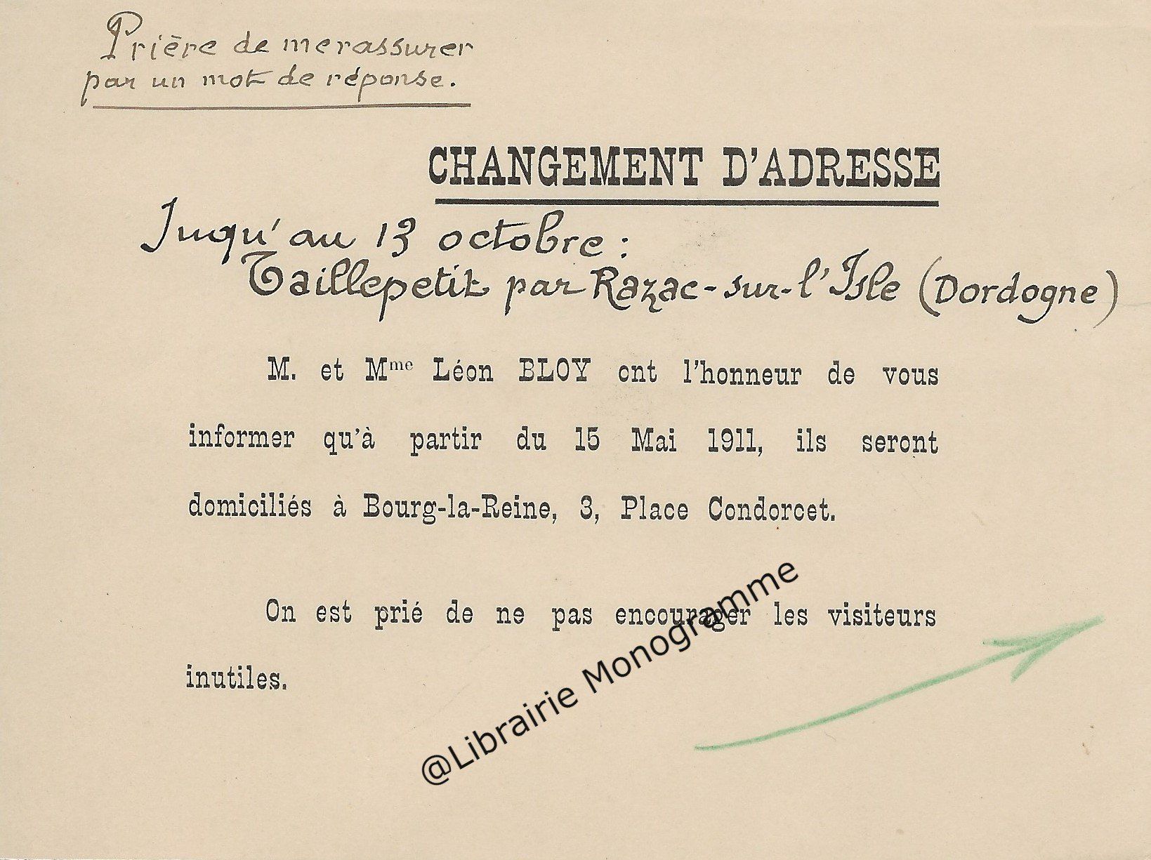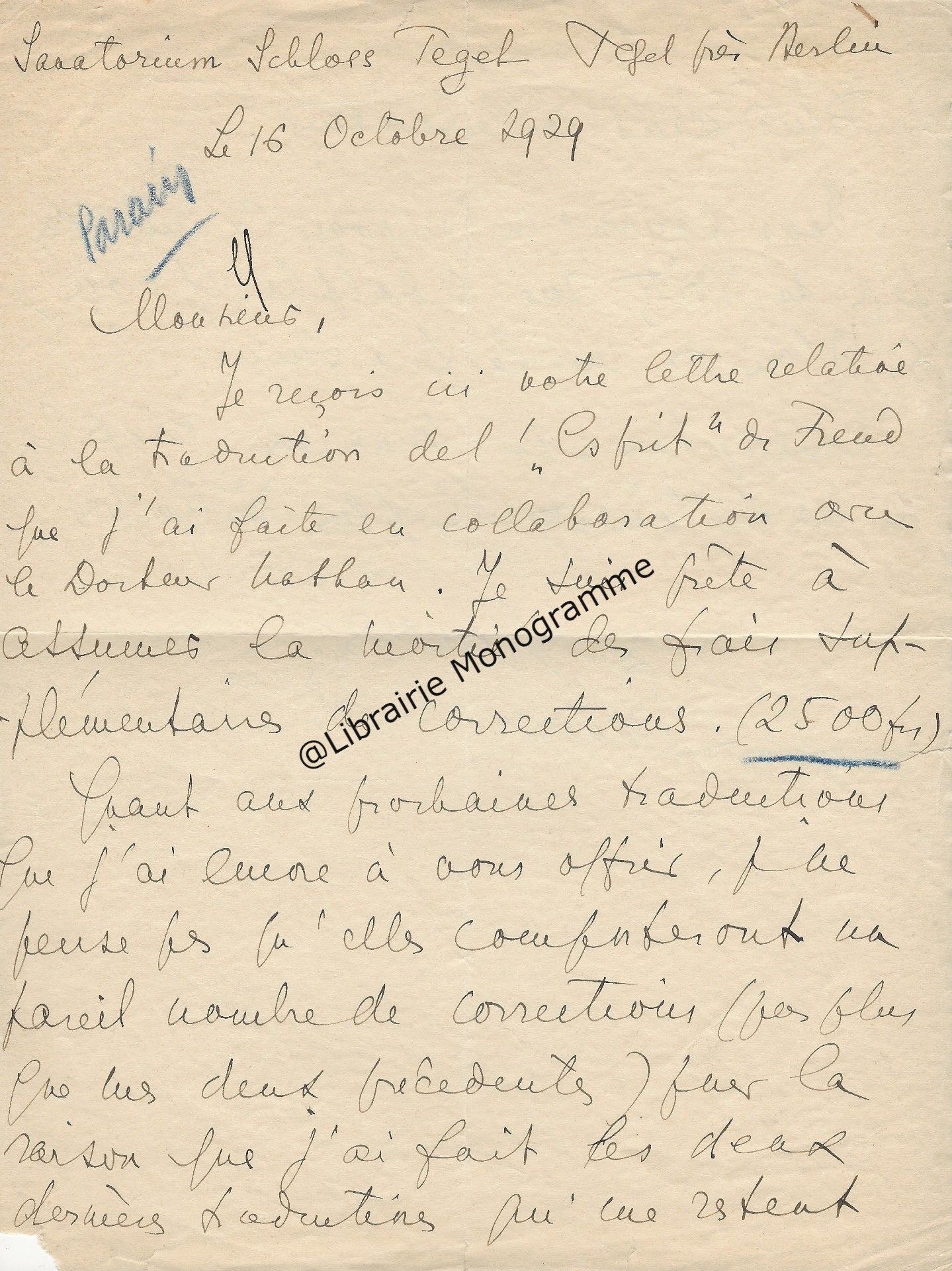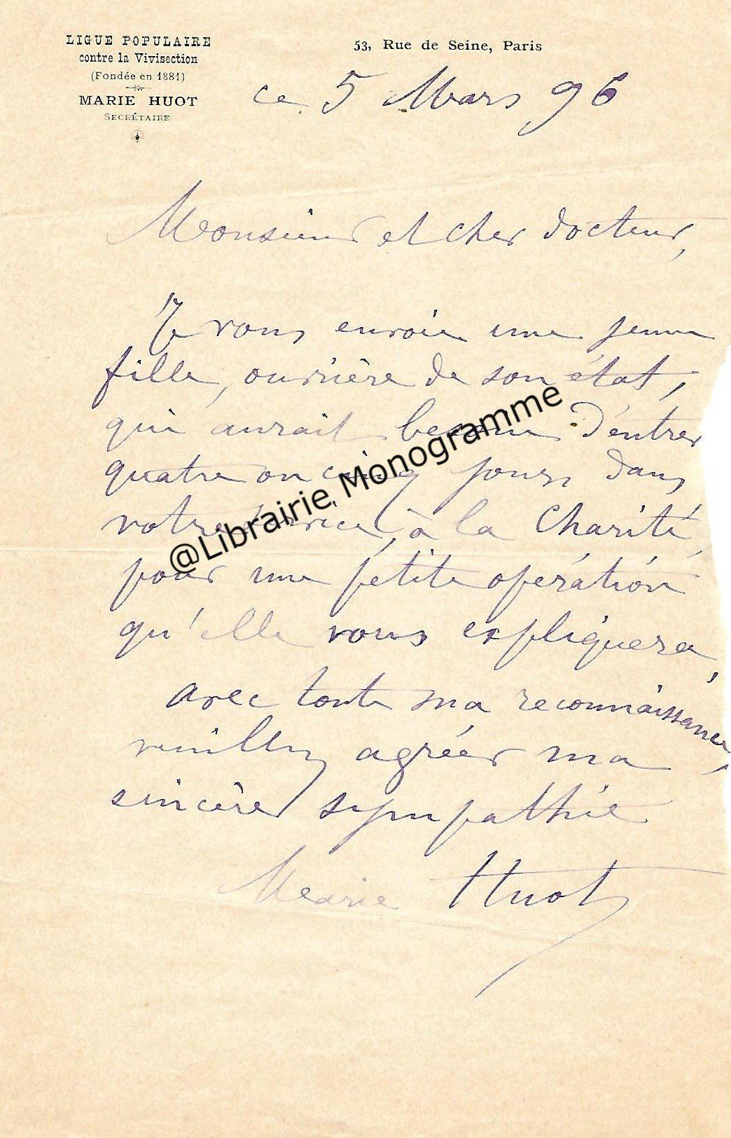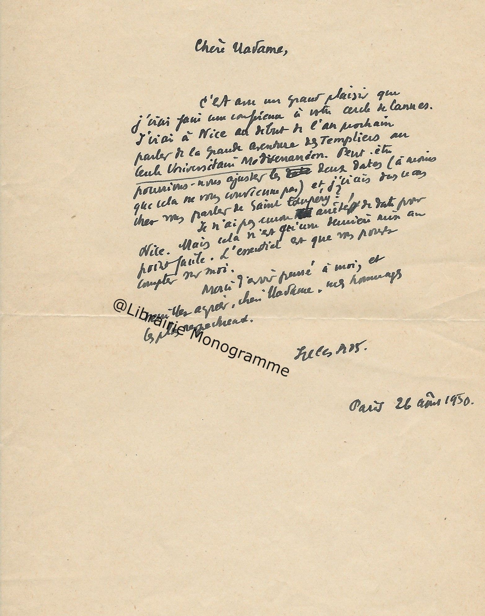 « Je vous retourne, corrigées les épreuves et vous remercie de la promptitude avec laquelle elles me sont parvenues ». Il lui rappelle son adresse qui est toujours : « 4, rue de Vaugirard ».