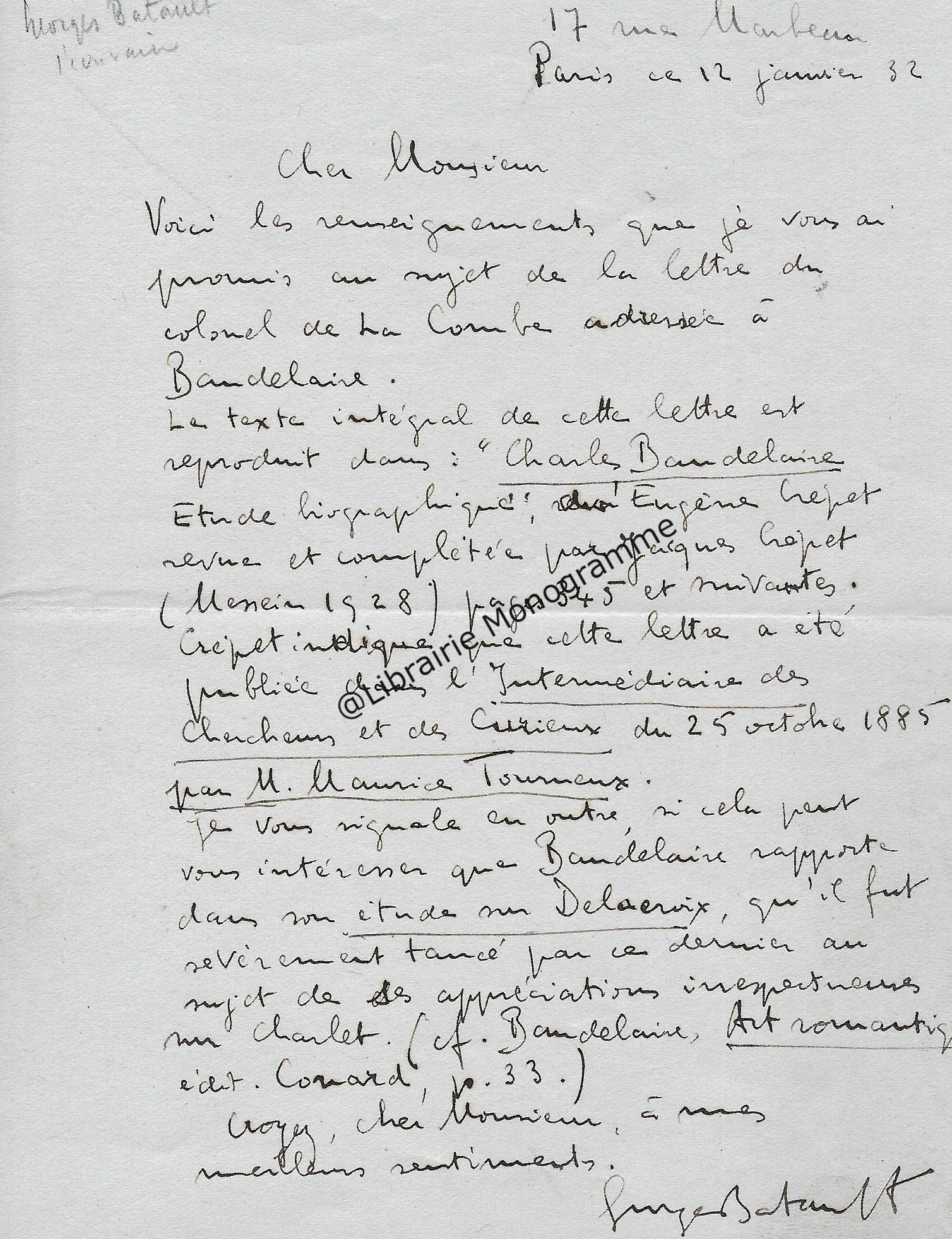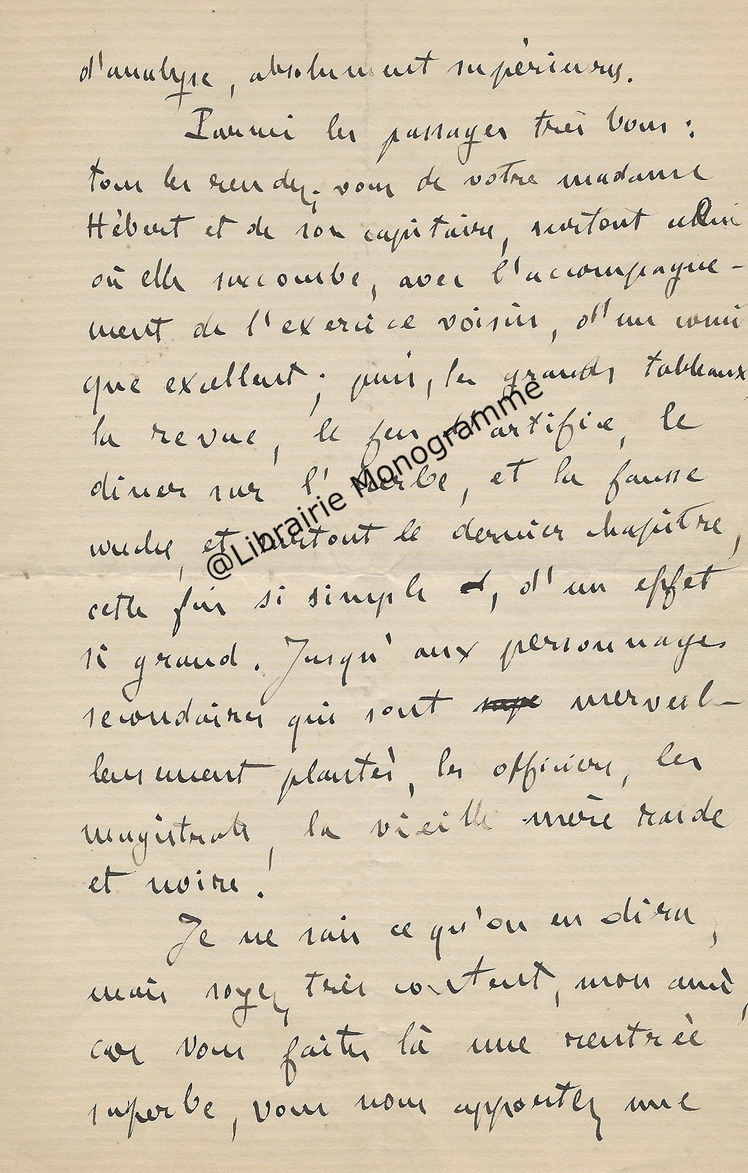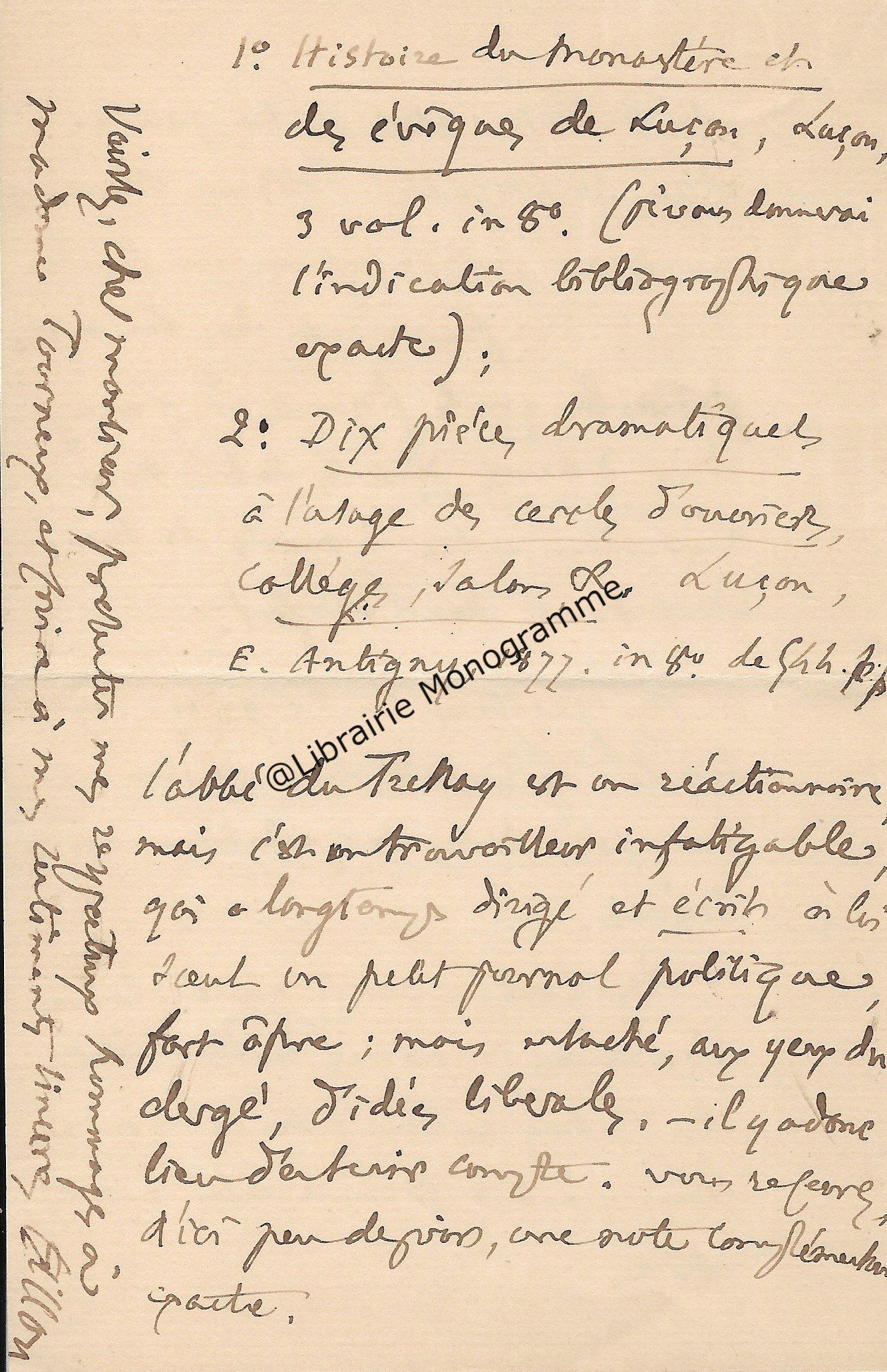 Belle lettre adressée à son confrère dans laquelle il le complimente sur ses engagements littéraires et sur son nouvel ouvrage. Il émet un constat sur les différentes revues littéraires. « Vous êtes une sentinelle vigilante. Vous montez, nuit et jour, la garde auprès du mausolée de votre maitre, en ne permettant pas qu’on égratigne le monument ni qu’on le salisse en y jetant des ordures. Il avait déjà vu avec quel sentiment de piété vous avez rabroué les cléricaux, ces profanateurs angéliques, à propos des Mémoires d’outre-tombe [l’œuvre majeure de François-René de Chateaubriand (1768-1848]. Cet opuscule, éclairé par tant de notes précieuses, a été pour moi une lecture des plus captivantes. Ces pages nouvelles sont une nouvelle preuve de votre attachement à Sainte-Beuve et de votre culte pour la vérité ». Il le questionne ensuite sur la Nouvelle Revue et finit par une conclusion des plus pragmatiques « Savez-vous qui succède à Mme Adam dans le gouvernement de la Nouvelle Revue ? Et si cette publication, jadis très prospère, a encore chance de vivre ? On me dit que ce pauvre cahier est bien malade. Si j’ai eu autrefois 5 grands articles, (la valeur d’un gros volume), il y avait alors 7,000 abonnés venus en peu de temps ; c’est un roman de Jules Vallès, grandement écrit en argot, qui a donné le signal de la dégringolade. Du reste, il y a trois ans que j’ai cessé de lire cette Revue, mais il y en désormais tant d’autres ! Et comment toutes ces brochures trouvent-elles des clients ? A la vérité, vu la diffusion des écoles de tout genre, il doit se former, chaque année 500,000 lecteurs, pour le moins. Une préparation à un monde nouveau et une nation, qui comme l’Angleterre et l’Amérique du Nord, va avoir de plus en plus besoin de papier noirci pour ne pas mourir d’ennui ou d’ignorance… ».
