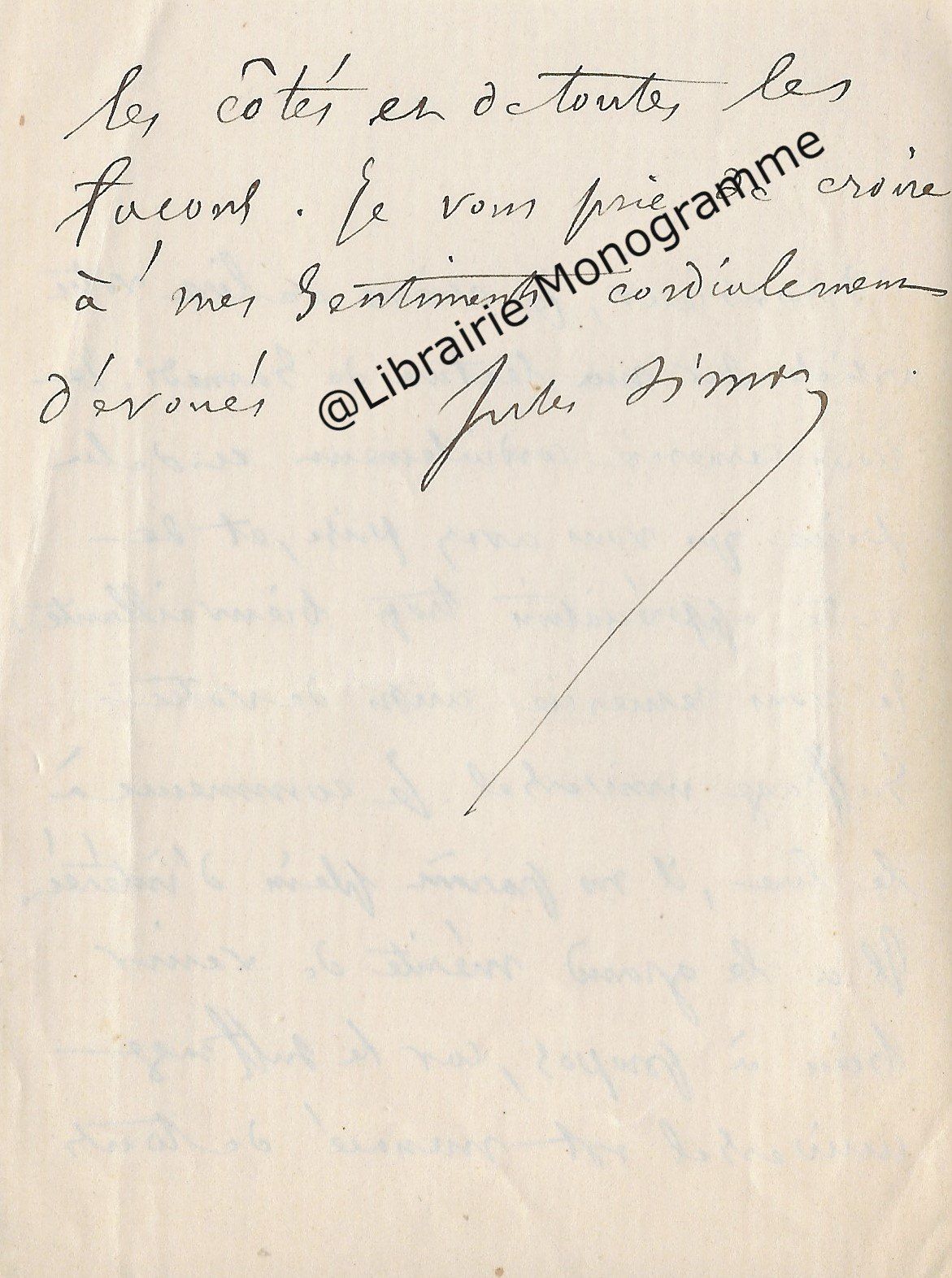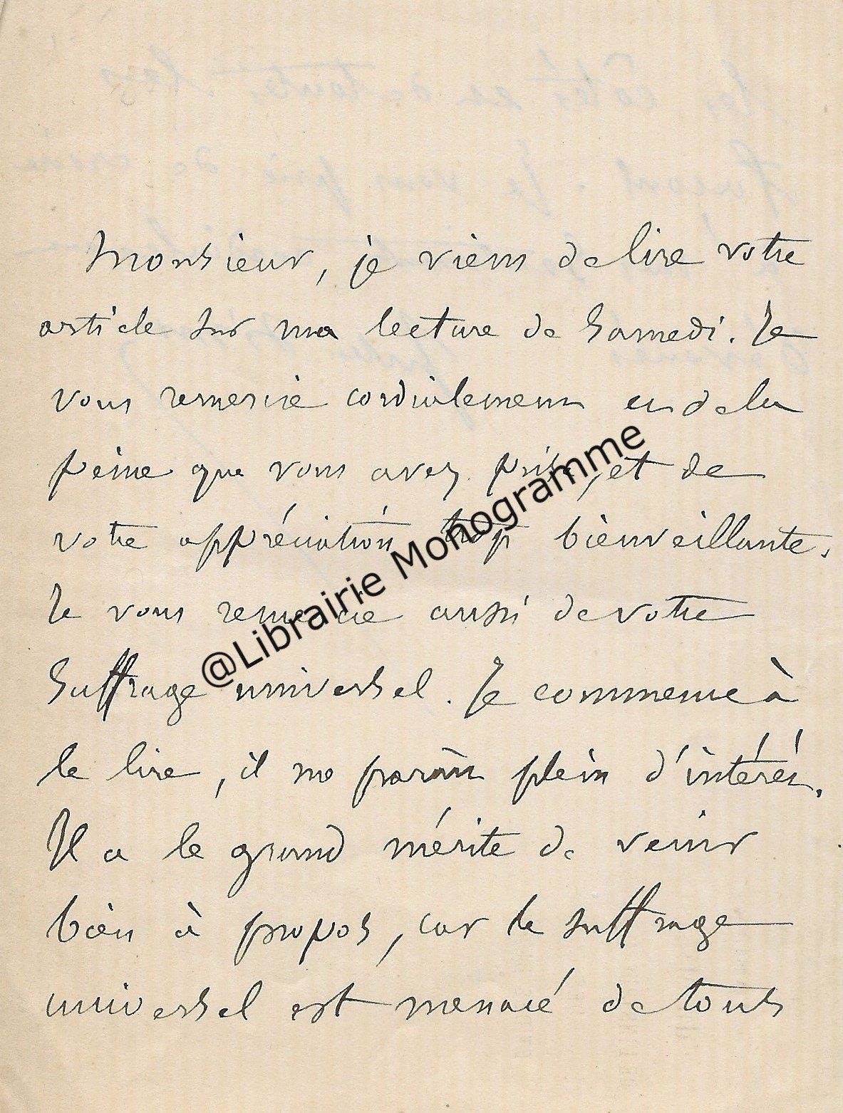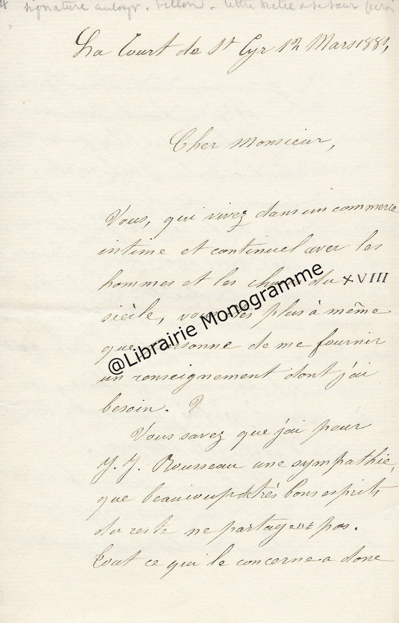 Belle lettre adressée à son confrère dans laquelle il le complimente sur ses engagements littéraires et sur son nouvel ouvrage. Il émet un constat sur les différentes revues littéraires. « Vous êtes une sentinelle vigilante. Vous montez, nuit et jour, la garde auprès du mausolée de votre maitre, en ne permettant pas qu’on égratigne le monument ni qu’on le salisse en y jetant des ordures. Il avait déjà vu avec quel sentiment de piété vous avez rabroué les cléricaux, ces profanateurs angéliques, à propos des Mémoires d’outre-tombe [l’œuvre majeure de François-René de Chateaubriand (1768-1848]. Cet opuscule, éclairé par tant de notes précieuses, a été pour moi une lecture des plus captivantes. Ces pages nouvelles sont une nouvelle preuve de votre attachement à Sainte-Beuve et de votre culte pour la vérité ». Il le questionne ensuite sur la Nouvelle Revue et finit par une conclusion des plus pragmatiques « Savez-vous qui succède à Mme Adam dans le gouvernement de la Nouvelle Revue ? Et si cette publication, jadis très prospère, a encore chance de vivre ? On me dit que ce pauvre cahier est bien malade. Si j’ai eu autrefois 5 grands articles, (la valeur d’un gros volume), il y avait alors 7,000 abonnés venus en peu de temps ; c’est un roman de Jules Vallès, grandement écrit en argot, qui a donné le signal de la dégringolade. Du reste, il y a trois ans que j’ai cessé de lire cette Revue, mais il y en désormais tant d’autres ! Et comment toutes ces brochures trouvent-elles des clients ? A la vérité, vu la diffusion des écoles de tout genre, il doit se former, chaque année 500,000 lecteurs, pour le moins. Une préparation à un monde nouveau et une nation, qui comme l’Angleterre et l’Amérique du Nord, va avoir de plus en plus besoin de papier noirci pour ne pas mourir d’ennui ou d’ignorance… ».