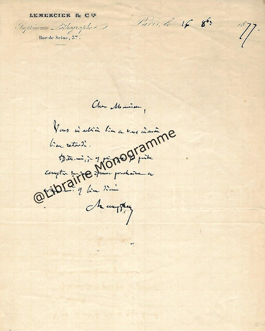 Lettre autographe signée à son « cher confrère ». 21 mai 1877. 1 p. in-8.