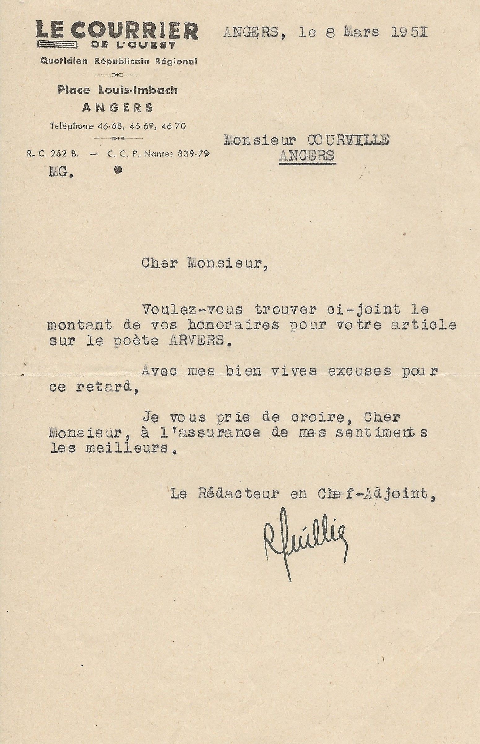 On joint une lettre dactylographiée signée du rédacteur en chef du journal, attestant du paiement des honoraires reçus par Courville pour la rédaction de cet article.