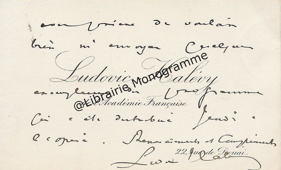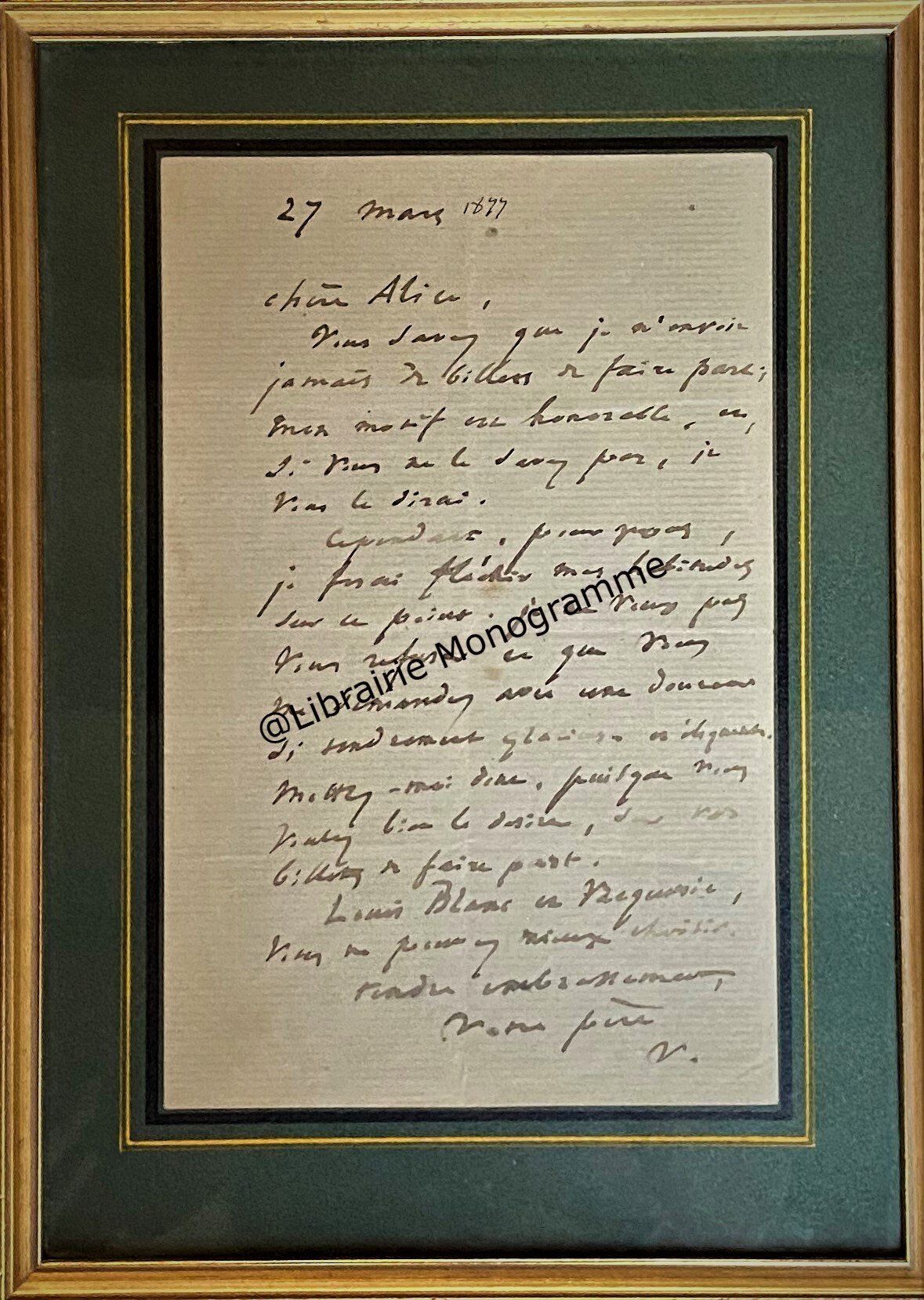 On joint deux cartes de visite à son nom mais rédigées par son secrétaire et 2 pièces imprimées, une relative au dîner de « La Nouvelle Revue » de 1883, précisant le nom de tous les membres adhérents présents à ce dîner et la seconde concernant une souscription pour l’achat d’un objet d’art, afin de l’offrir à Juliette Adam, comme témoignage de leur respectueuse affection. (L’objet d’art choisi est une réduction du groupe « Quand même ! » d’Antonin Mercié. La fonte de ce groupe a entraîné d’assez longs délais).