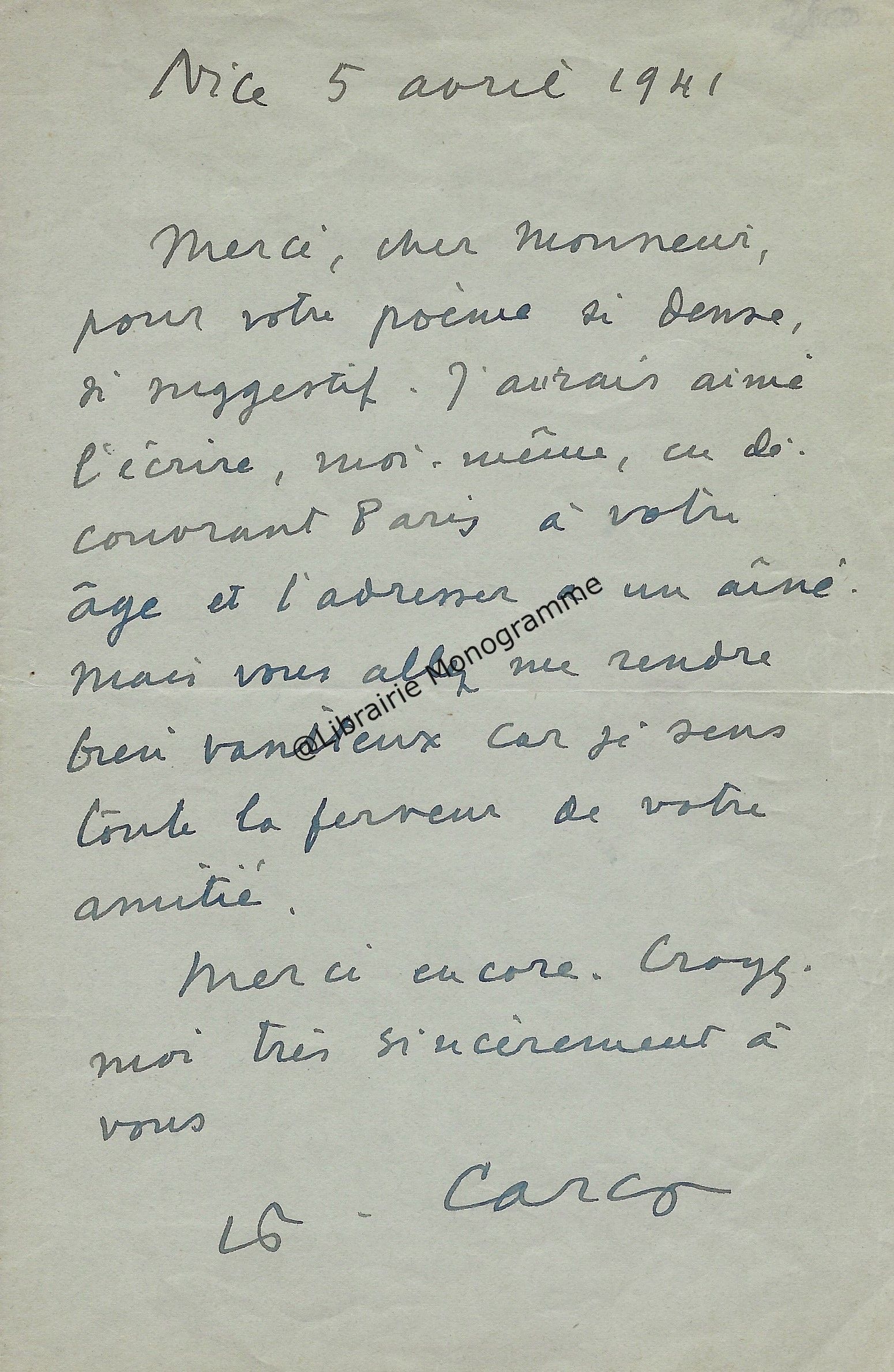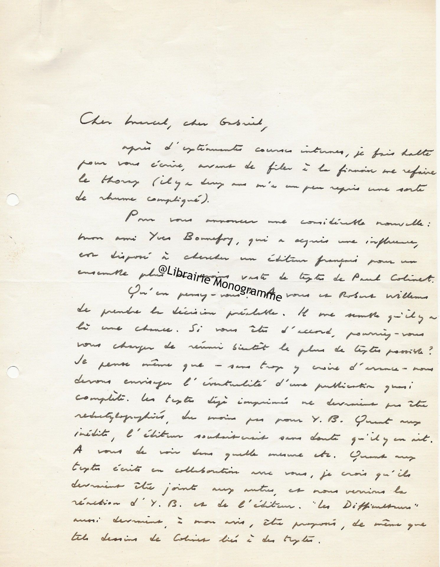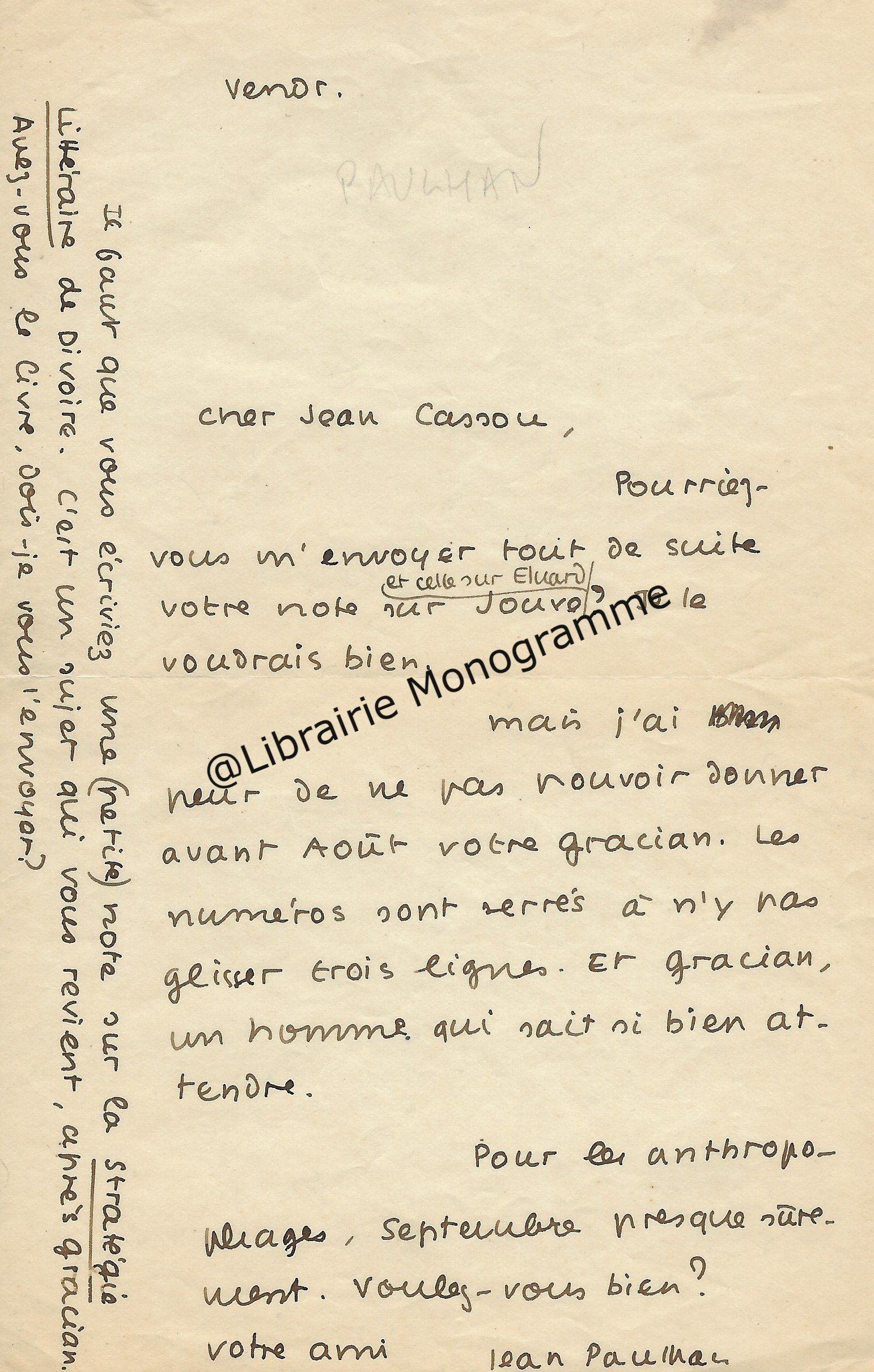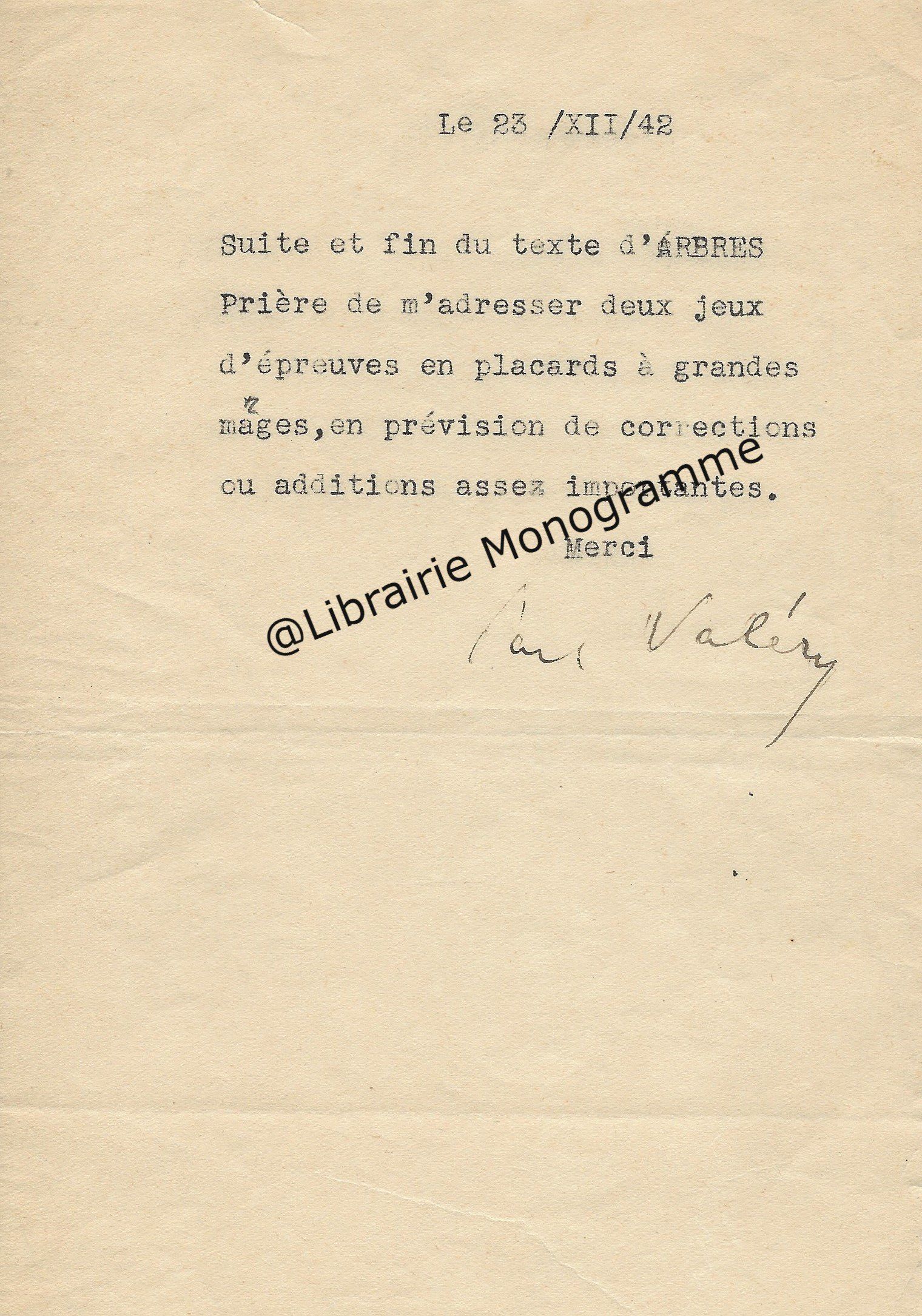 Intéressante lettre à propos de la « Suite et fin du texte d’ARBRES » (le titre original de l’œuvre deviendra « Dialogue de l’arbre », paru en 1943. Poème écrit sous l’occupation, à la gloire de l’Arbre). Il demande à son destinataire de lui « adresser deux jeux d’épreuves en placards à grandes marges, en prévision de corrections ou additions assez importantes ».