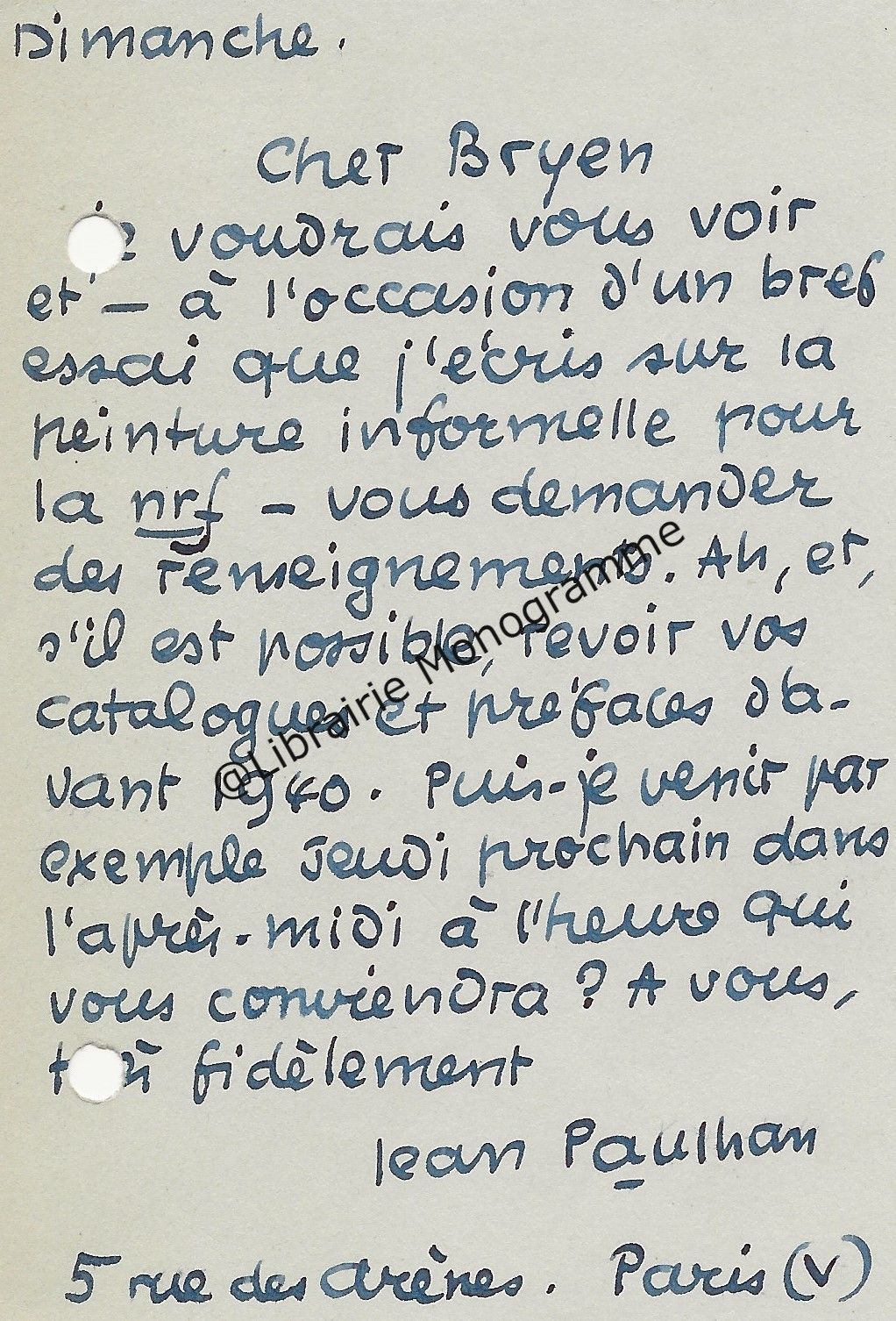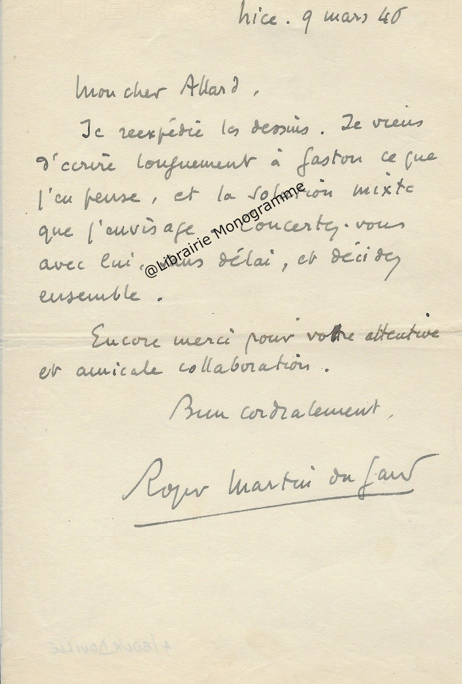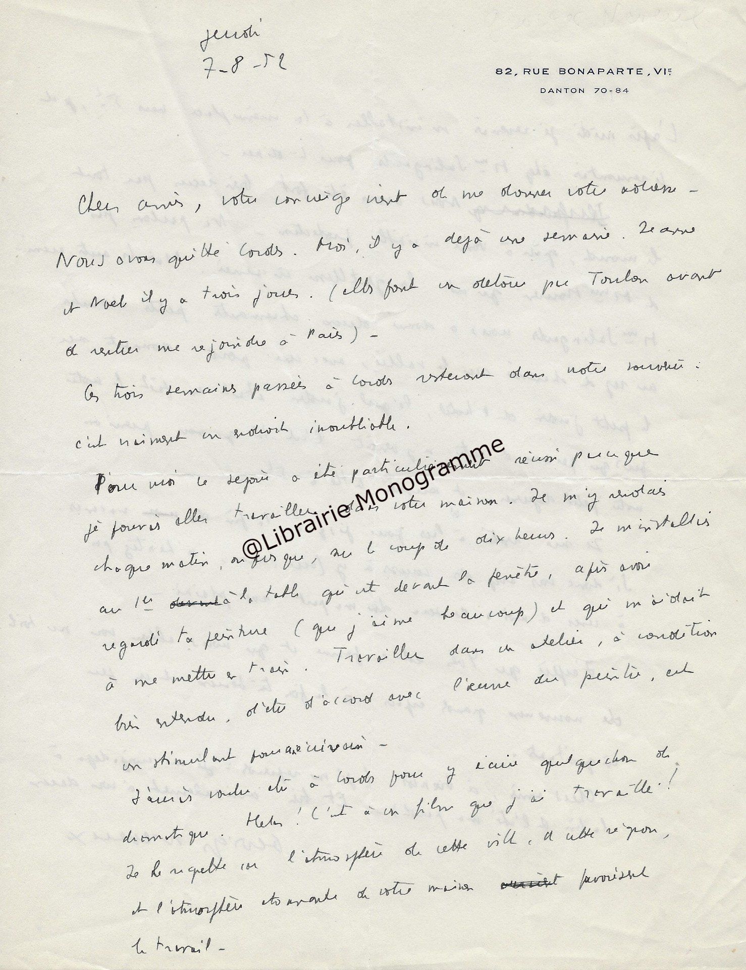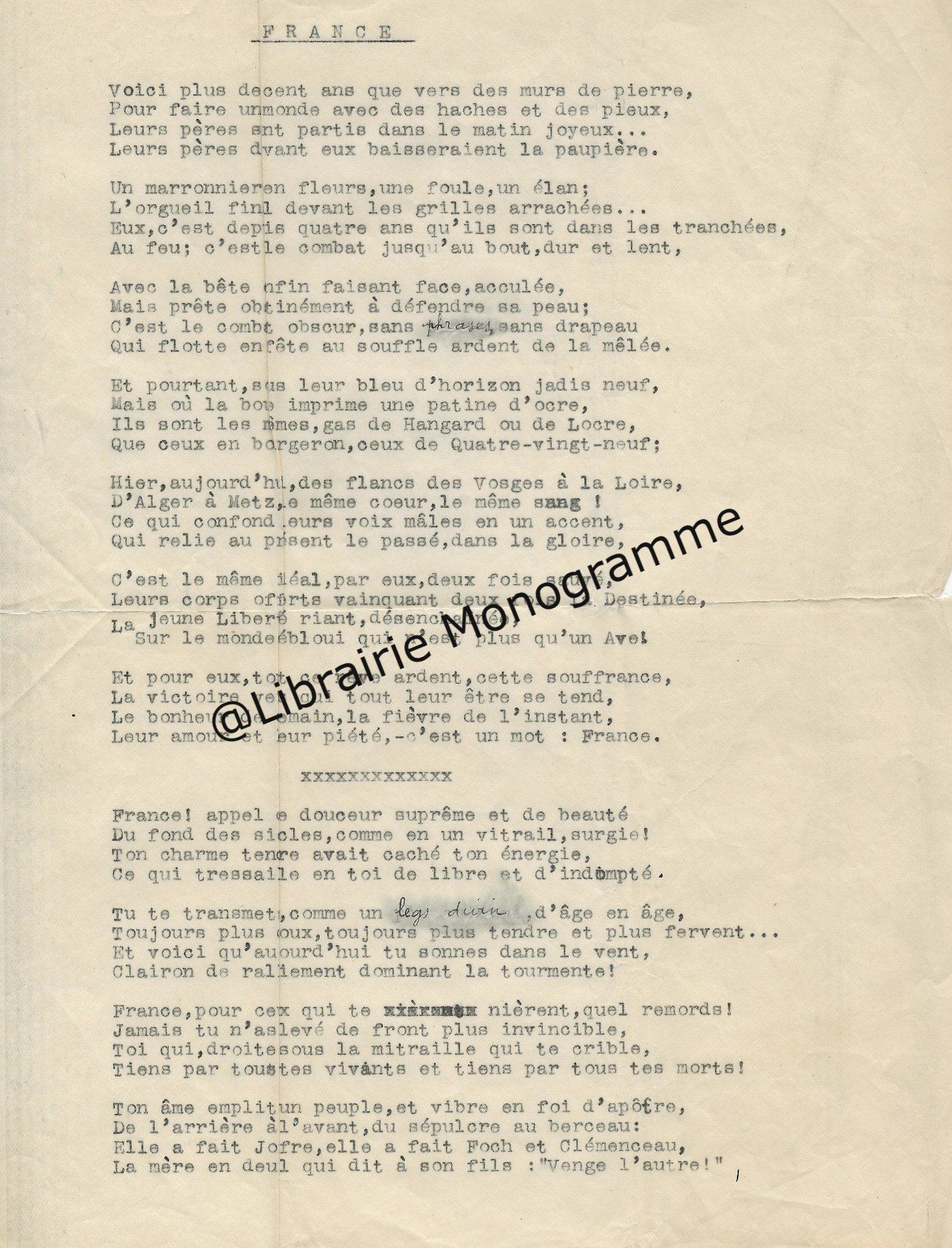 Intéressante lettre à propos de la « Suite et fin du texte d’ARBRES » (le titre original de l’œuvre deviendra « Dialogue de l’arbre », paru en 1943. Poème écrit sous l’occupation, à la gloire de l’Arbre). Il demande à son destinataire de lui « adresser deux jeux d’épreuves en placards à grandes marges, en prévision de corrections ou additions assez importantes ».