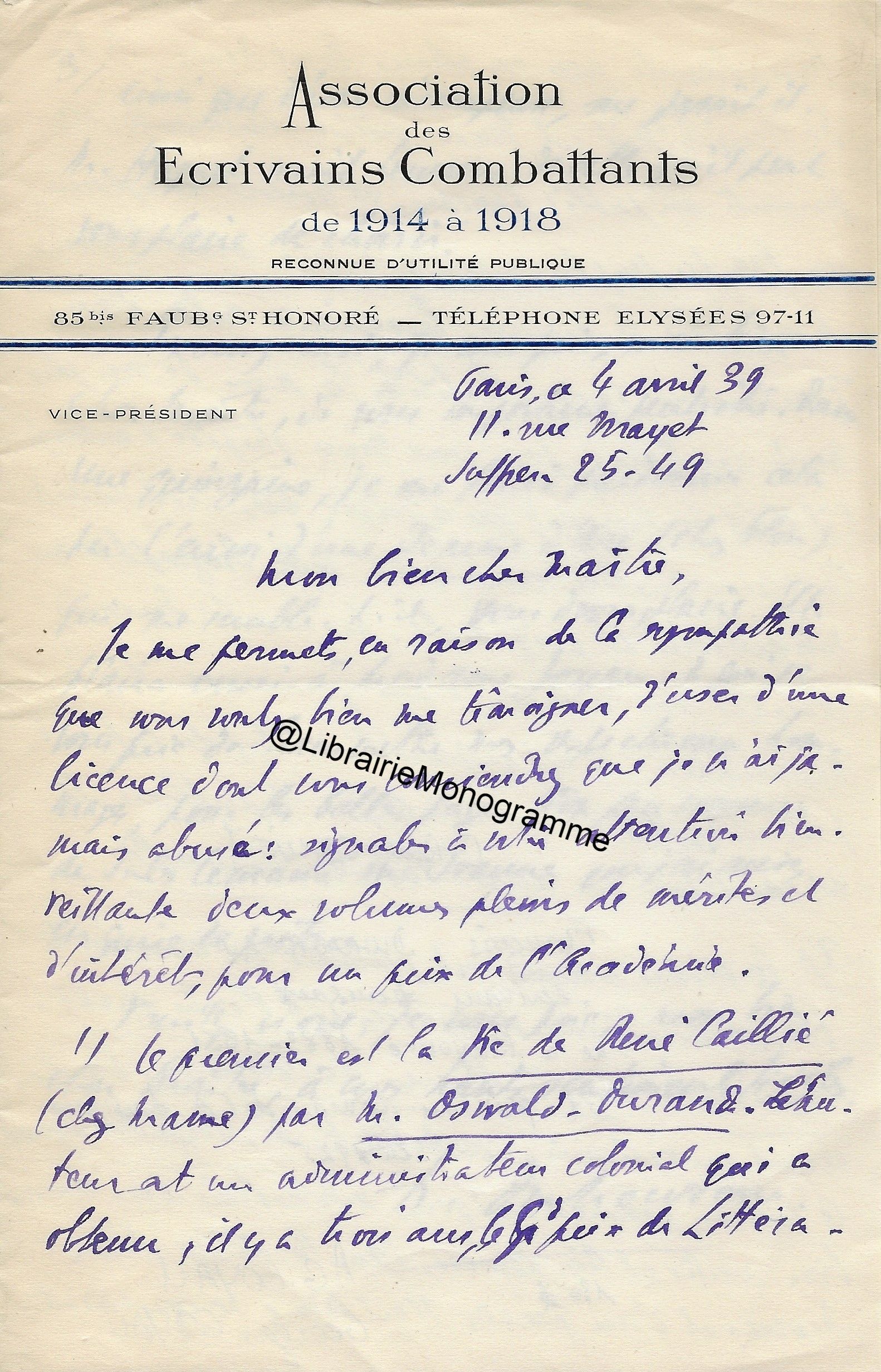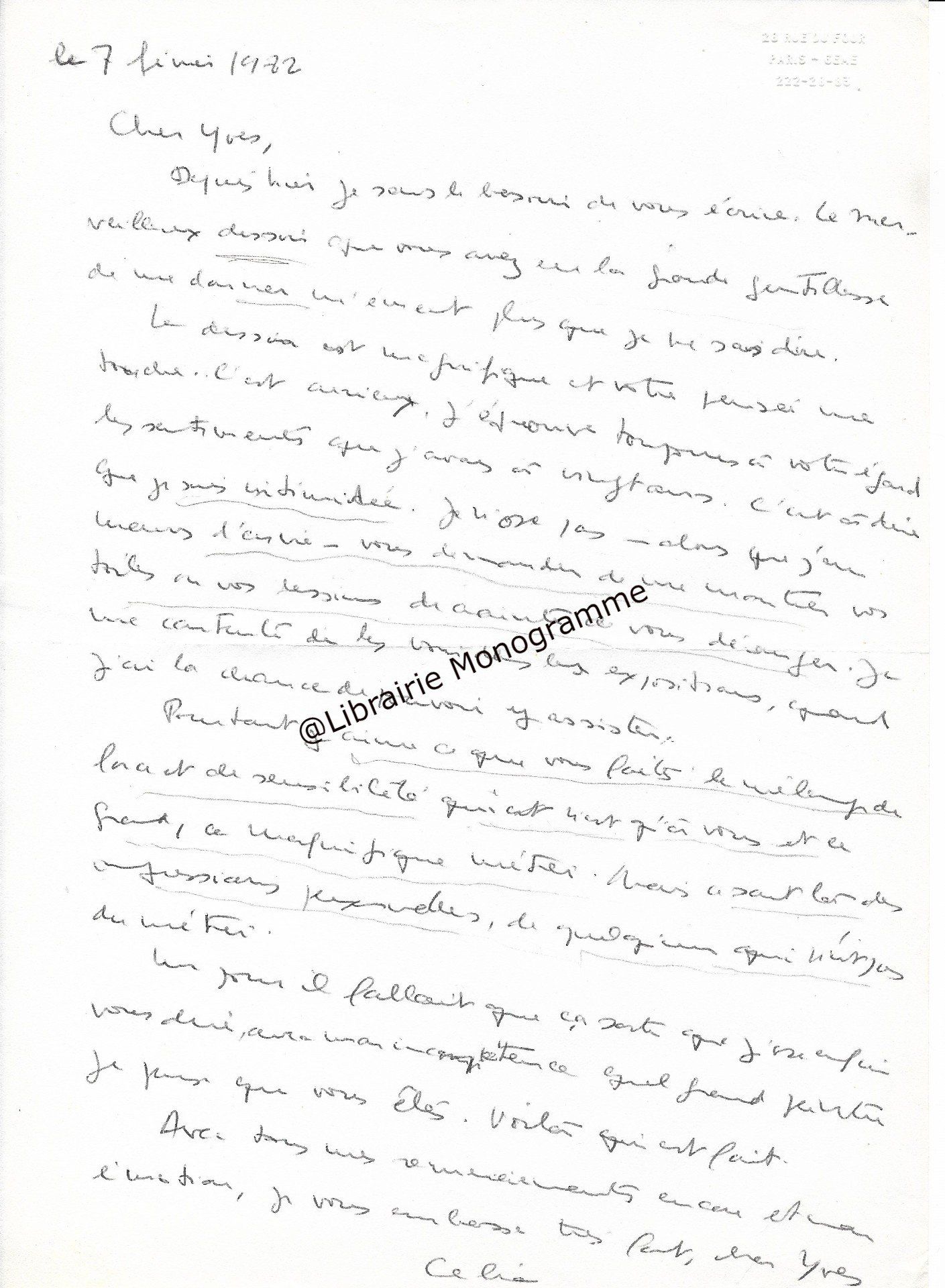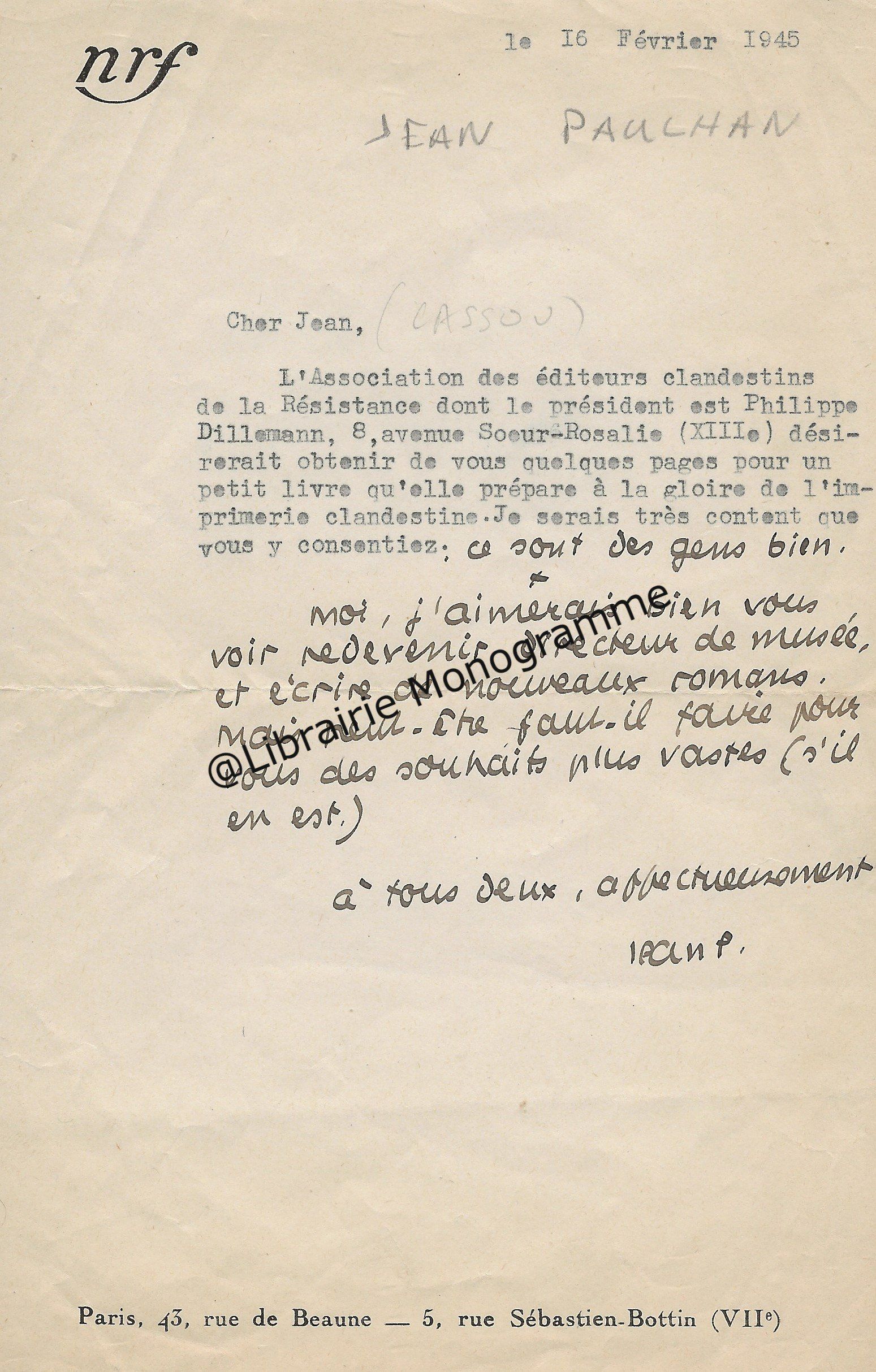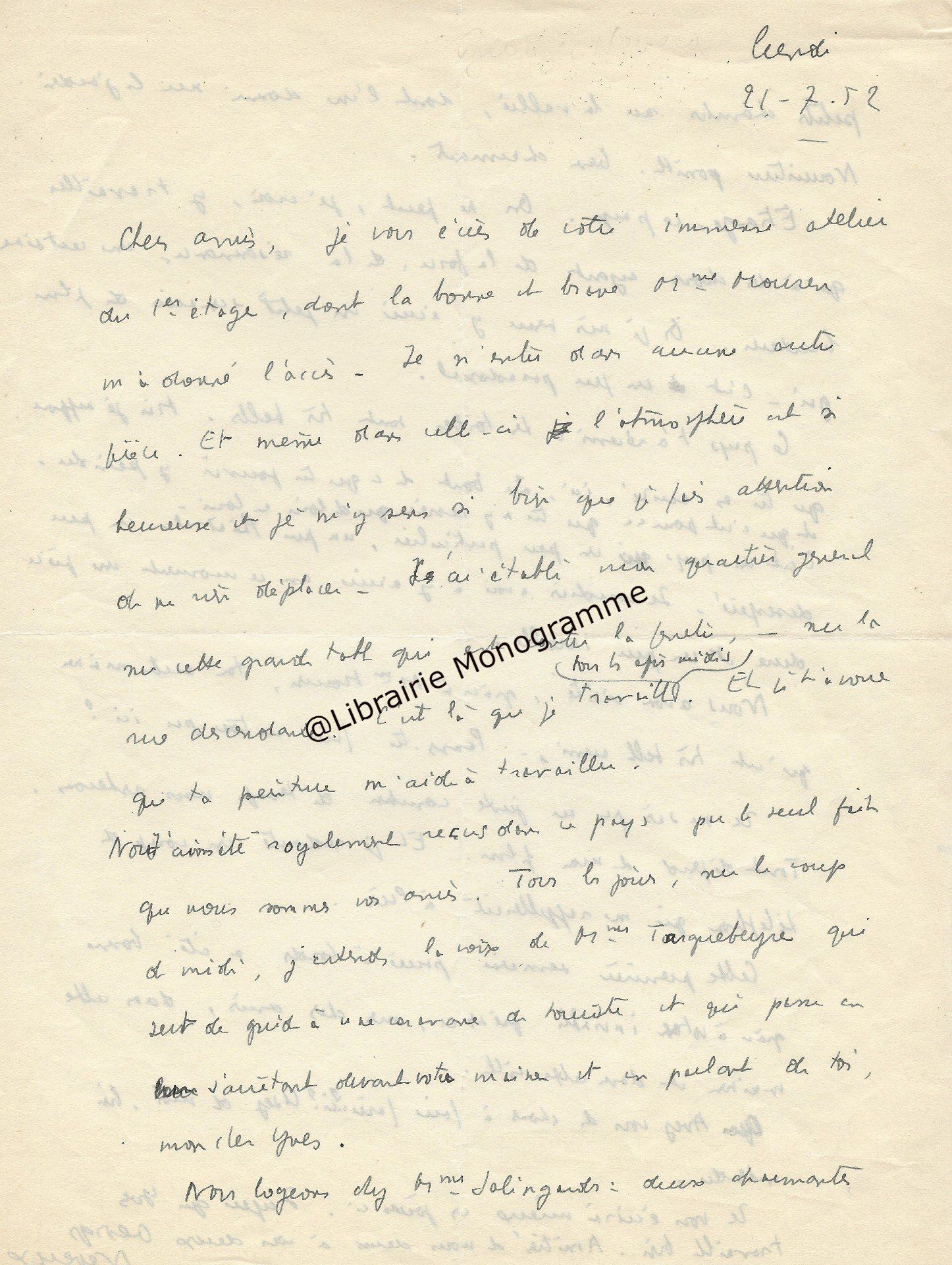 Intéressante lettre à propos de la « Suite et fin du texte d’ARBRES » (le titre original de l’œuvre deviendra « Dialogue de l’arbre », paru en 1943. Poème écrit sous l’occupation, à la gloire de l’Arbre). Il demande à son destinataire de lui « adresser deux jeux d’épreuves en placards à grandes marges, en prévision de corrections ou additions assez importantes ».