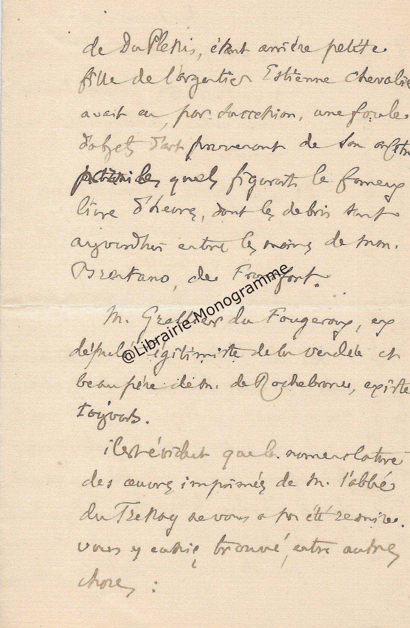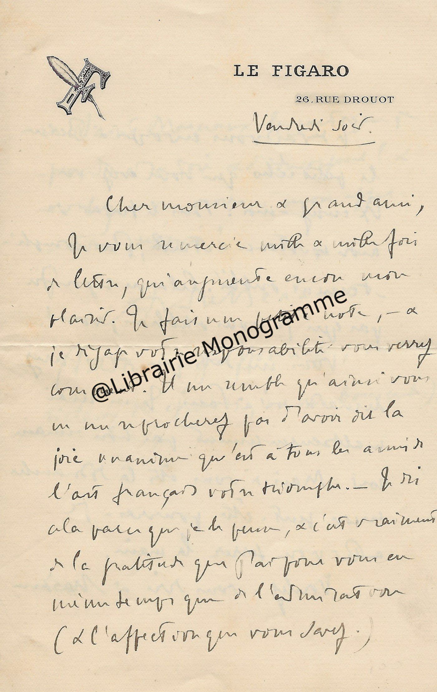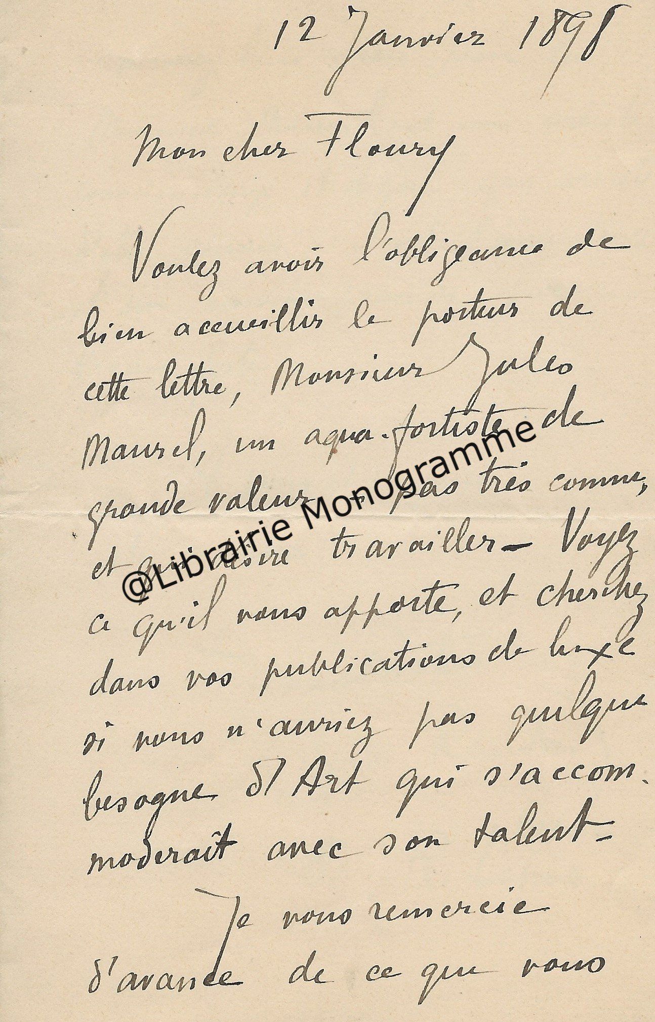 Très belle lettre. « Je viens de faire mettre à la poste votre épreuve Goncourt corrigée. Pensez-vous pouvoir me donner bientôt la suite du manuscrit ? Et maintenant, je vais vous faire une demande indiscrète. Vous m’avez dit, je crois que cous aviez écrit une notice pour le catalogue Bonnaffé ? Or, je serai très désireux de l’avoir. Vous serait-il possible de m’obtenir un catalogue ? ». Fatigué, il renonce à aller à la vente Fenardent qui admirablement s’est bien passée. « Tout à atteint de hauts prix, sauf deux ou trois objets sur lesquels le baron Pichon s’était emballé à tort. Le sceau de Charles le Téméraire, 855 frs., il lui coutait dans les 10 000 frs. ! De même le Trésor de Feltre, heureusement acquis par la Nationale, a été vendu 15 300 frs. alors qu’il l’avait payé 21 500. Mais tout cela est bien compensé par la plus value des autres objets… ».
