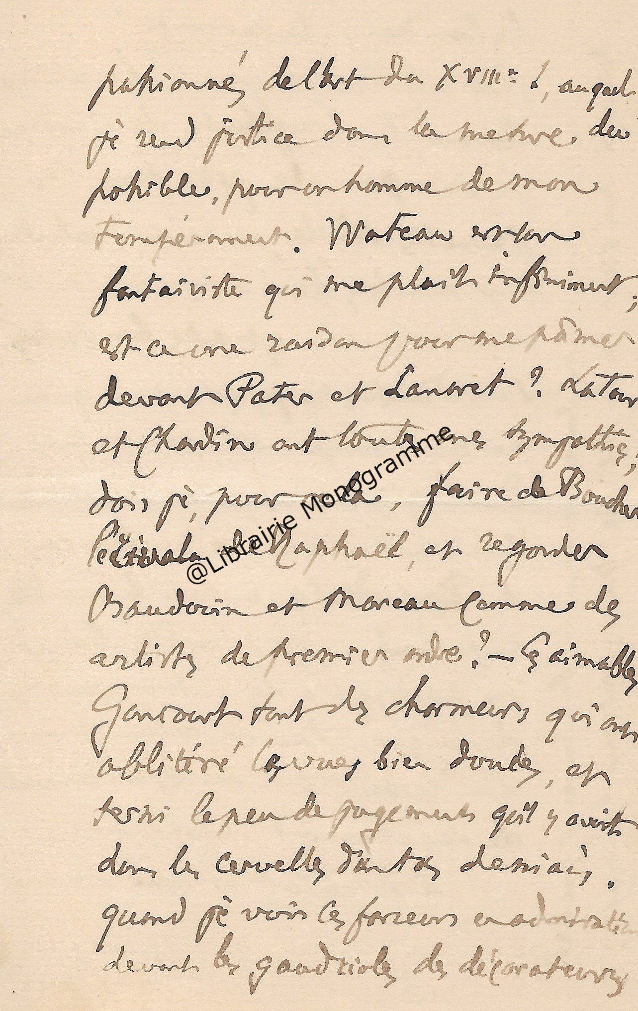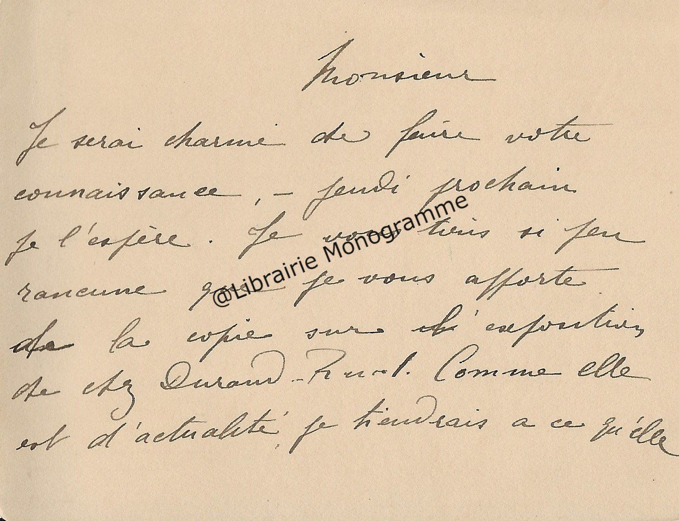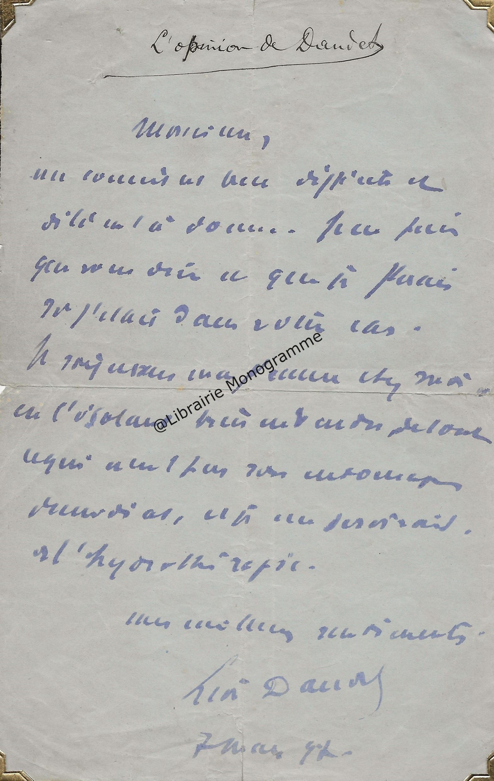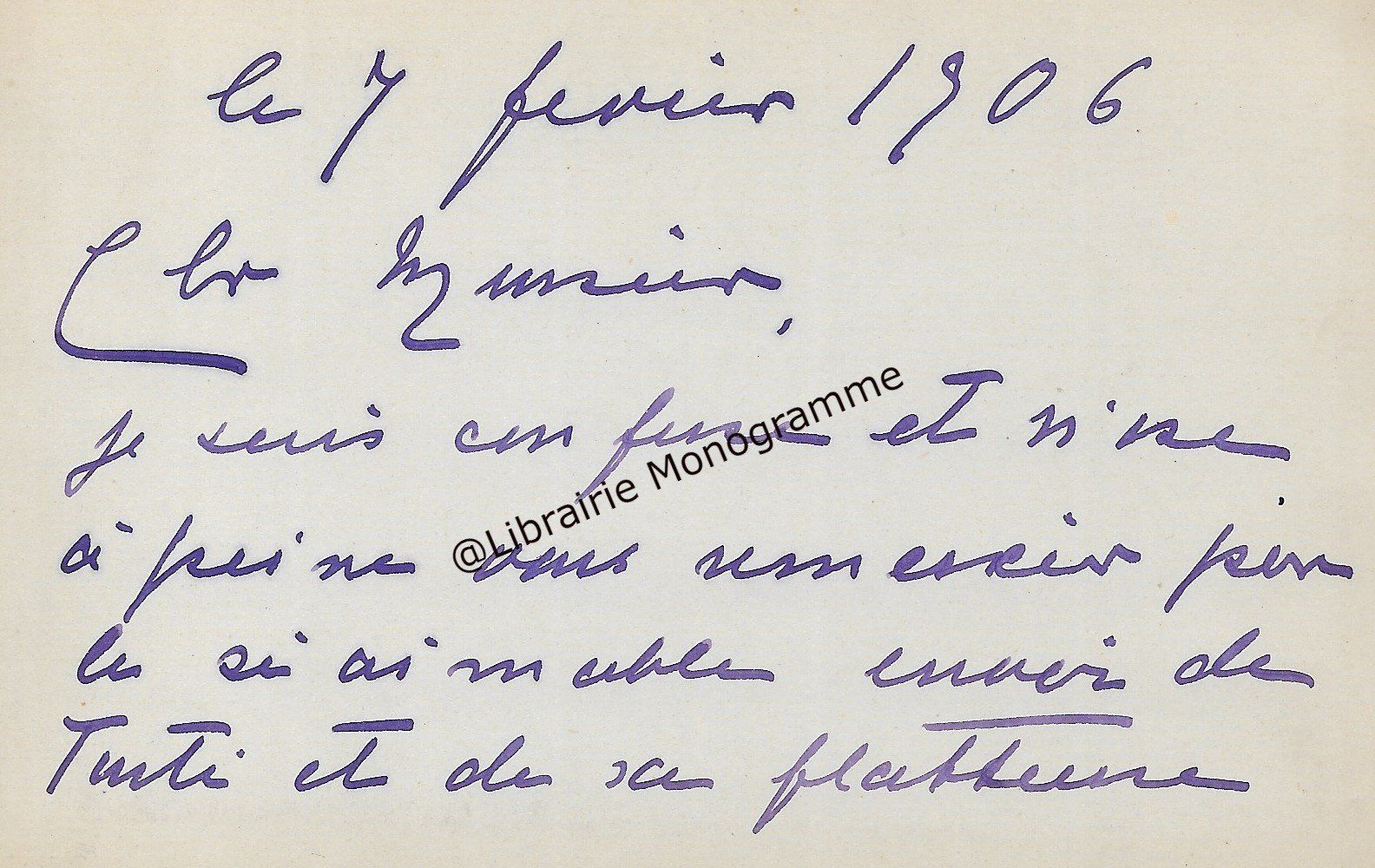 Très belle lettre. « Je viens de faire mettre à la poste votre épreuve Goncourt corrigée. Pensez-vous pouvoir me donner bientôt la suite du manuscrit ? Et maintenant, je vais vous faire une demande indiscrète. Vous m’avez dit, je crois que cous aviez écrit une notice pour le catalogue Bonnaffé ? Or, je serai très désireux de l’avoir. Vous serait-il possible de m’obtenir un catalogue ? ». Fatigué, il renonce à aller à la vente Fenardent qui admirablement s’est bien passée. « Tout à atteint de hauts prix, sauf deux ou trois objets sur lesquels le baron Pichon s’était emballé à tort. Le sceau de Charles le Téméraire, 855 frs., il lui coutait dans les 10 000 frs. ! De même le Trésor de Feltre, heureusement acquis par la Nationale, a été vendu 15 300 frs. alors qu’il l’avait payé 21 500. Mais tout cela est bien compensé par la plus value des autres objets… ».