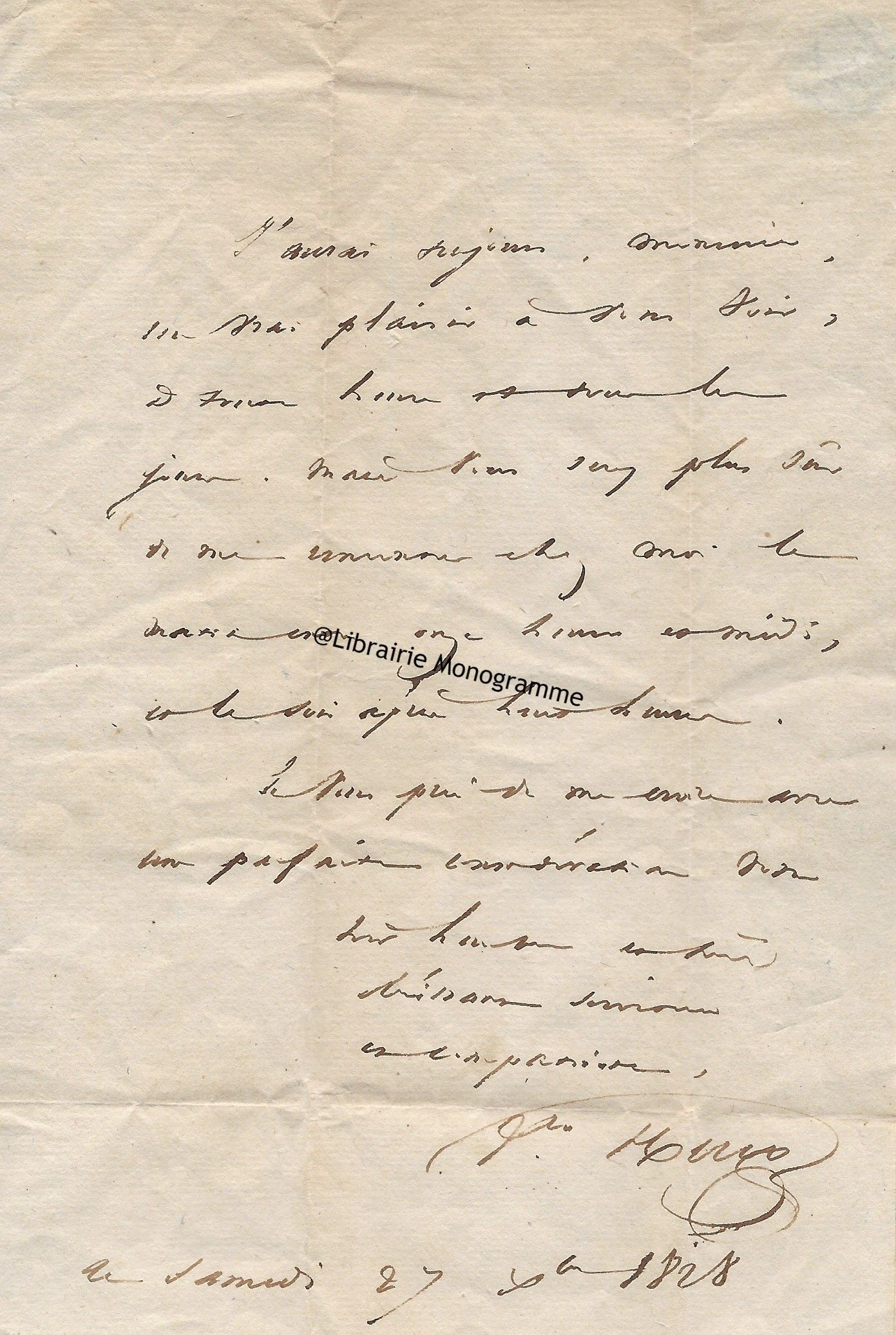 Portrait lithographié de François Séraphin Delpech, joint. « Je suis dans les soins d’un évènement de famille », annonce Villemain à son correspondant, « mais demain j’aurai l’honneur de vous recevoir à l’heure que vous voulez bien m’indiquer. J’ai vu une fois Mr Sambucci qui m’avait annoncé comme renseignement privé et intime la lettre qu’il a fait ensuite lithographier. J’avais eu l’honneur de lui dire que dans aucun cas que je ne concevais possible d’approcher du chiffre d’indemnité dont il parlait, et que je lui conseillais de le réduire extrêmement. Quand au mineur Senot, j’ai répondu à l’un des exécuteurs testamentaire qui m’est venu parler en sa faveur, que j’avais le regret de ne pas appercevoir (sic) de motif sur lequel puisse être fondé une concession à son égard… ».