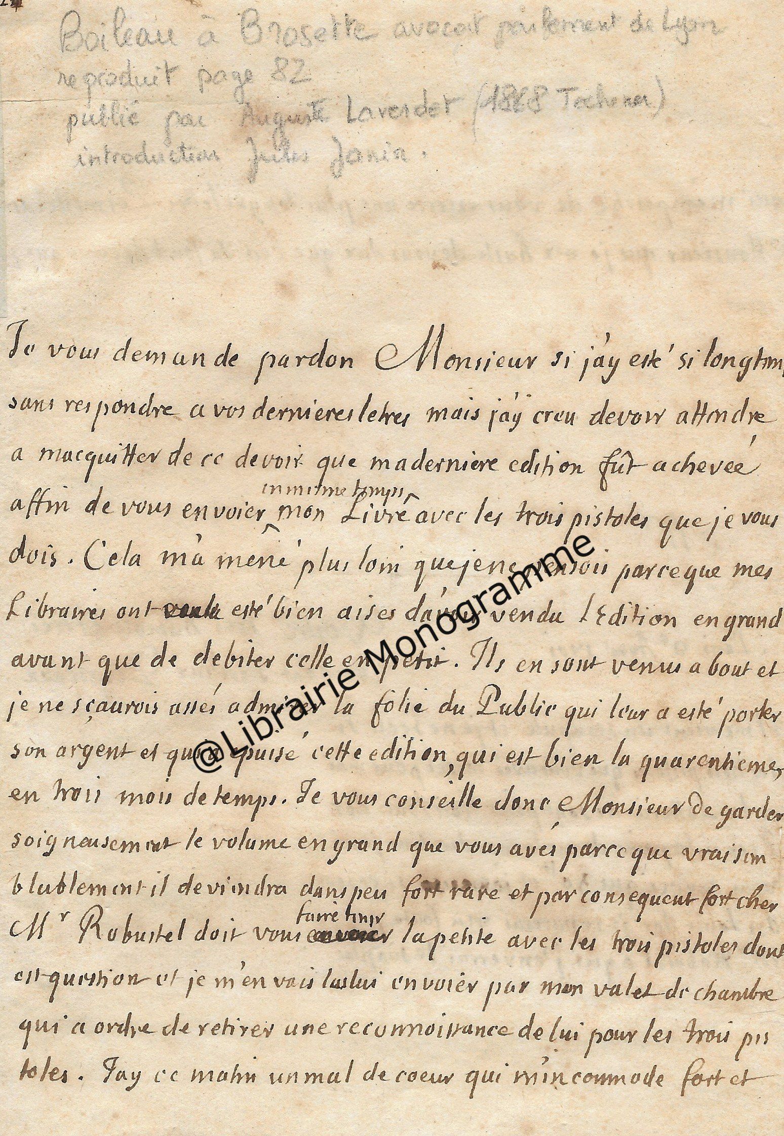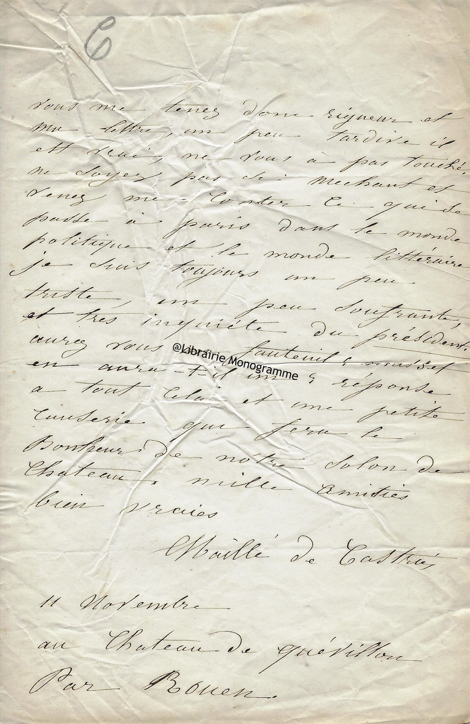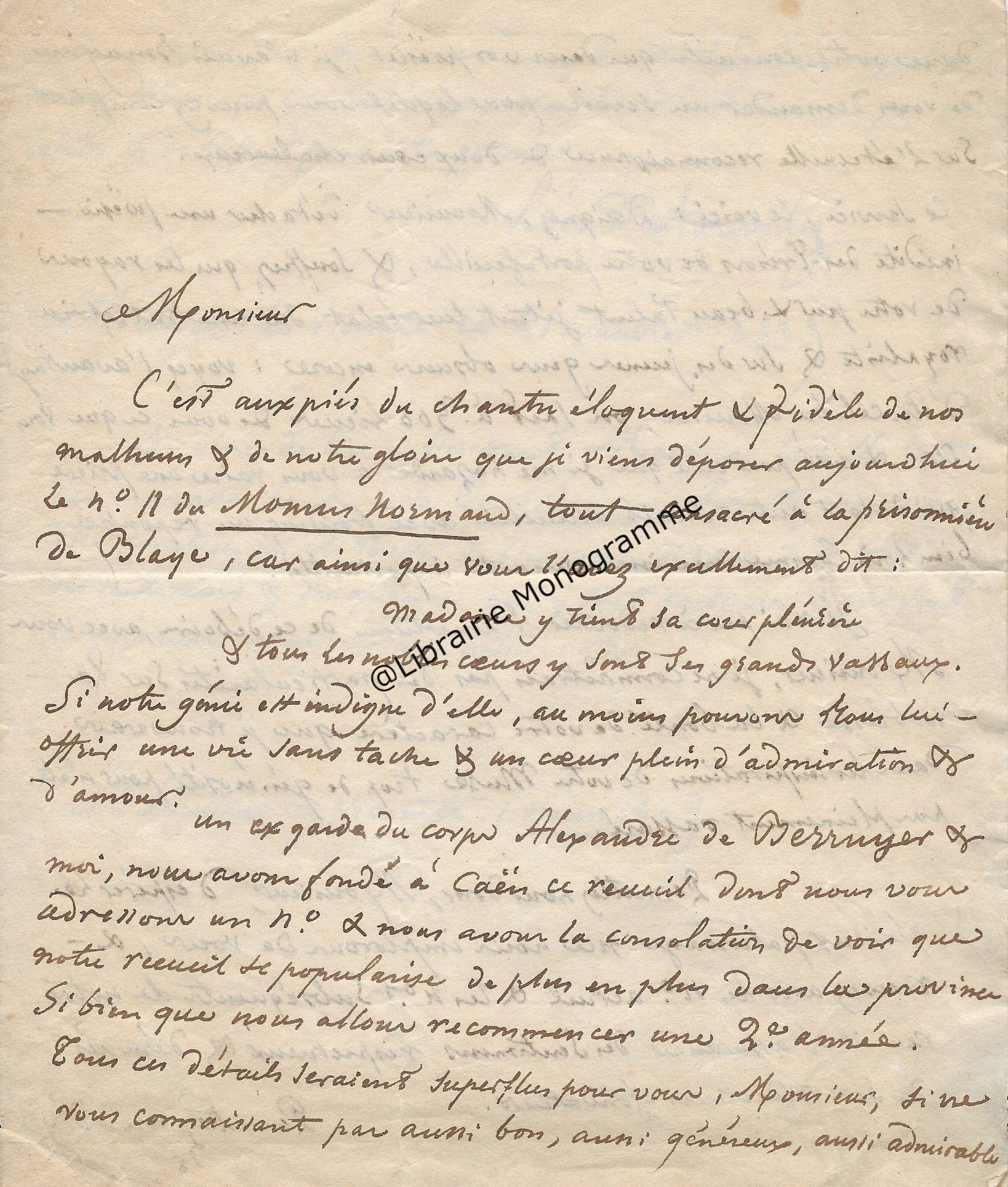 Longue et très intéressante lettre relative à sa publication « Monnus Normand », recueil fondé avec Alexandre Auguste de Berruyer en 1832. Il lui adresse le n° 12 du Monnus Normand, « …tout consacré à la prisonnière de Blaye, car ainsi que vous l’avez excellemment dit : Madame y tient sa cour plénière et tous les nobles cœurs y sont ses grands vassaux… ». Il s’agit en fait de la duchesse de Berry détenue dans la citadelle de Blaye. Cette publication fondée à Caen, qu’il poursuit pour la seconde année, en fonction de sa popularité, l’amène à lui demander un service. « Ce service le voici : Daignez, Monsieur, détacher une poésie inédite des trésors de votre portefeuille ….Voyez l’avantage d’être célèbre Monsieur, on sait à 300 lieues de vous ce que vous êtes, et c’est pour cela que je me hasarde à vous faire une prière qui de tout autre serait accueilli avec froideur ou repoussée bien loin comme une inconvenante importunité… ».