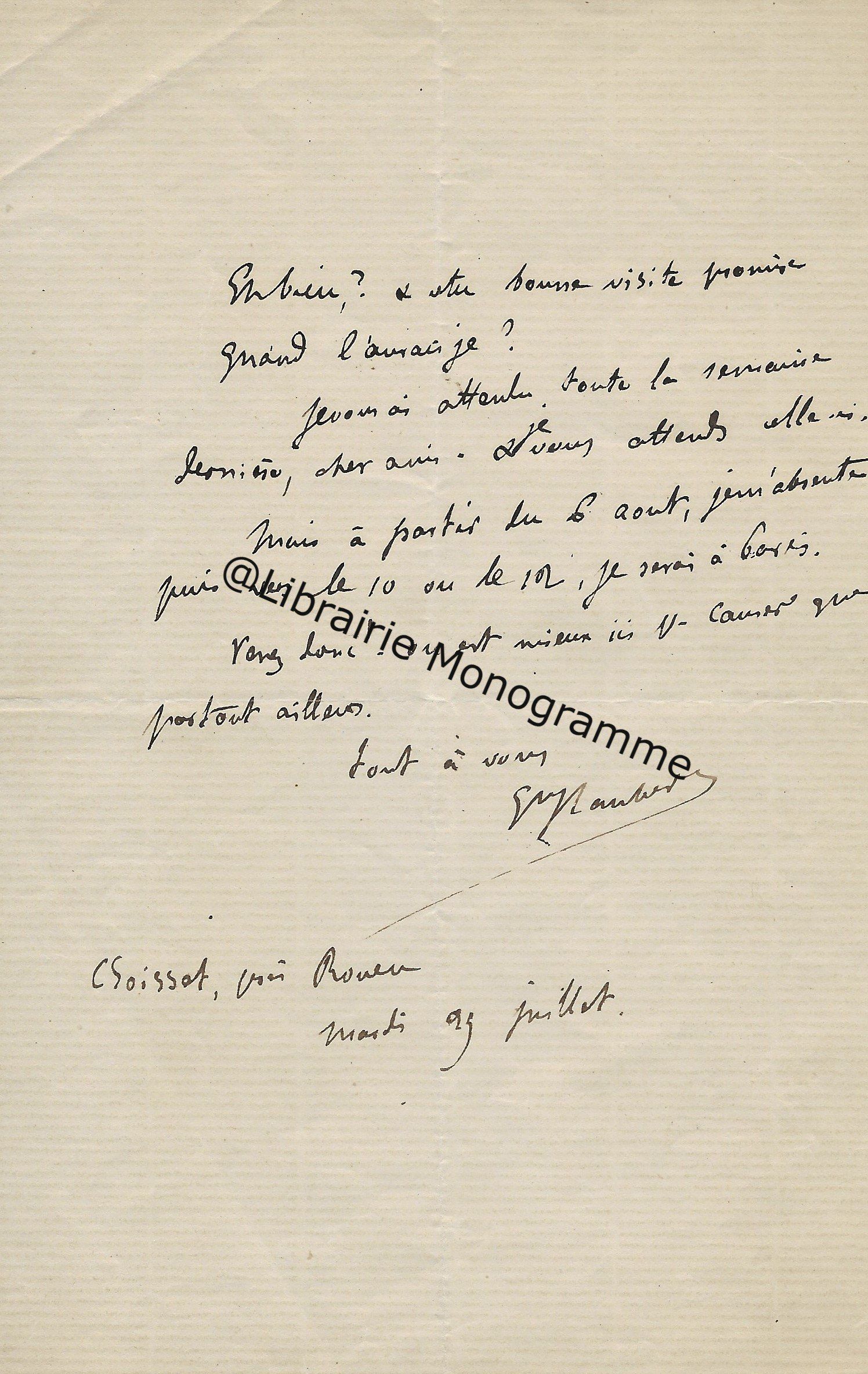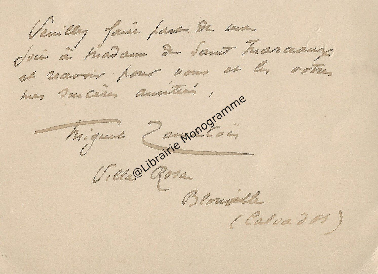 Villa Rosa, Blonville (Calvados), dimanche. 1 p. ½ in-8. En-tête gaufré de ses initiales.