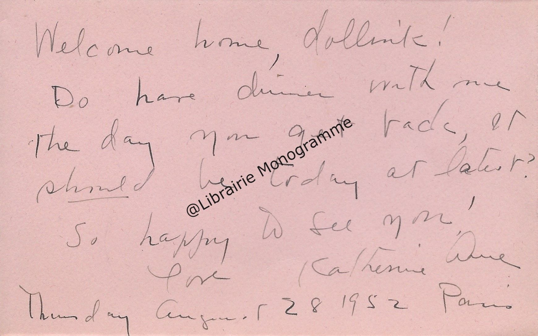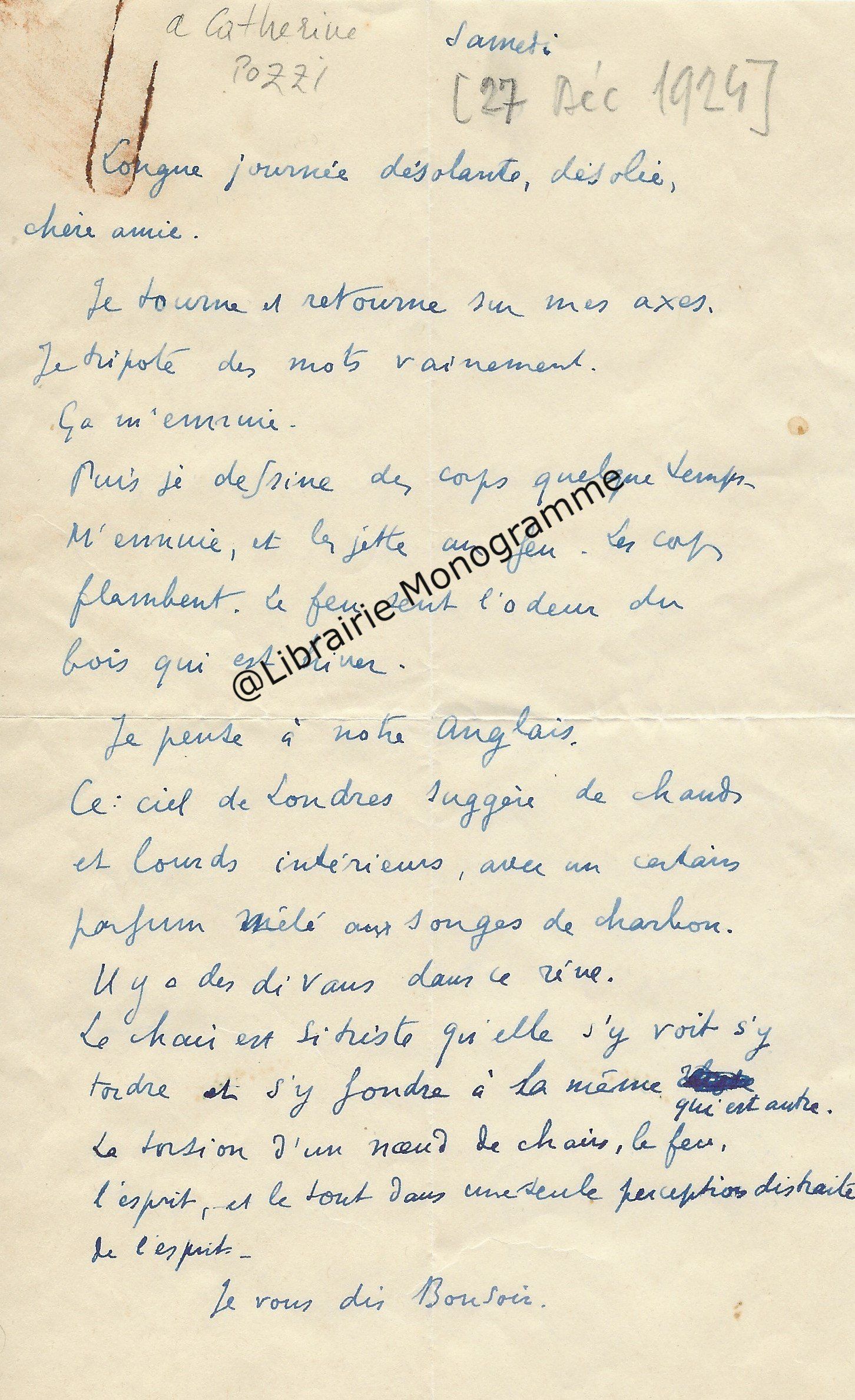 Lettre autographe à sa maitresse, Catherine Pozzi. S.l.n.d. (27 décembre 1924). 1 pp. in-8.