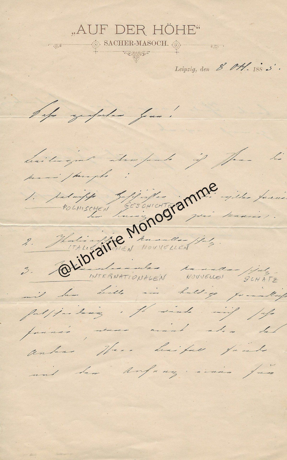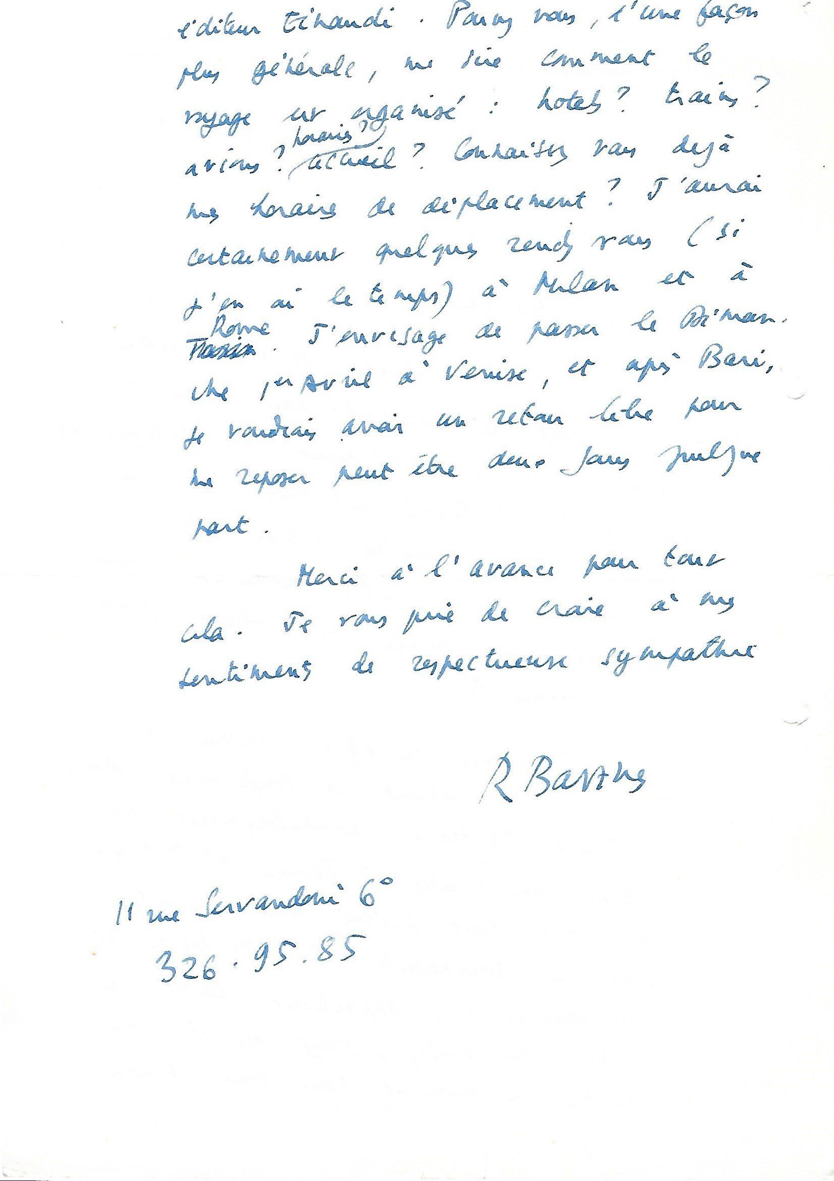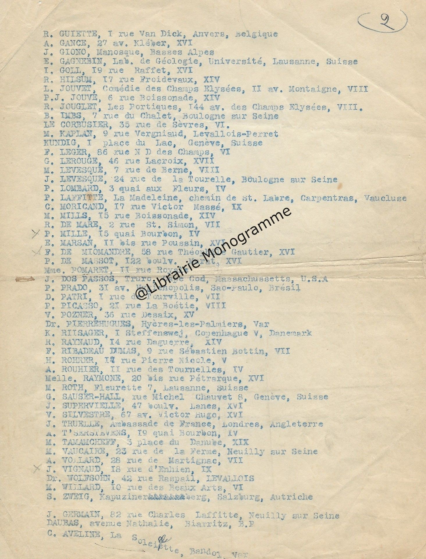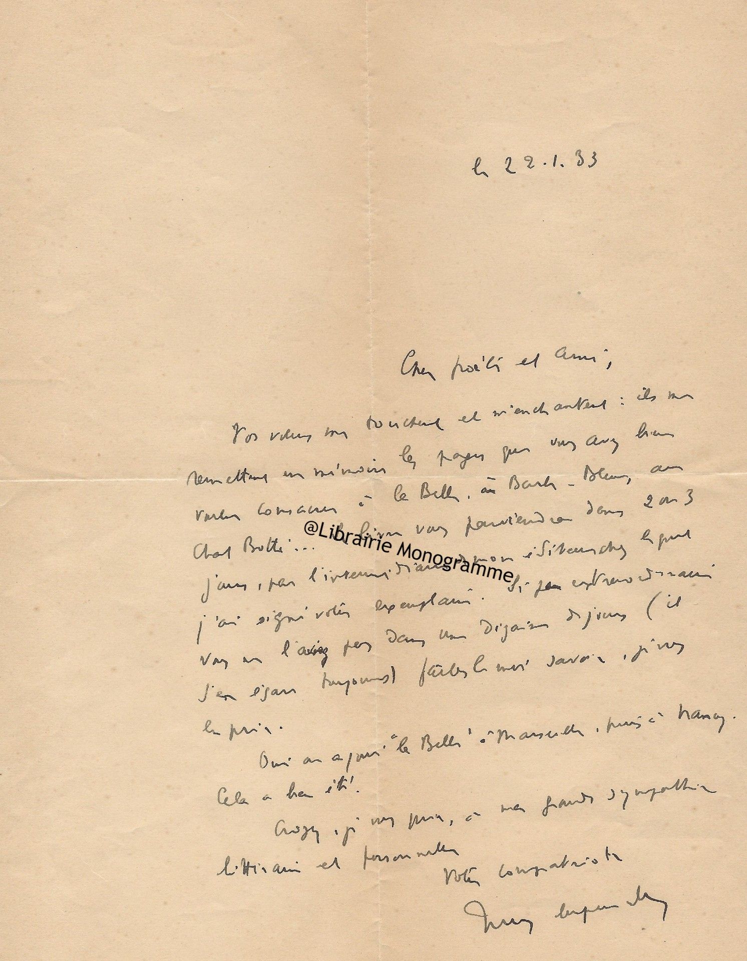 Zweig grand amateur d’autographes. « Votre aimable offre me trouve en voyage et je m’empresse de vous répondre. Malheureusement les manuscrits que vous m’offraient, (sic) si désirables qu’ils sont, ne m’attirent pas, car je possède déjà un très bon manuscrit de Montesquieu et un de Barbey d’Aurevilly, et les autres ne m’intéressent pas. Je vous rends donc les fiches, mais je vous prie de continuer vos aimables offres… ».