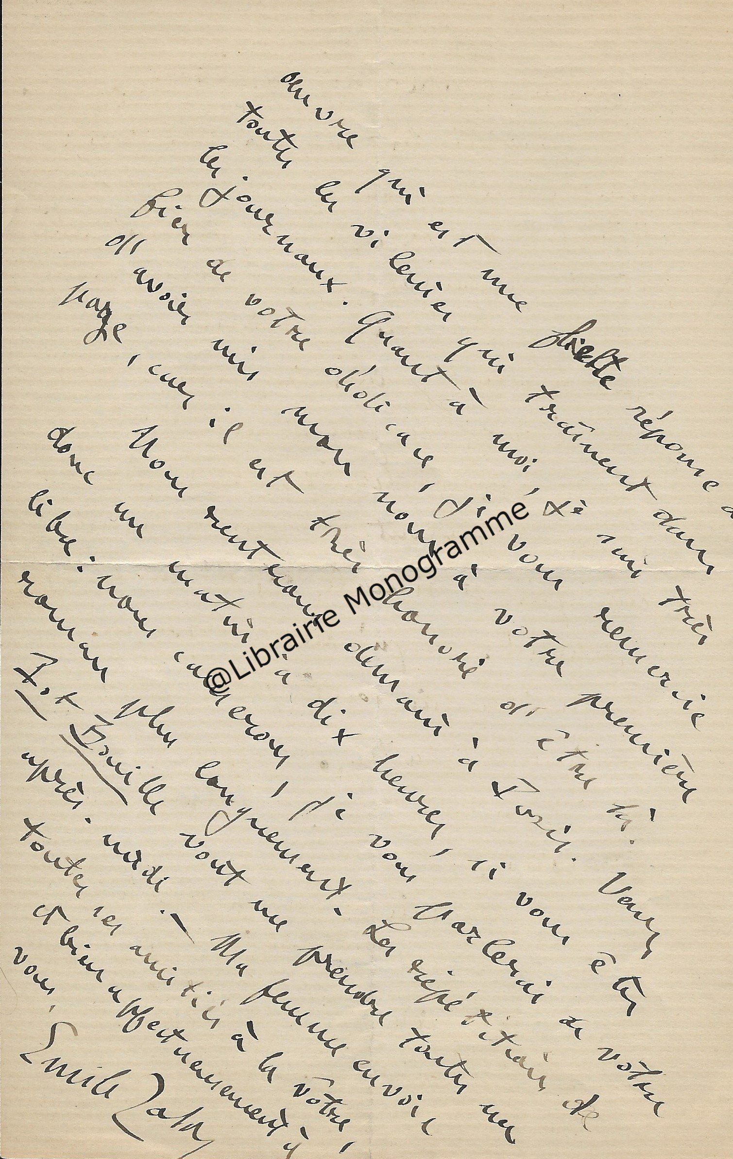 Jolie lettre à propos de son ouvrage "L’Assommoir". « J’ai à m’excuser de ne pas vous avoir remercié plus tôt, pour votre bel article sur mon dernier roman. Toutes sortes d’affaires ont mis en retard ma correspondance ; mais je tenais à vous dire combien votre sympathie m’a touché… ».